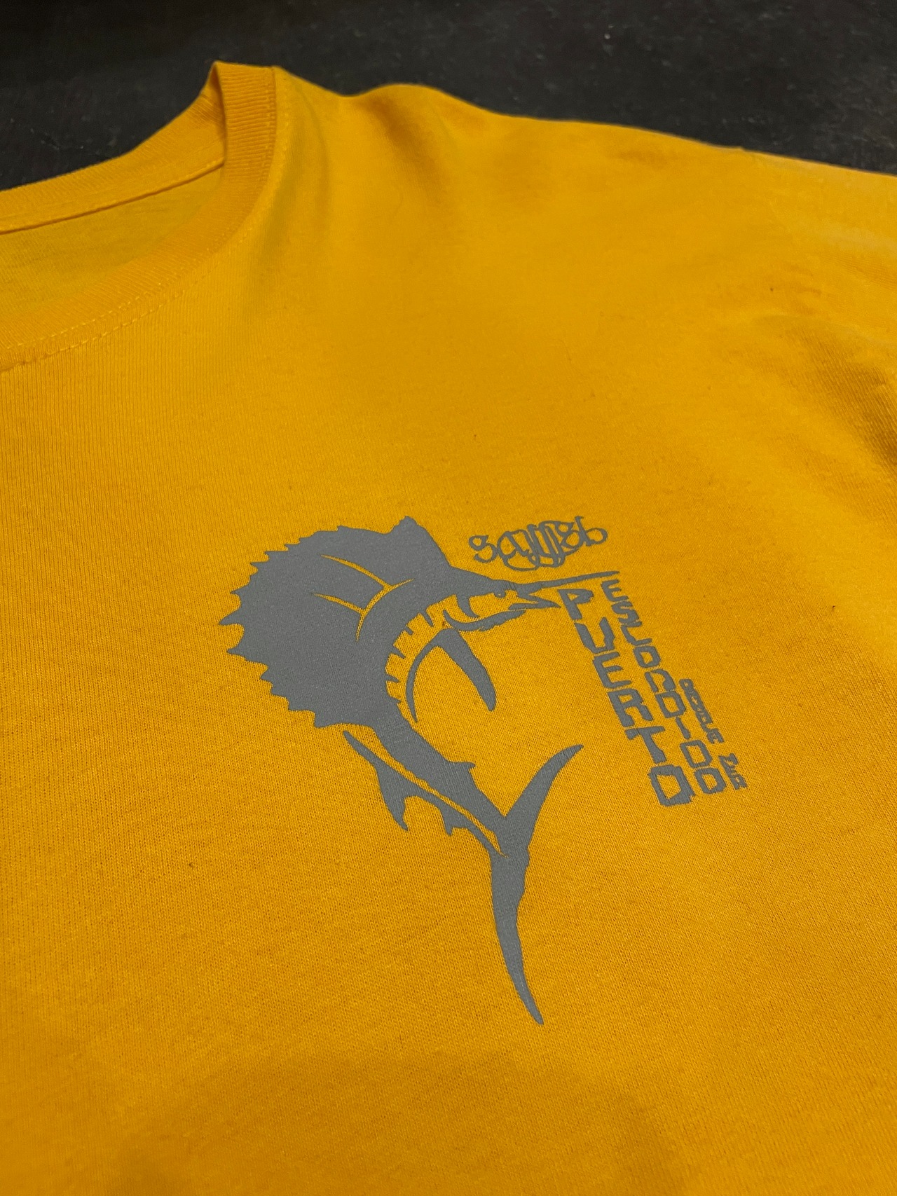 温かみのあるイエローボディに、PUERTOの大胆なカジキのプリントが目を惹くアイテム◎◎◎