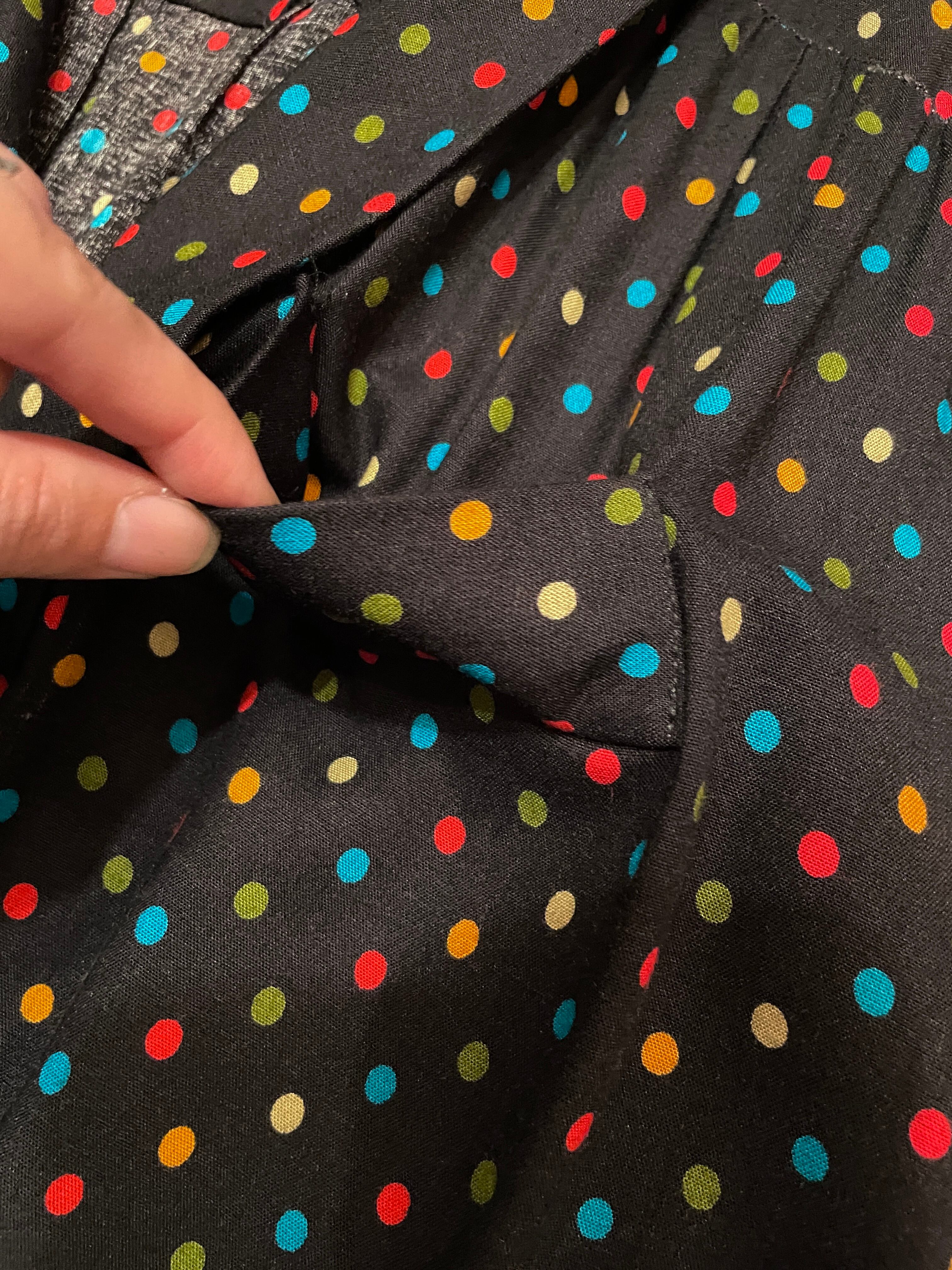 フロントはカシュクールのような生地を重ね合わせたデザインで、胸元のフェイクポケットやウエストの赤ボタンもナイスアクセント◎◎◎