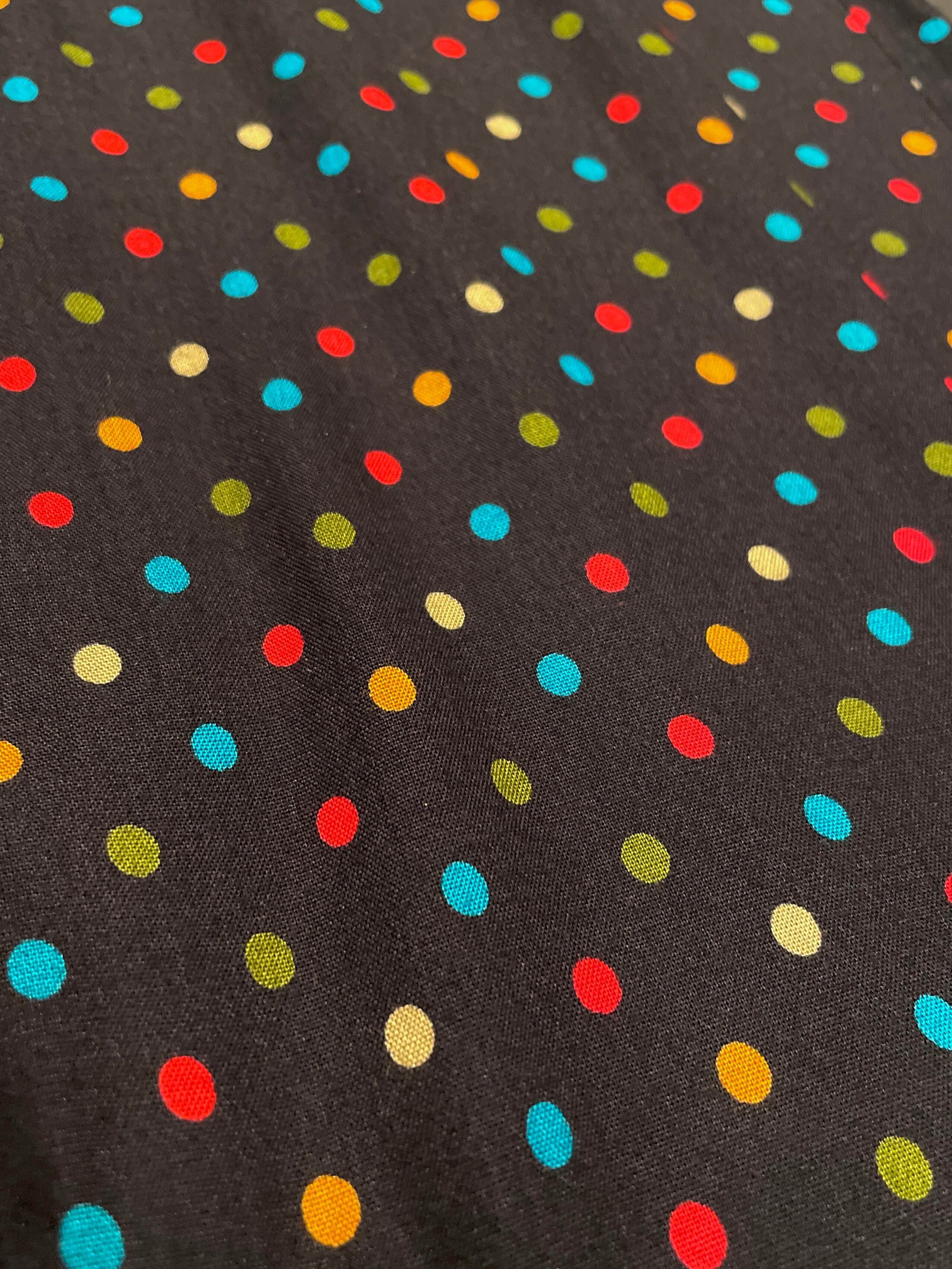 合わせやすいブラックボディにカラフルなドットプリントが可愛らしいアイテム。