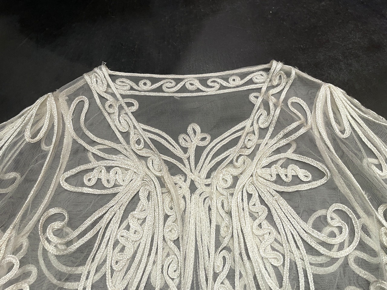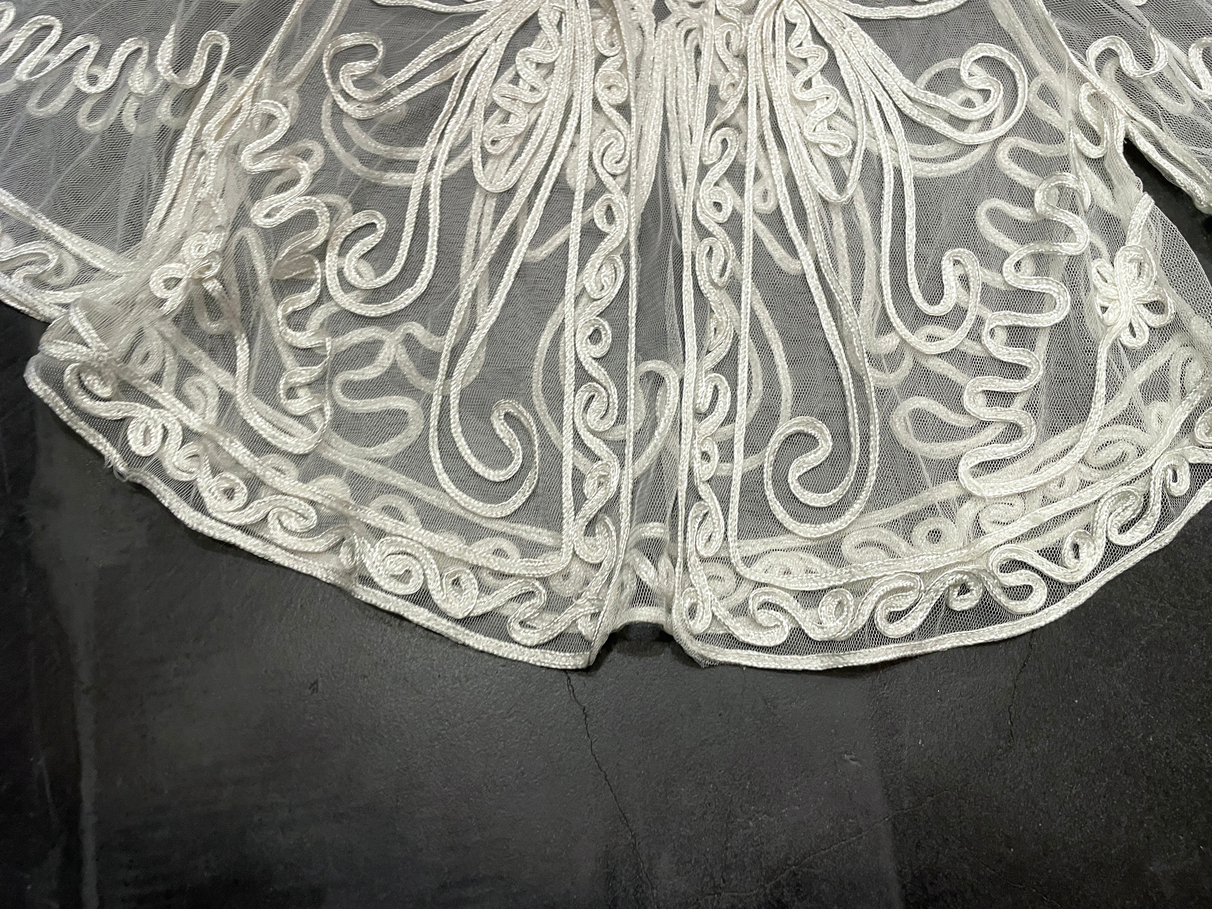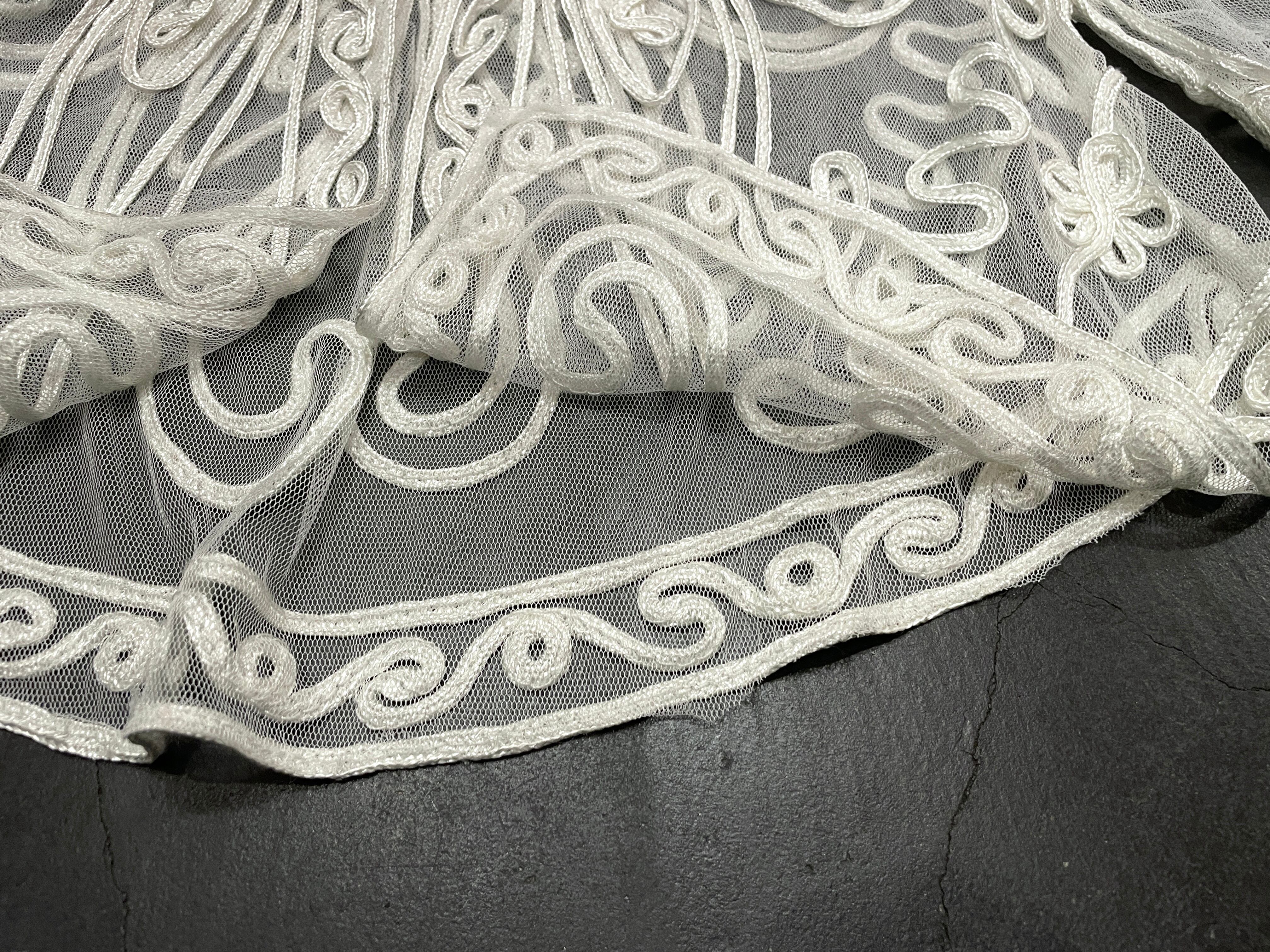 透け感のあるシアーボディにバタフライのようなデザインのコード刺繍が施されたアイテム。