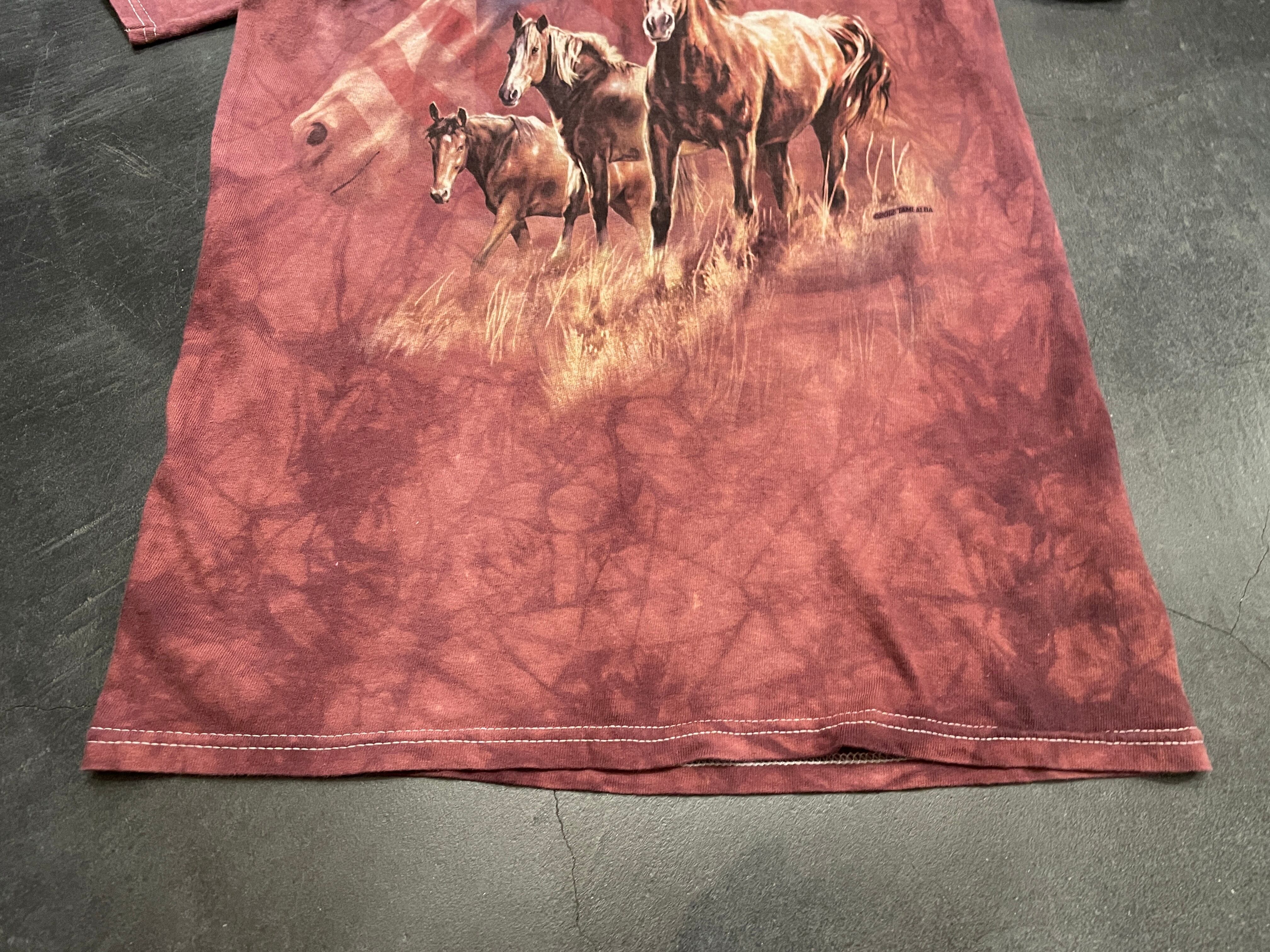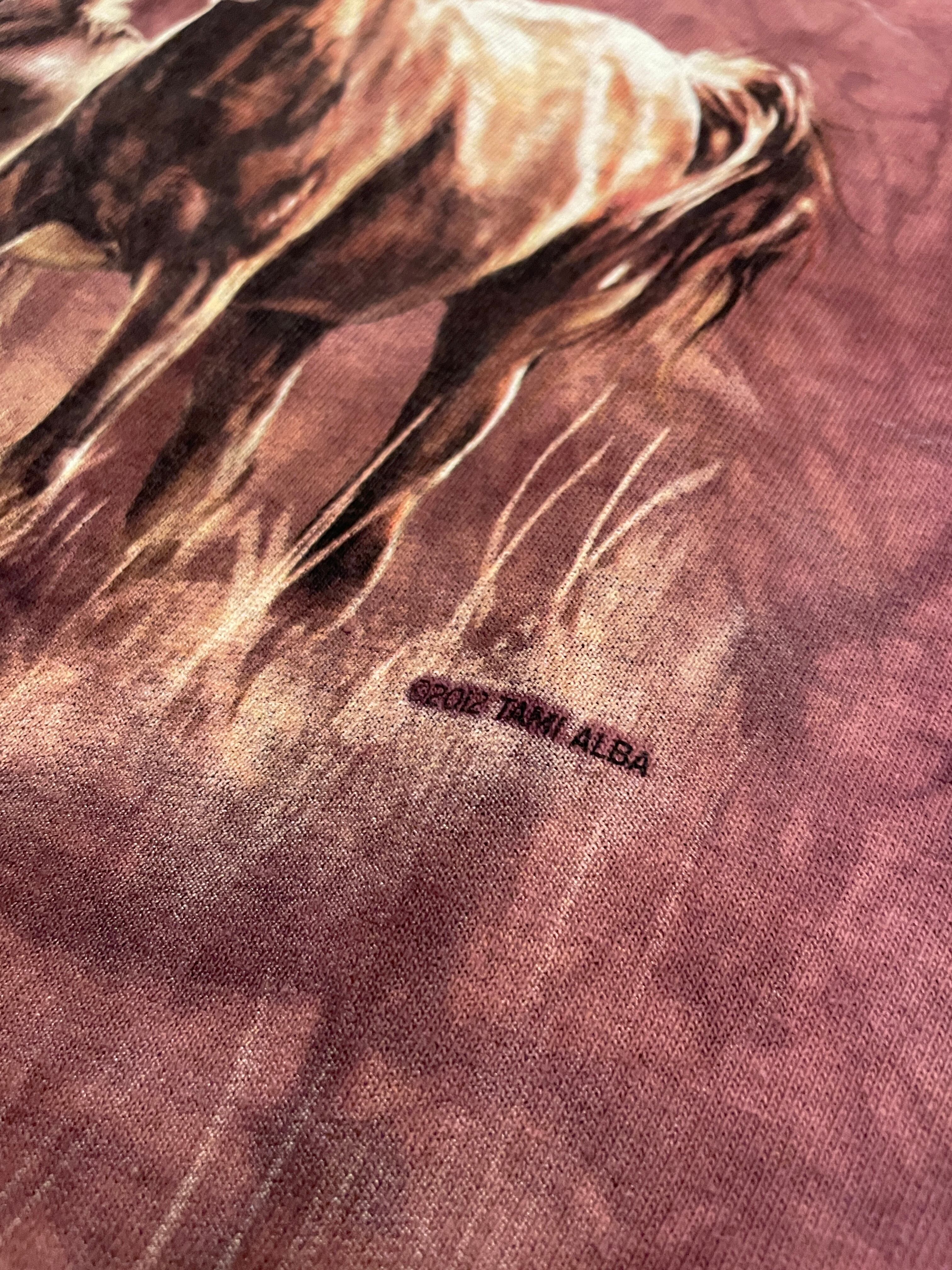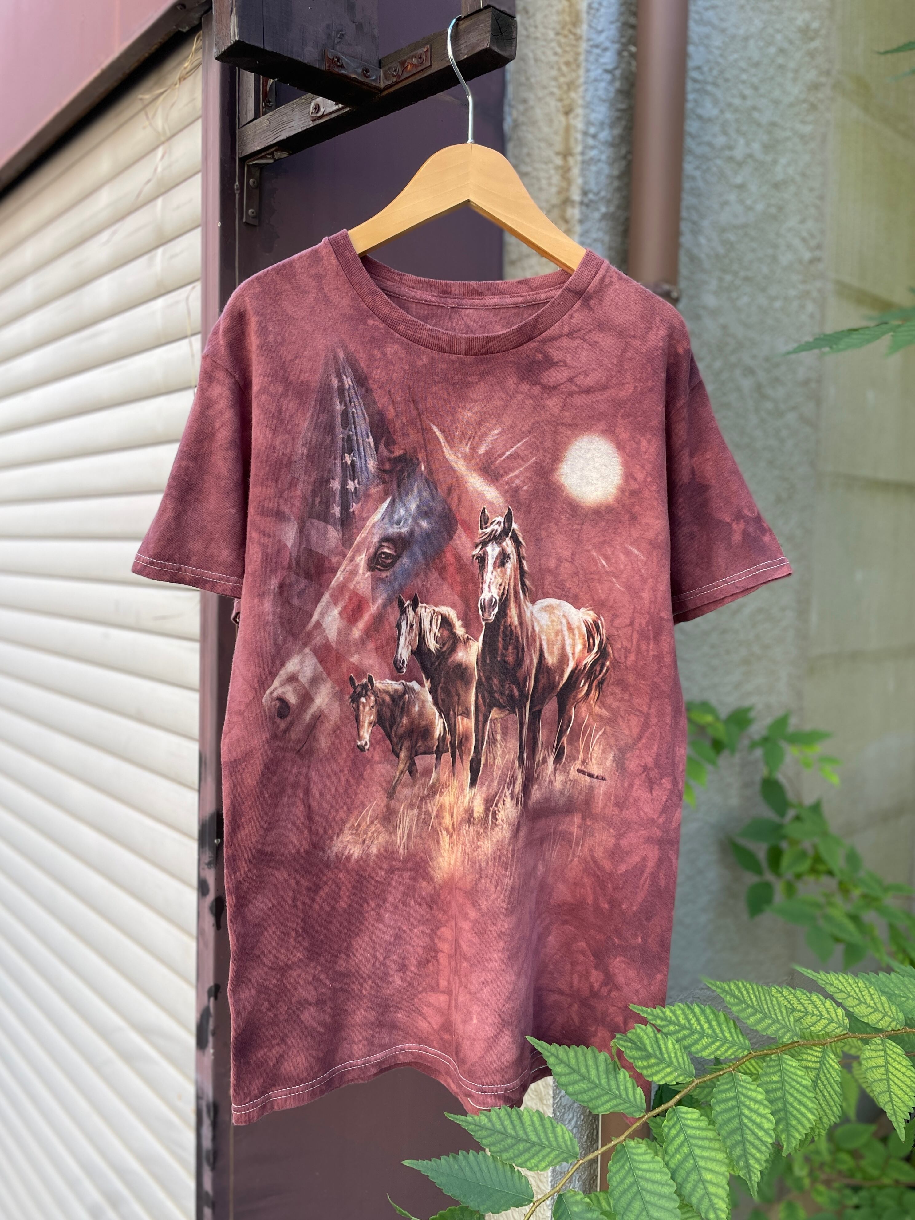 ブラウンのタイダイボディに躍動感のあるウマプリントが施されたアイテム。