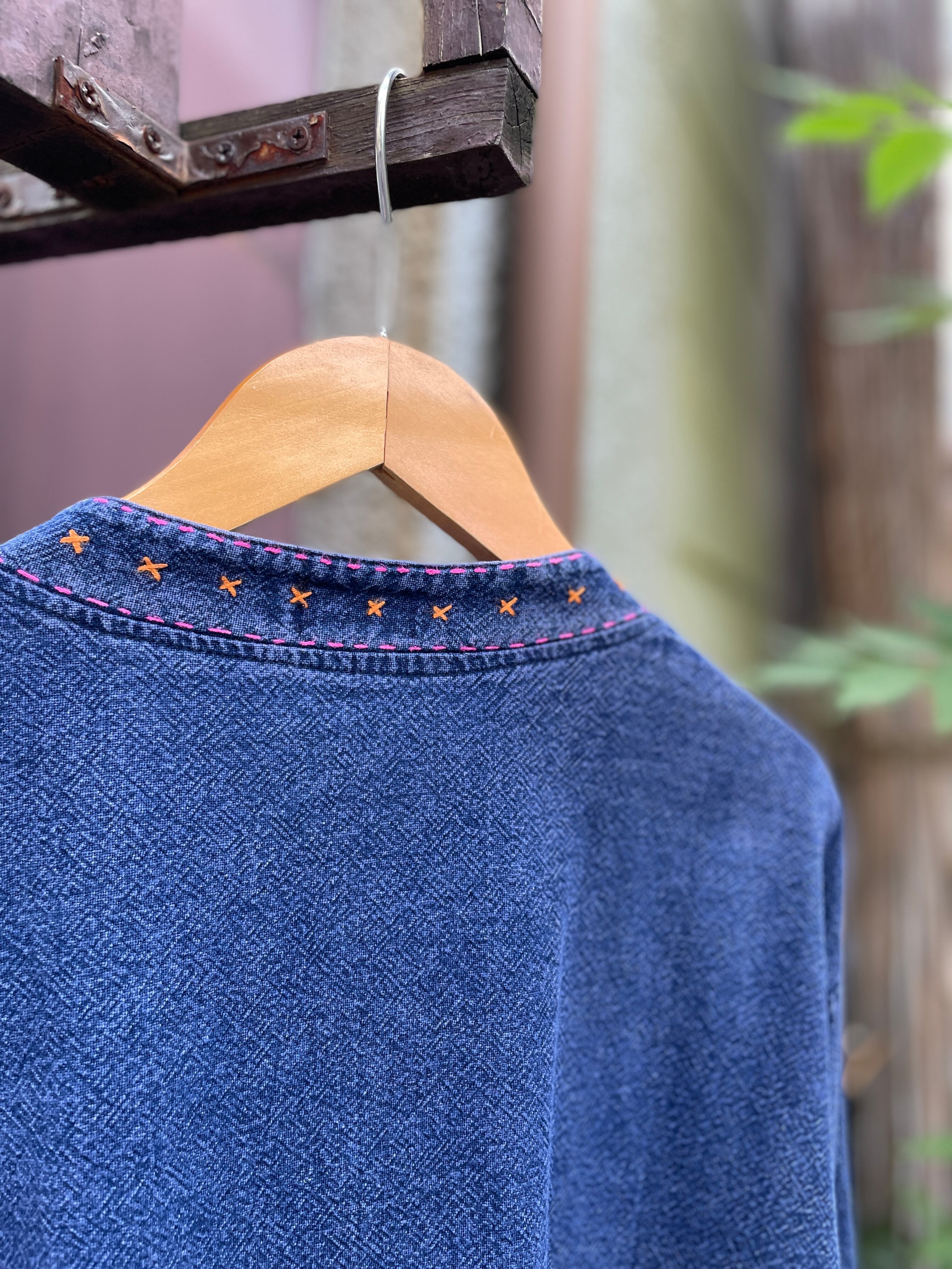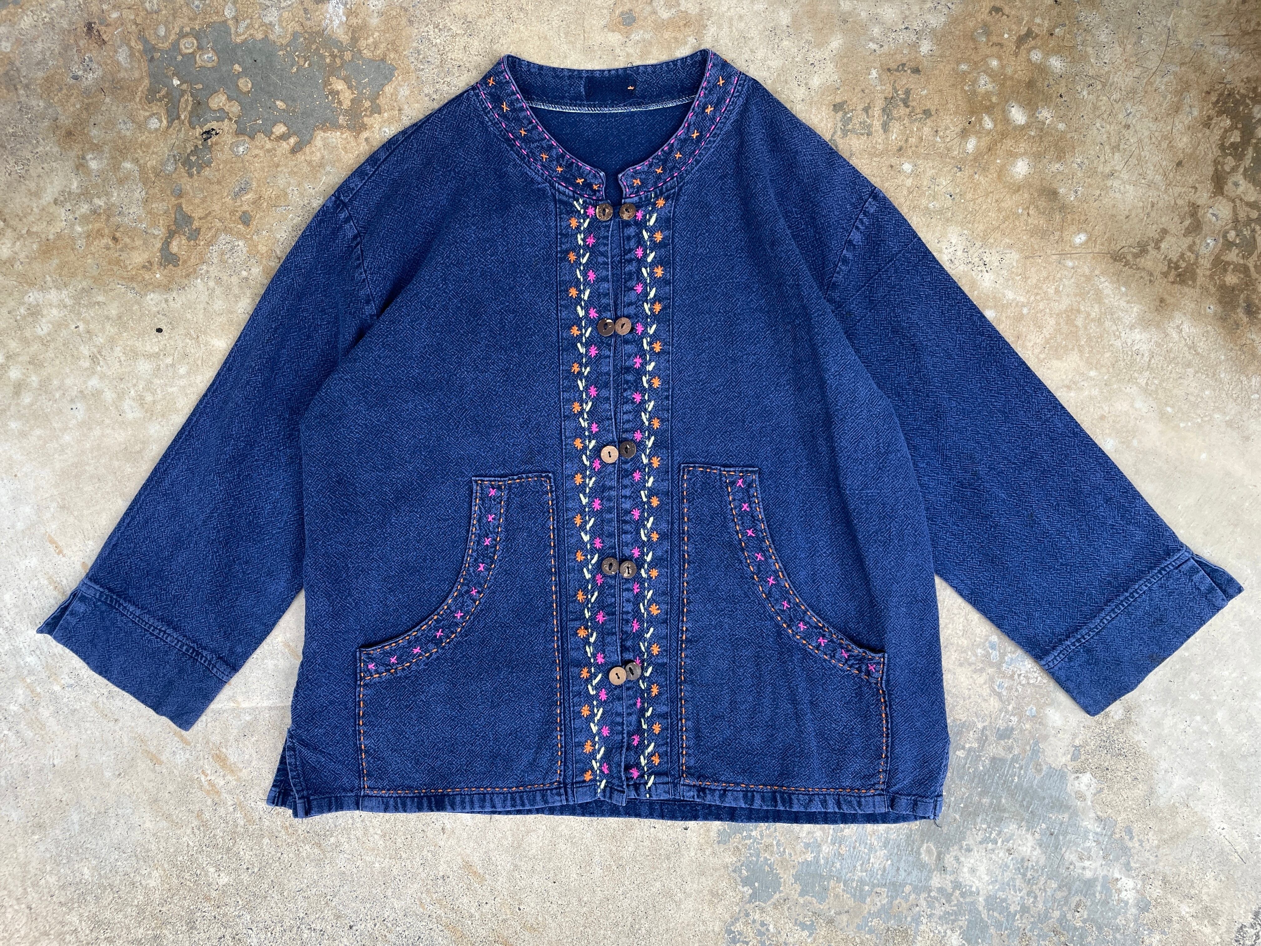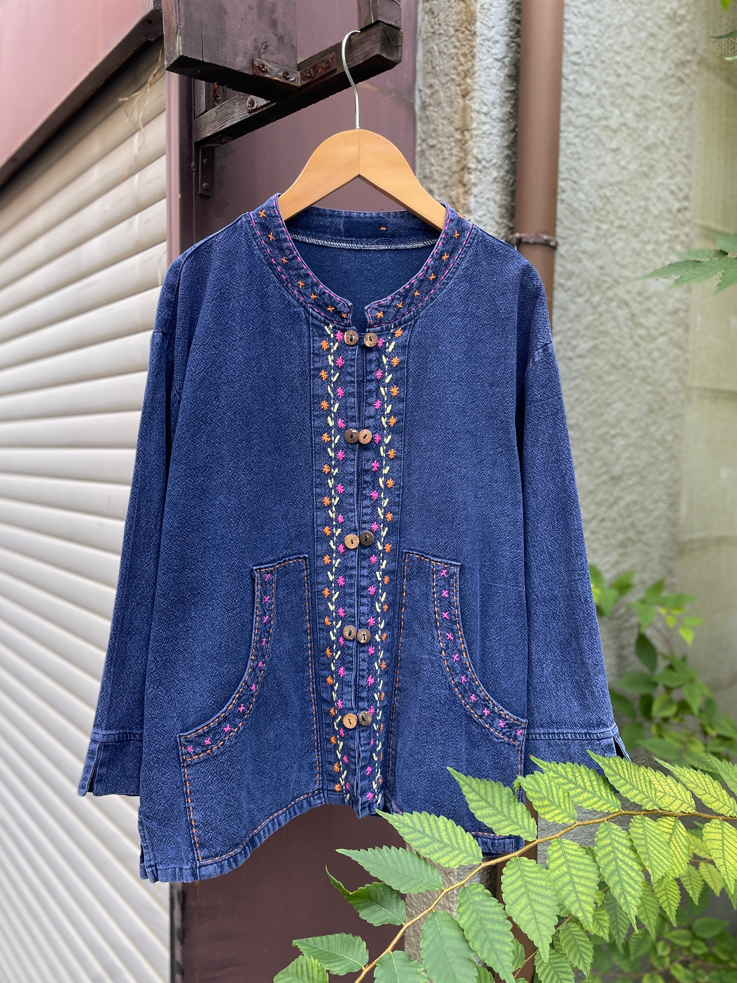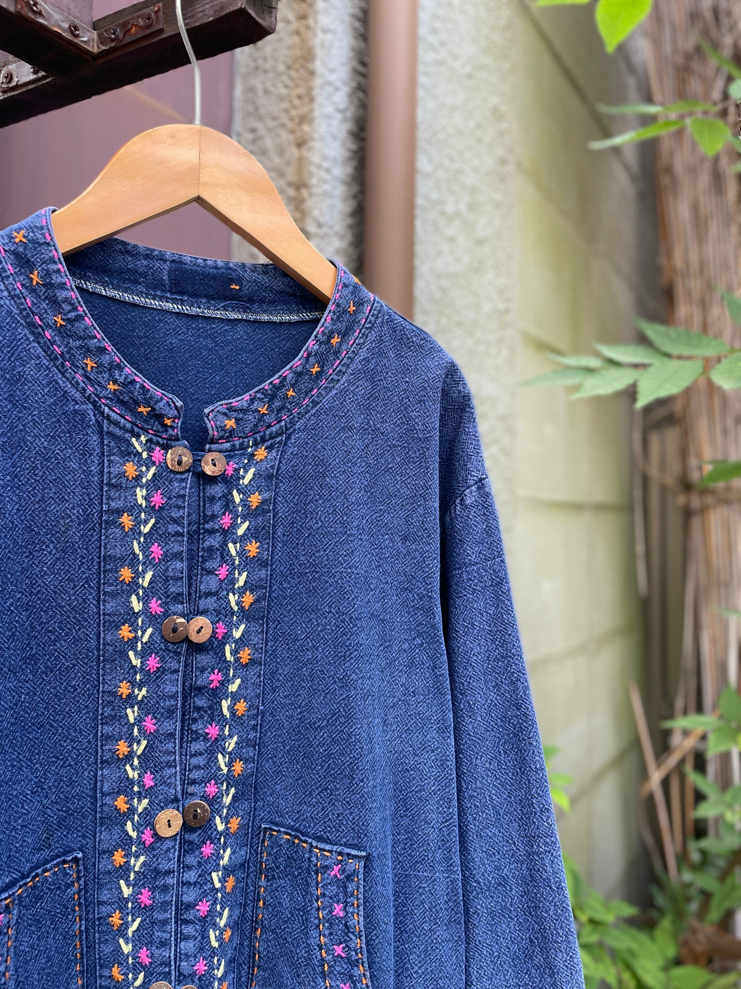 ざっくりとした風合いのあるネイビーボディに、手の込んだ刺繍が可愛らしいアイテム。