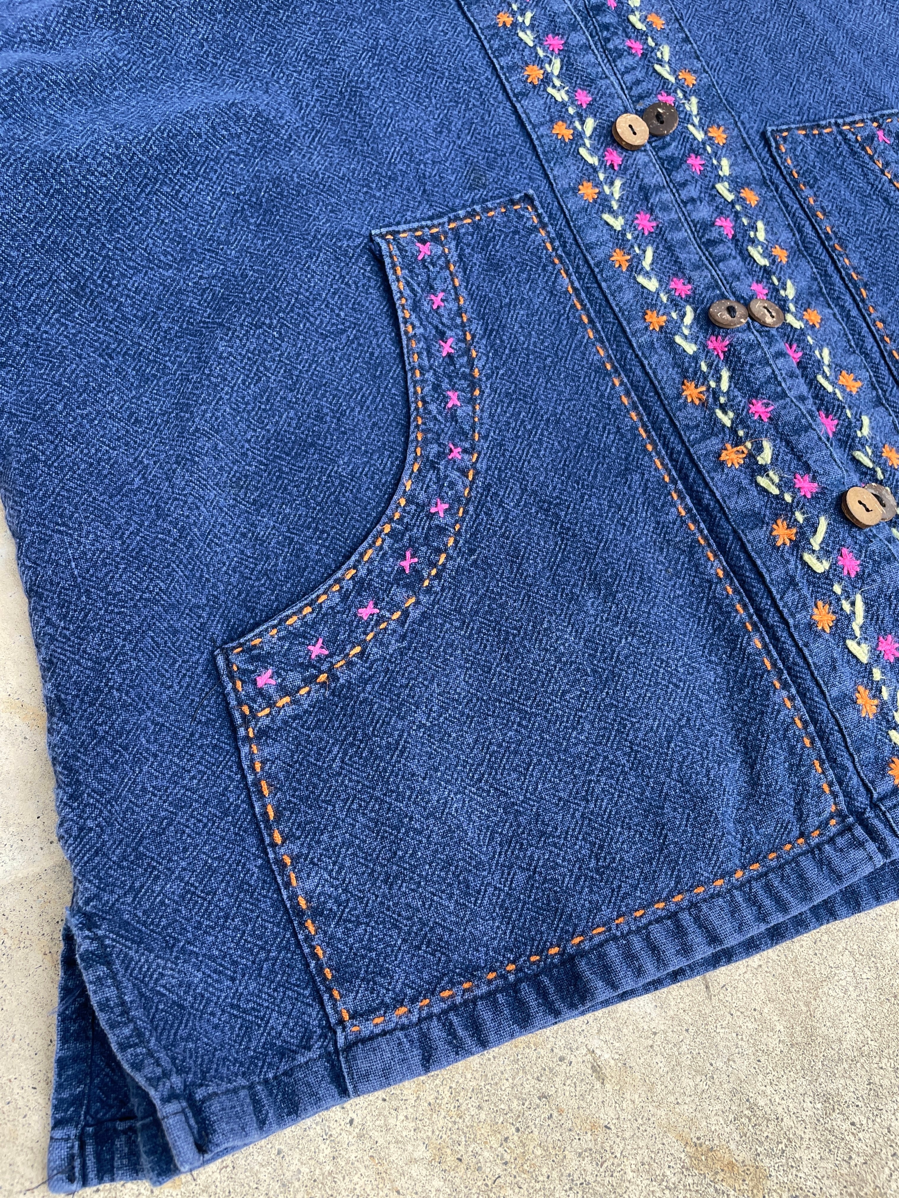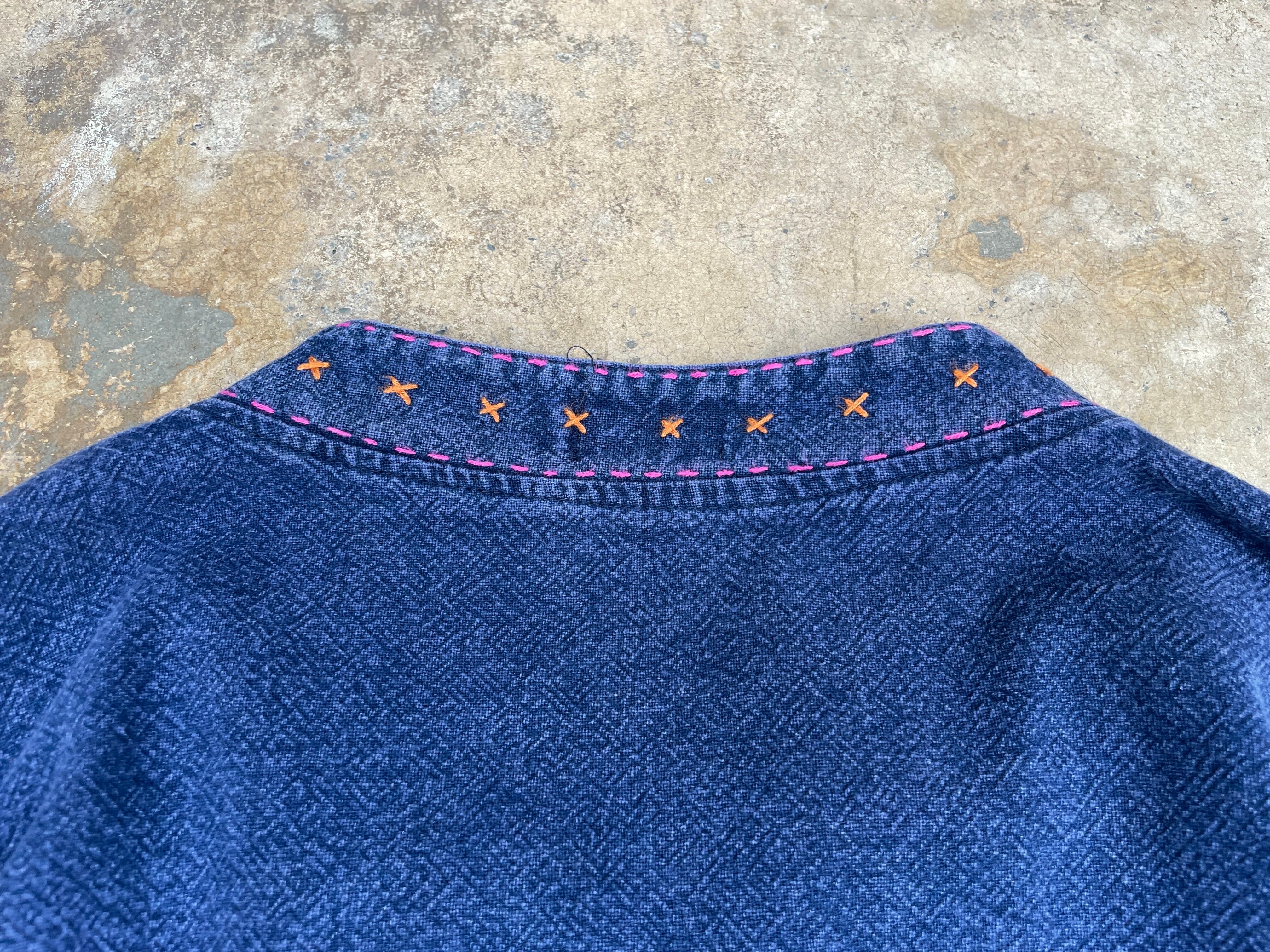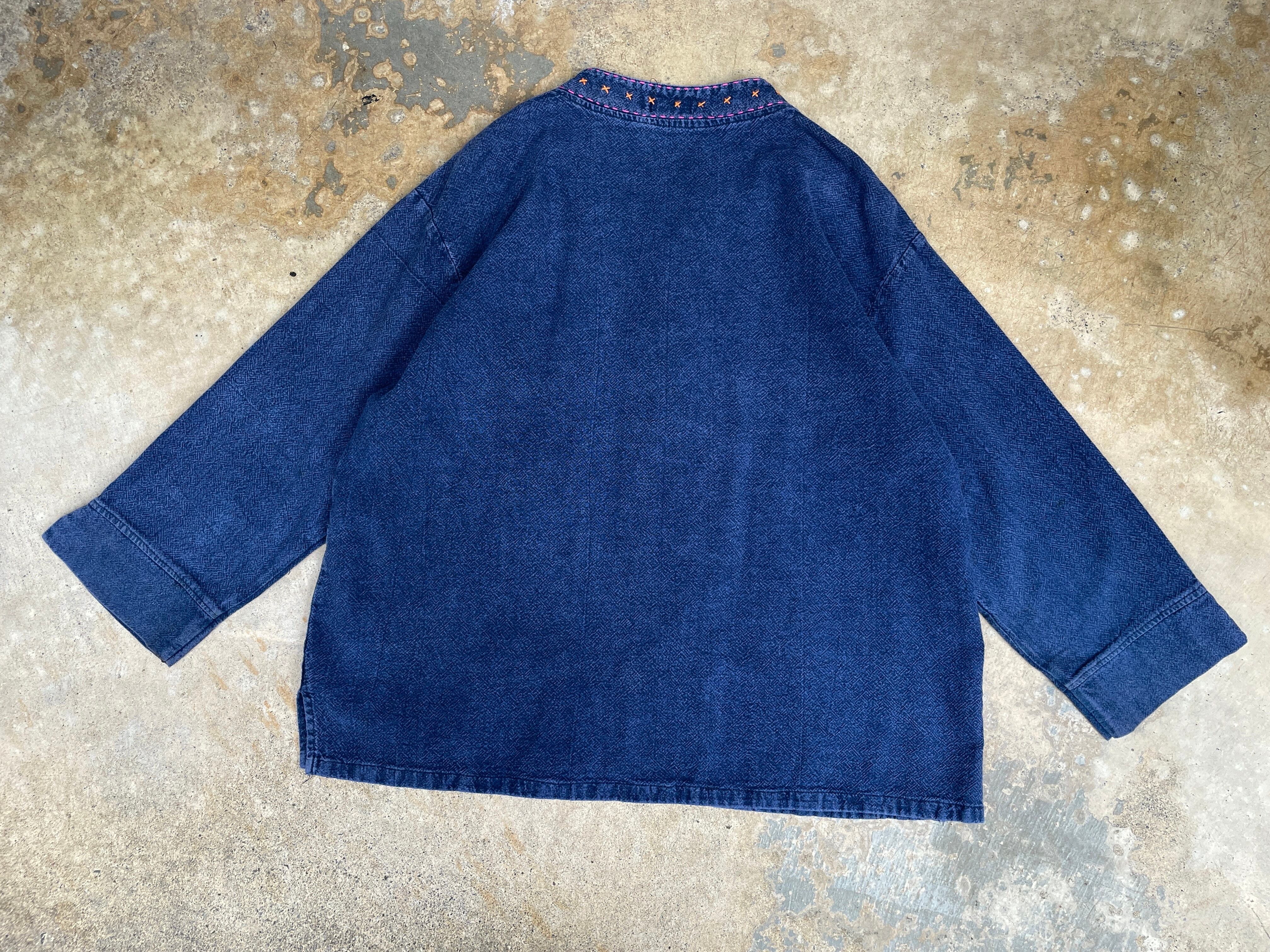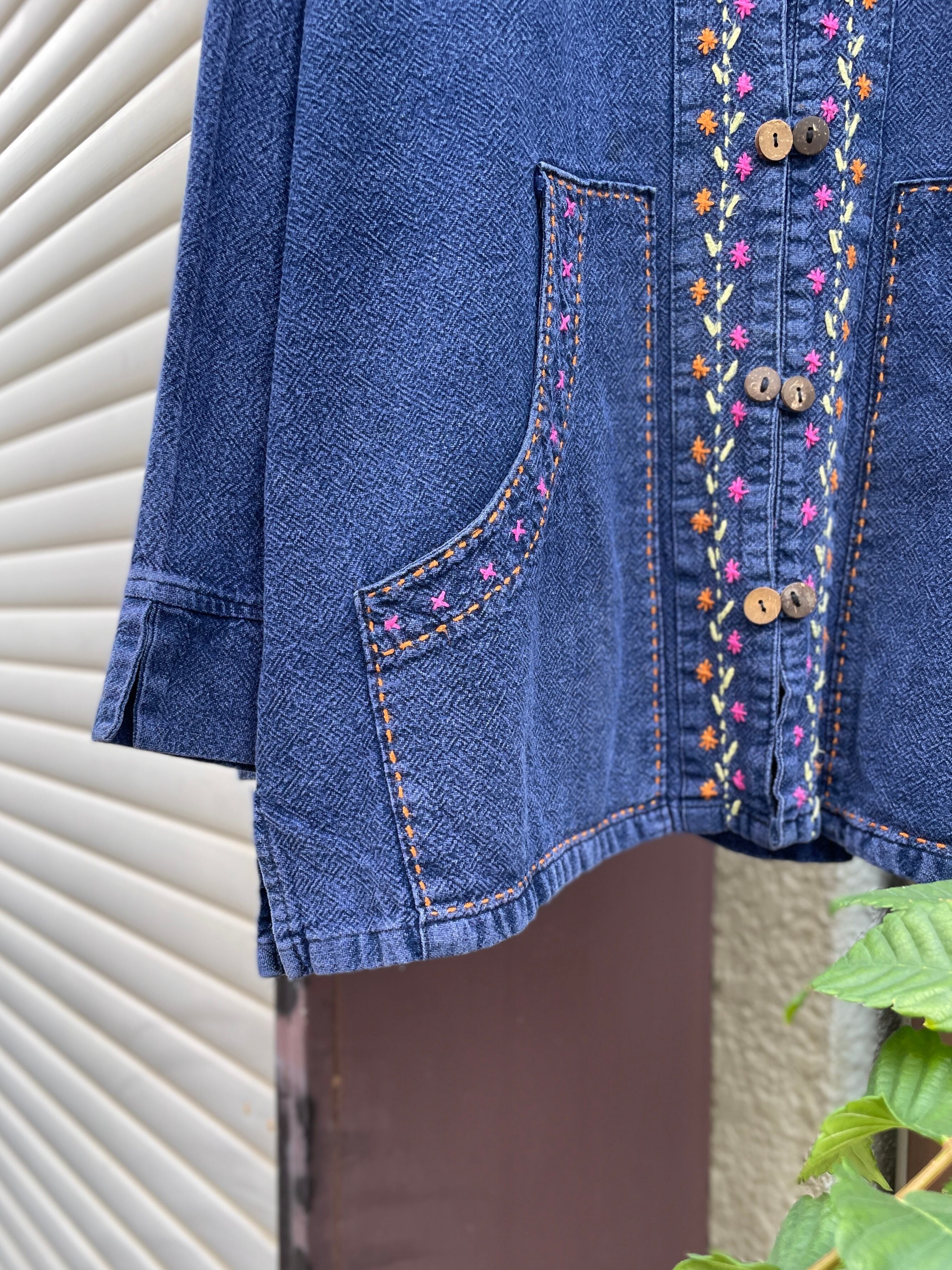 ざっくりとした風合いのあるネイビーボディに、手の込んだ刺繍が可愛らしいアイテム。