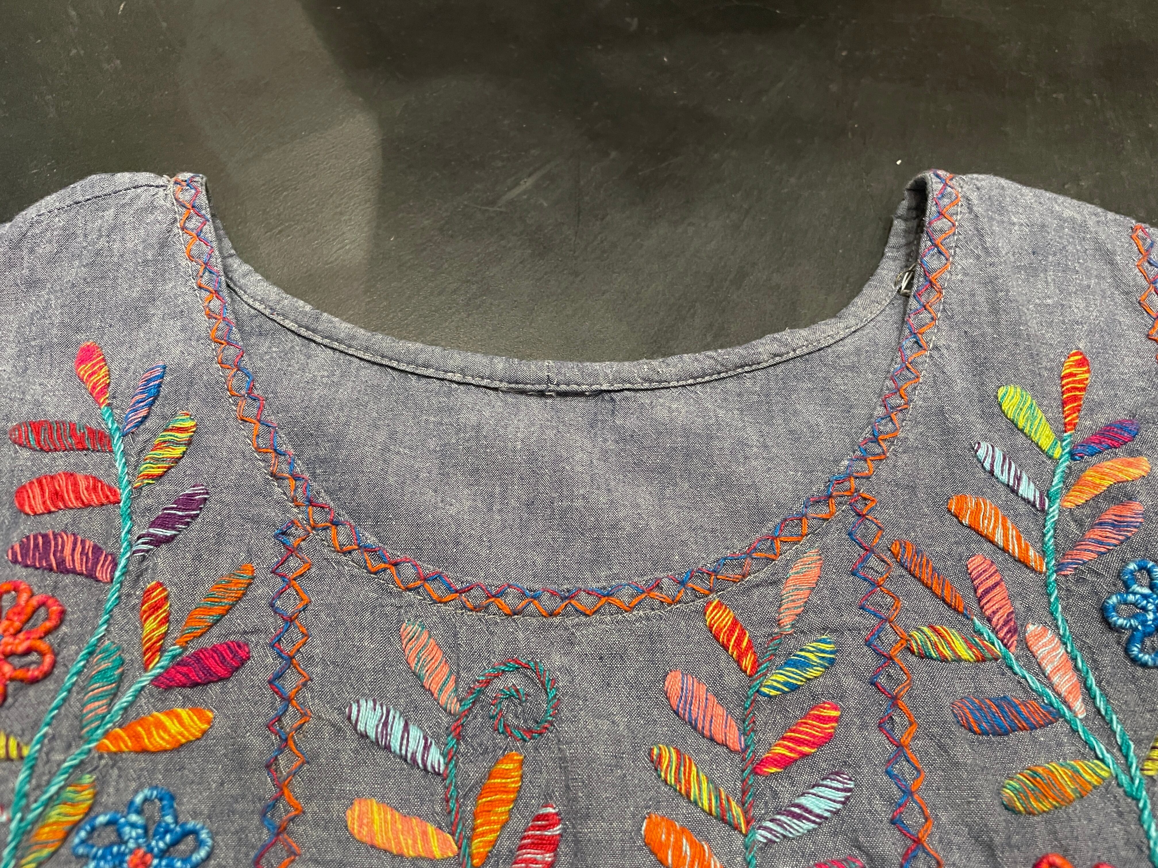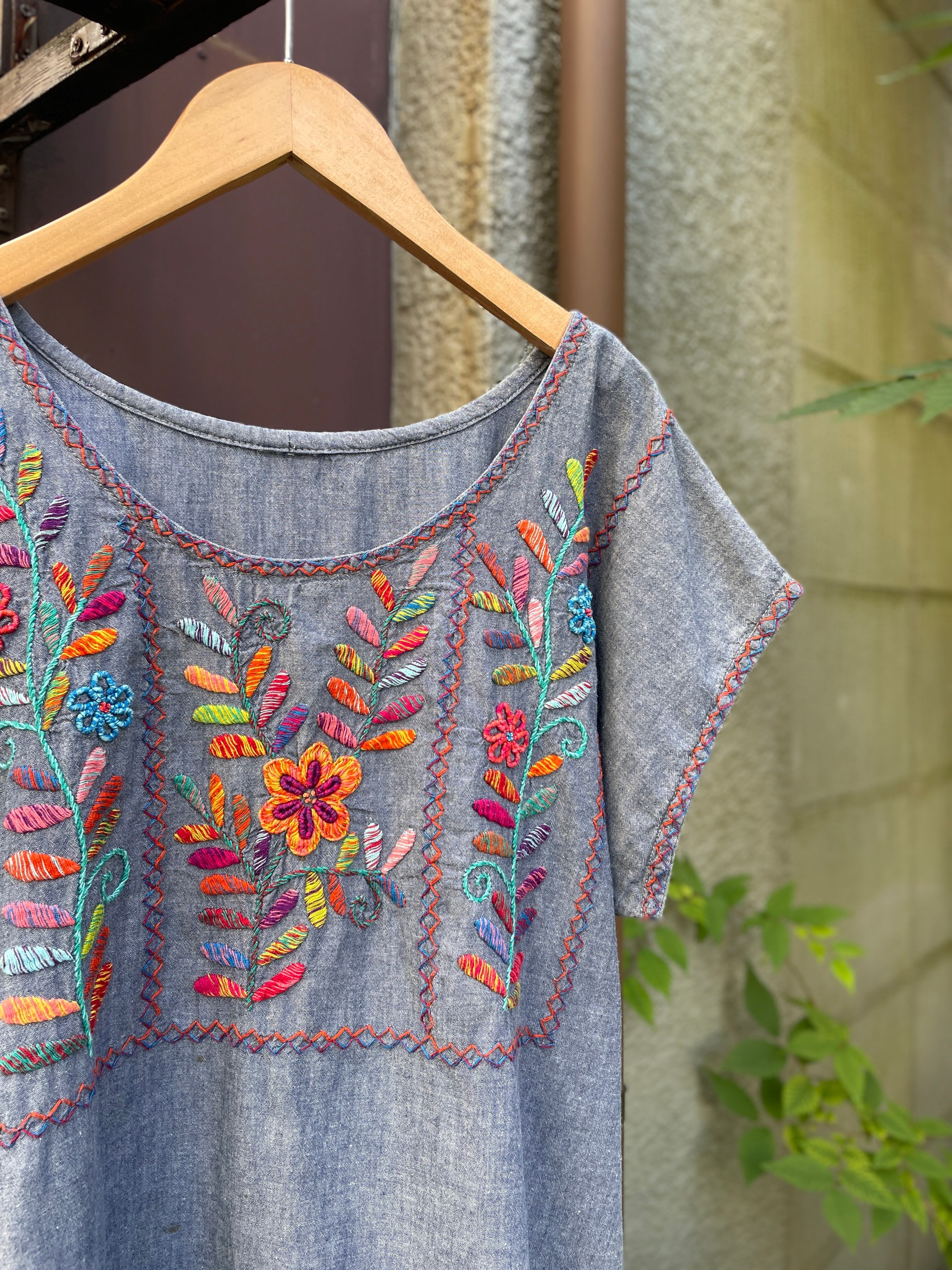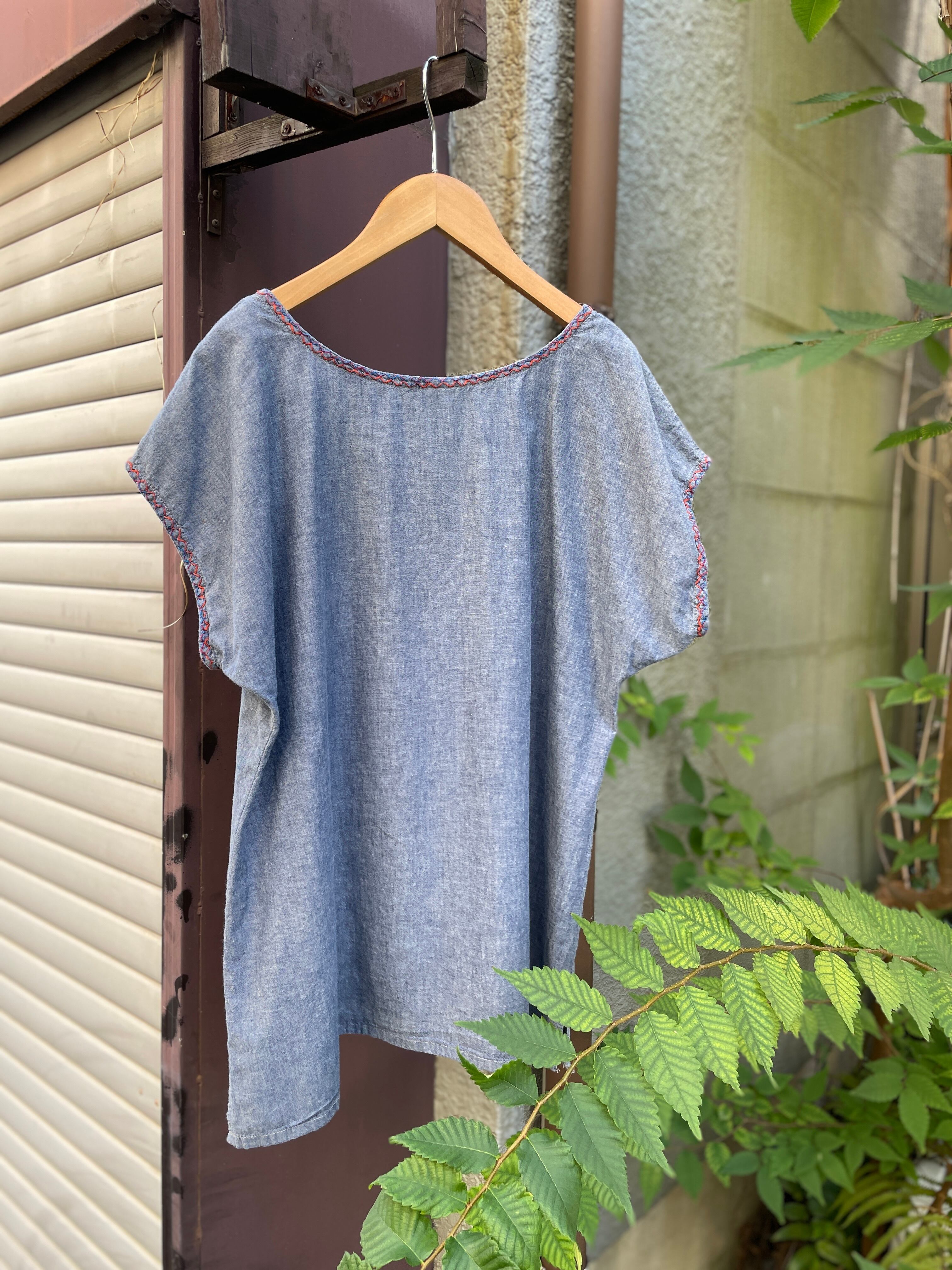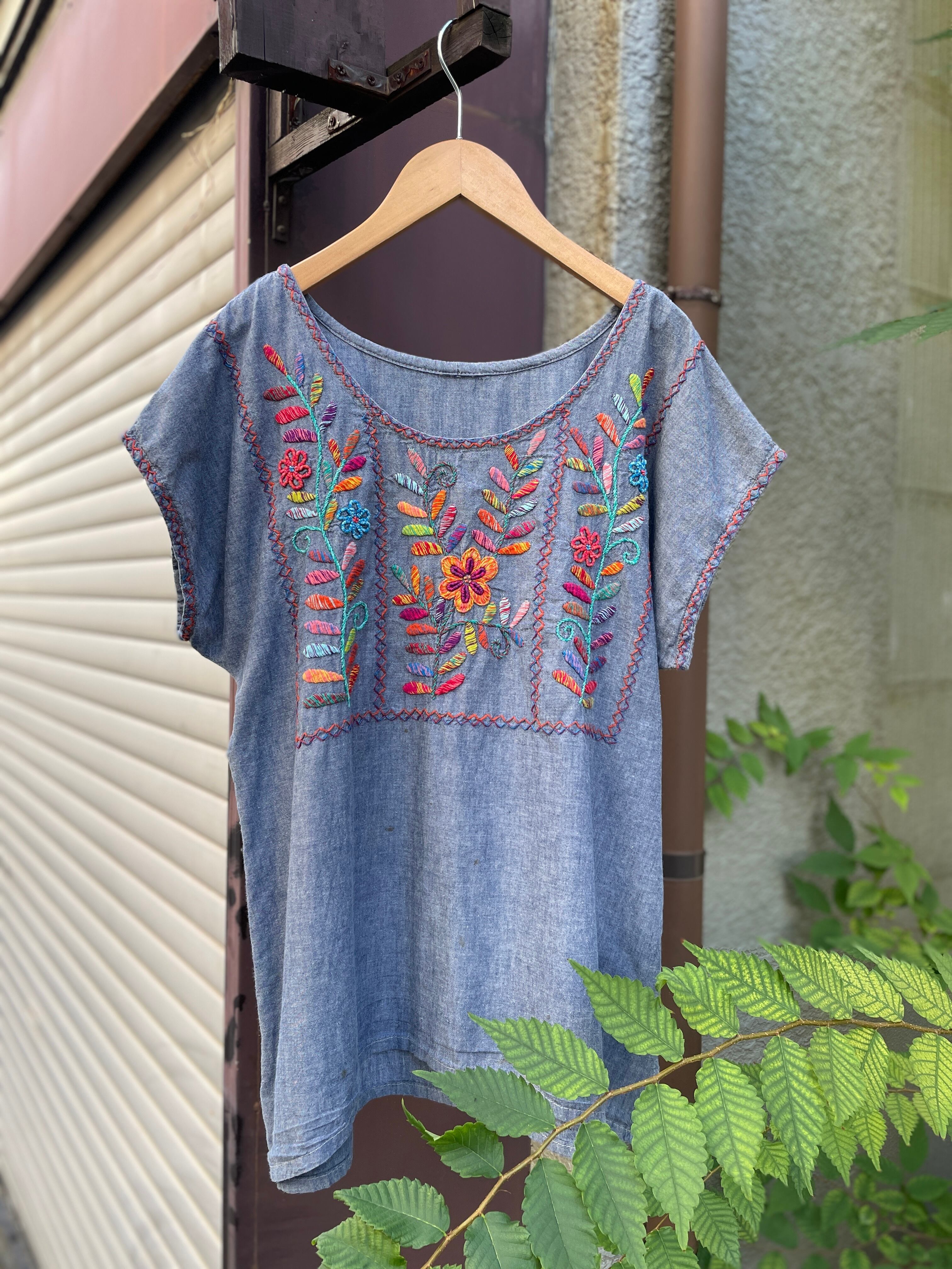 シャンブレーボディにぷっくりとした刺繍が施されたアイテム。