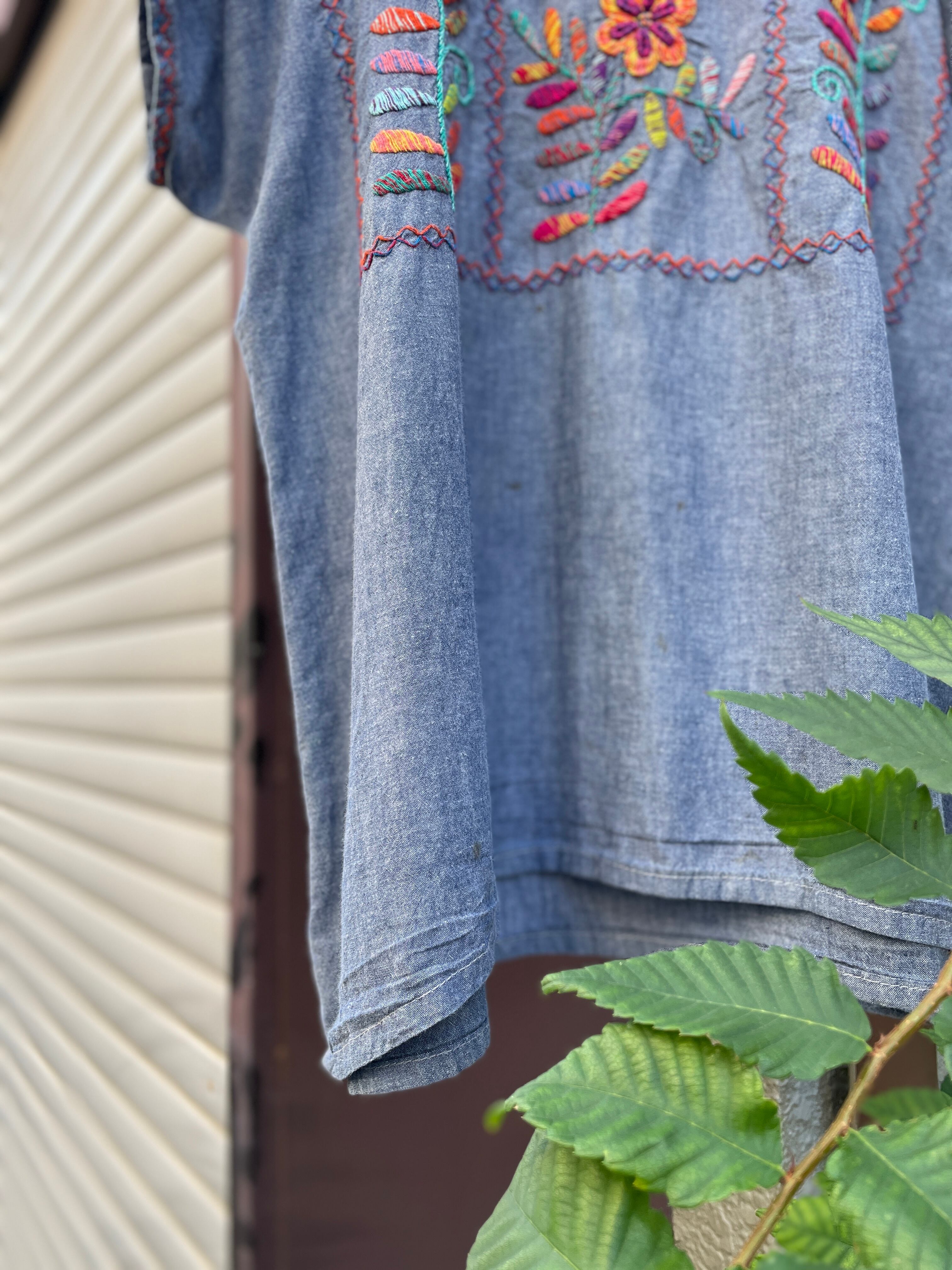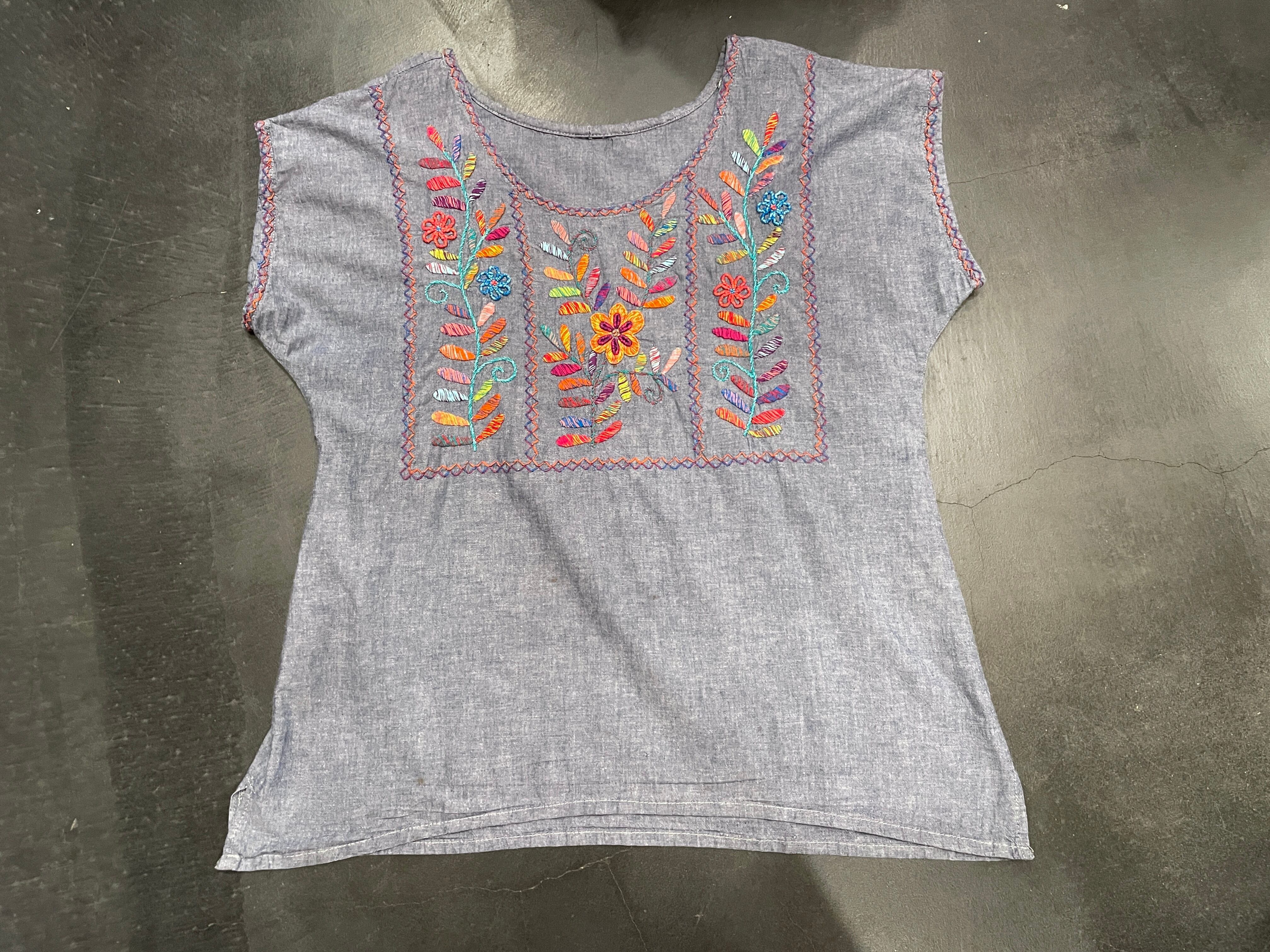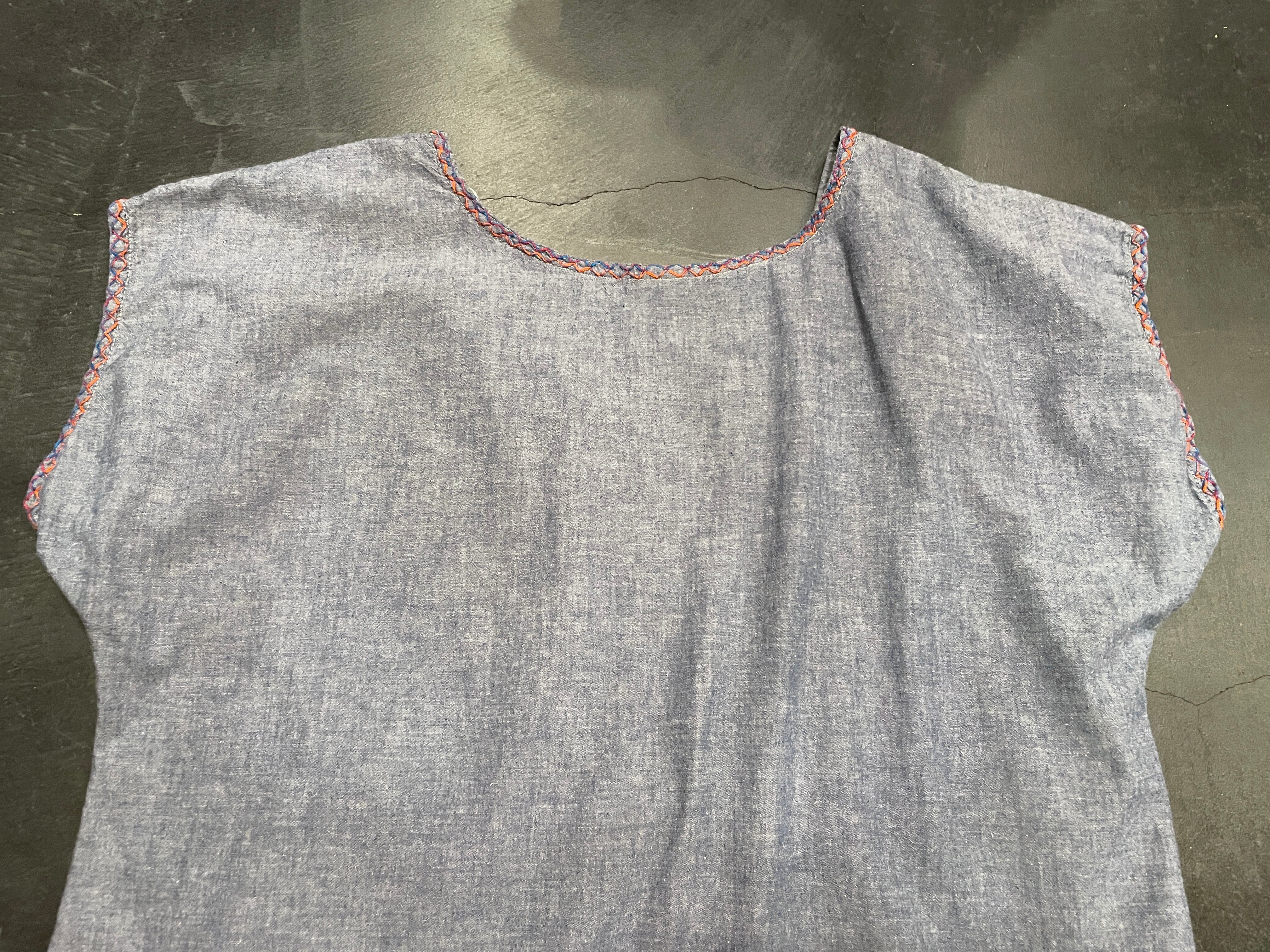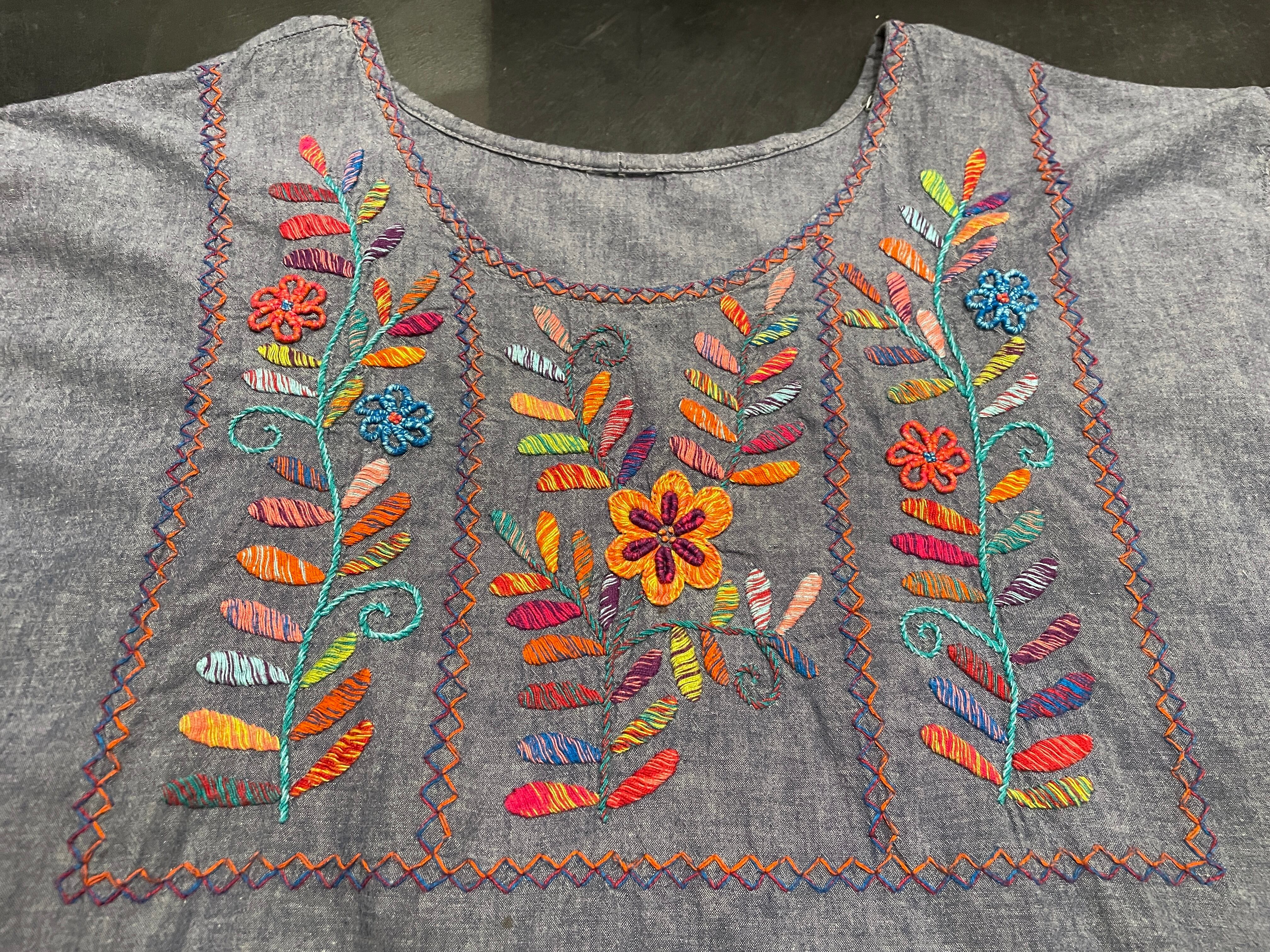 シャンブレーボディにぷっくりとした刺繍が施されたアイテム。