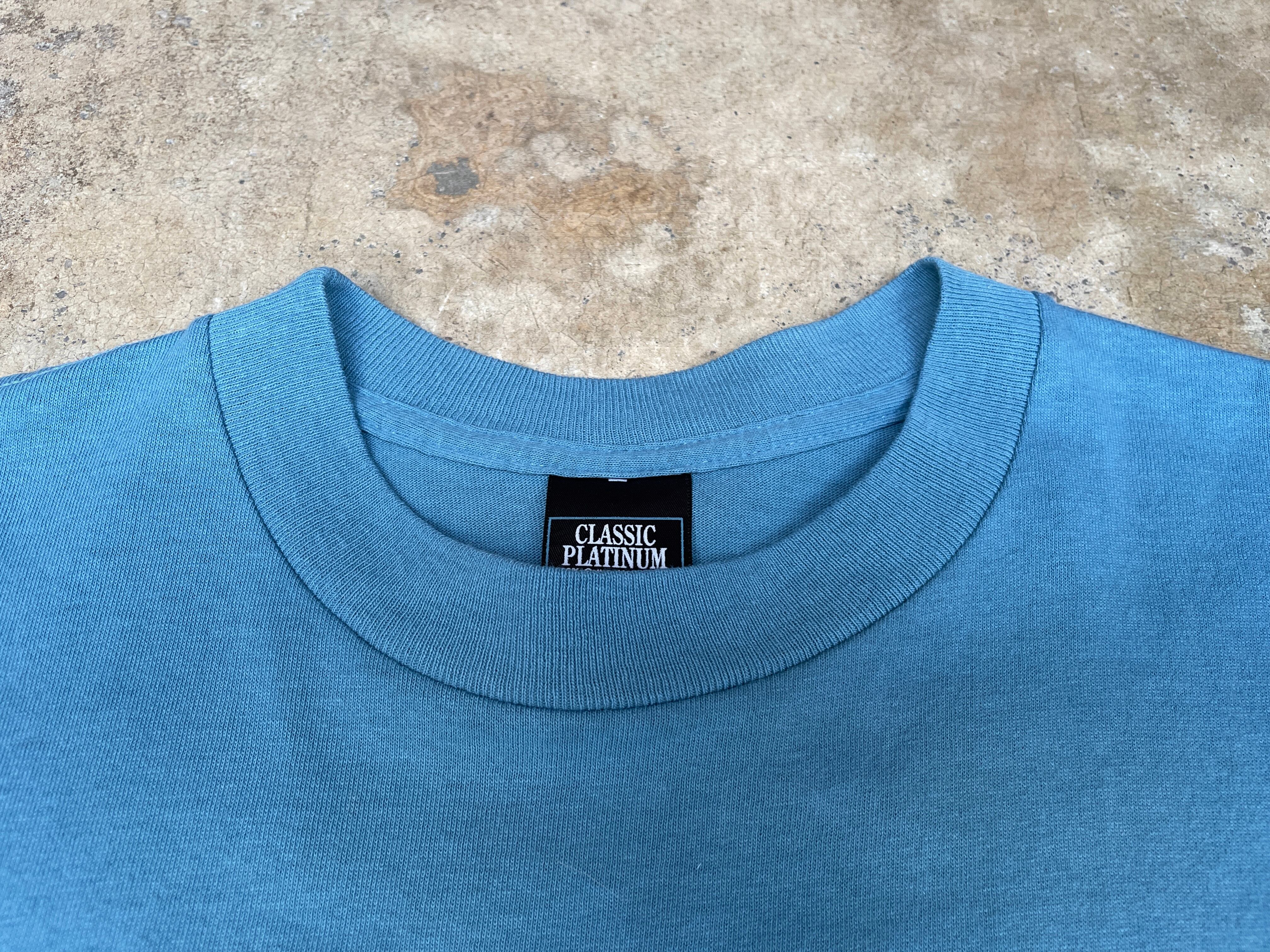 くすみブルーのボディに胸元にワンポイントのプリントが施されたアイテム。