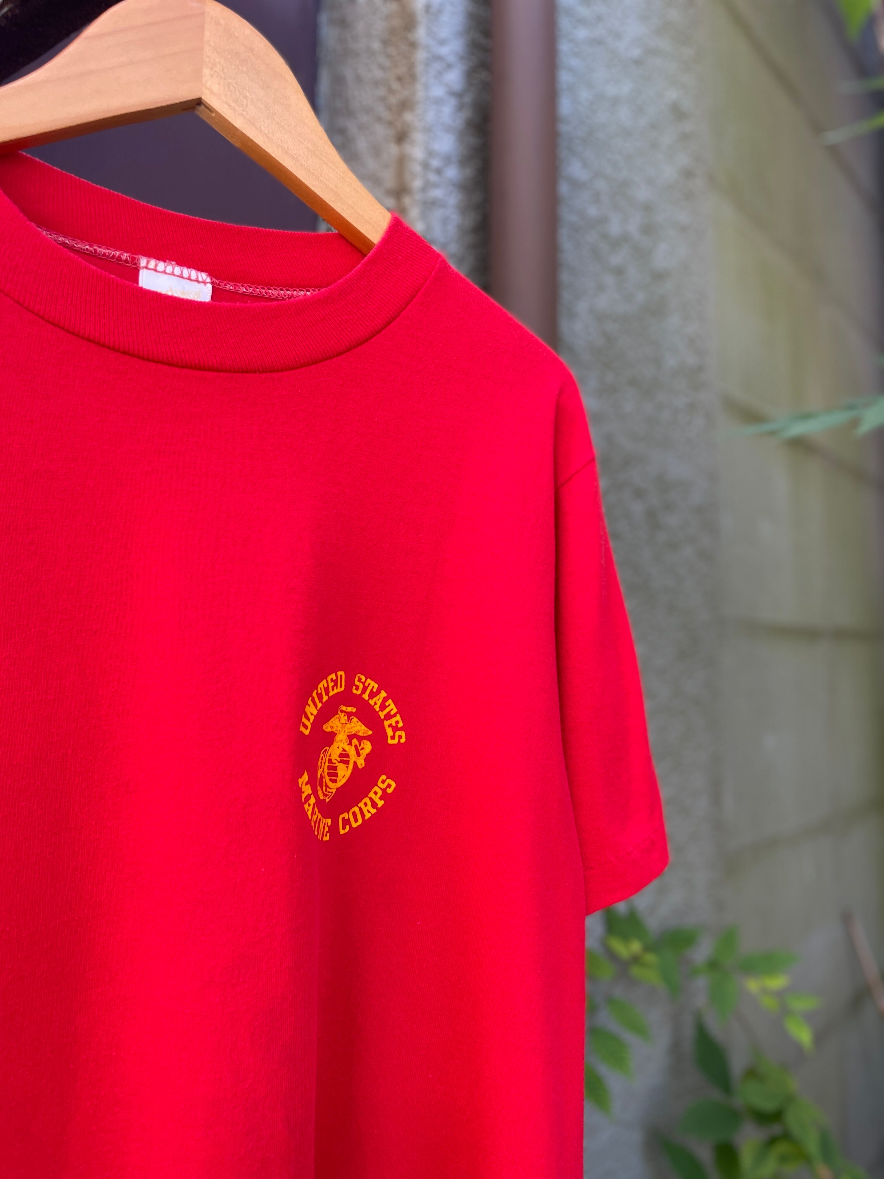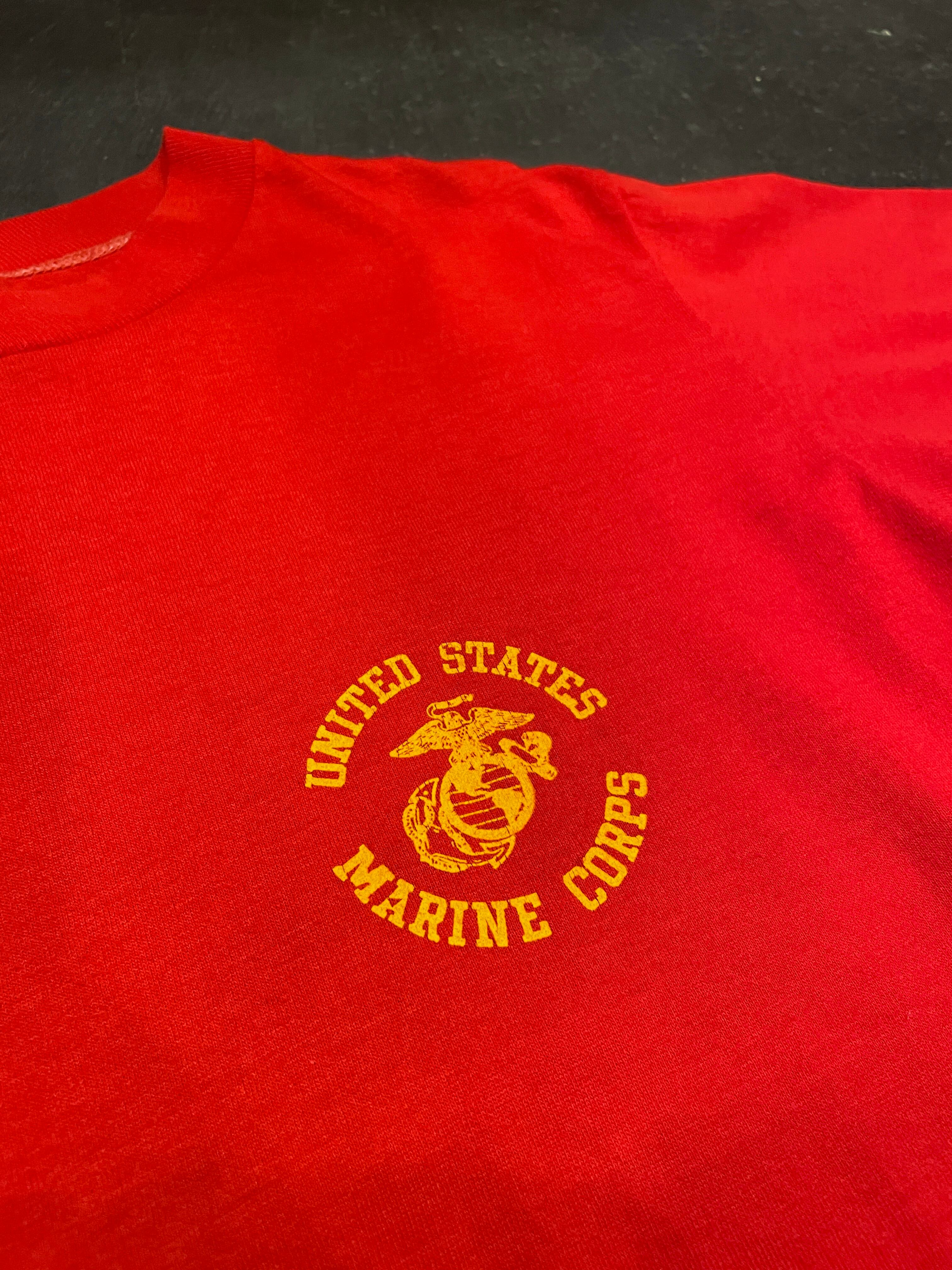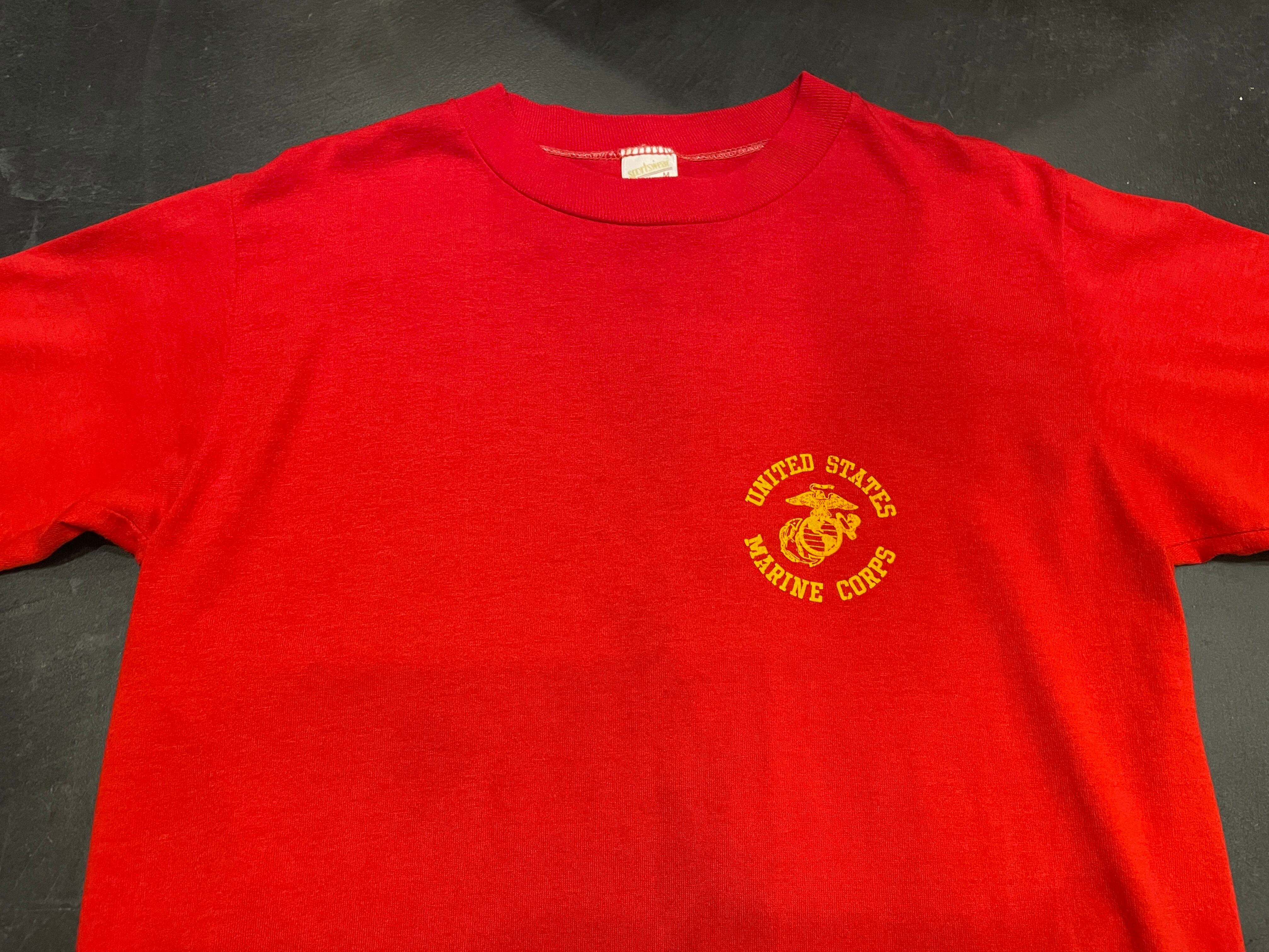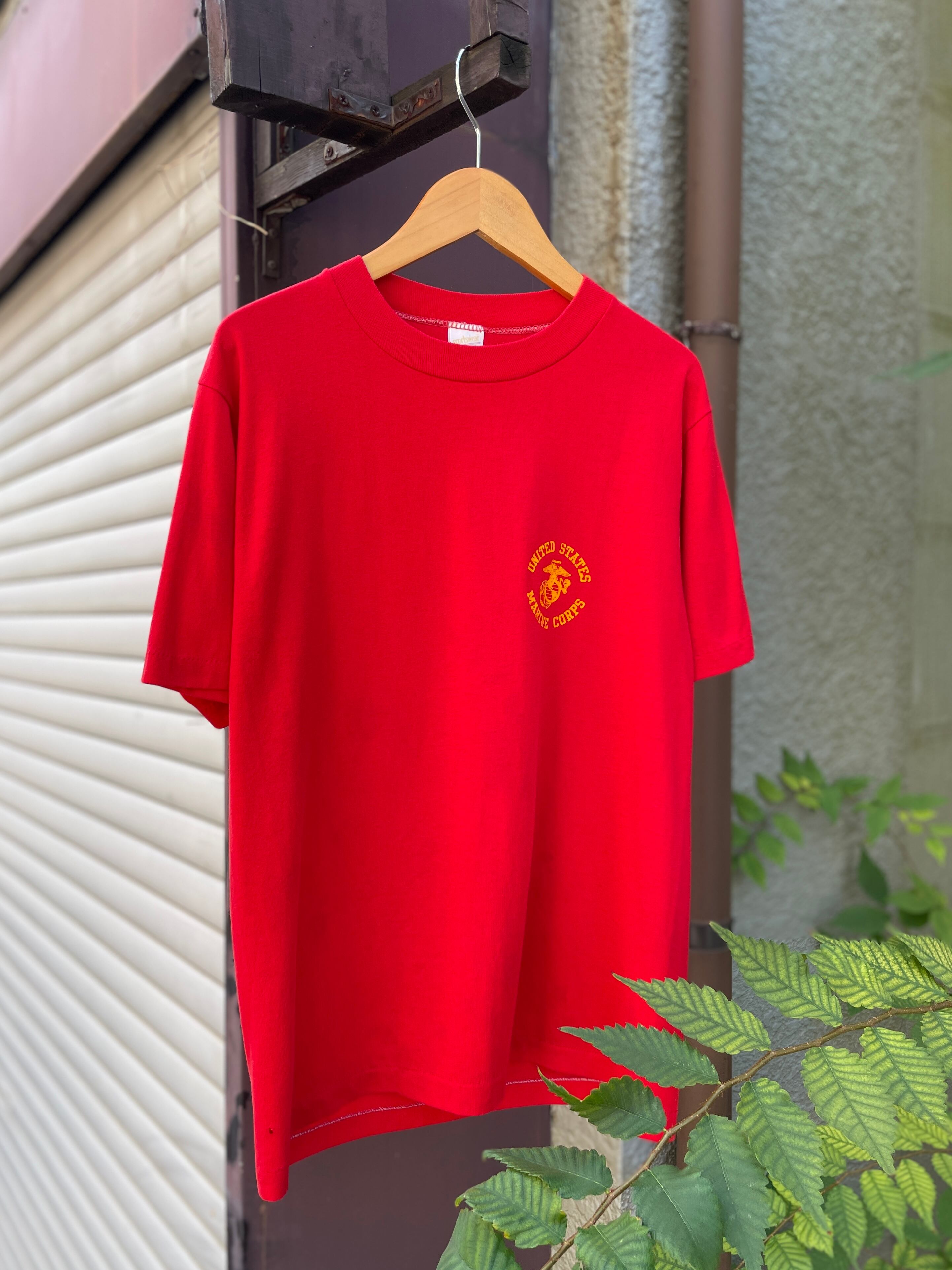 レッドボディに胸元にUSMCのワンポイントプリントが施されたアイテム。