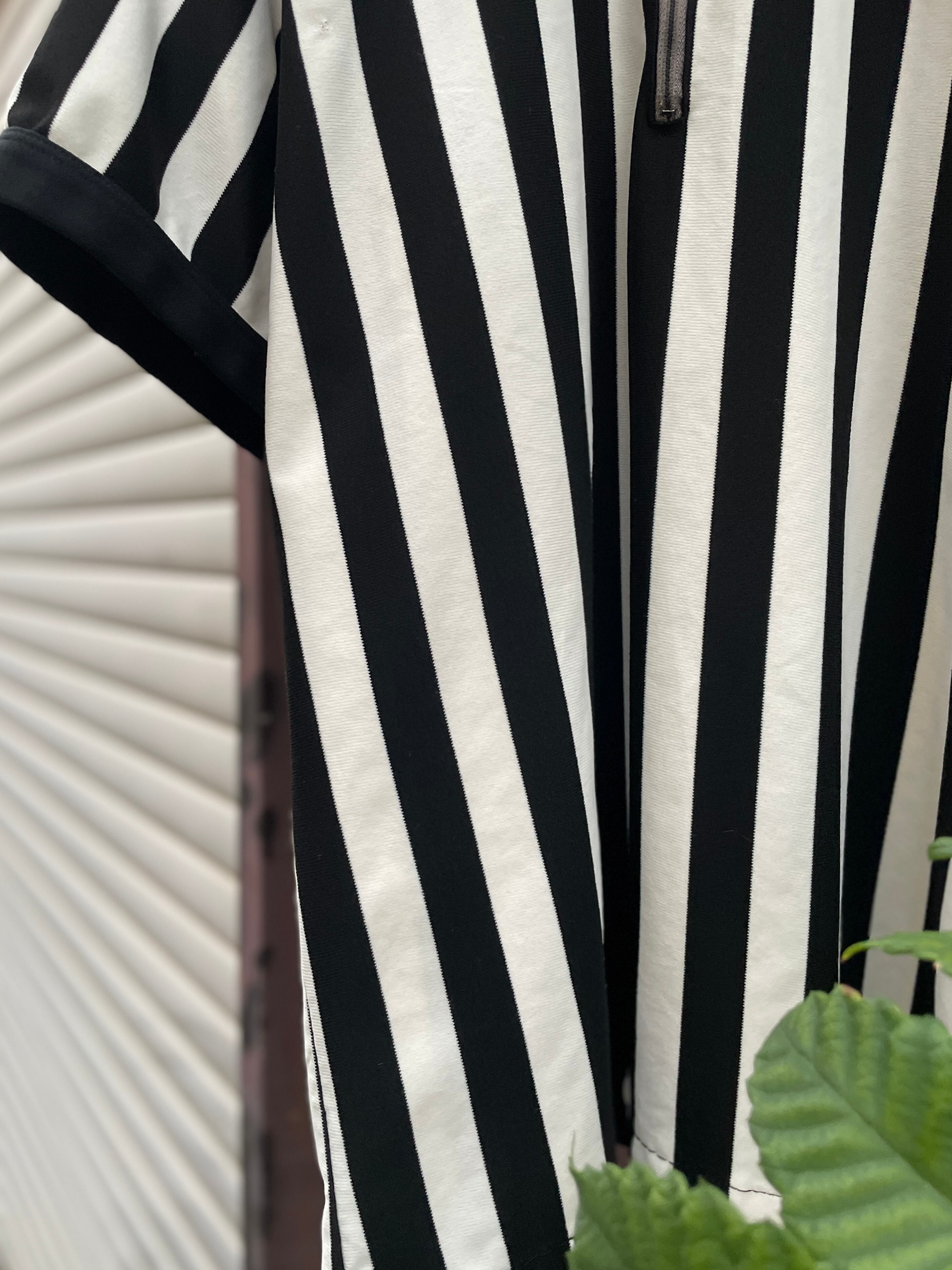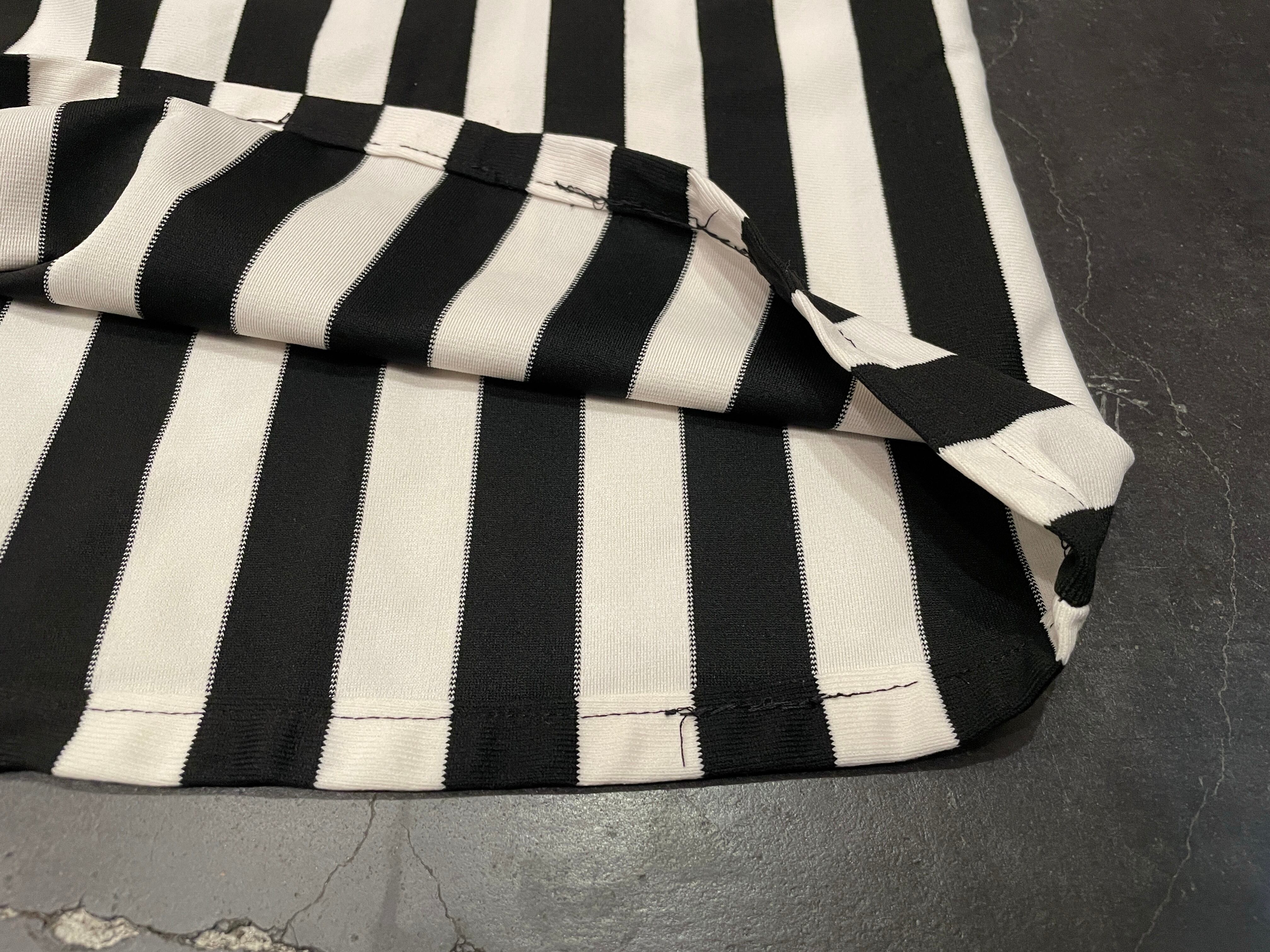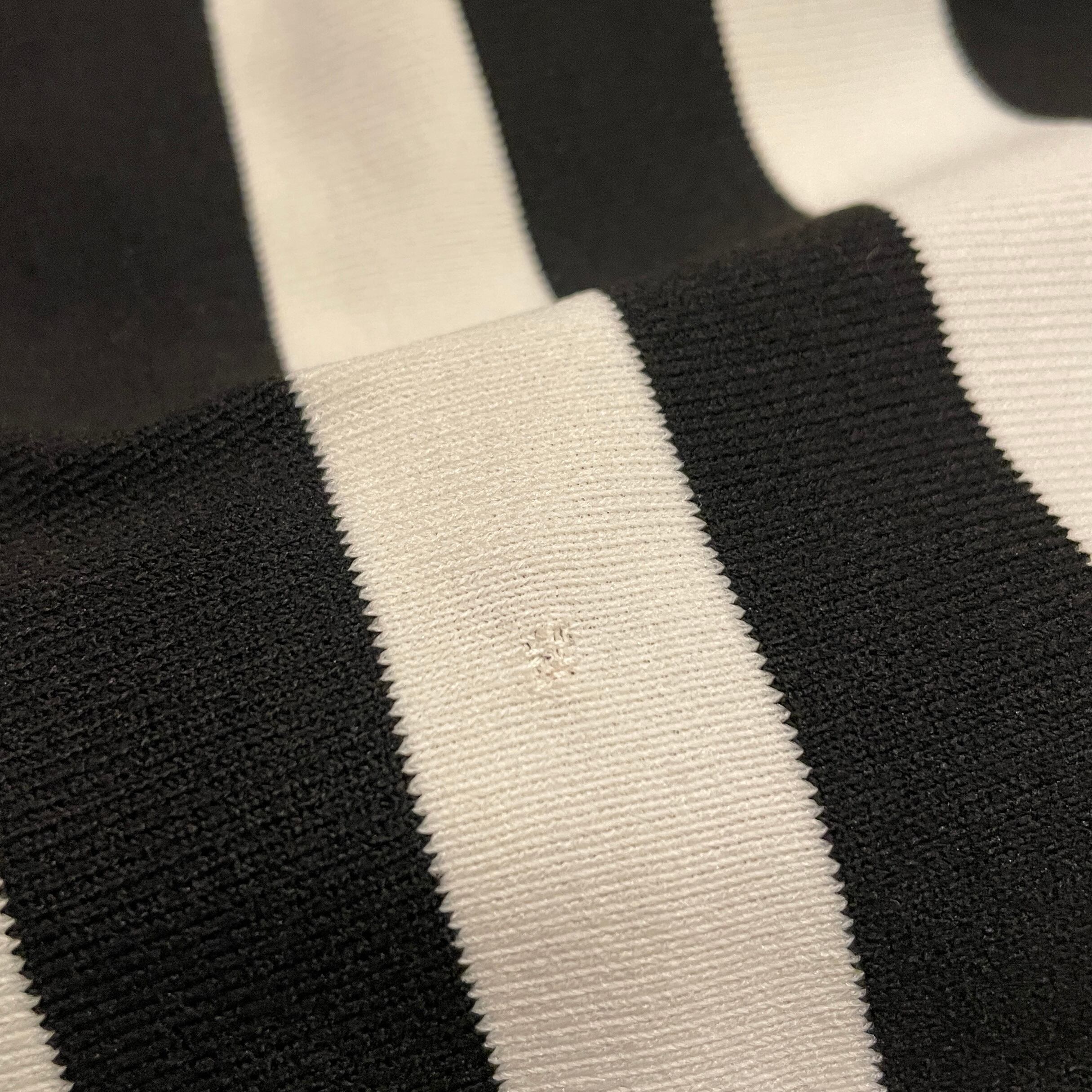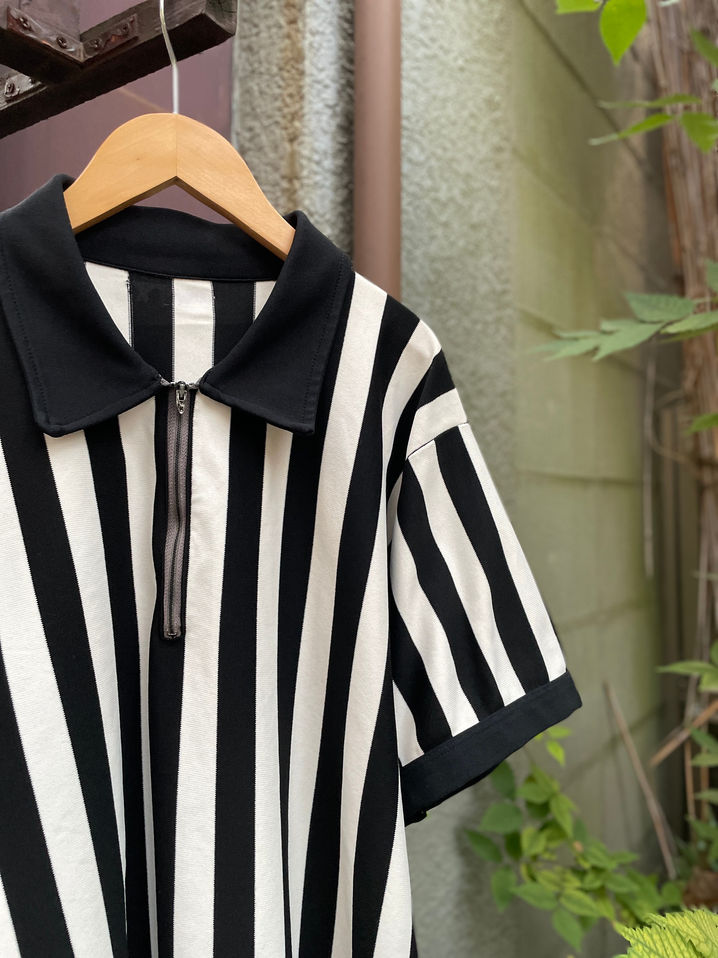 ホワイト×ブラックのストライプボディに襟元と袖リブが効いたアイテム。