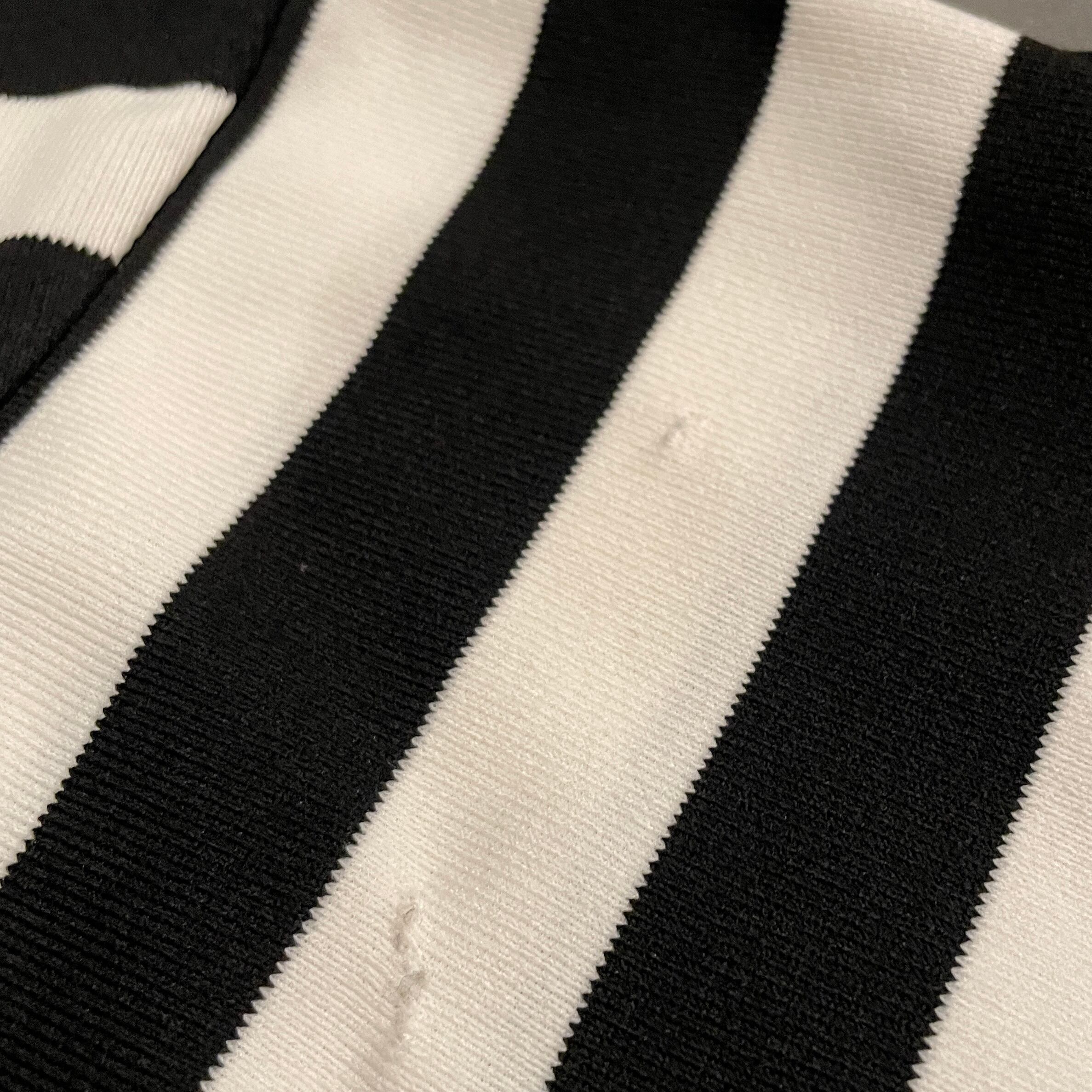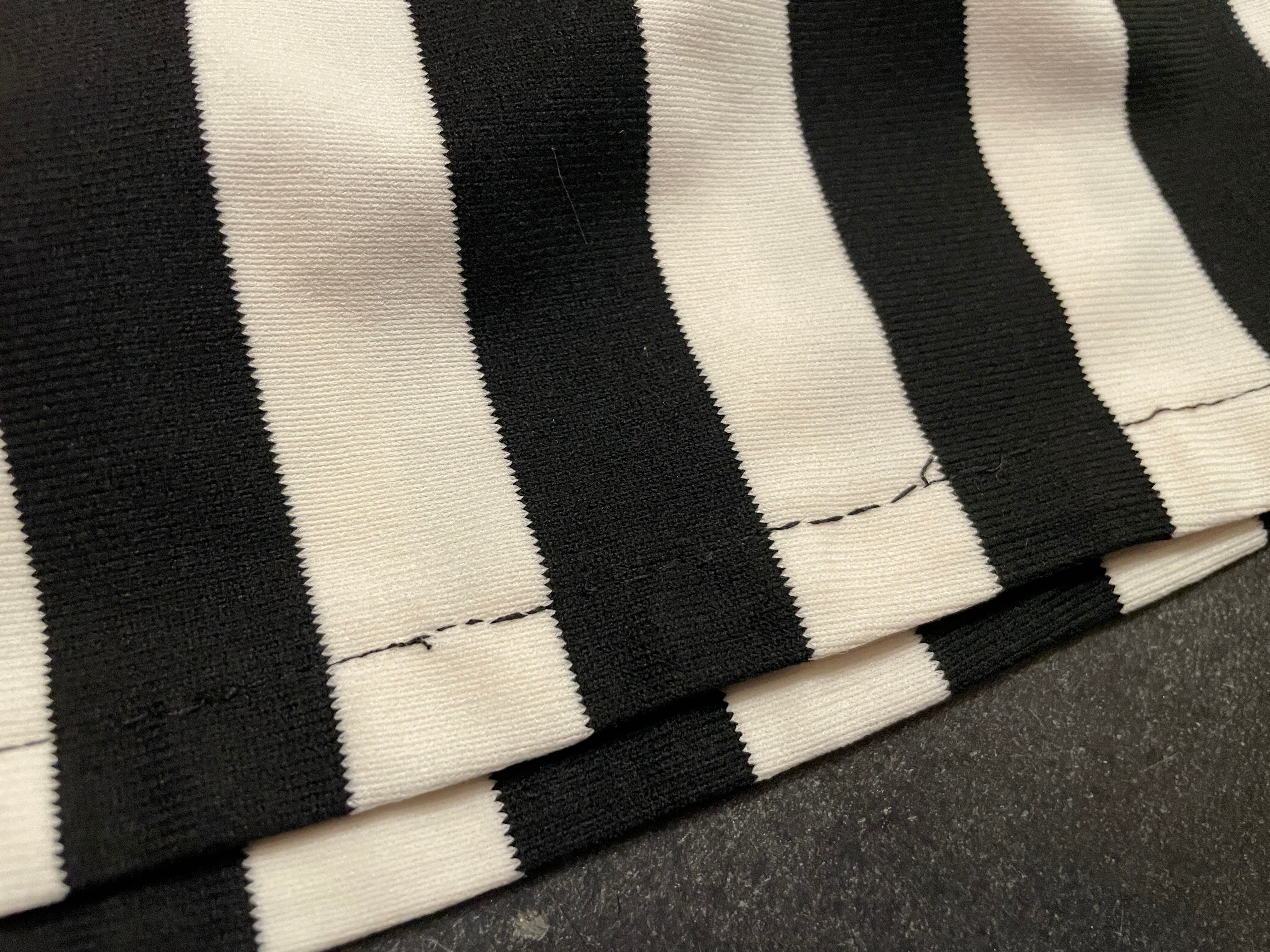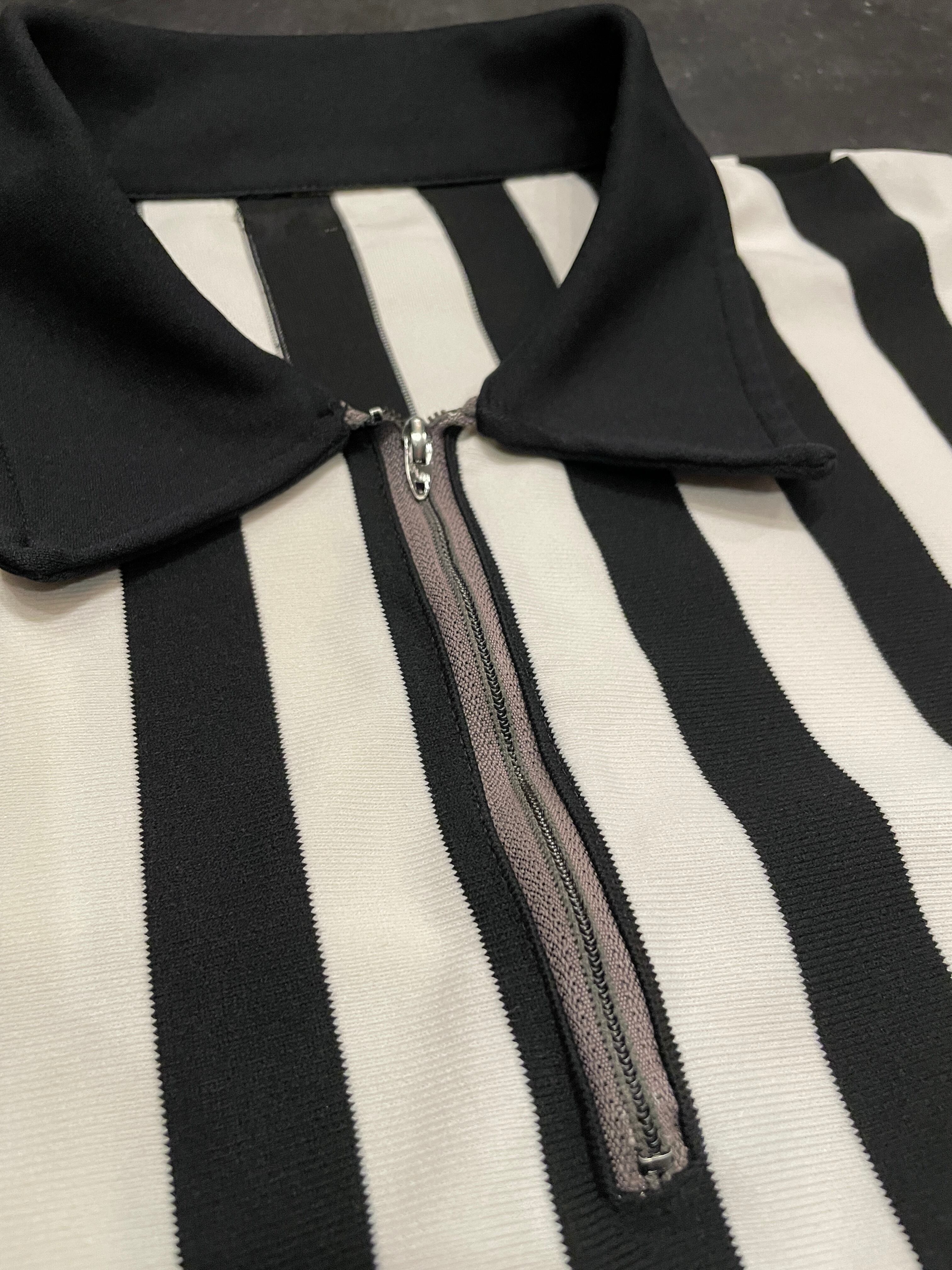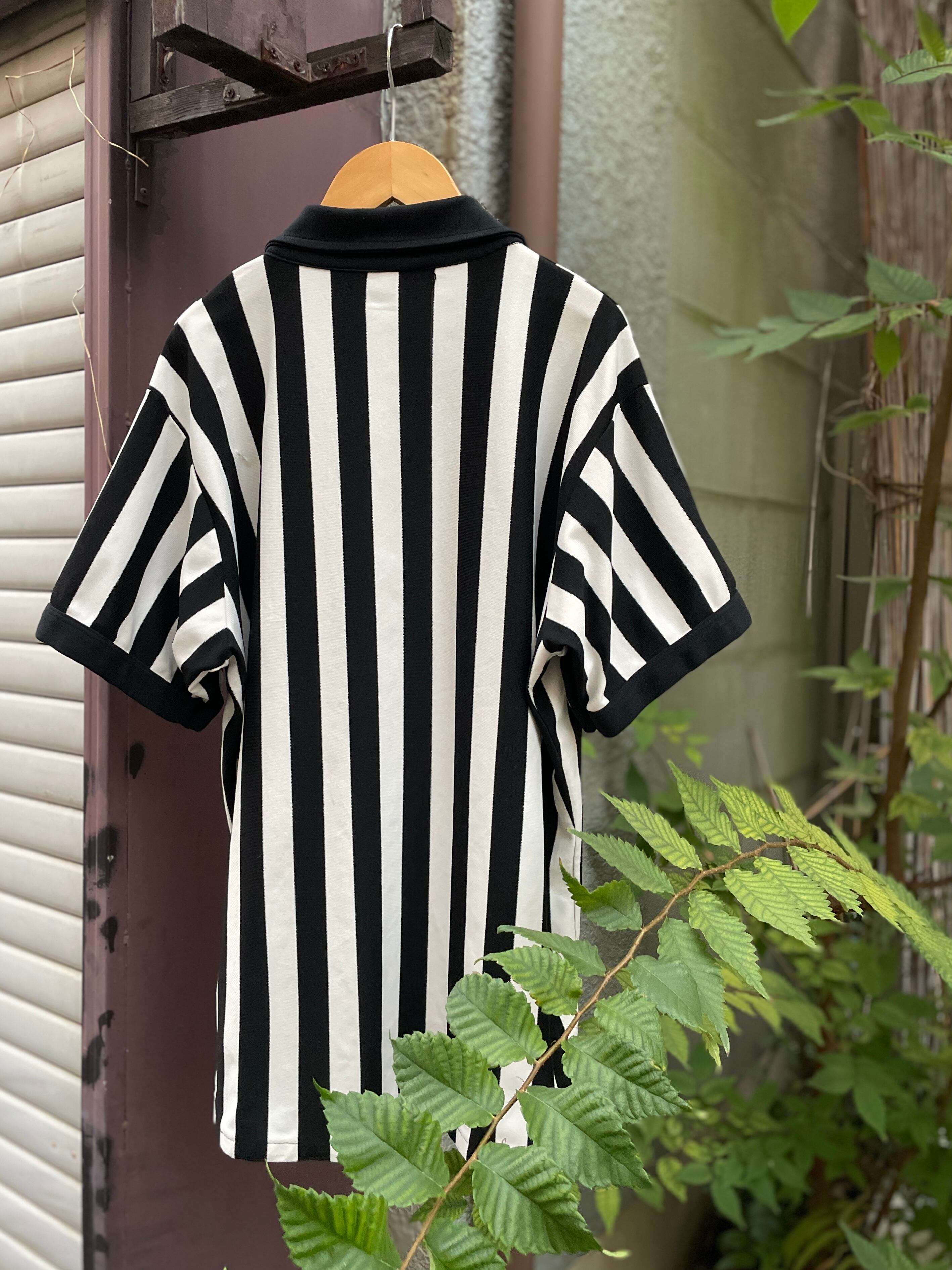ホワイト×ブラックのストライプボディに襟元と袖リブが効いたアイテム。