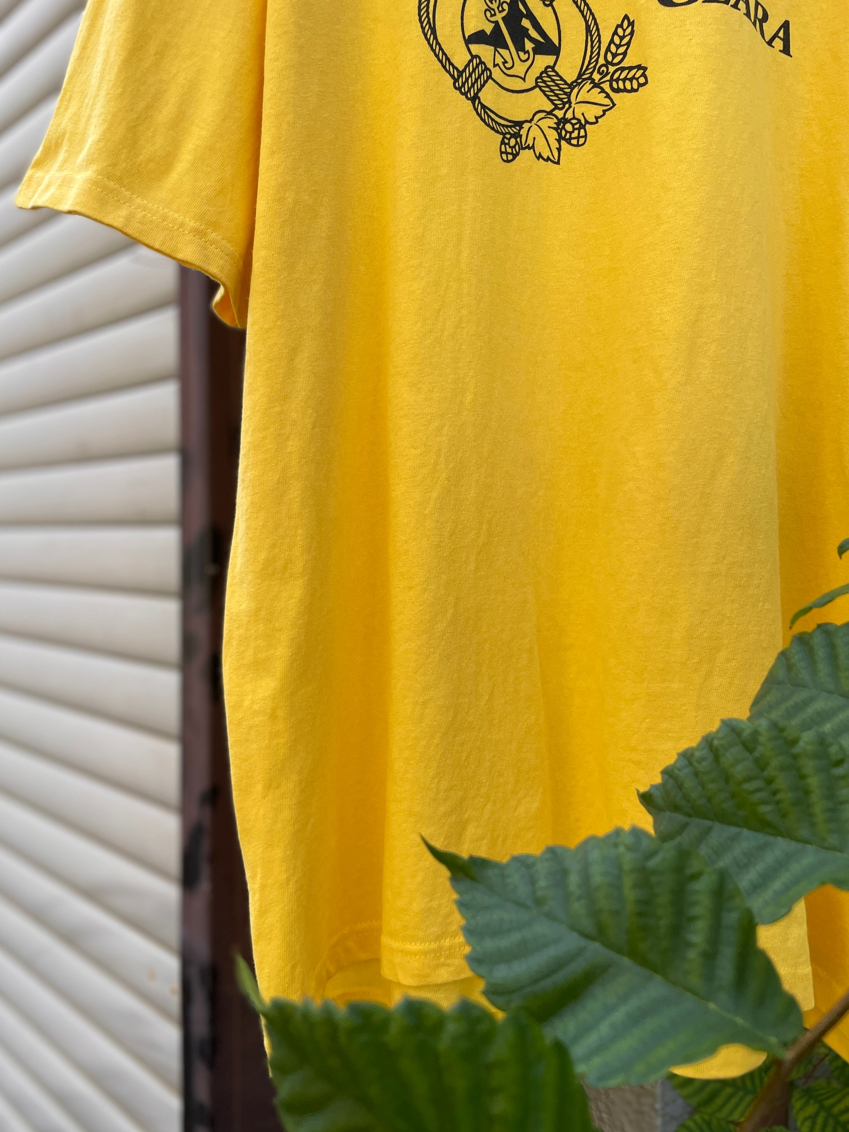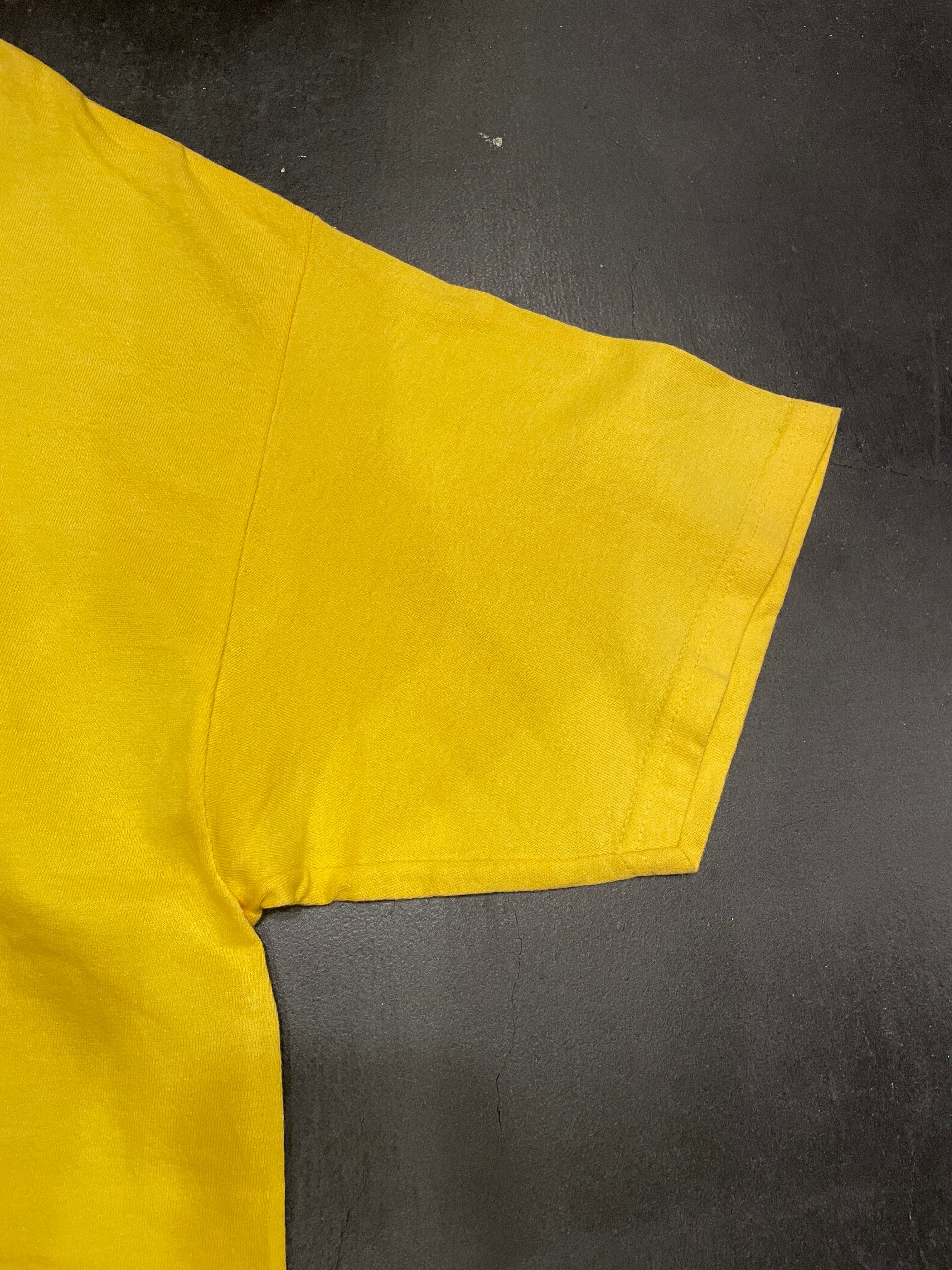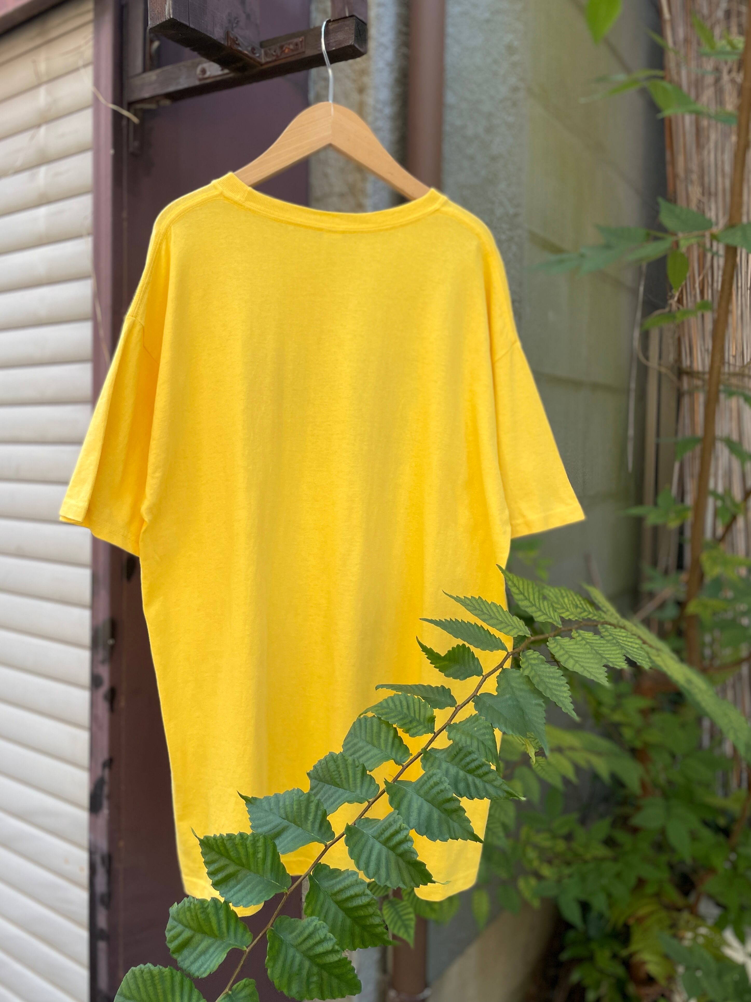 レモンイエローボディにアドバタイシングプリントが施されたアイテム。