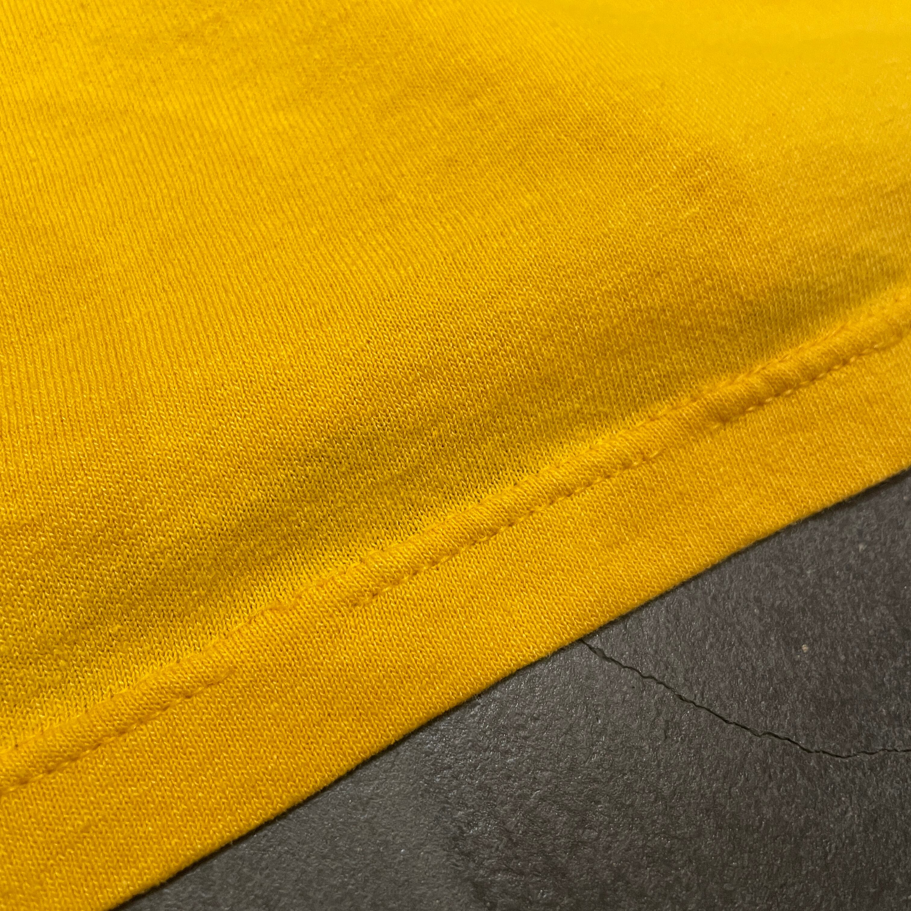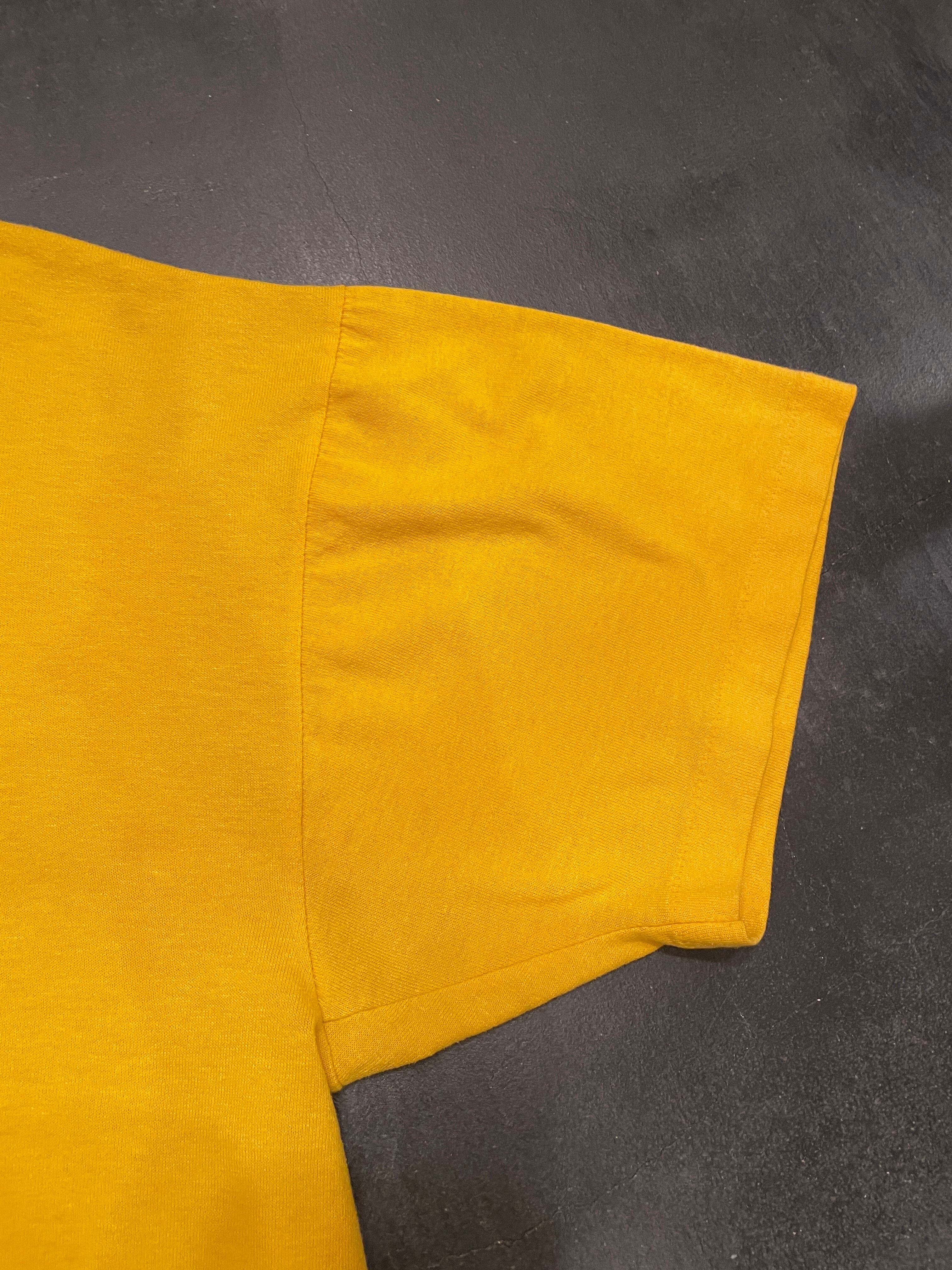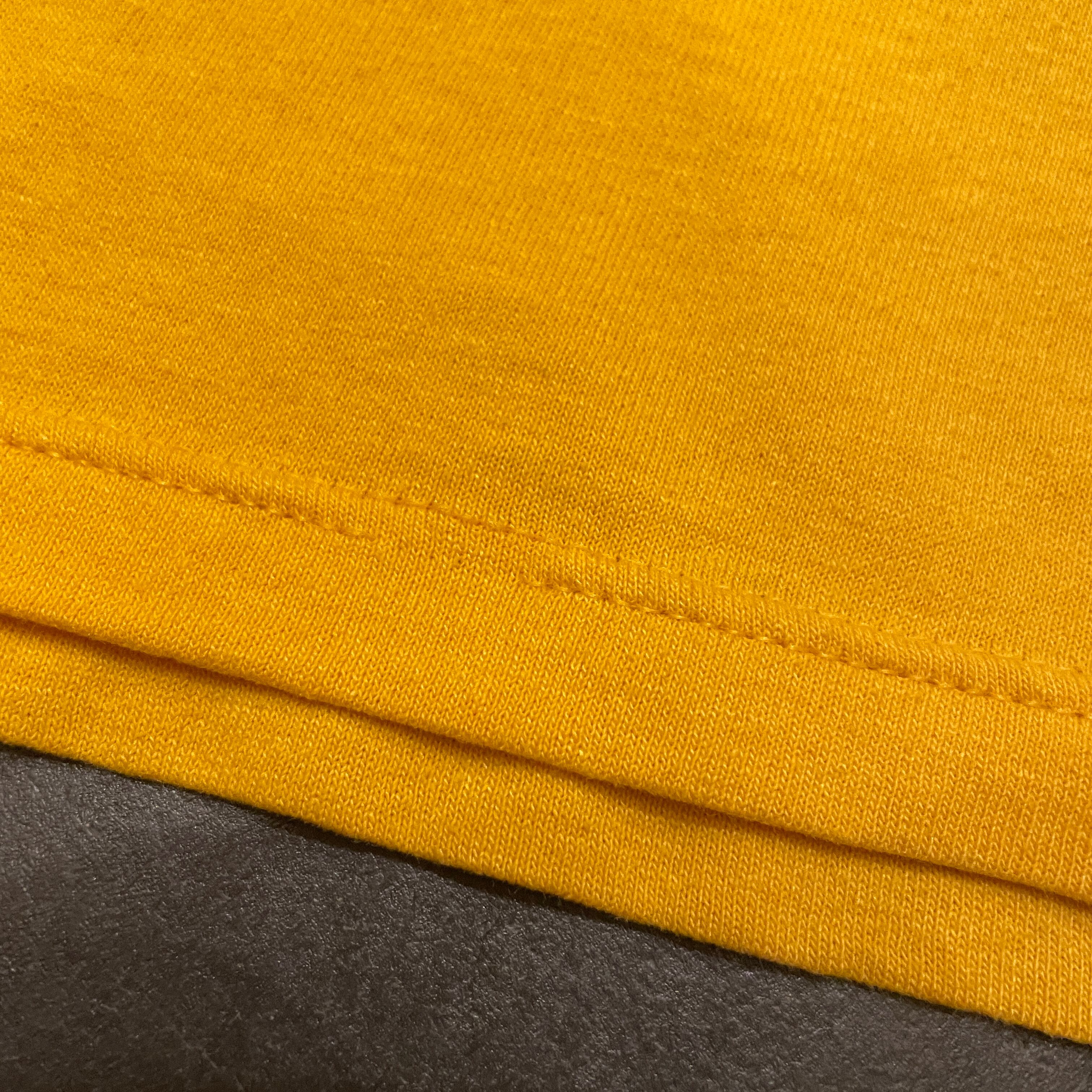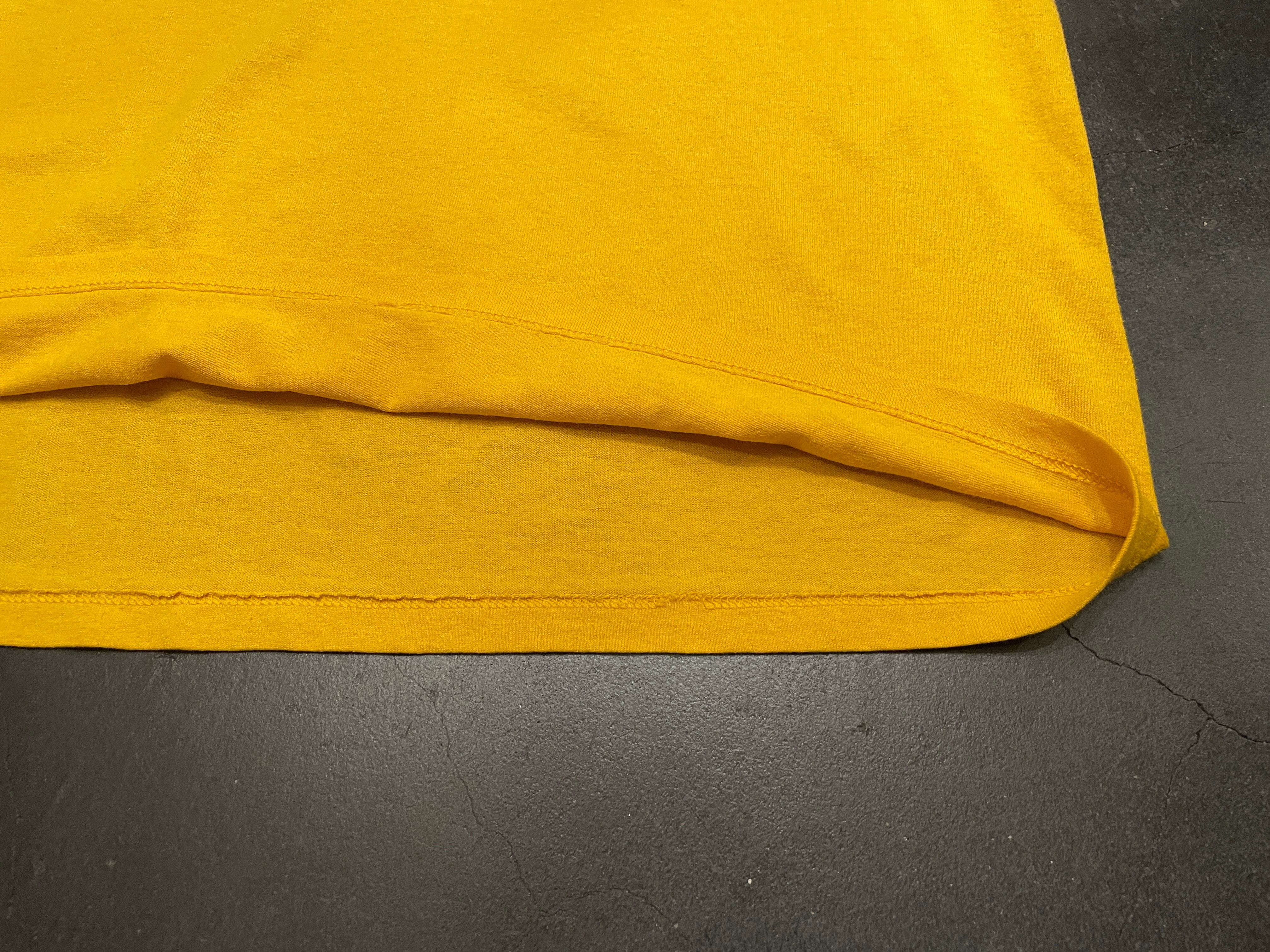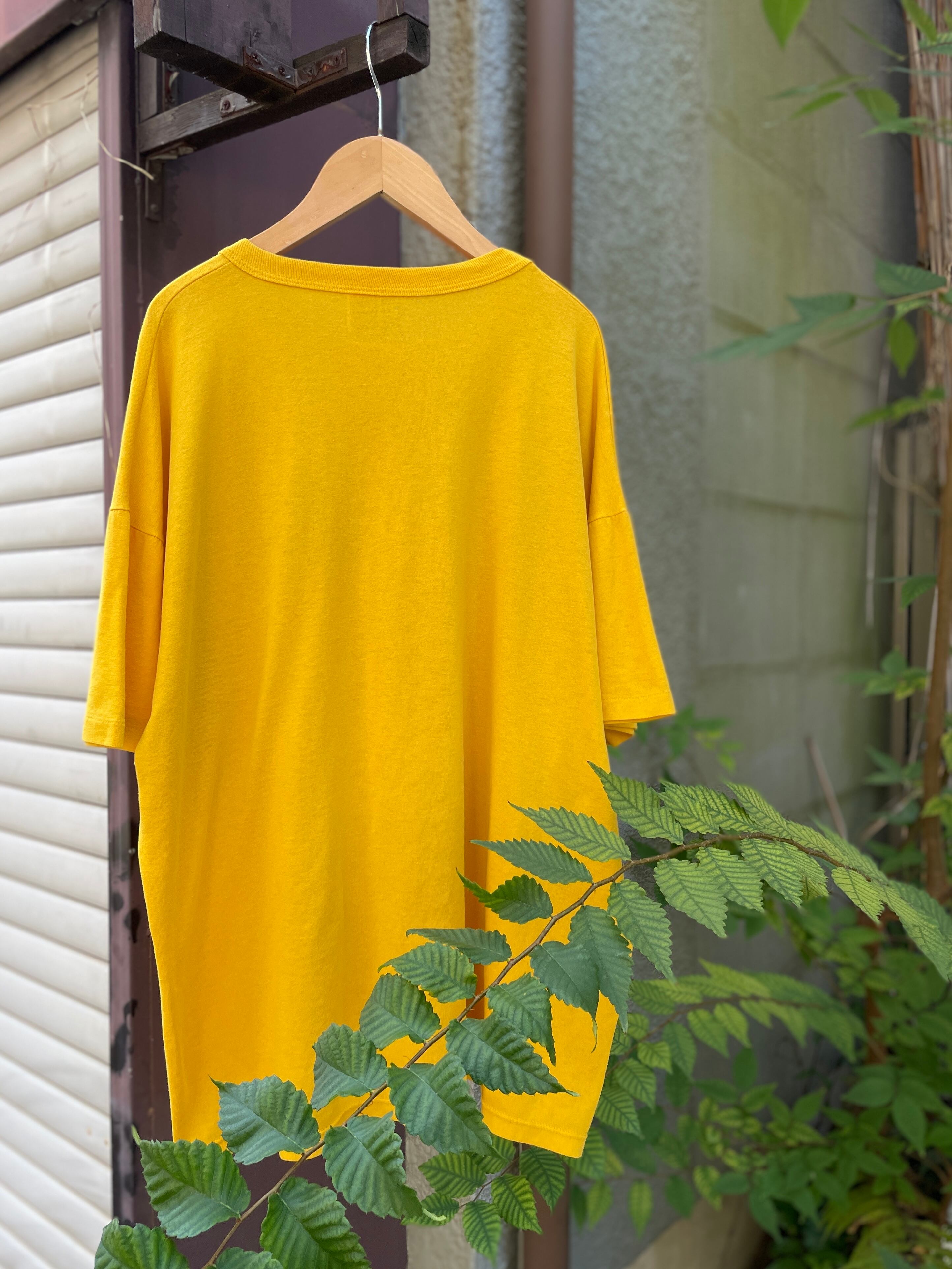 温かみのあるイエローボディに胸元にワンポイントのプリントが施されたアイテム。