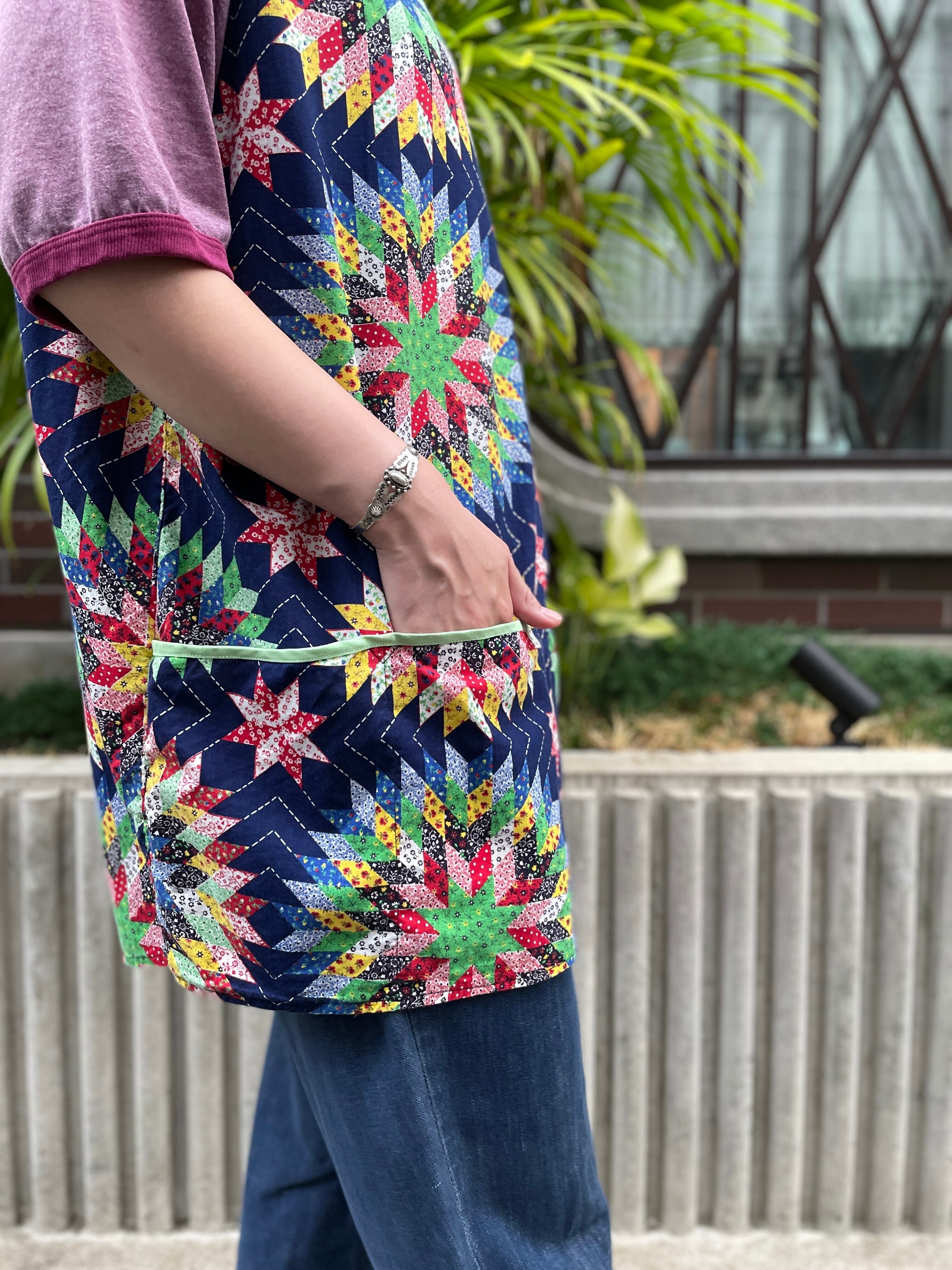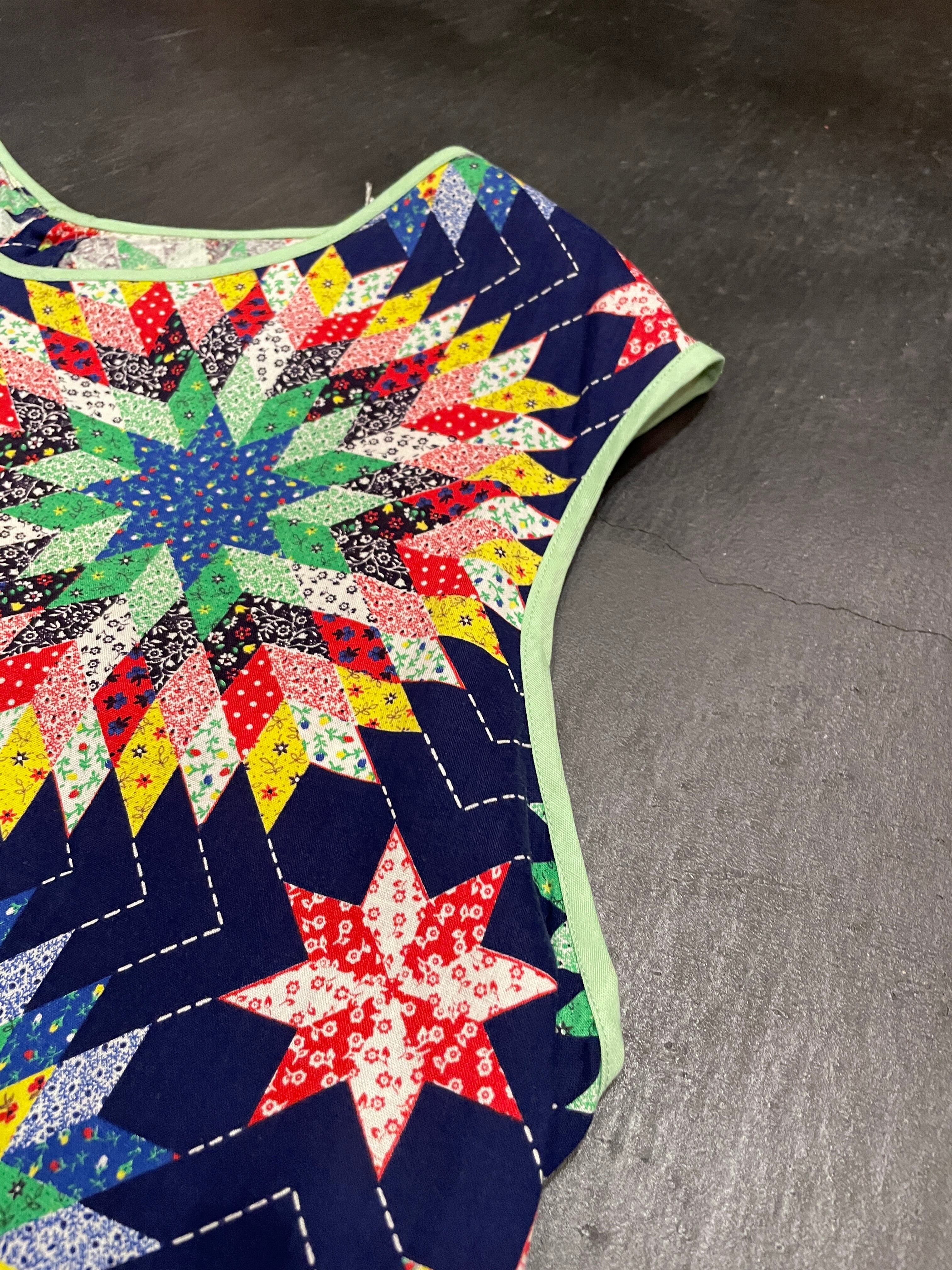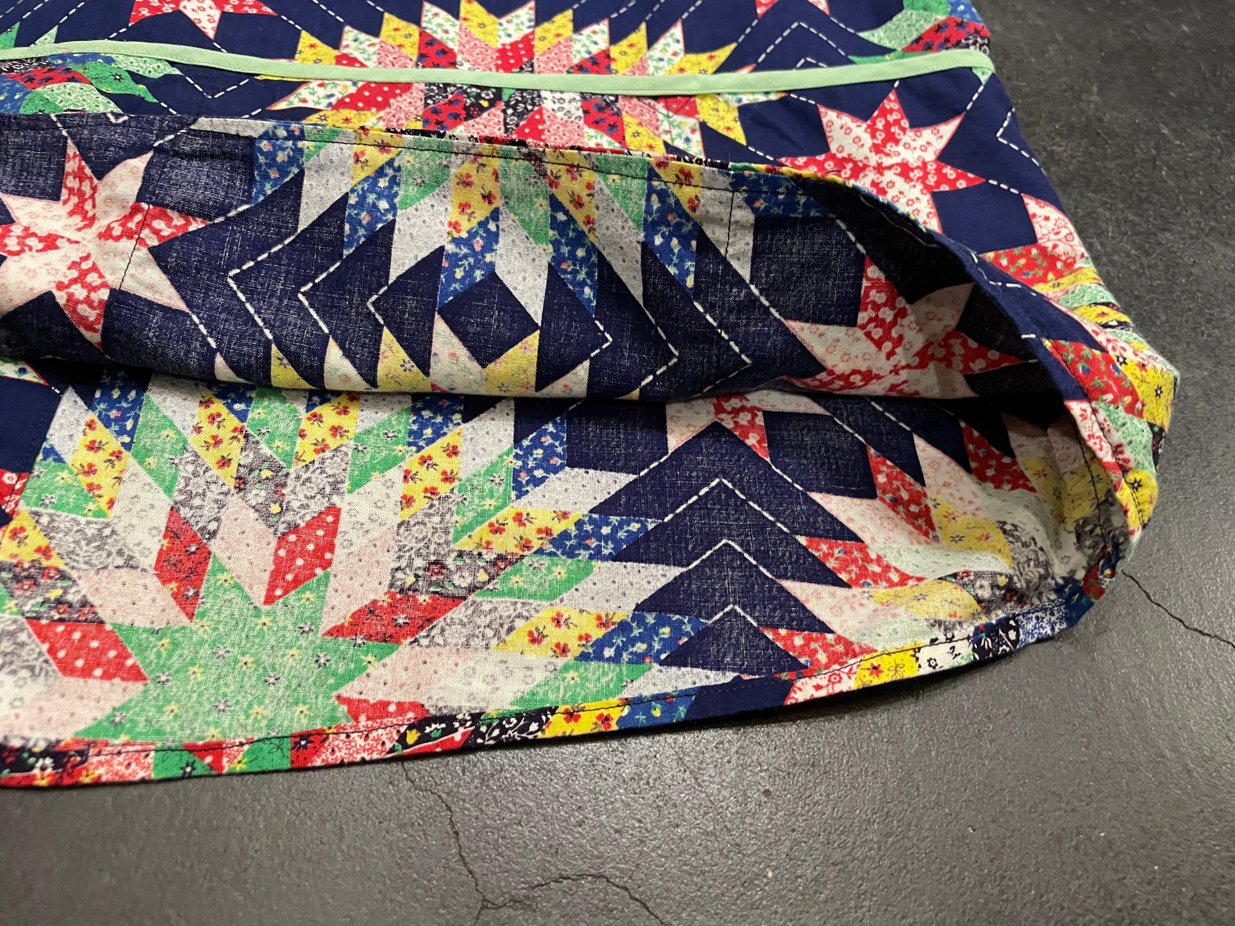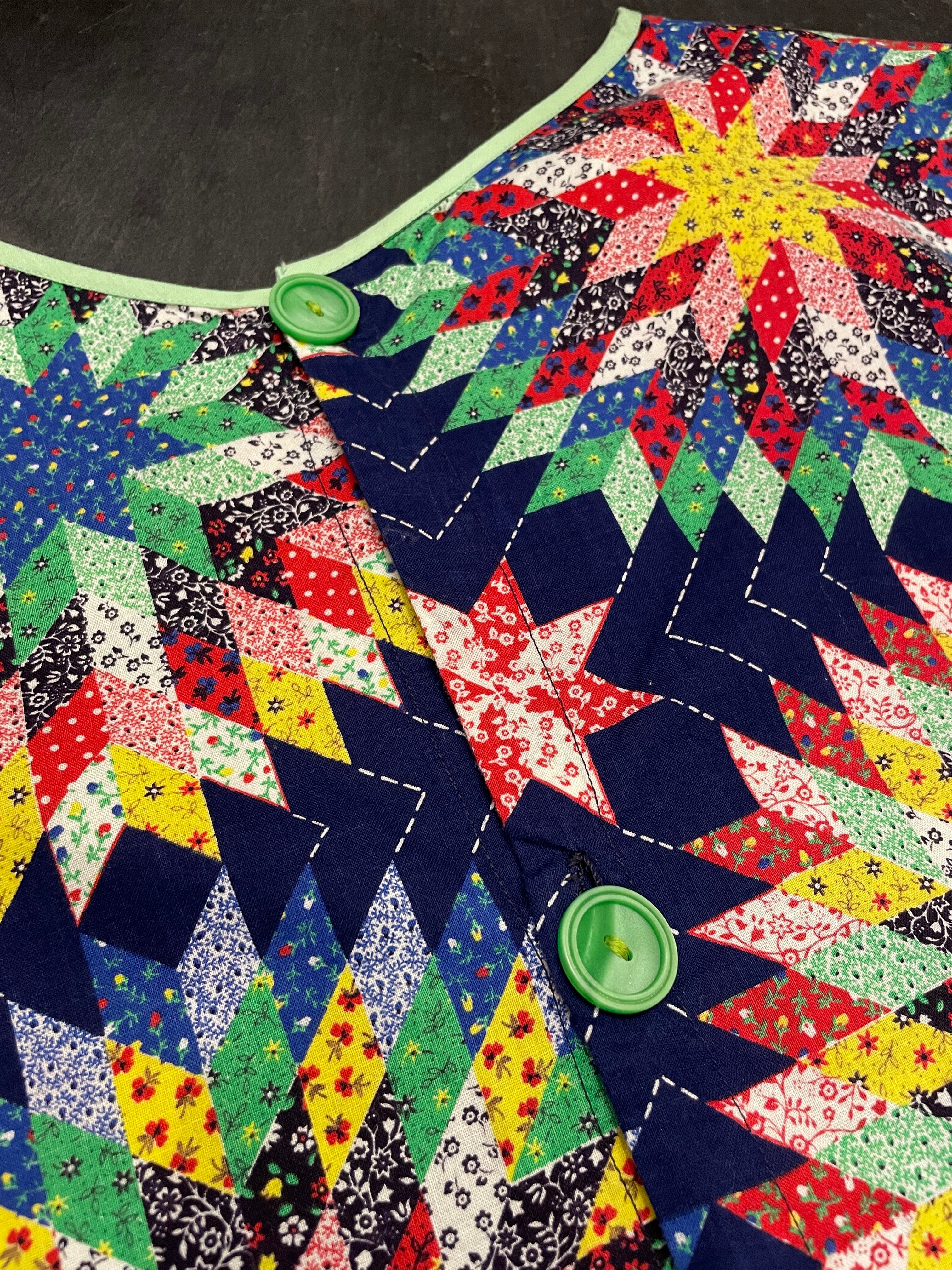 ネイビーボディにパッチワークプリントが素敵なアイテム。