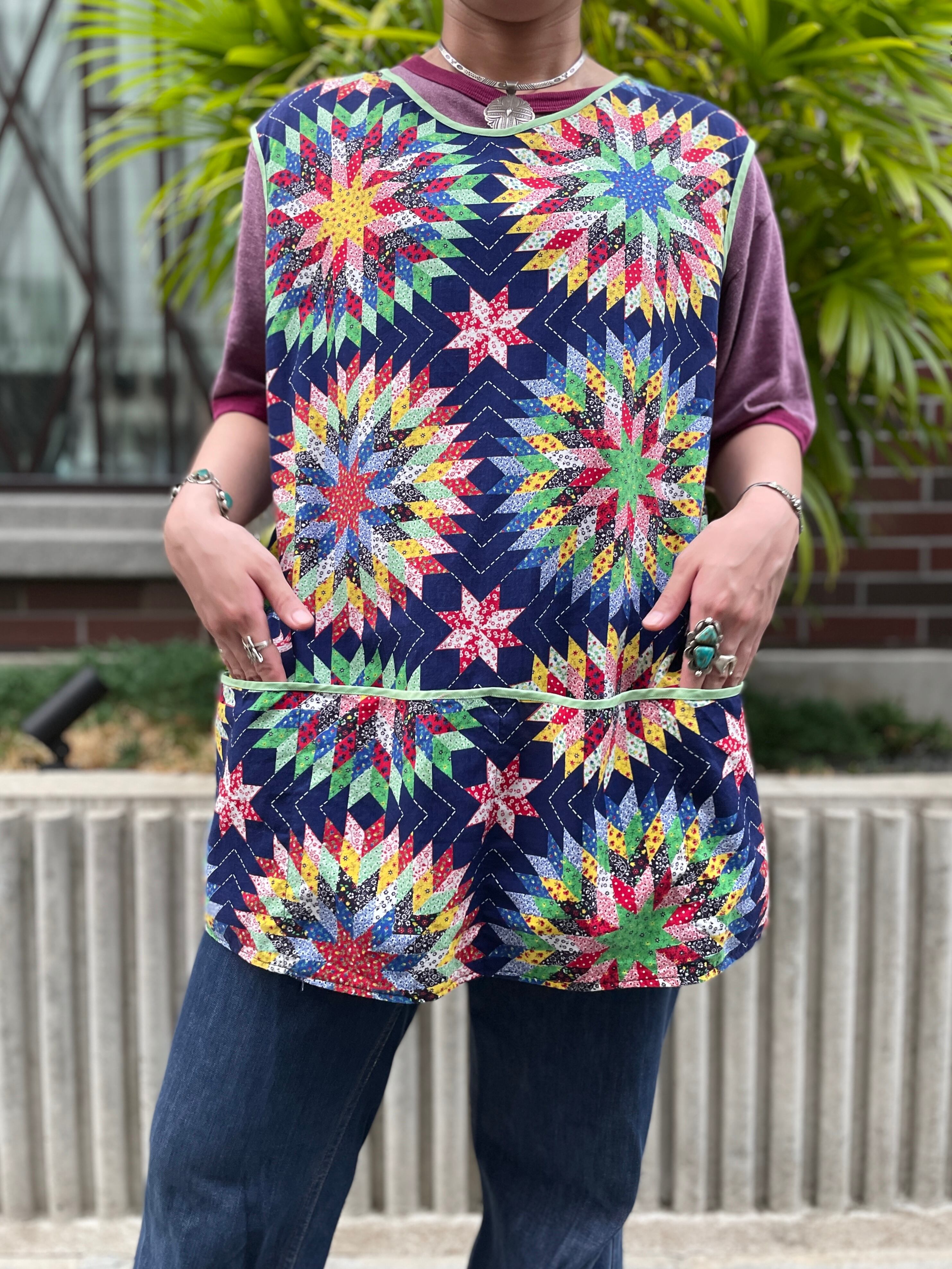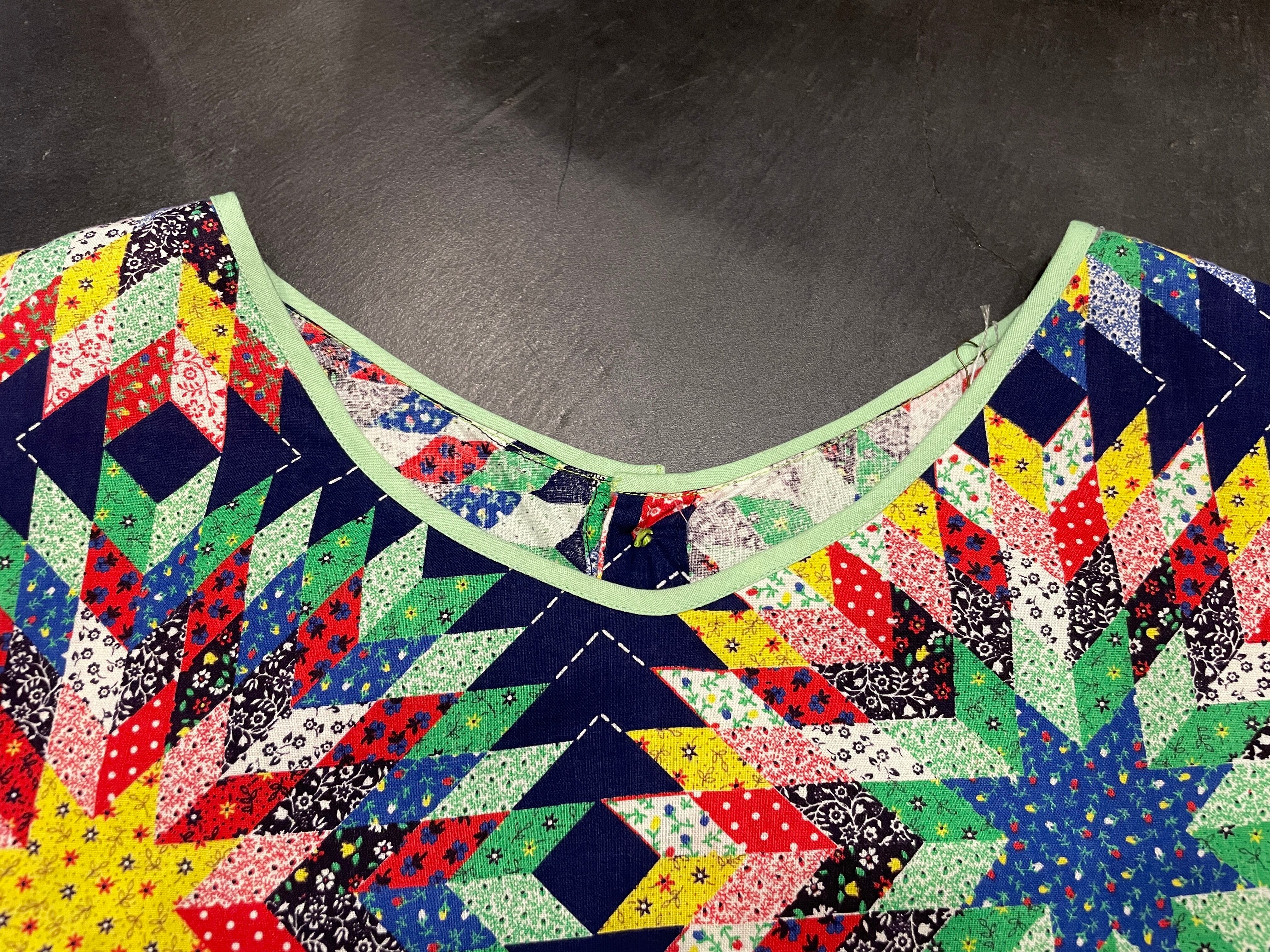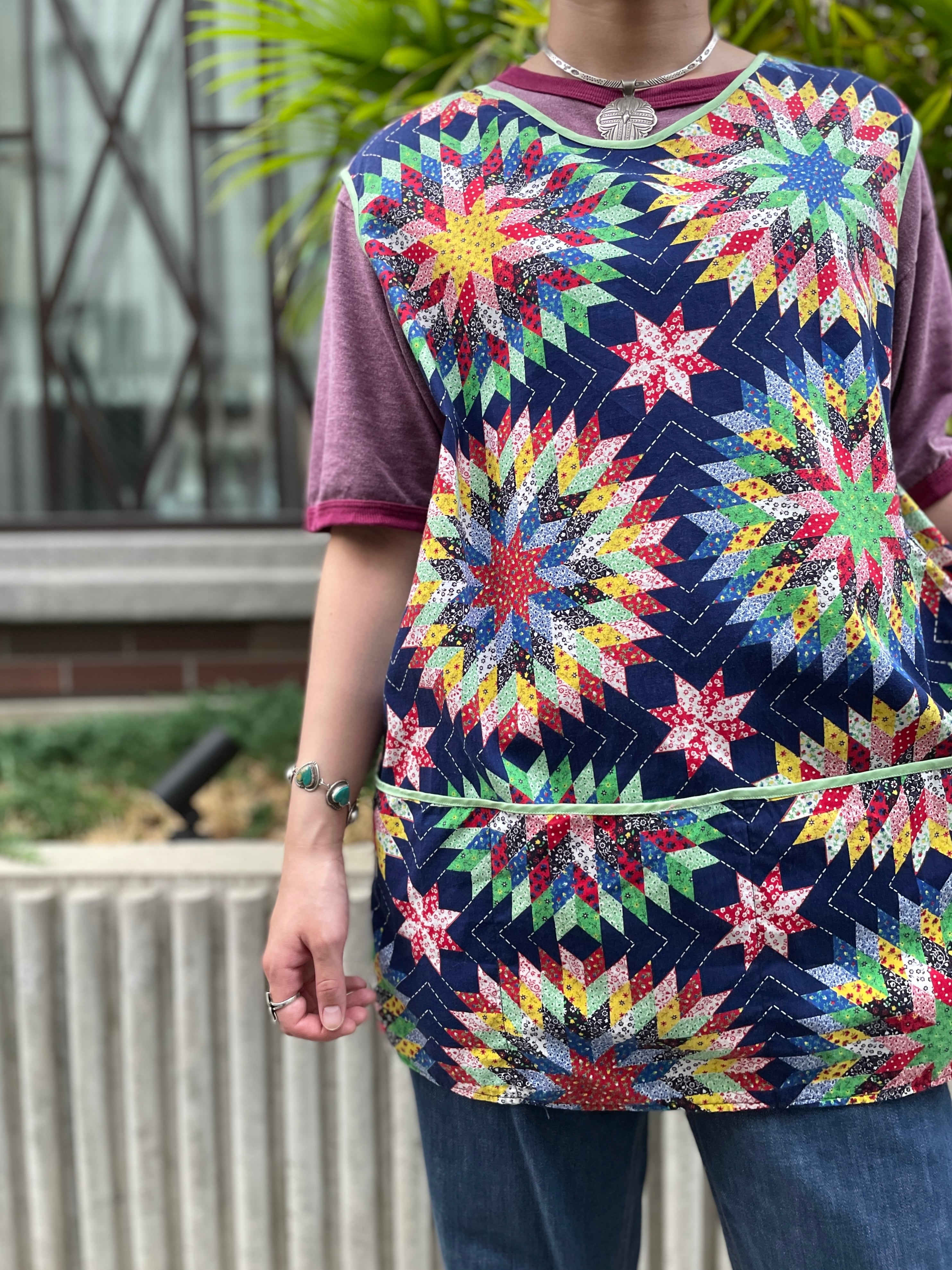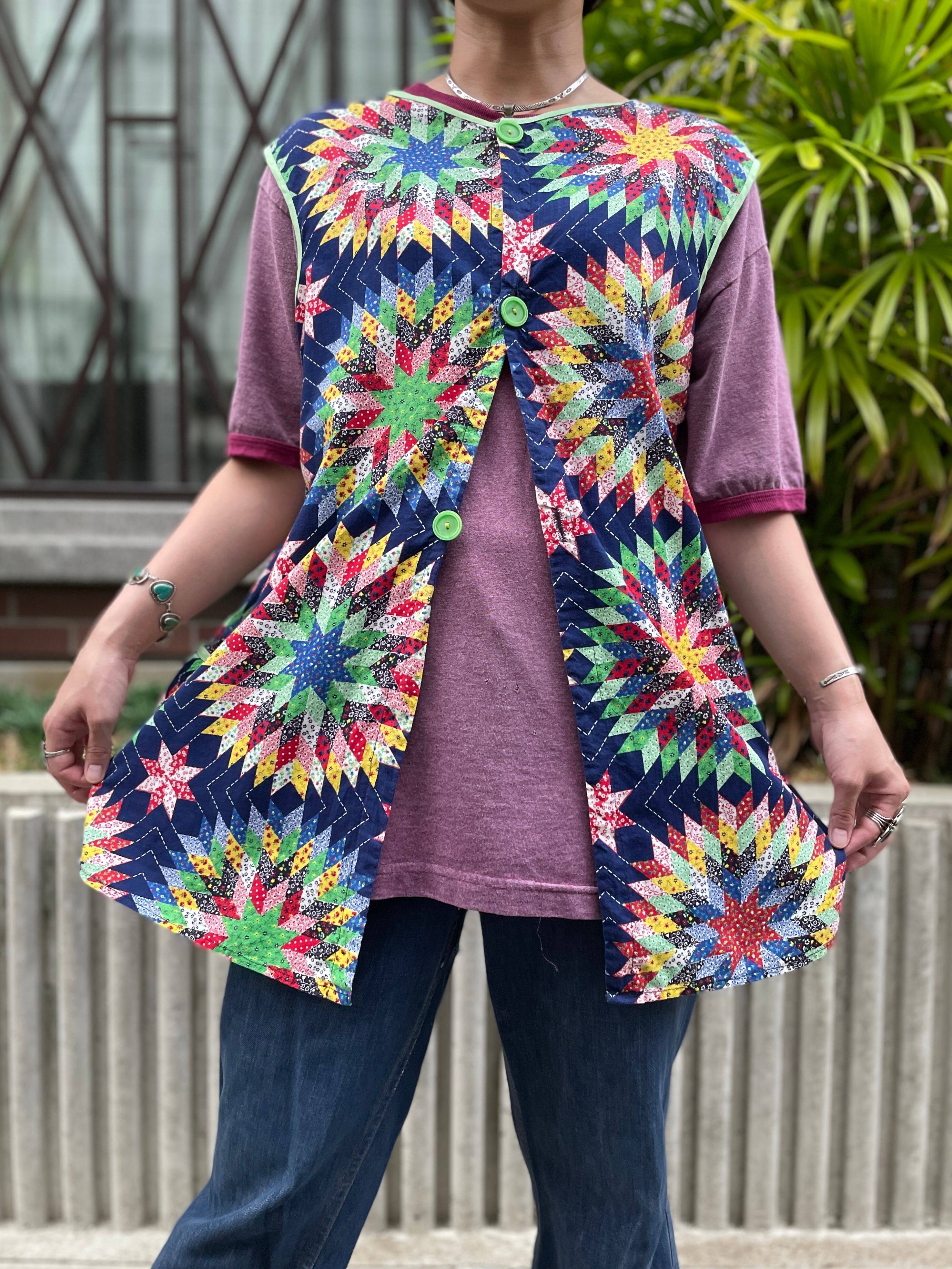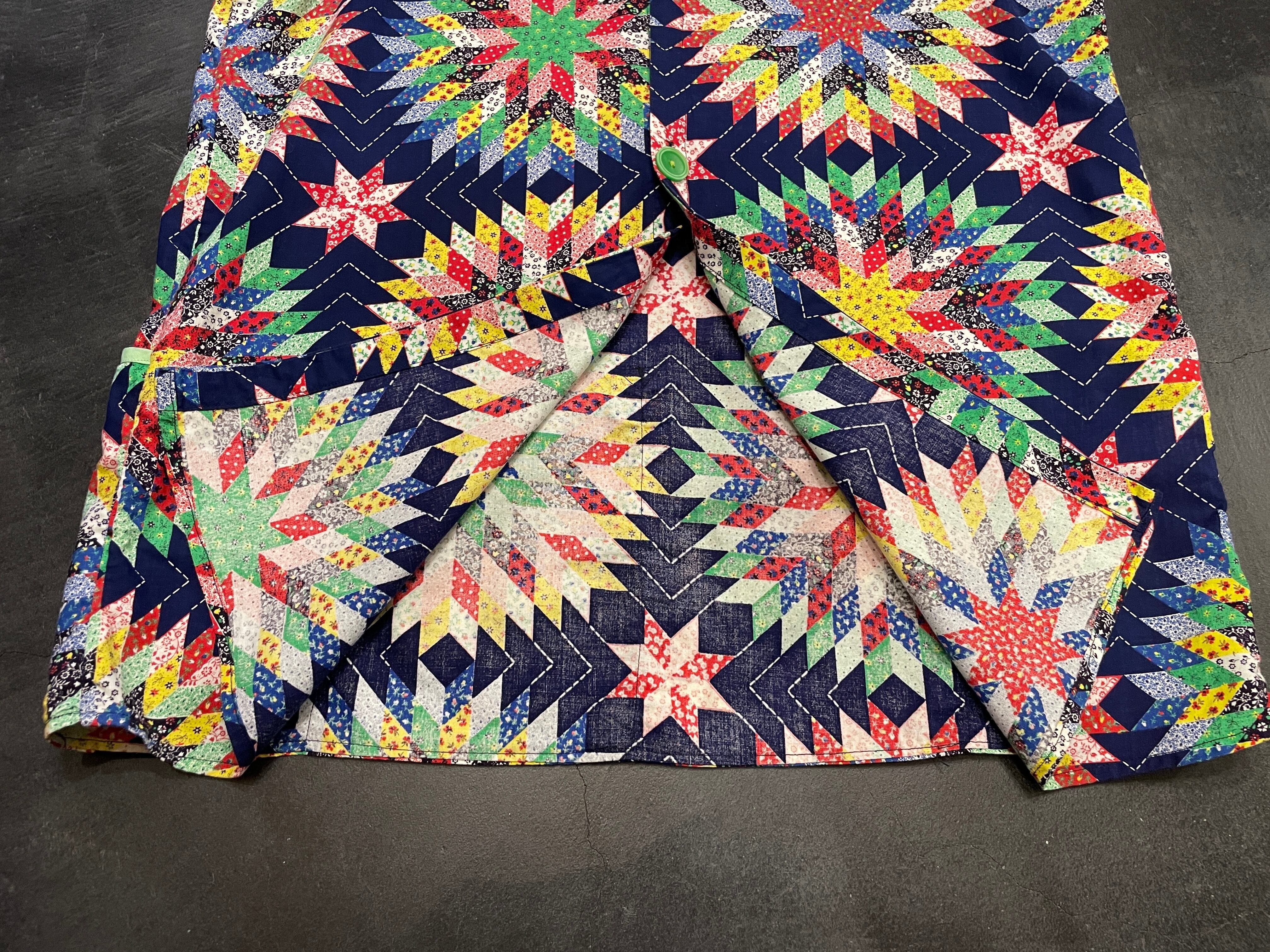 ネイビーボディにパッチワークプリントが素敵なアイテム。