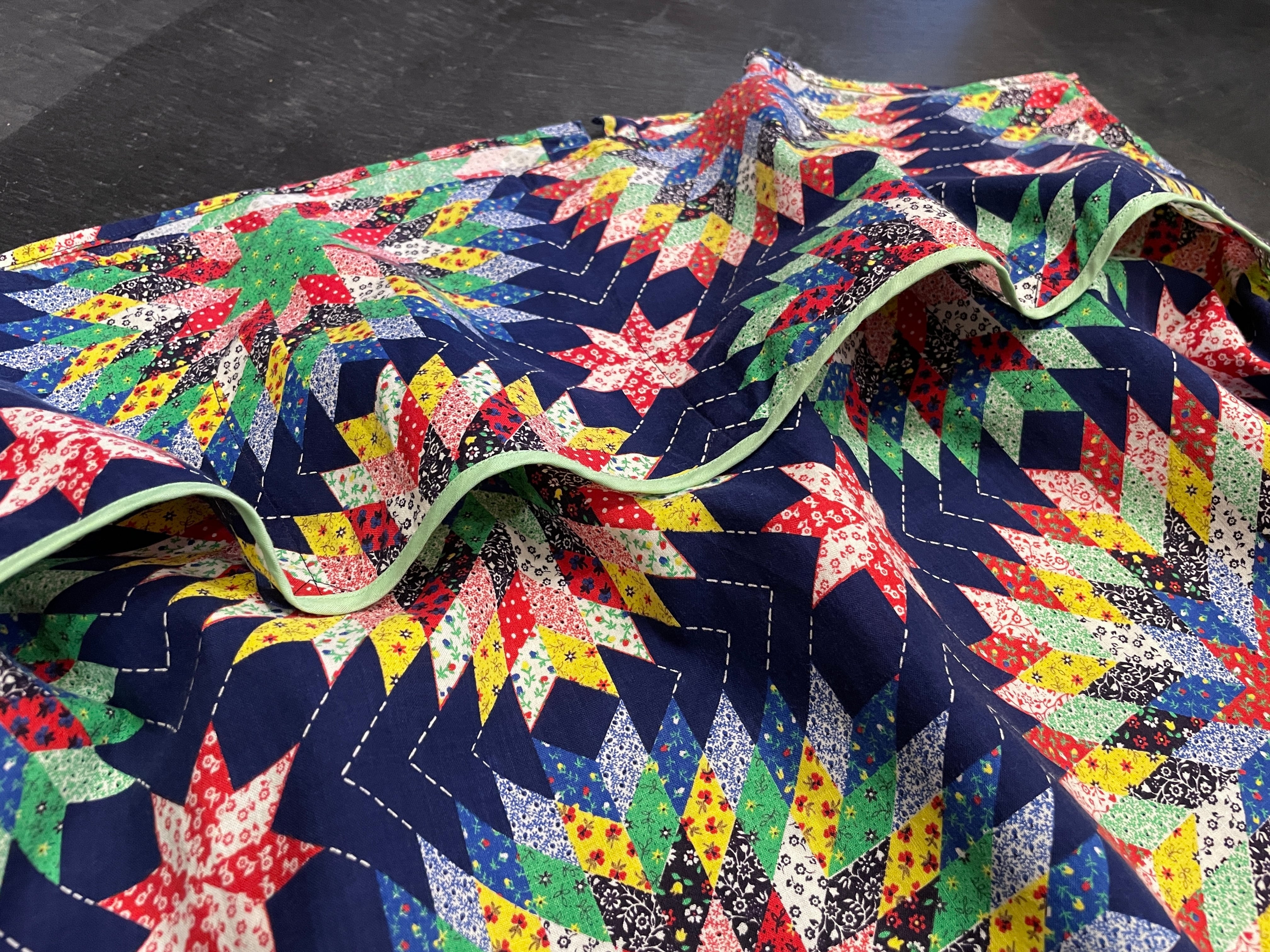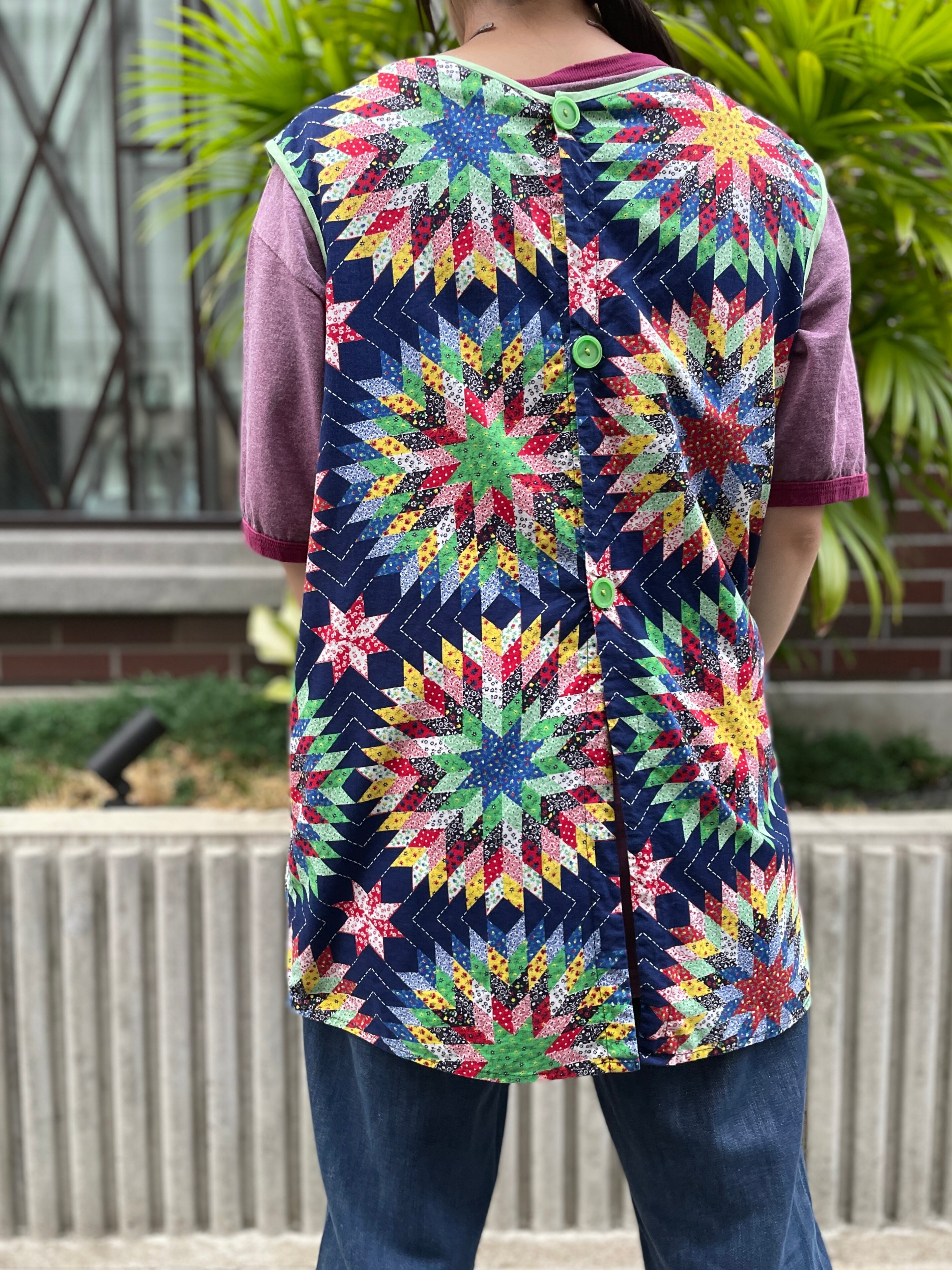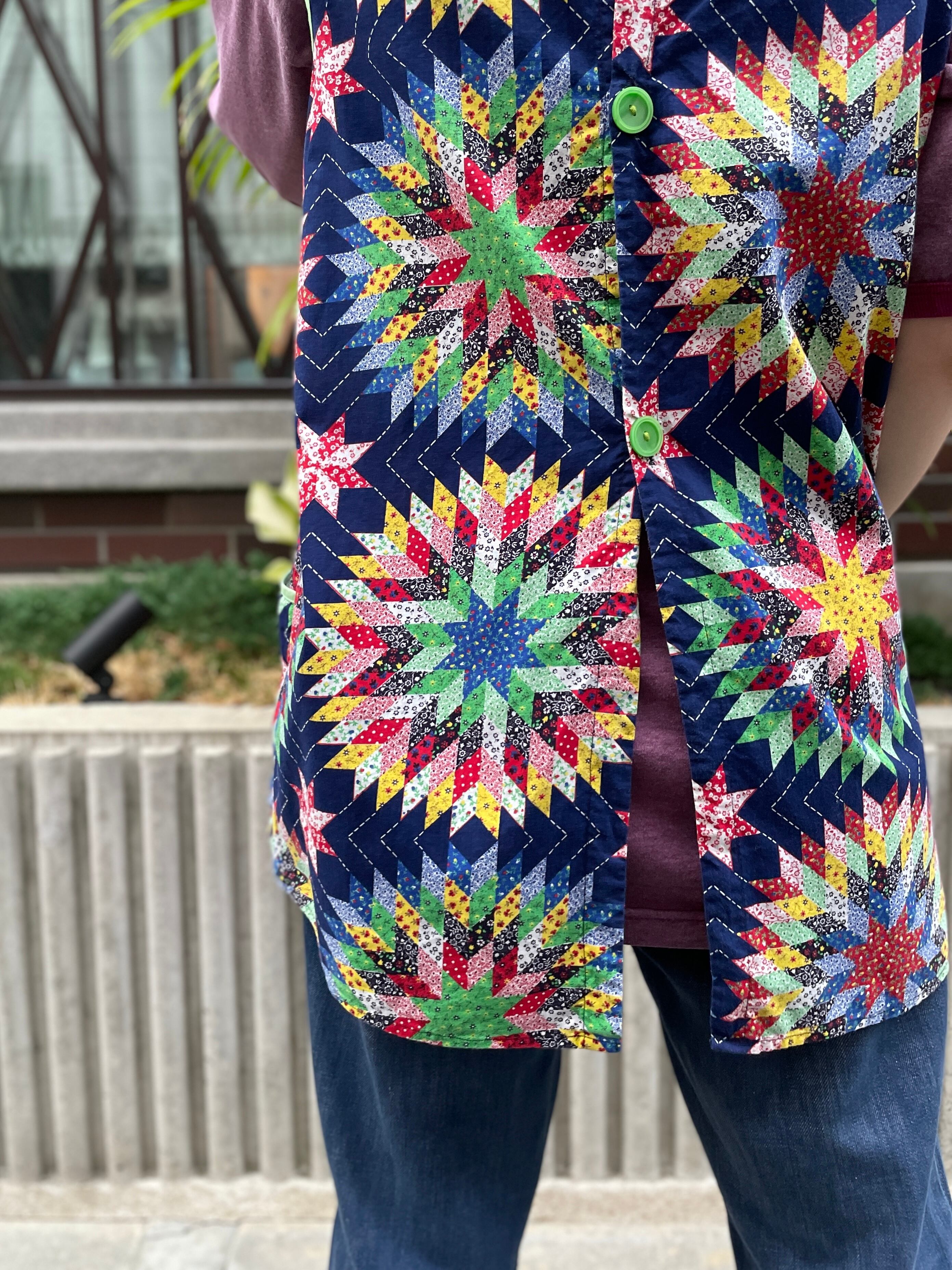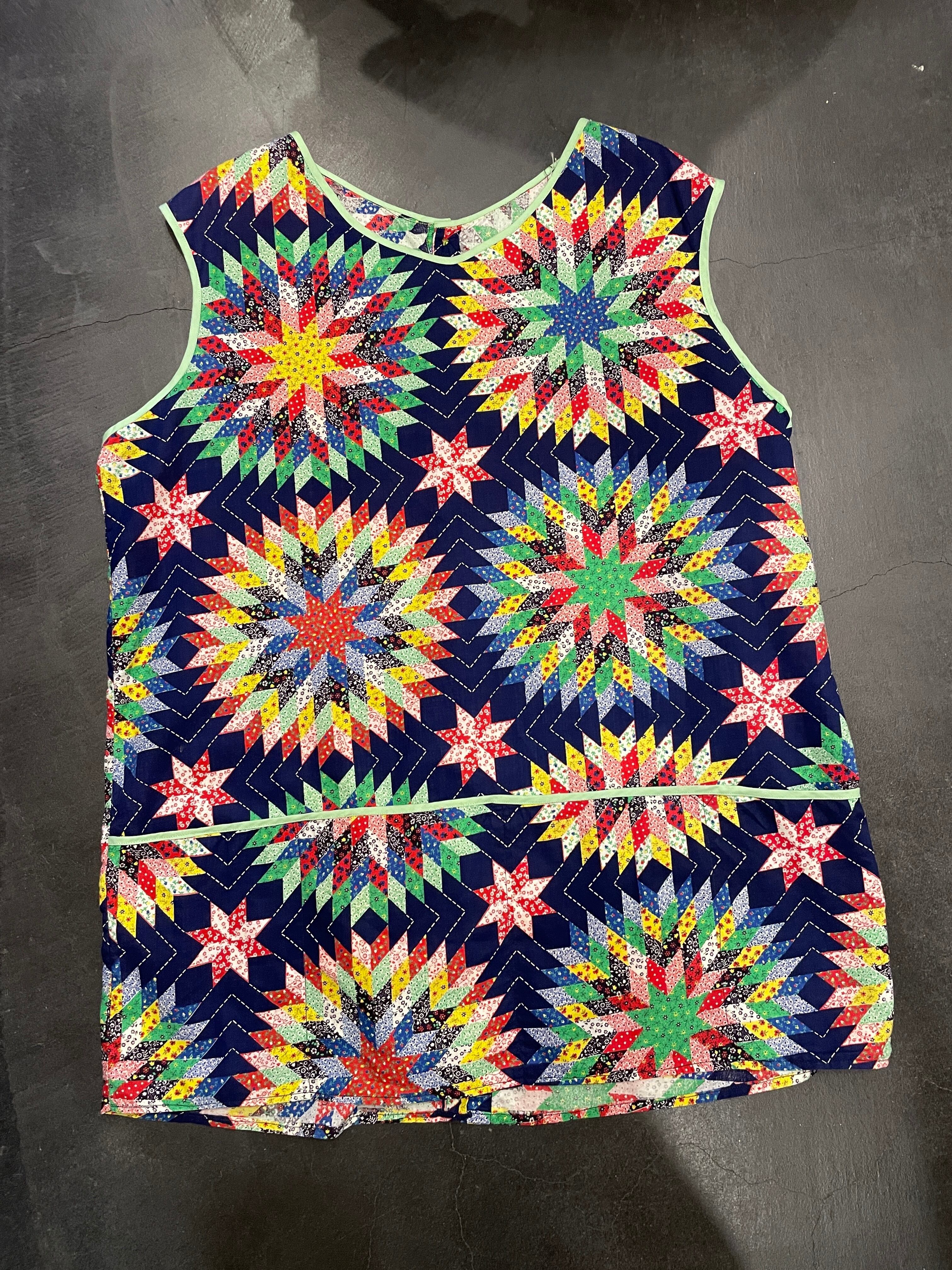 ネイビーボディにパッチワークプリントが素敵なアイテム。
