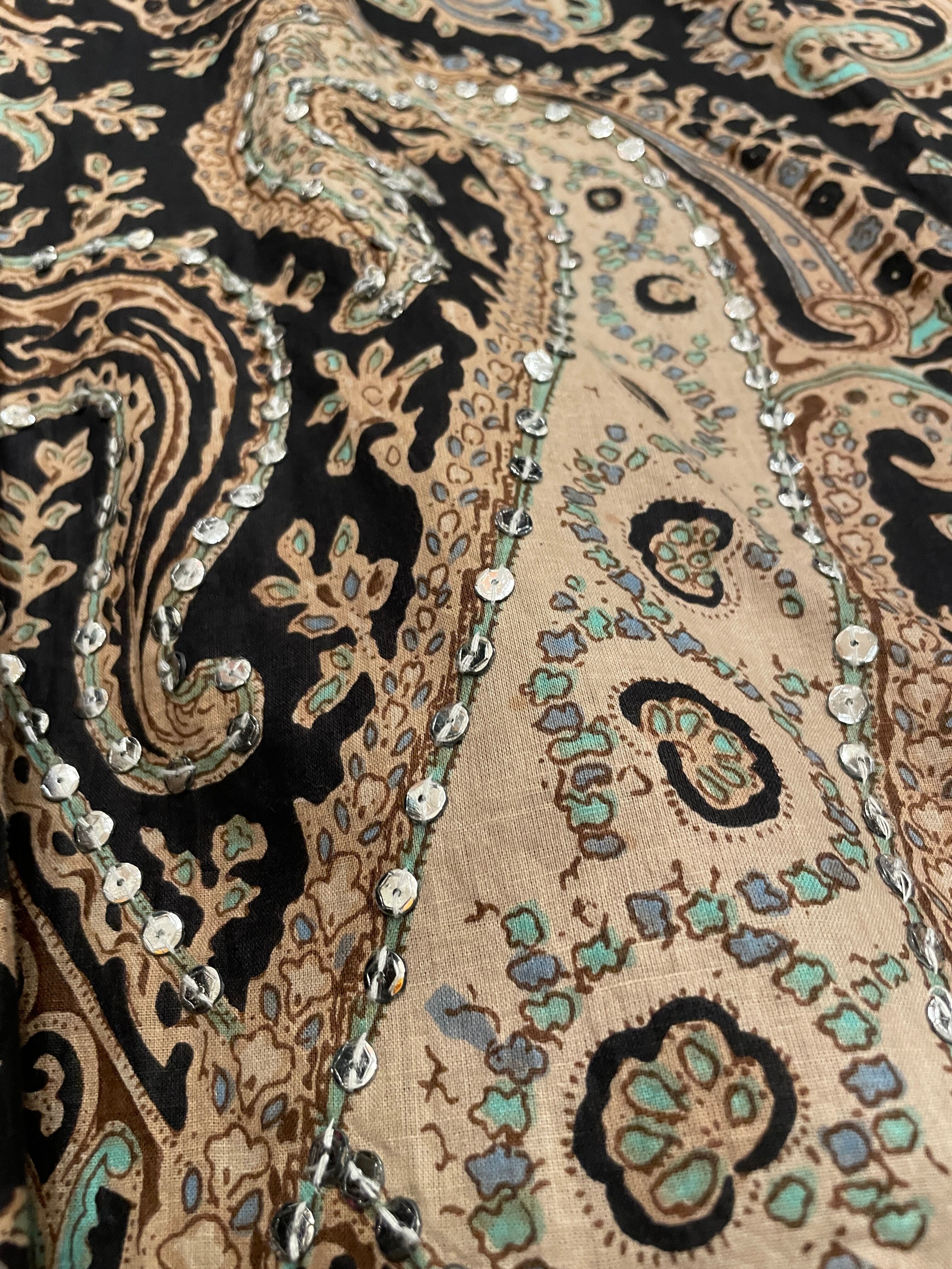 ブラックボディにペイズリー等のエスニック調なデザインが施されたアイテム。