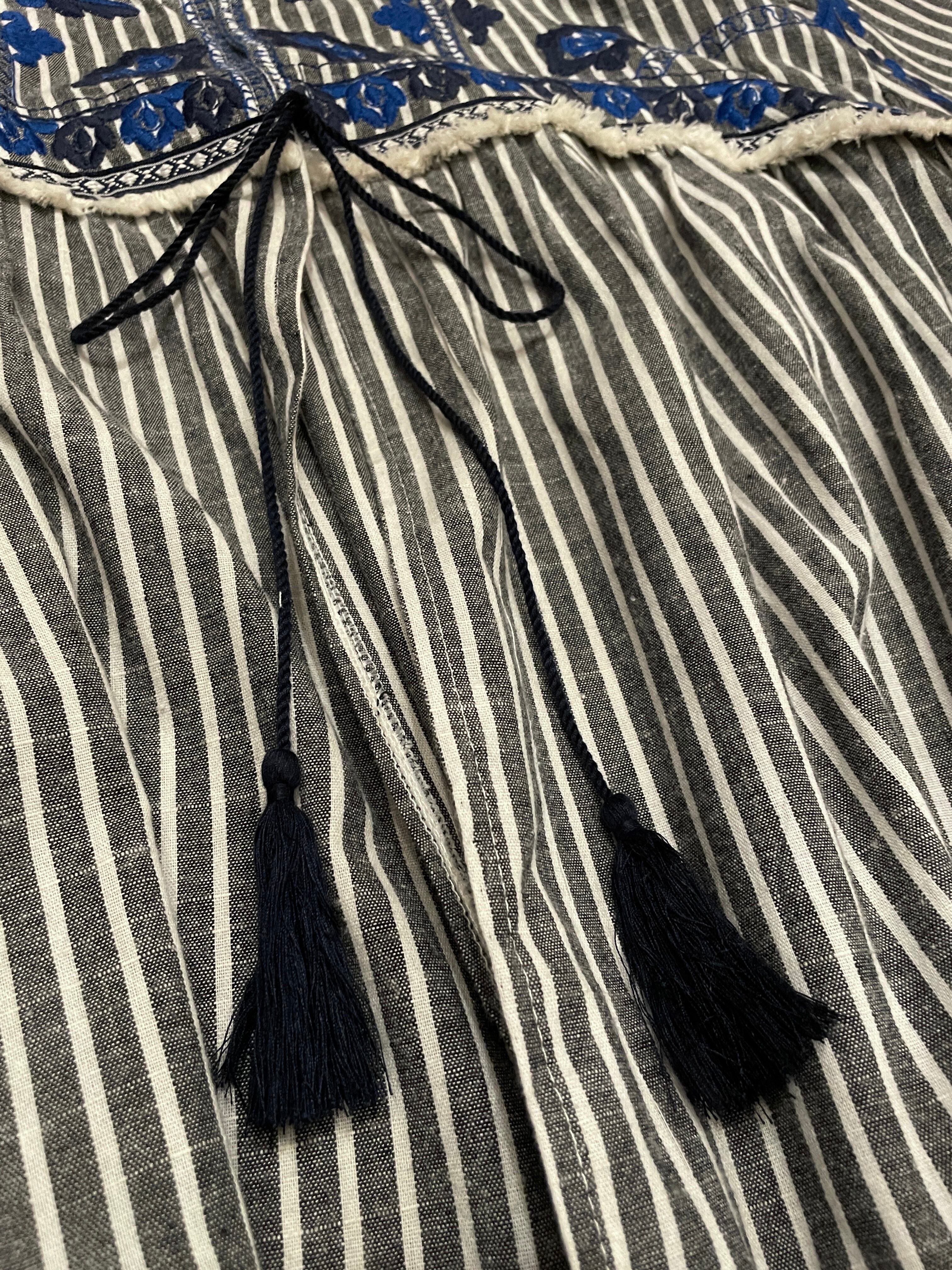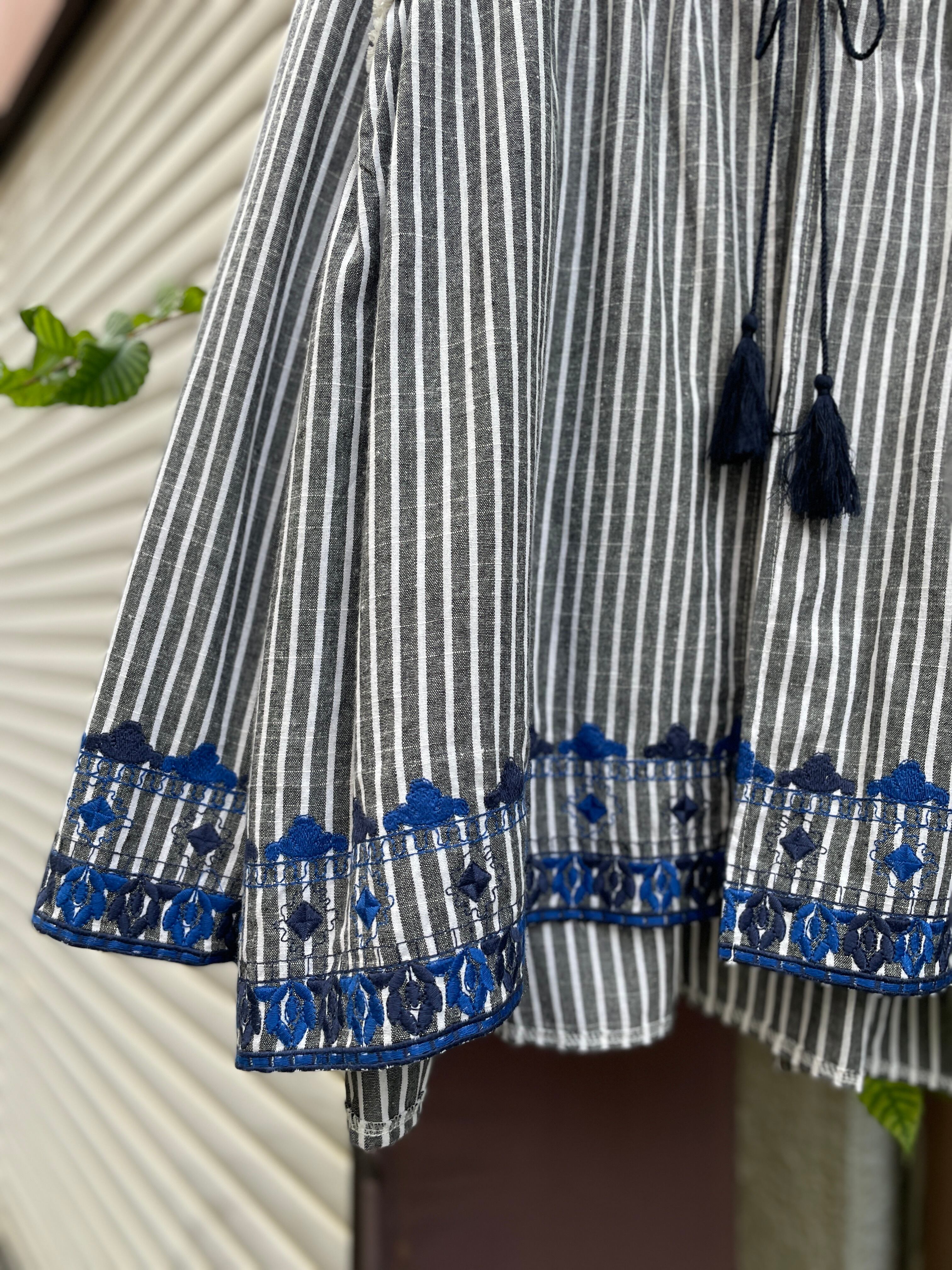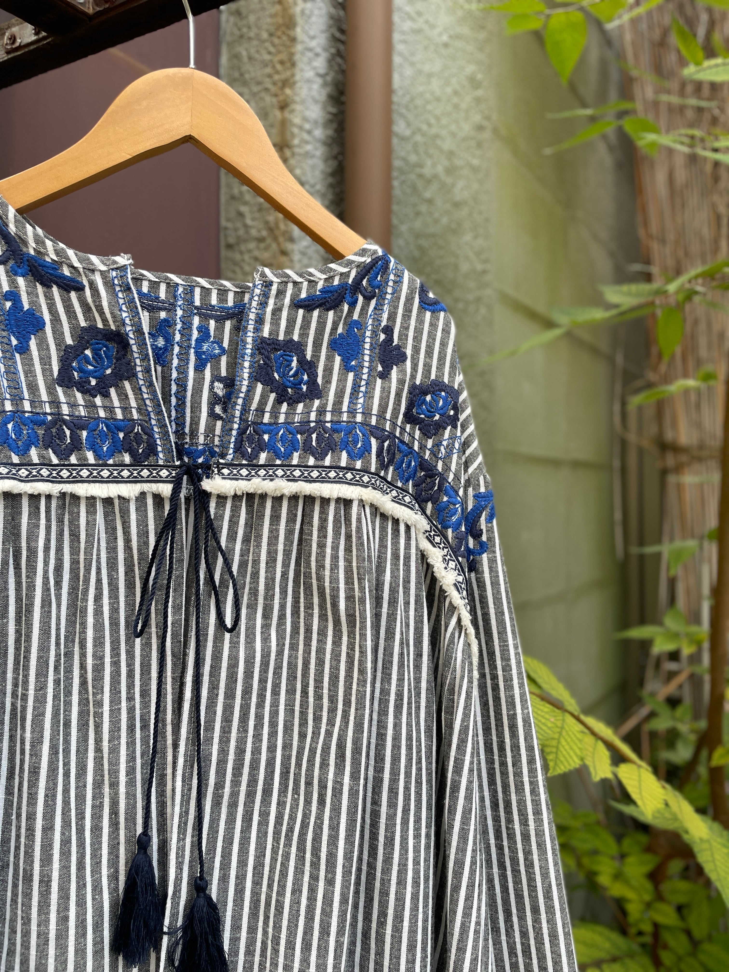 グレー×ホワイトのストライプボディに華やかな刺繍が可愛らしいアイテム。