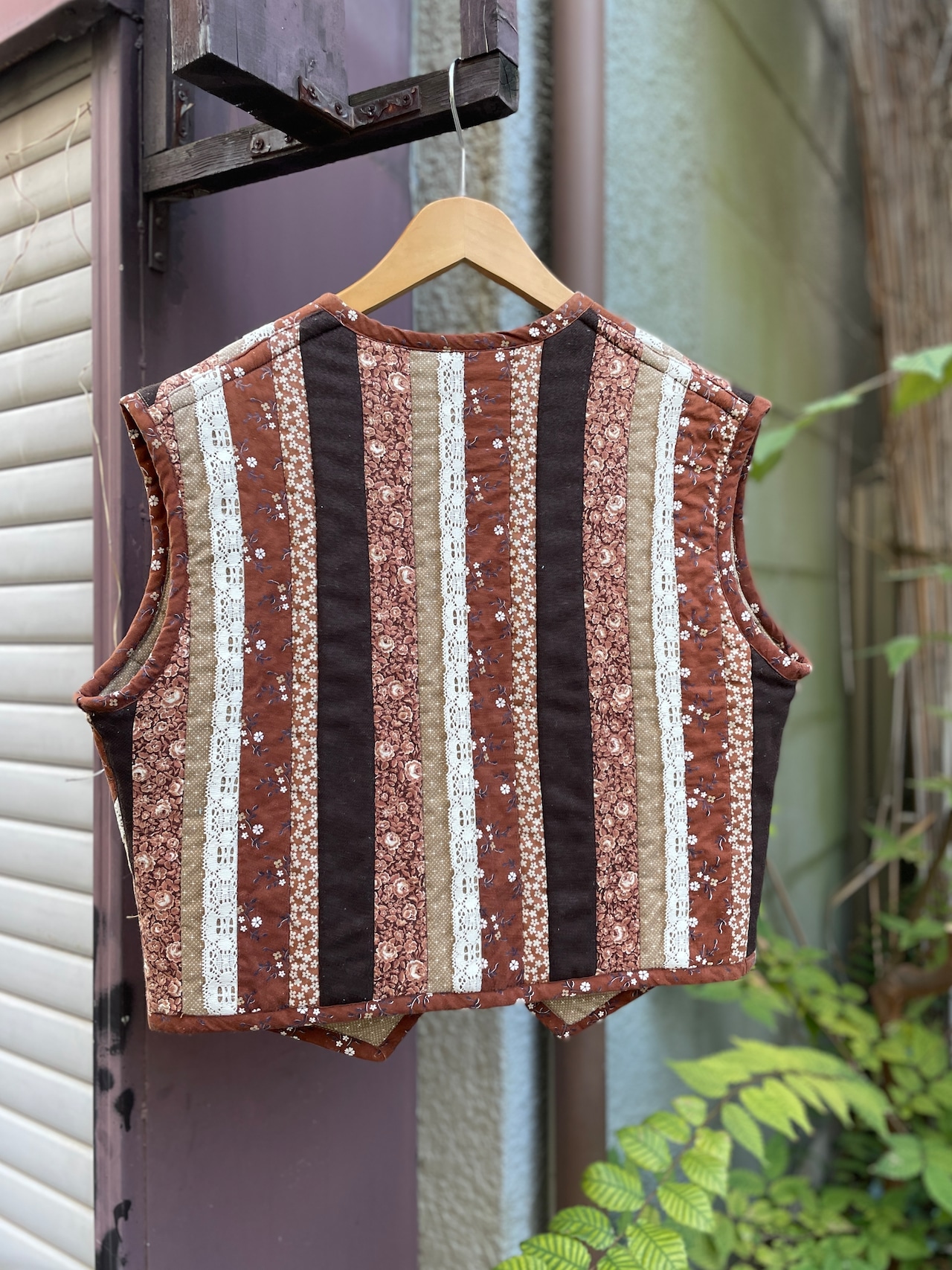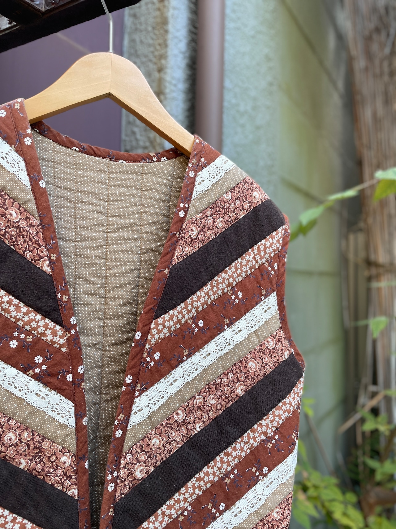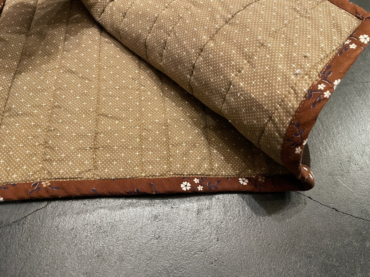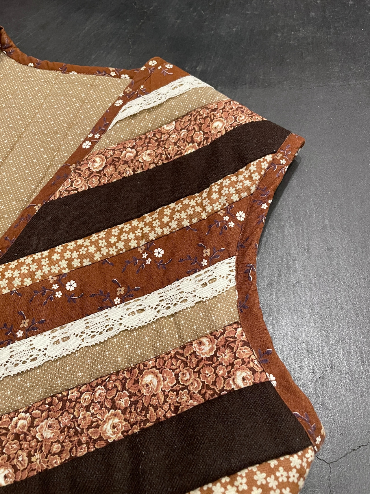 ブラウンを基調にテイストの違う花柄などを贅沢に使用した手の込んだパッチワークデザインが素敵なアイテム。