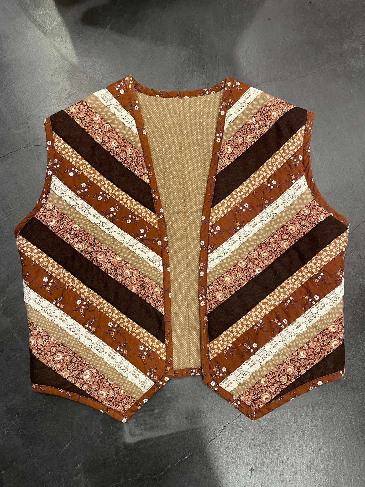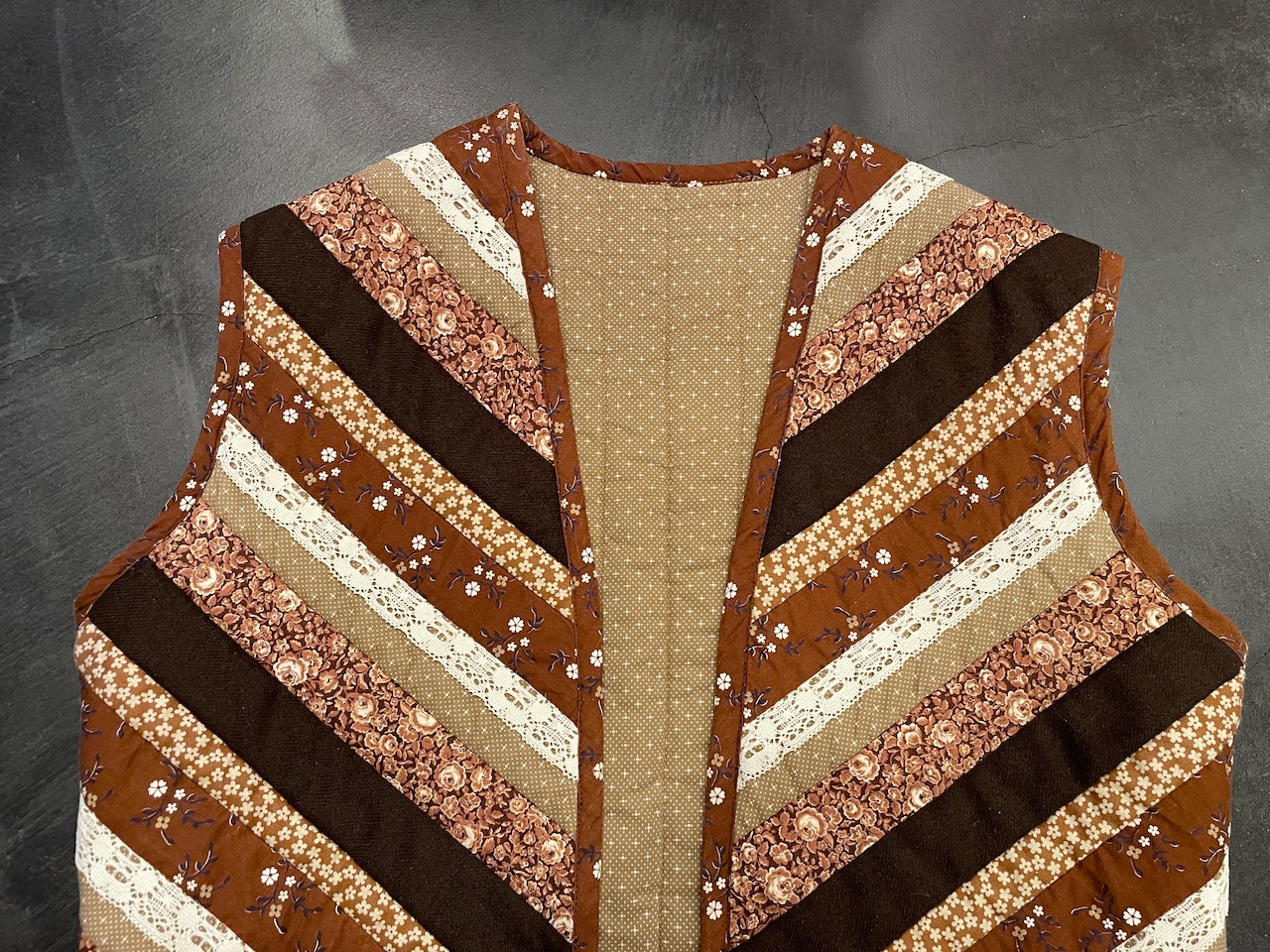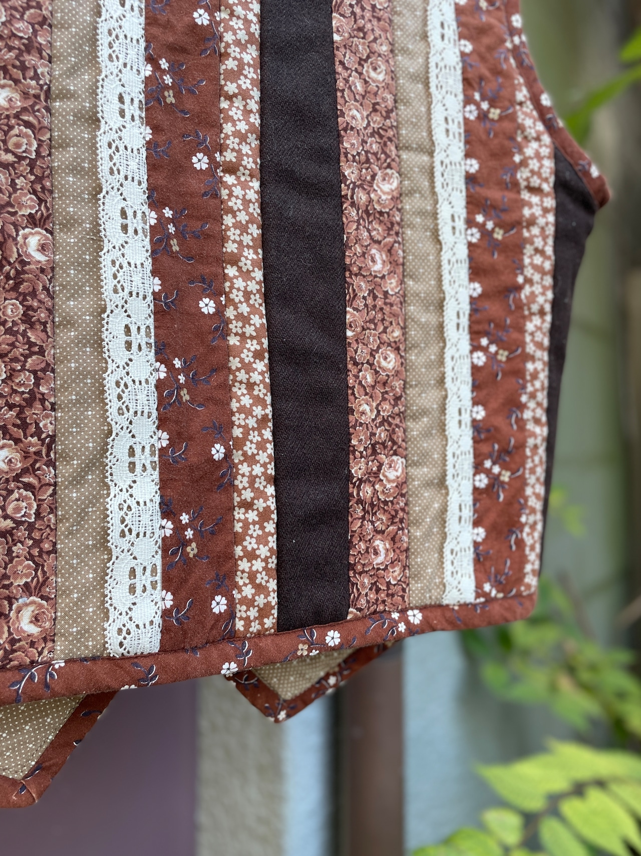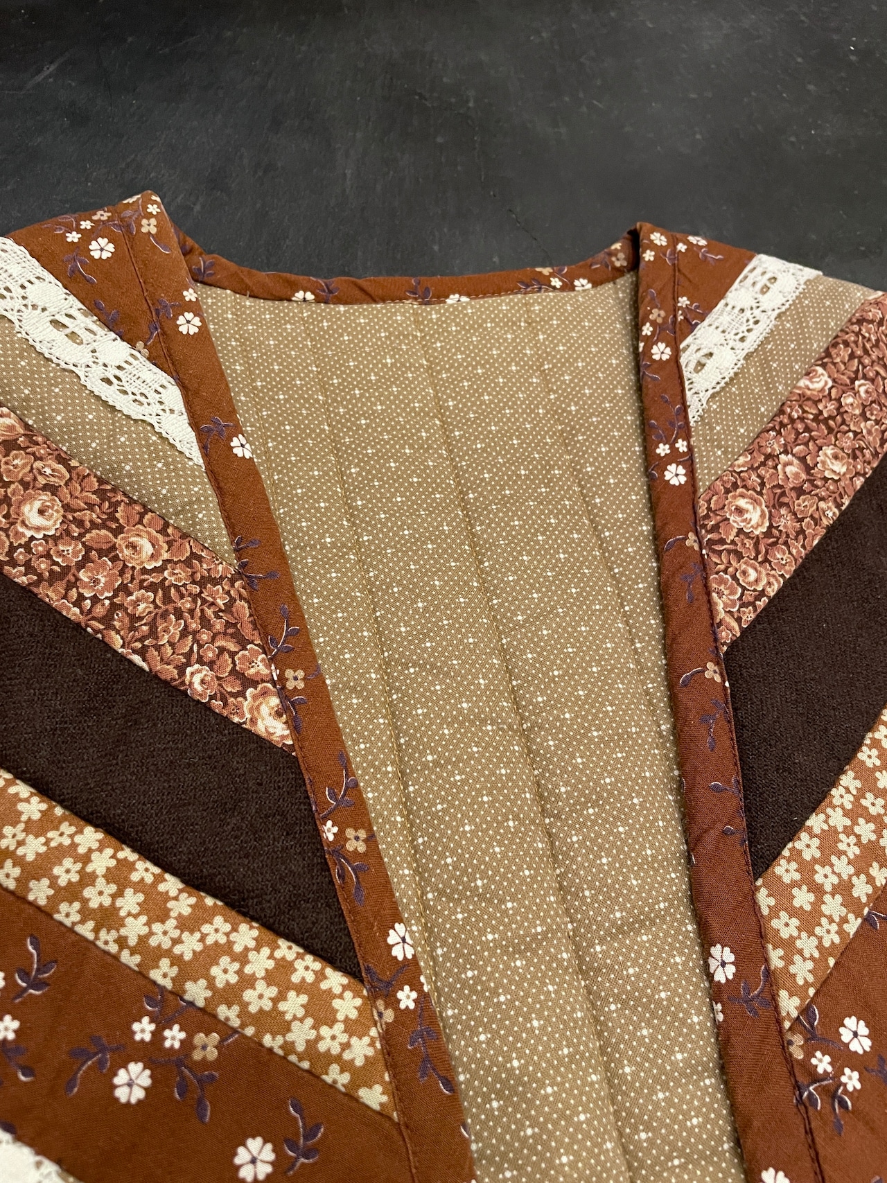 ブラウンを基調にテイストの違う花柄などを贅沢に使用した手の込んだパッチワークデザインが素敵なアイテム。