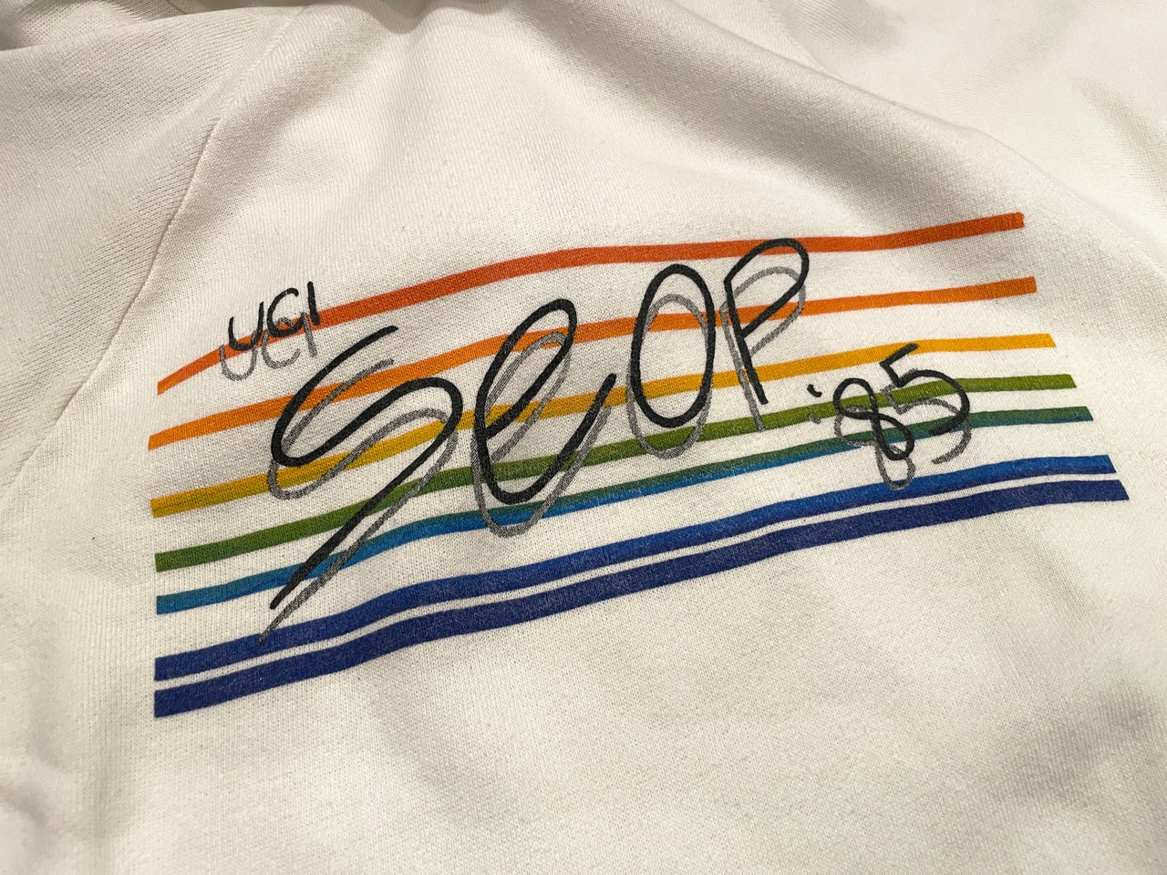 ホワイトボディに、レインボーラインとUCI SEOP のプリントが可愛いアイテム。