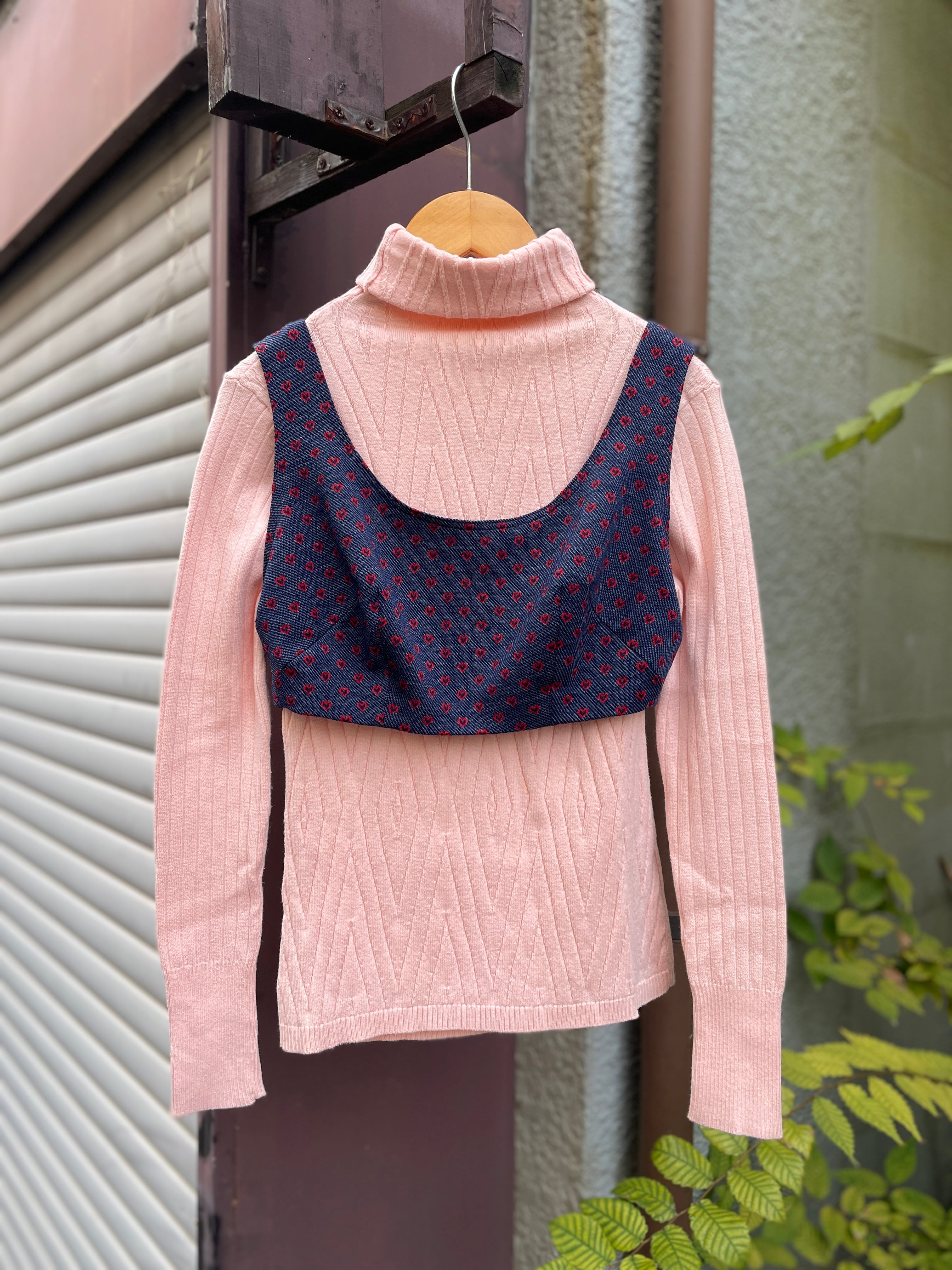合わせやすいネイビーボディに赤いプチハートのパターンが可愛らしいアイテム。
