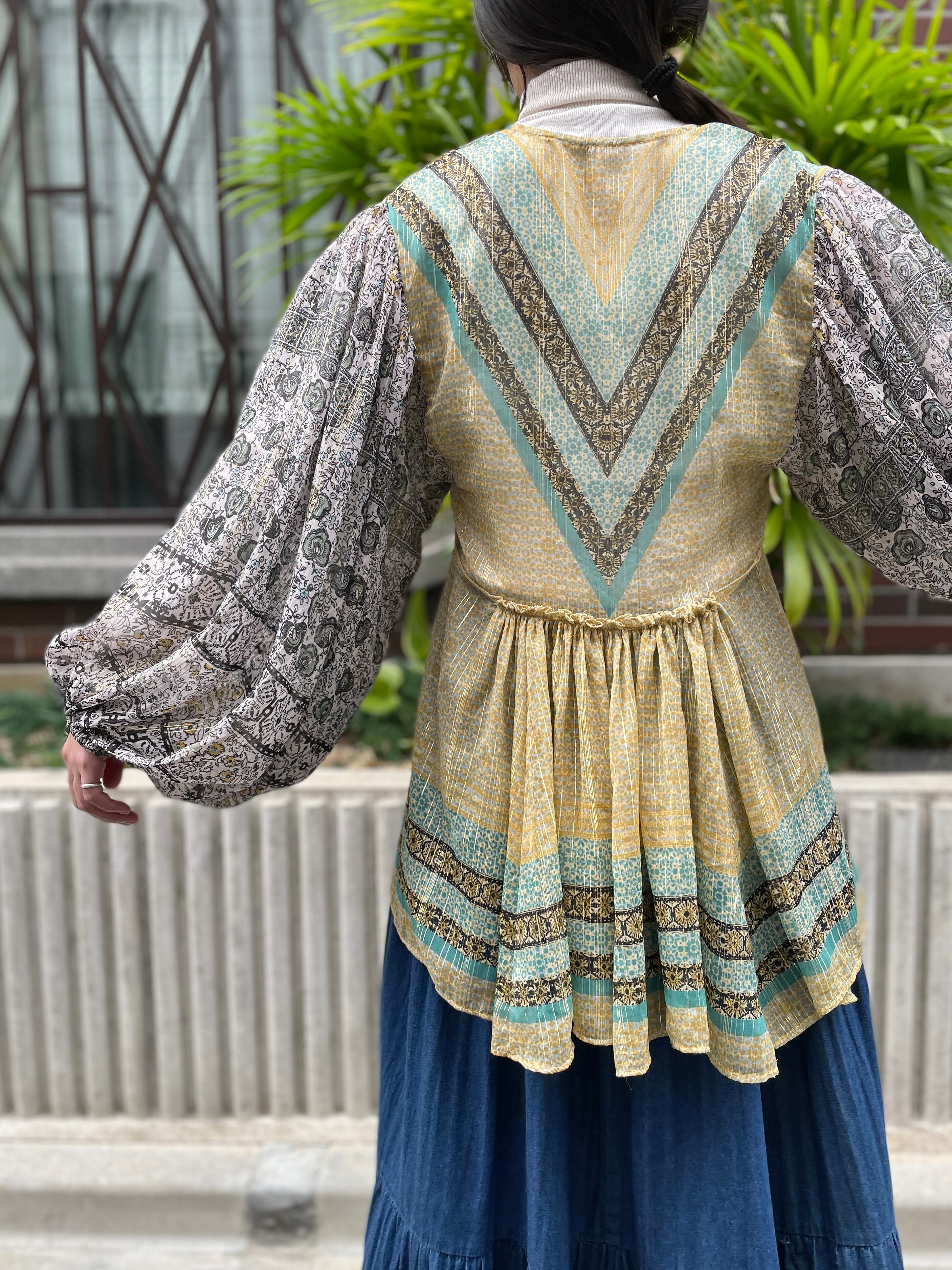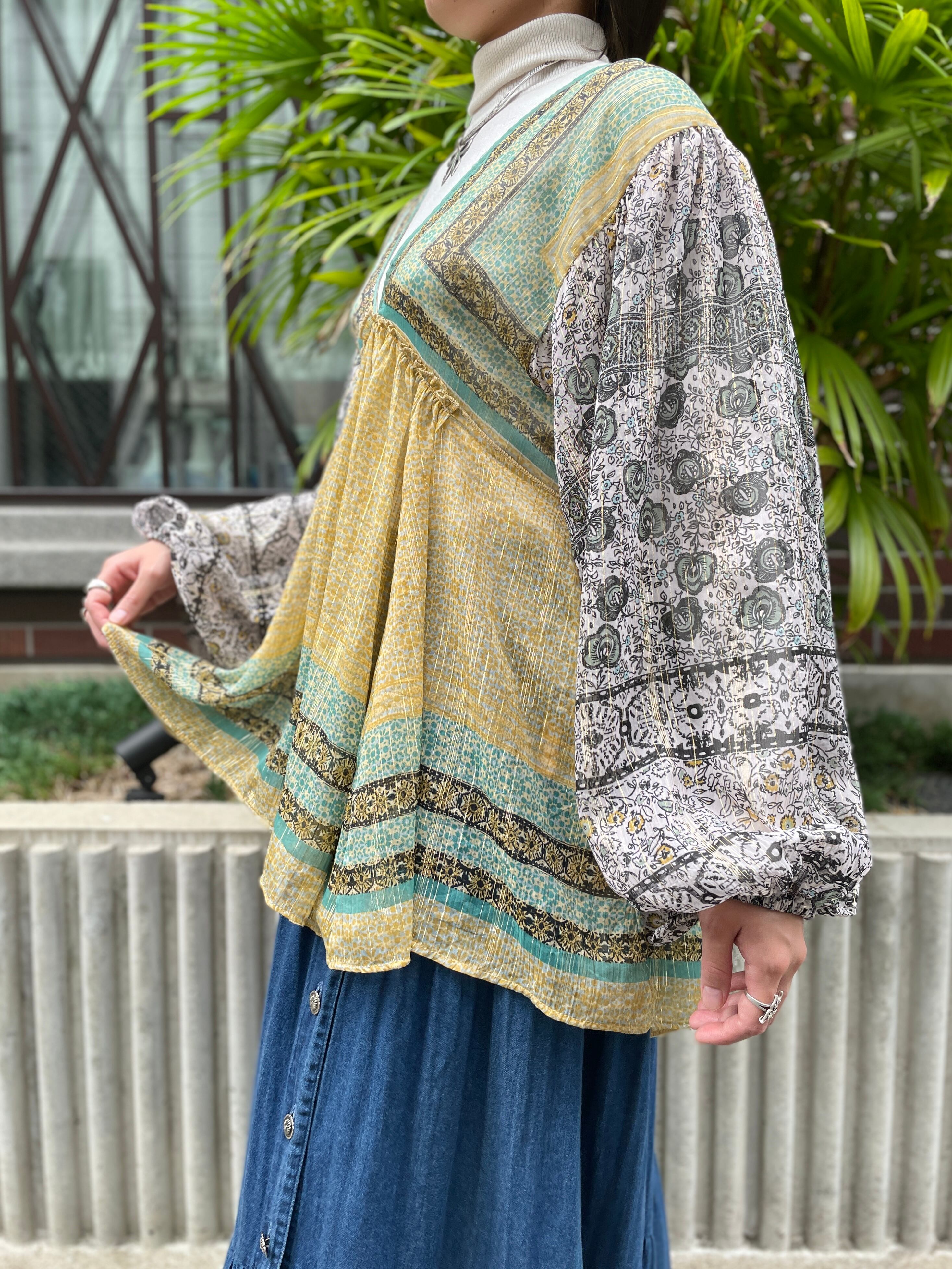 身頃と袖で2つの生地を使い分けた仕立てがおしゃれなアイテム。