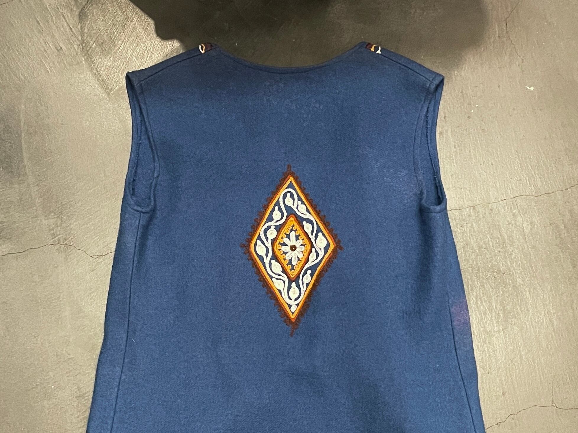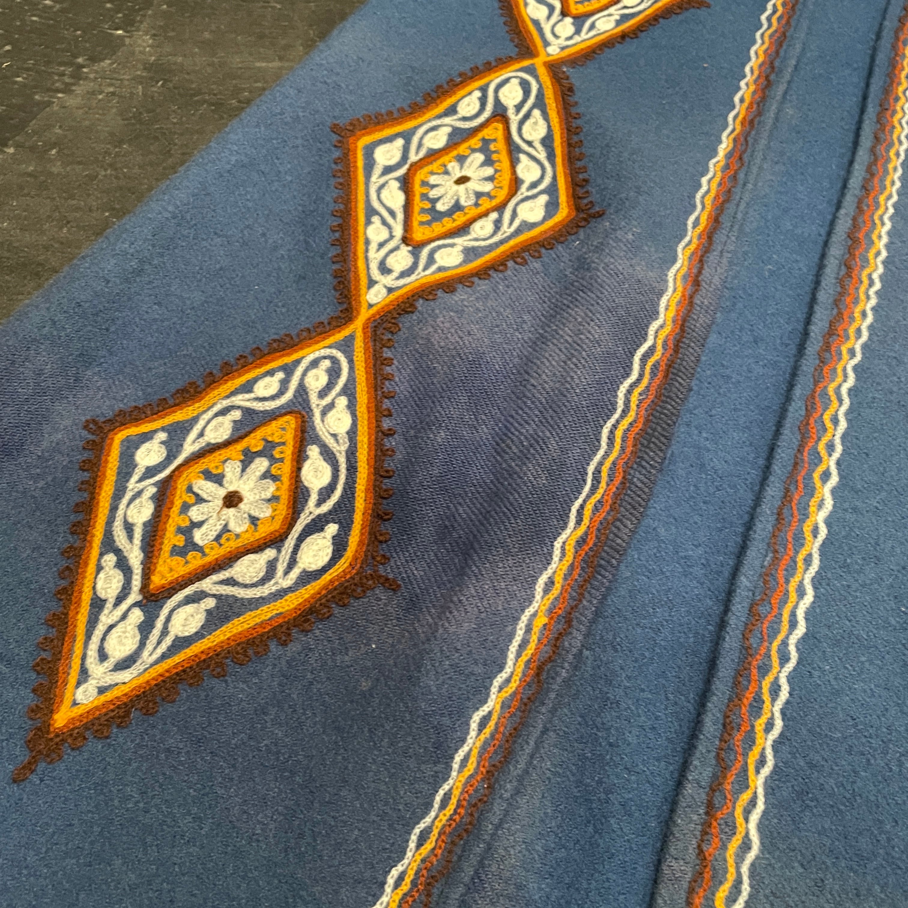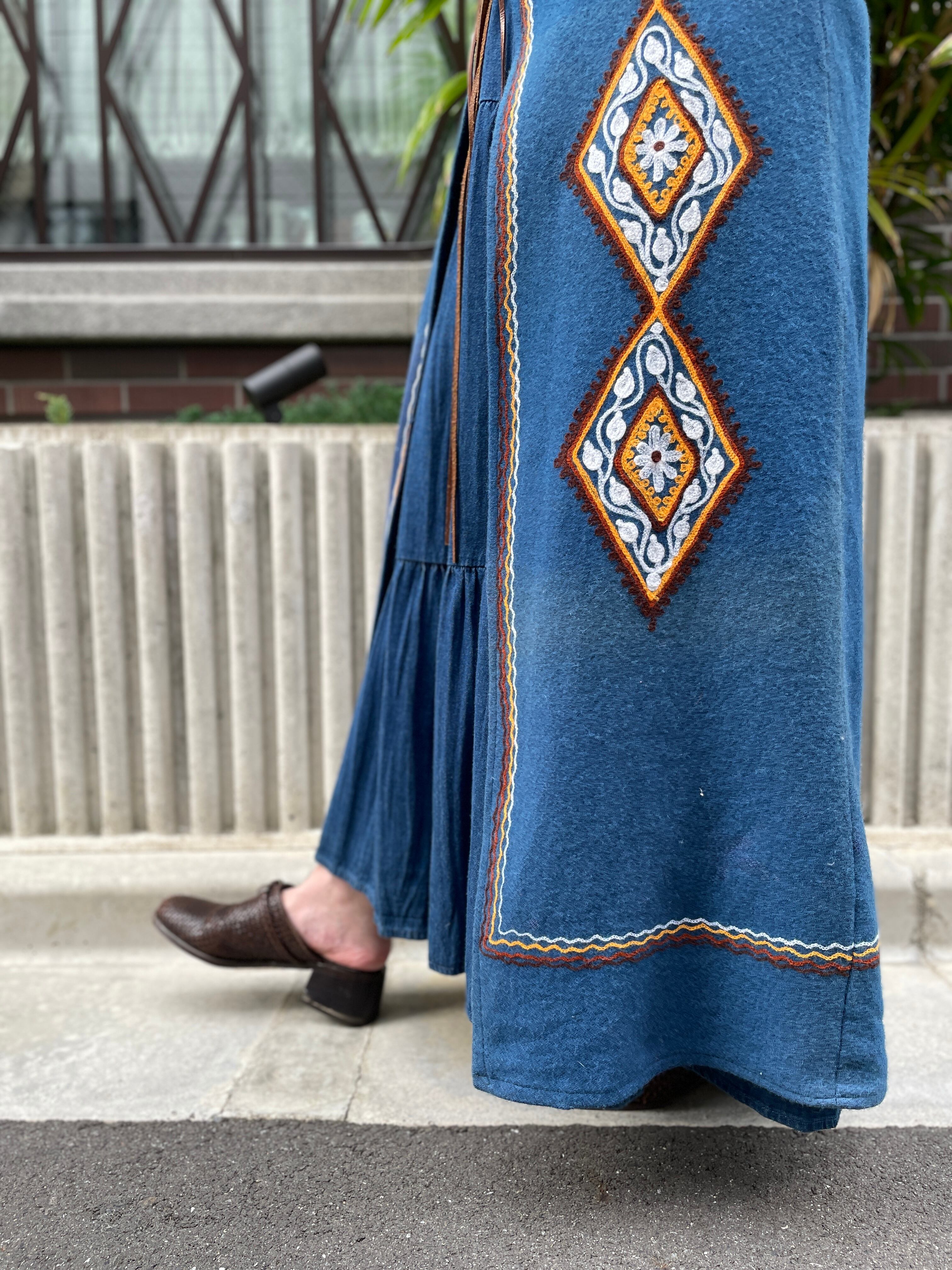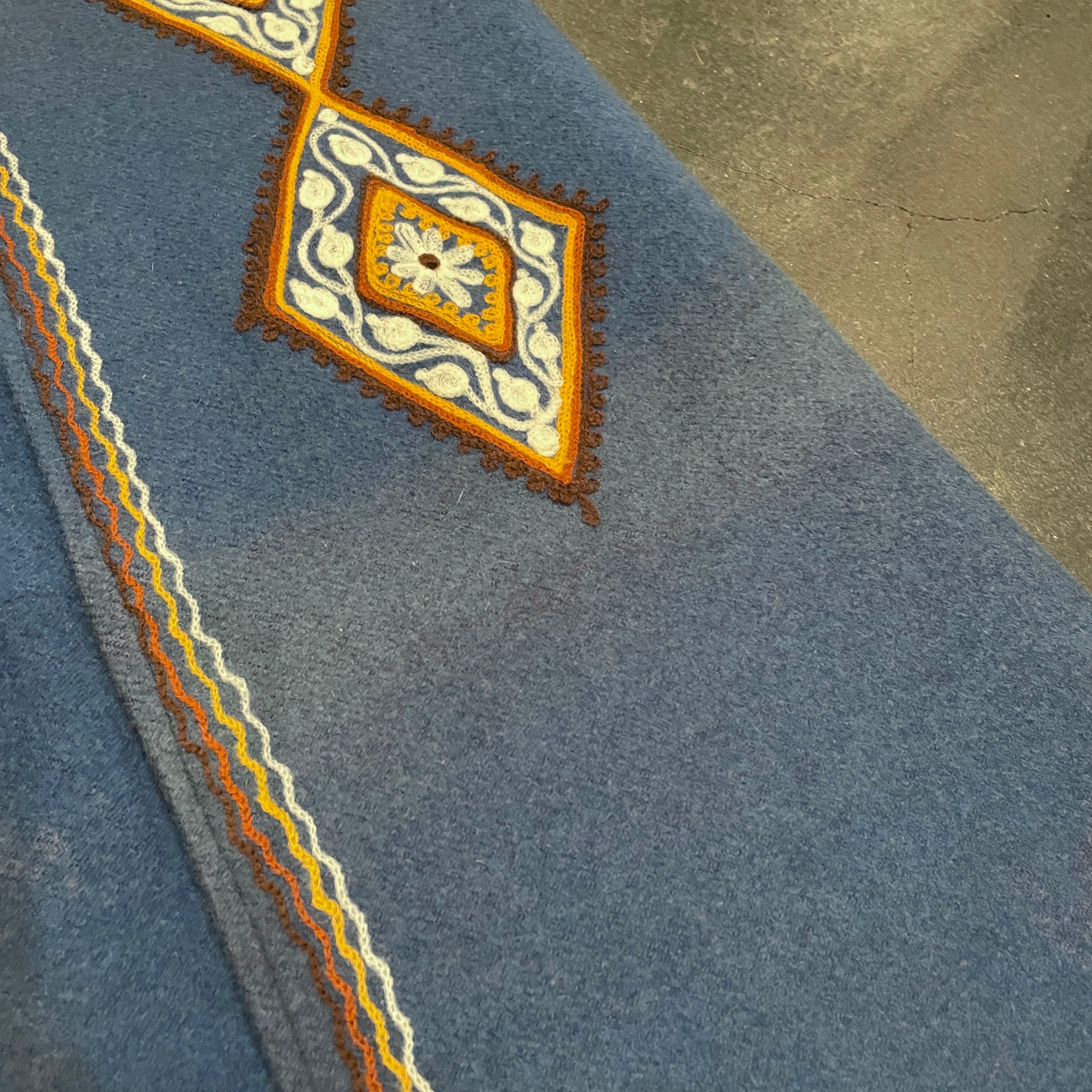 落ち着いたくすみブルーのボディに、ひし形の連なったカシミール刺繍が目を惹くアイテム。