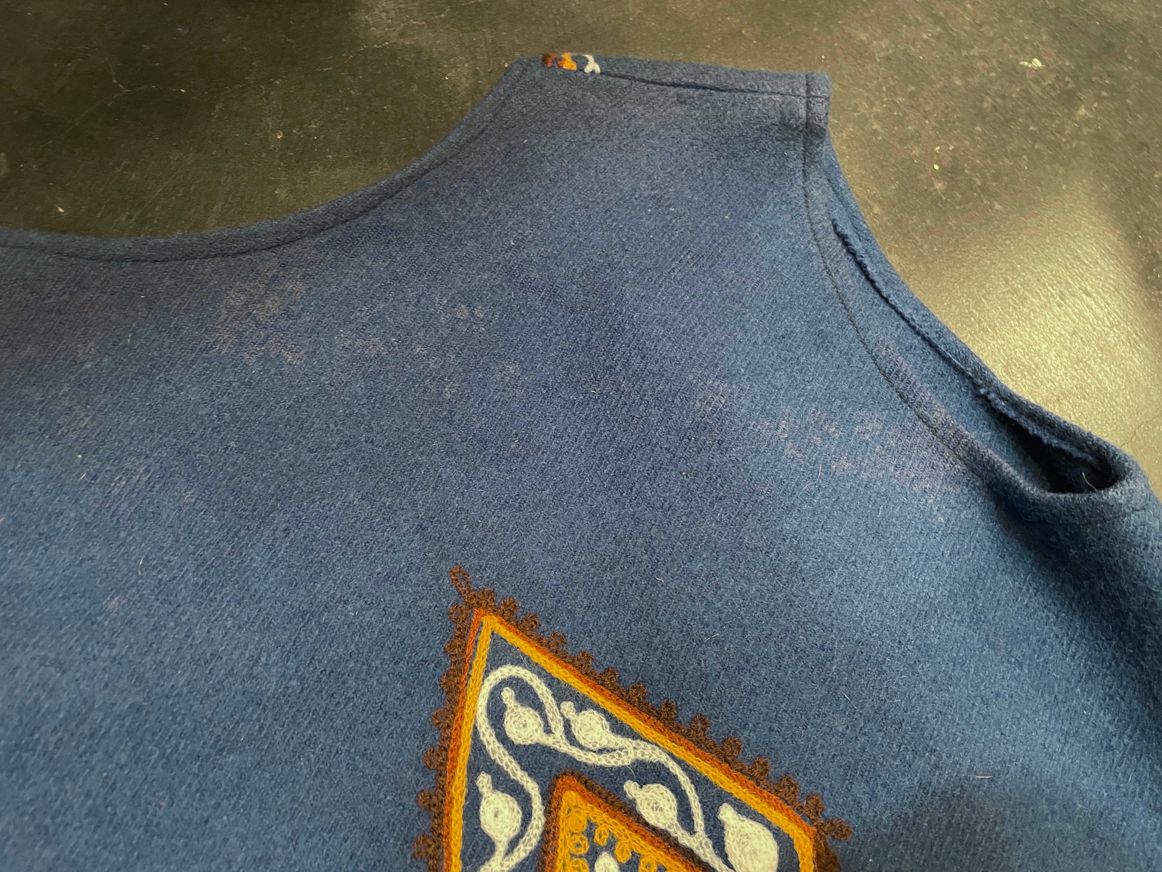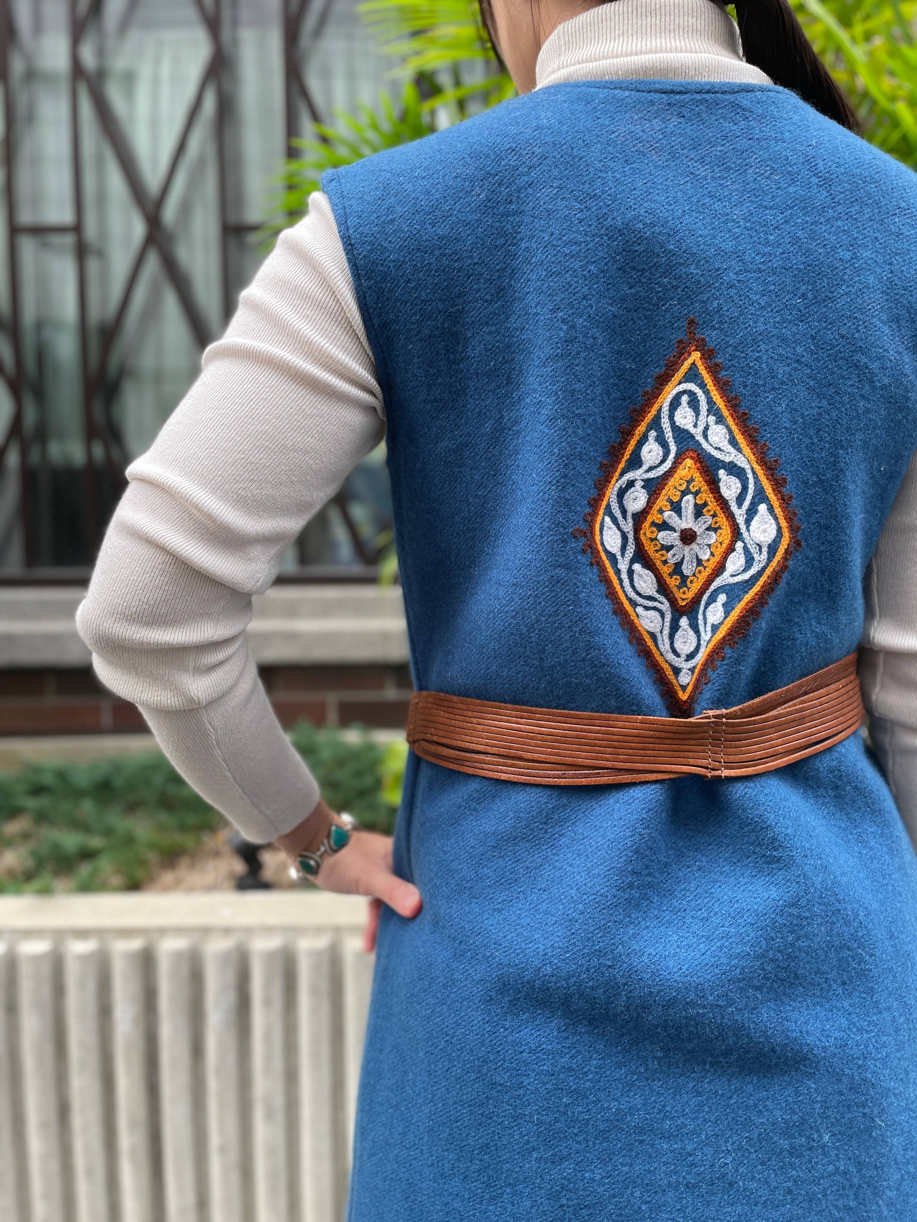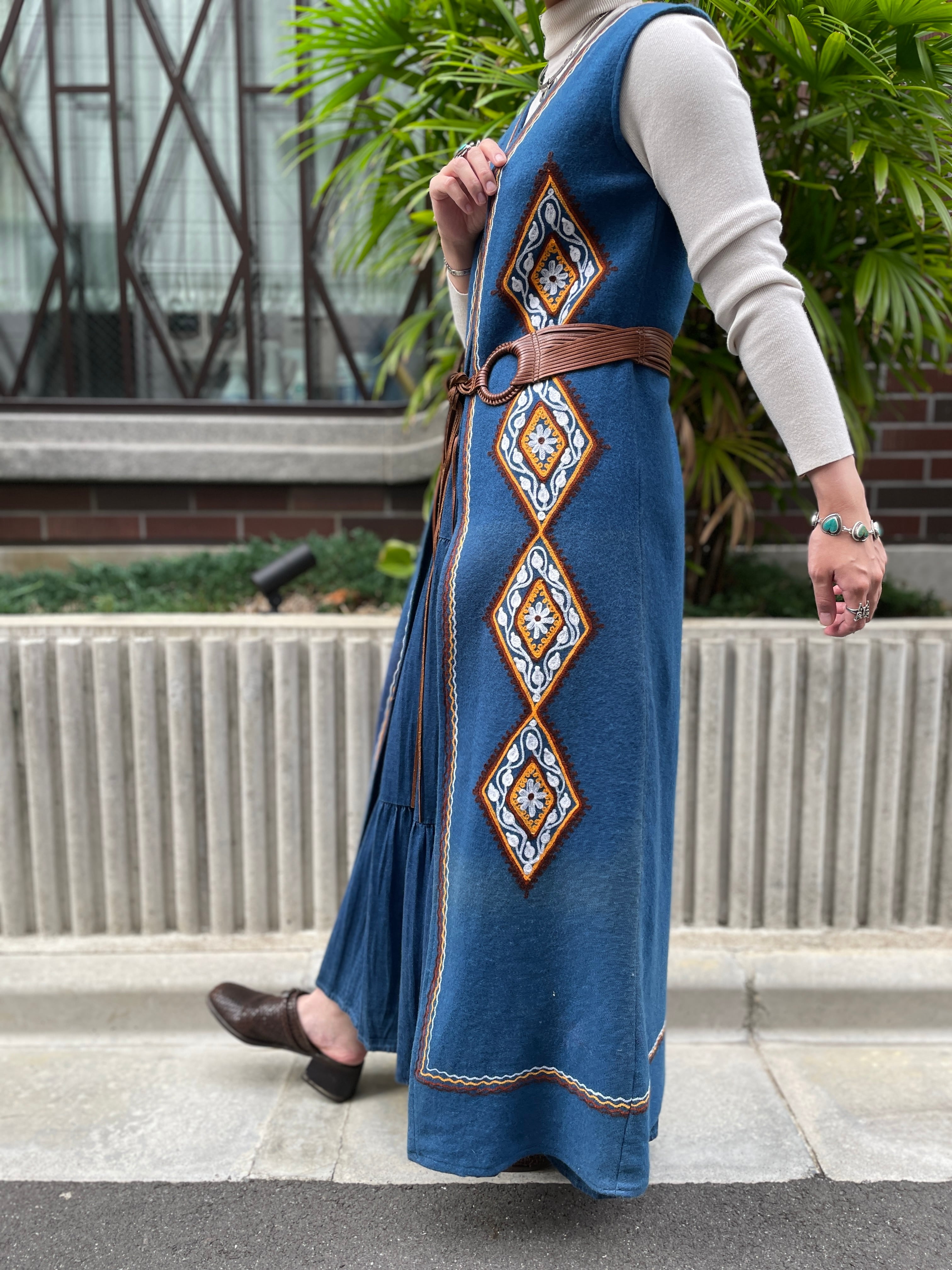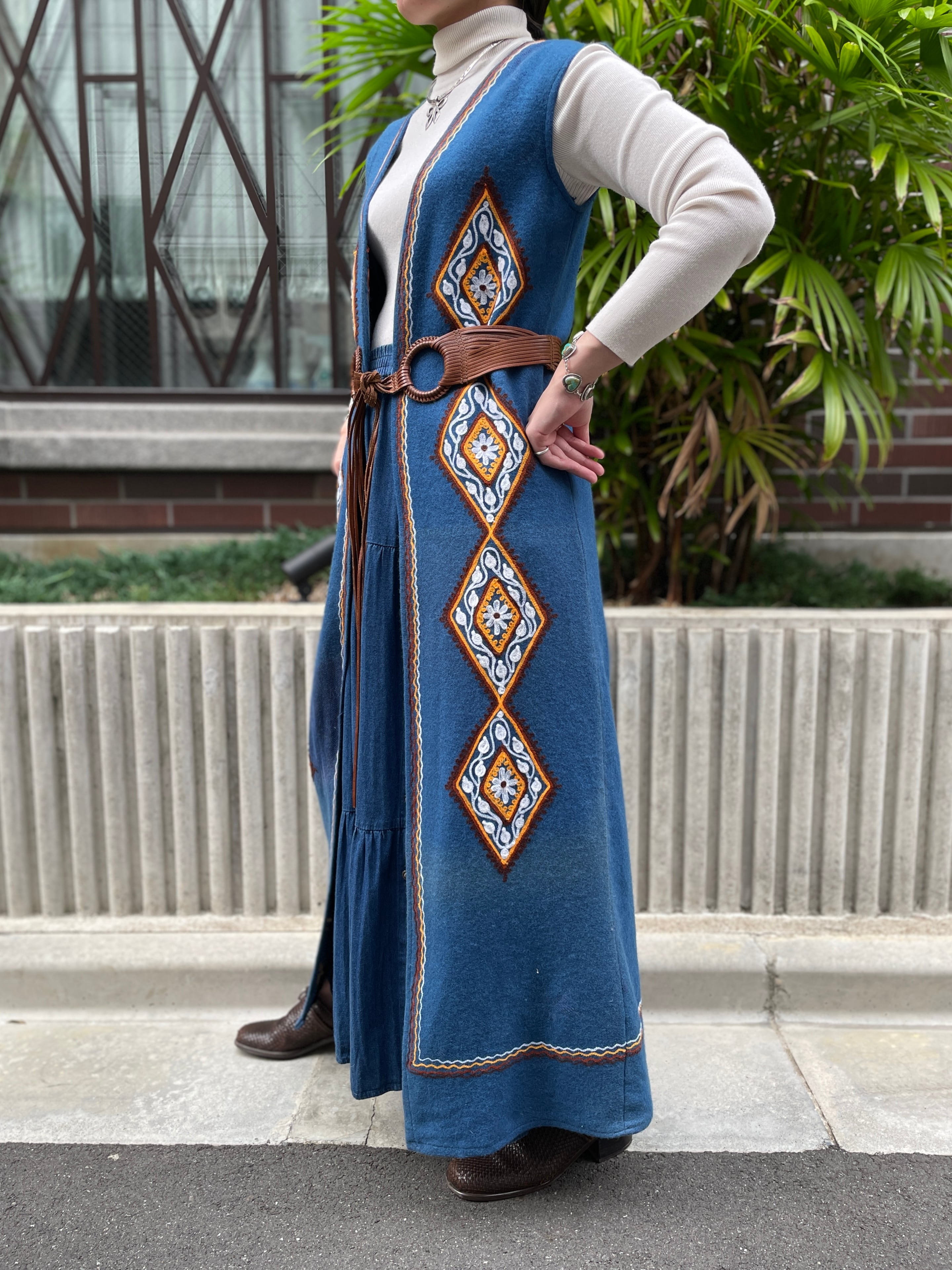 落ち着いたくすみブルーのボディに、ひし形の連なったカシミール刺繍が目を惹くアイテム。
