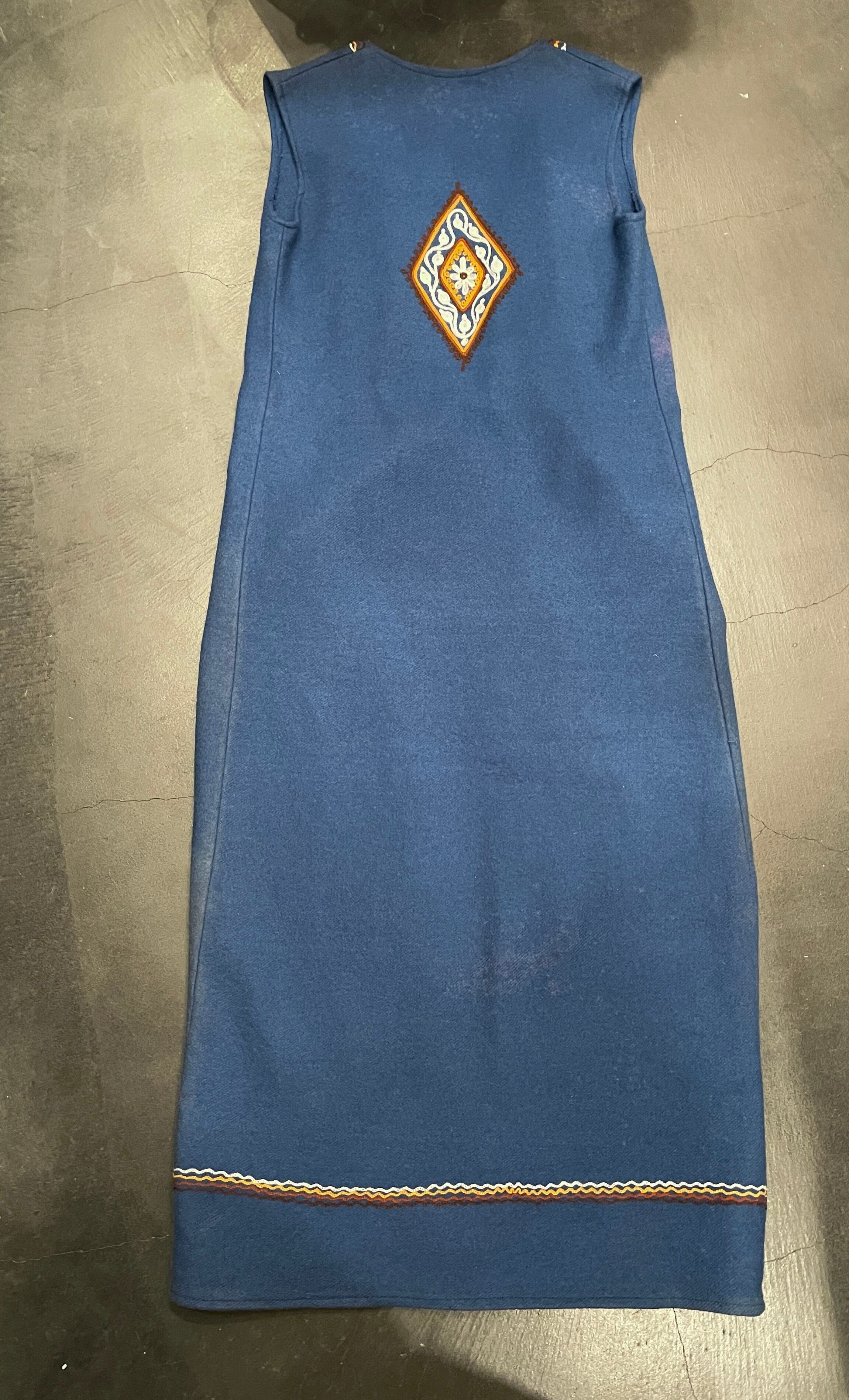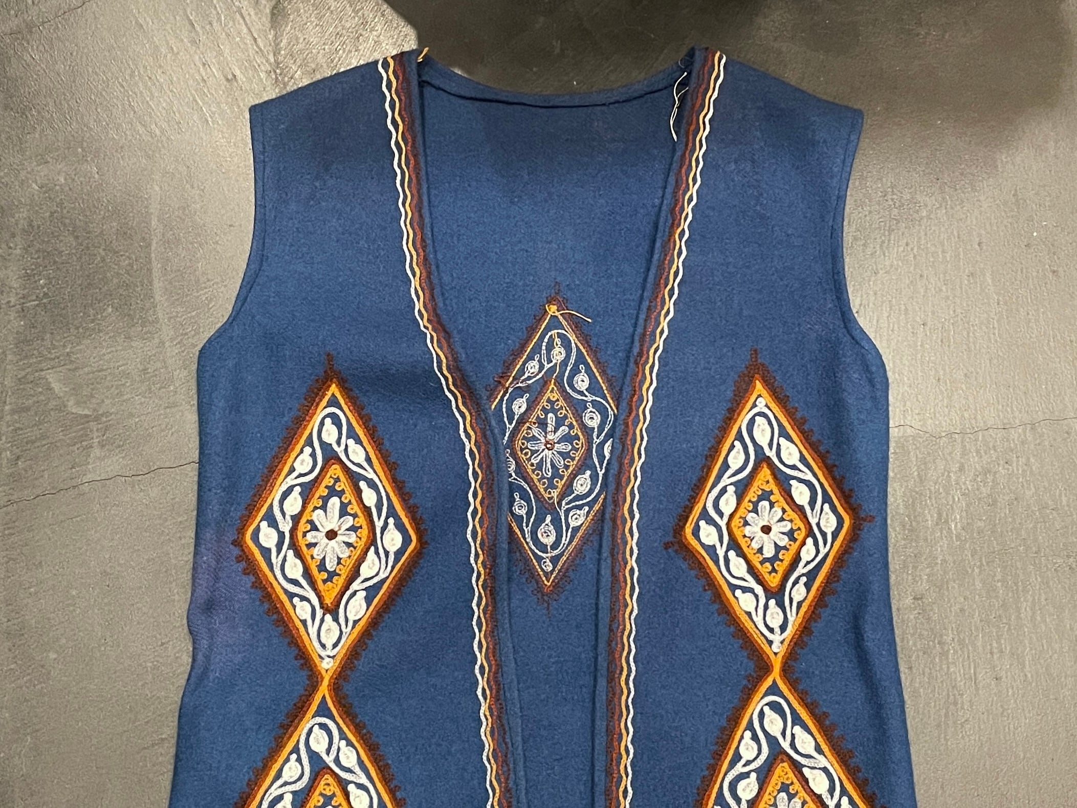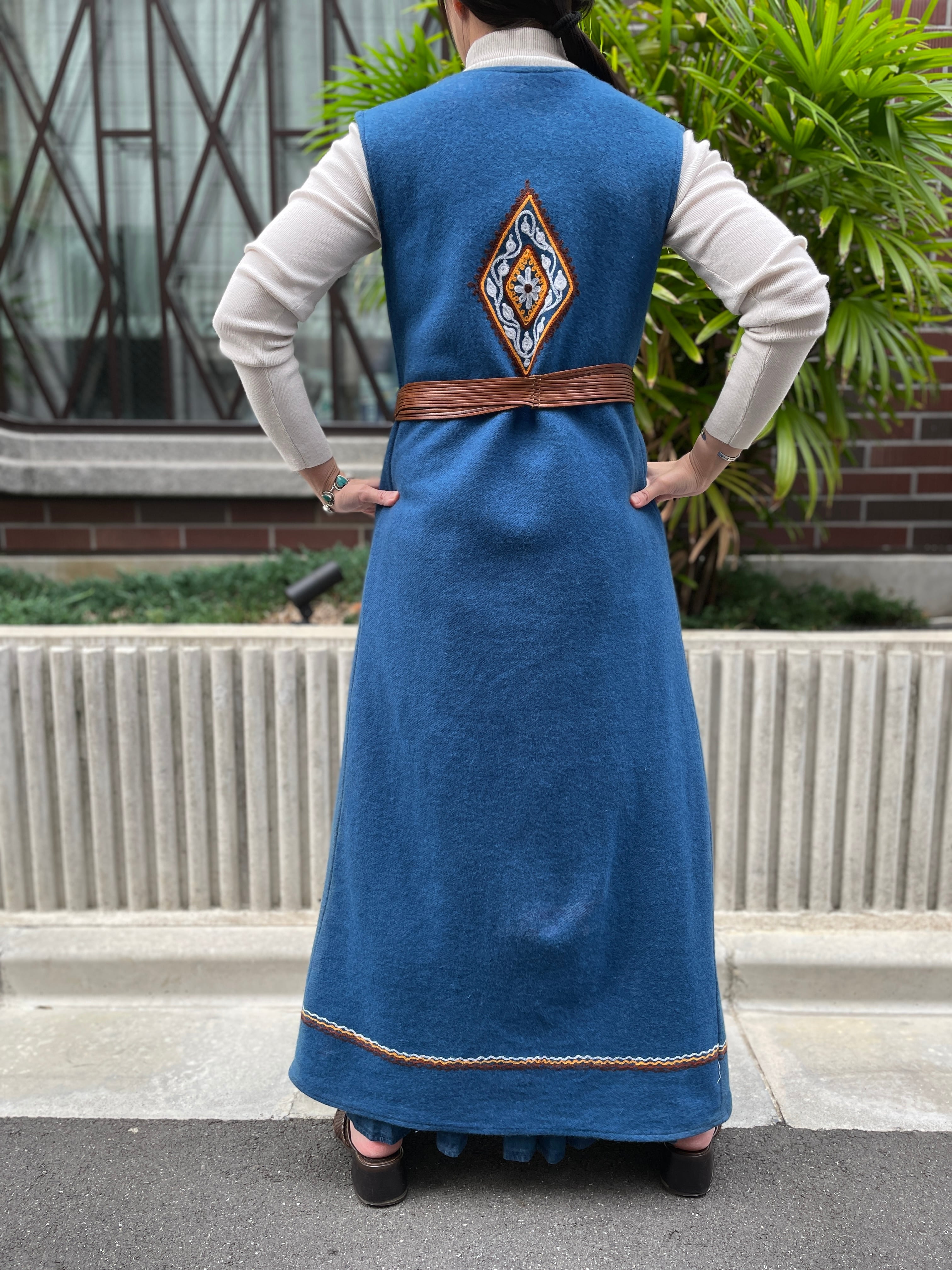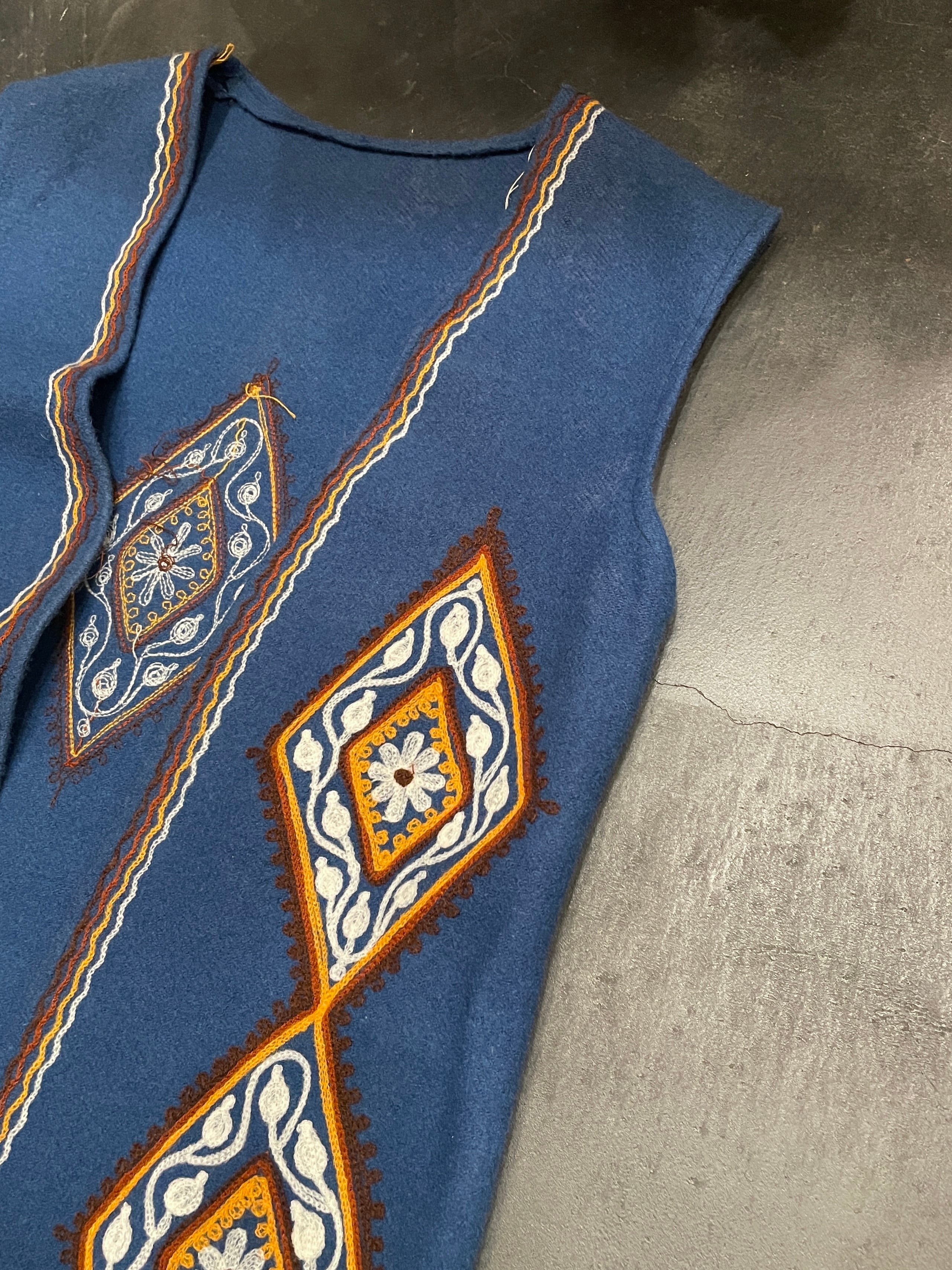 落ち着いたくすみブルーのボディに、ひし形の連なったカシミール刺繍が目を惹くアイテム。