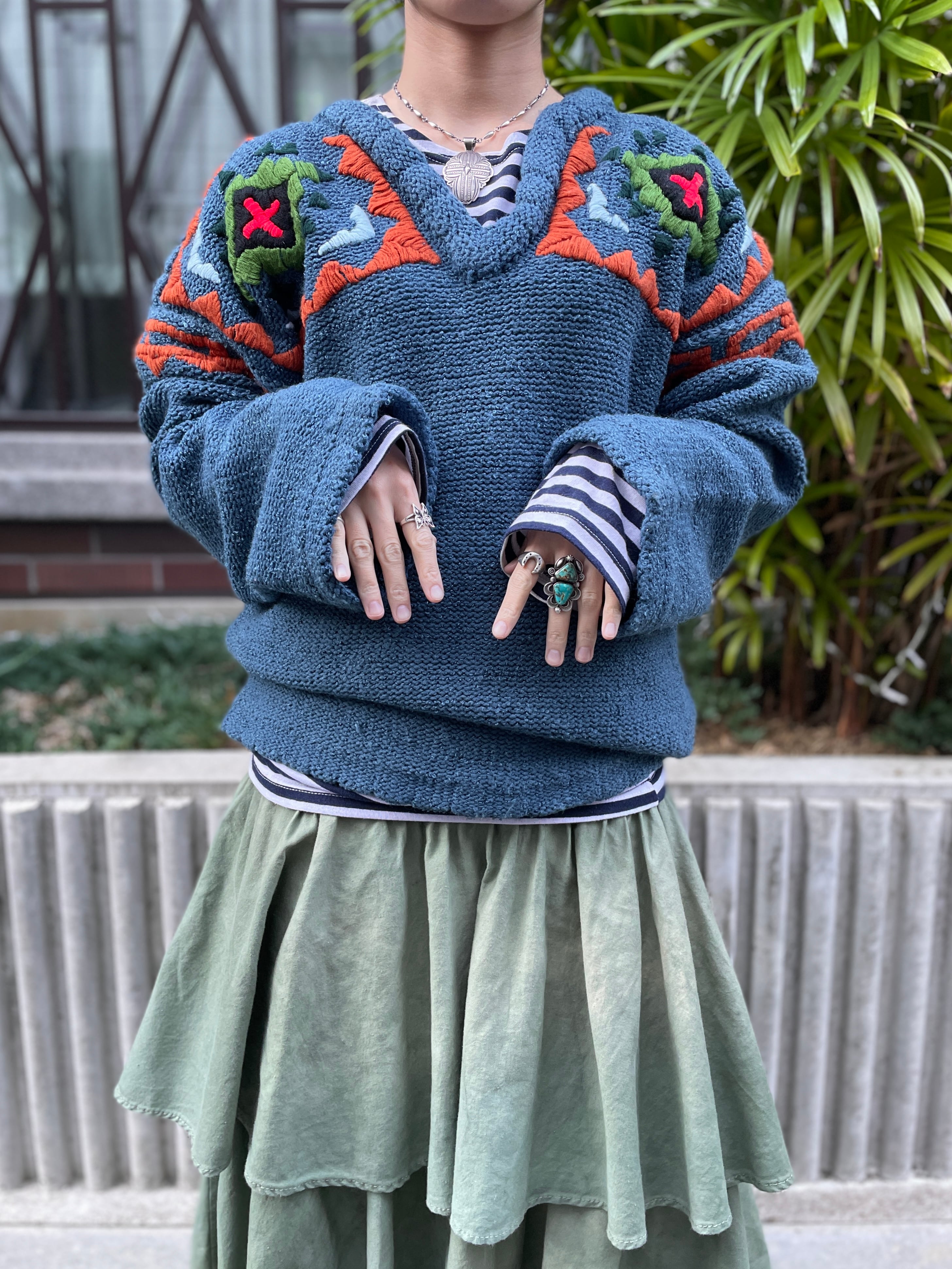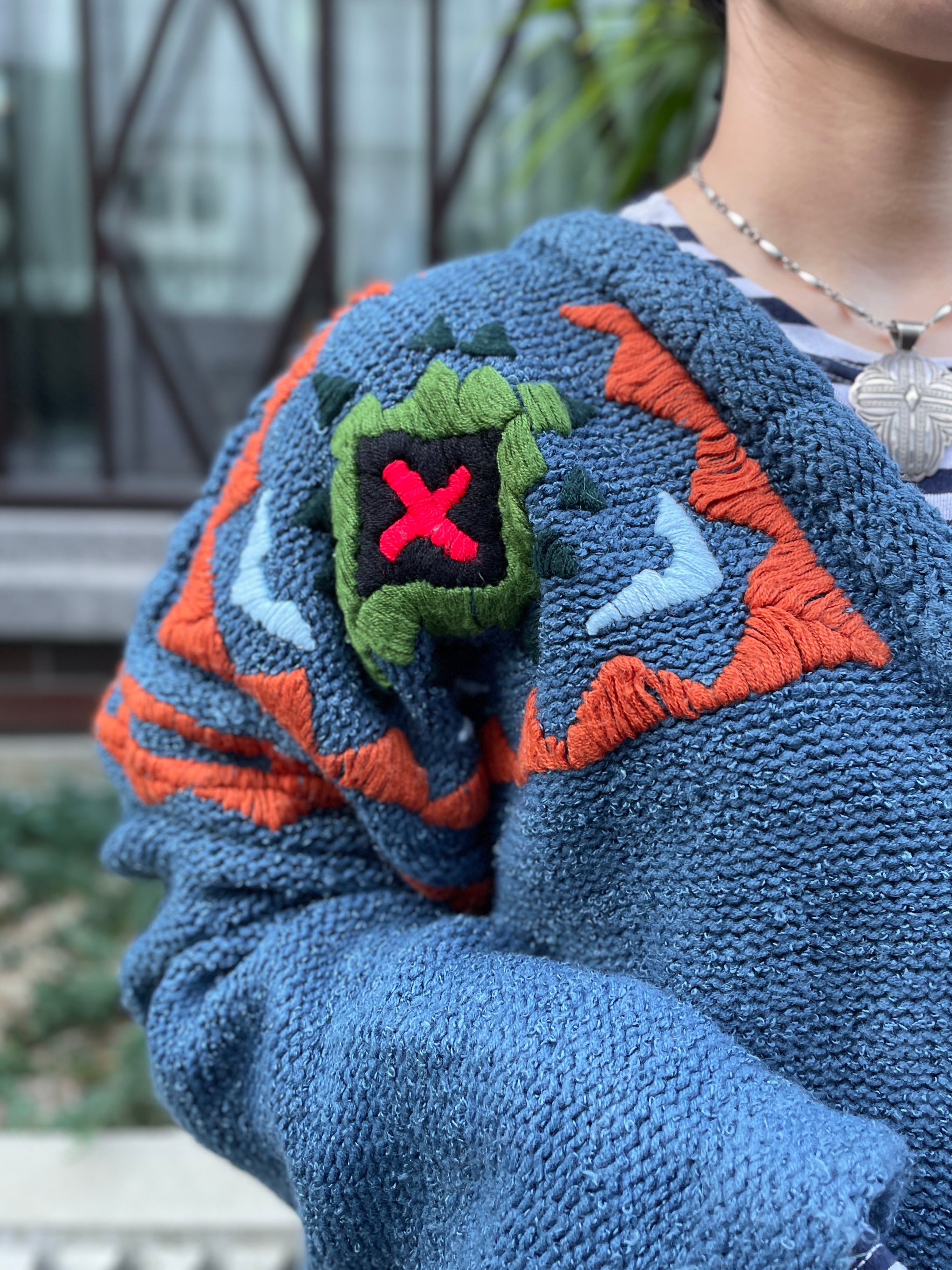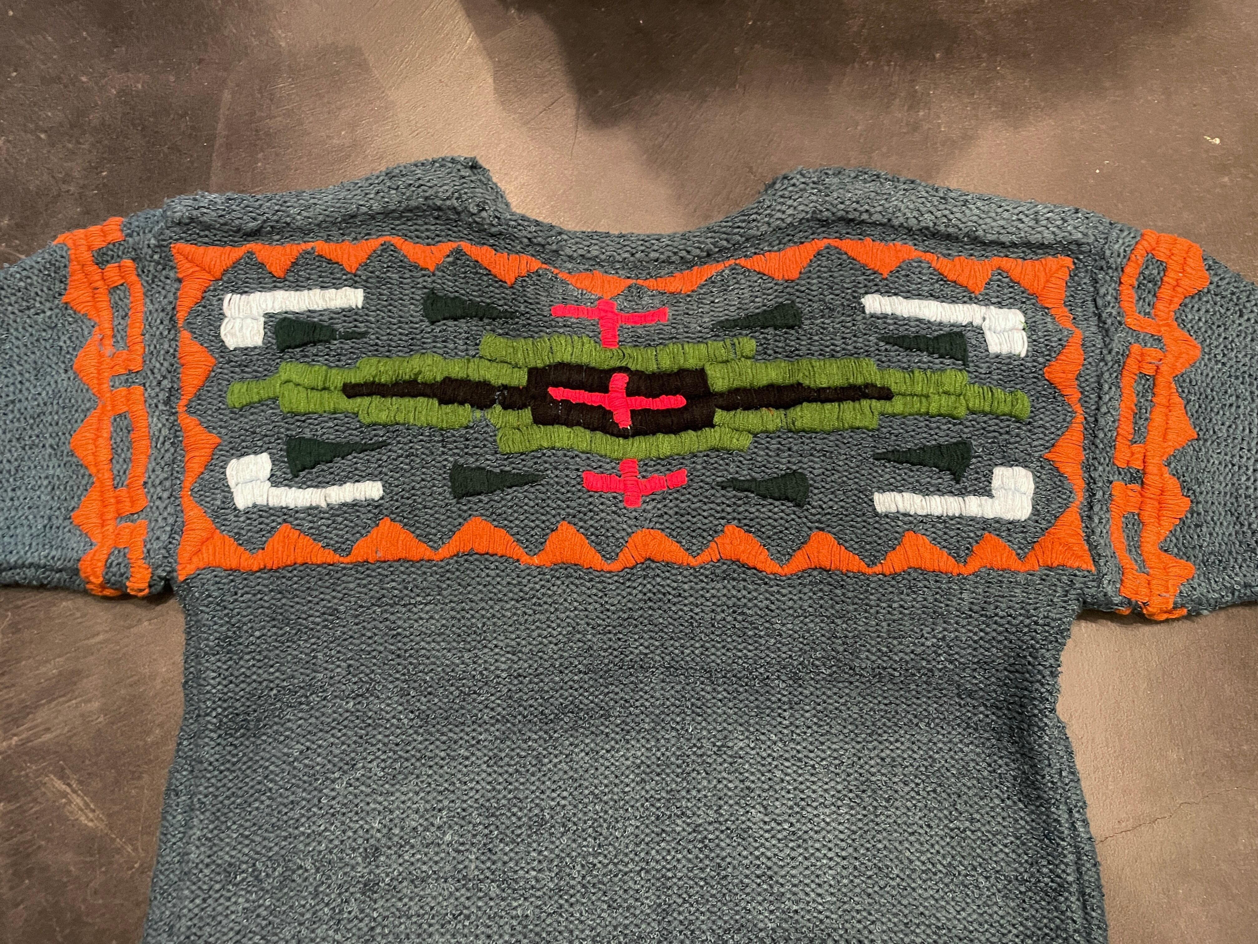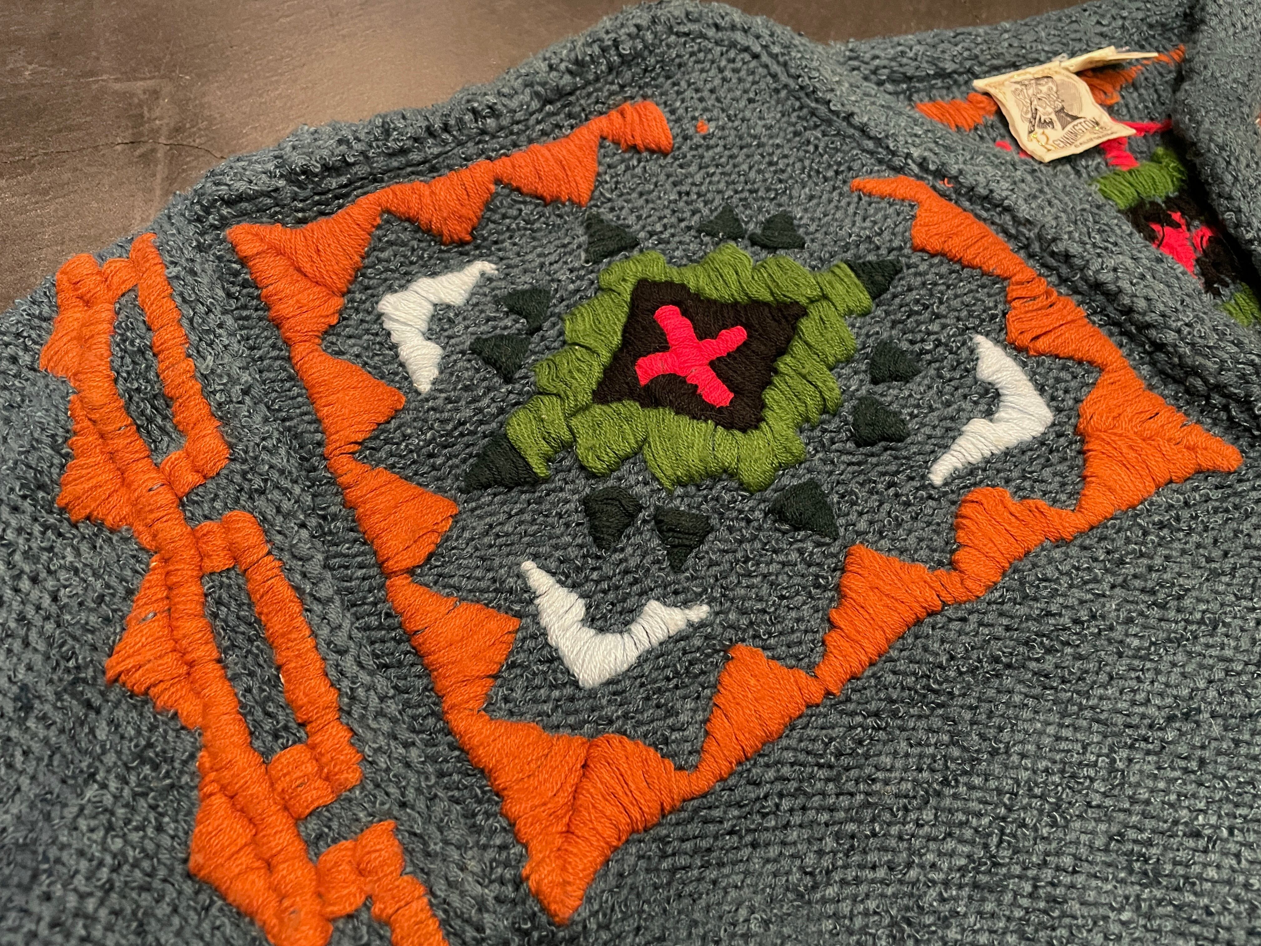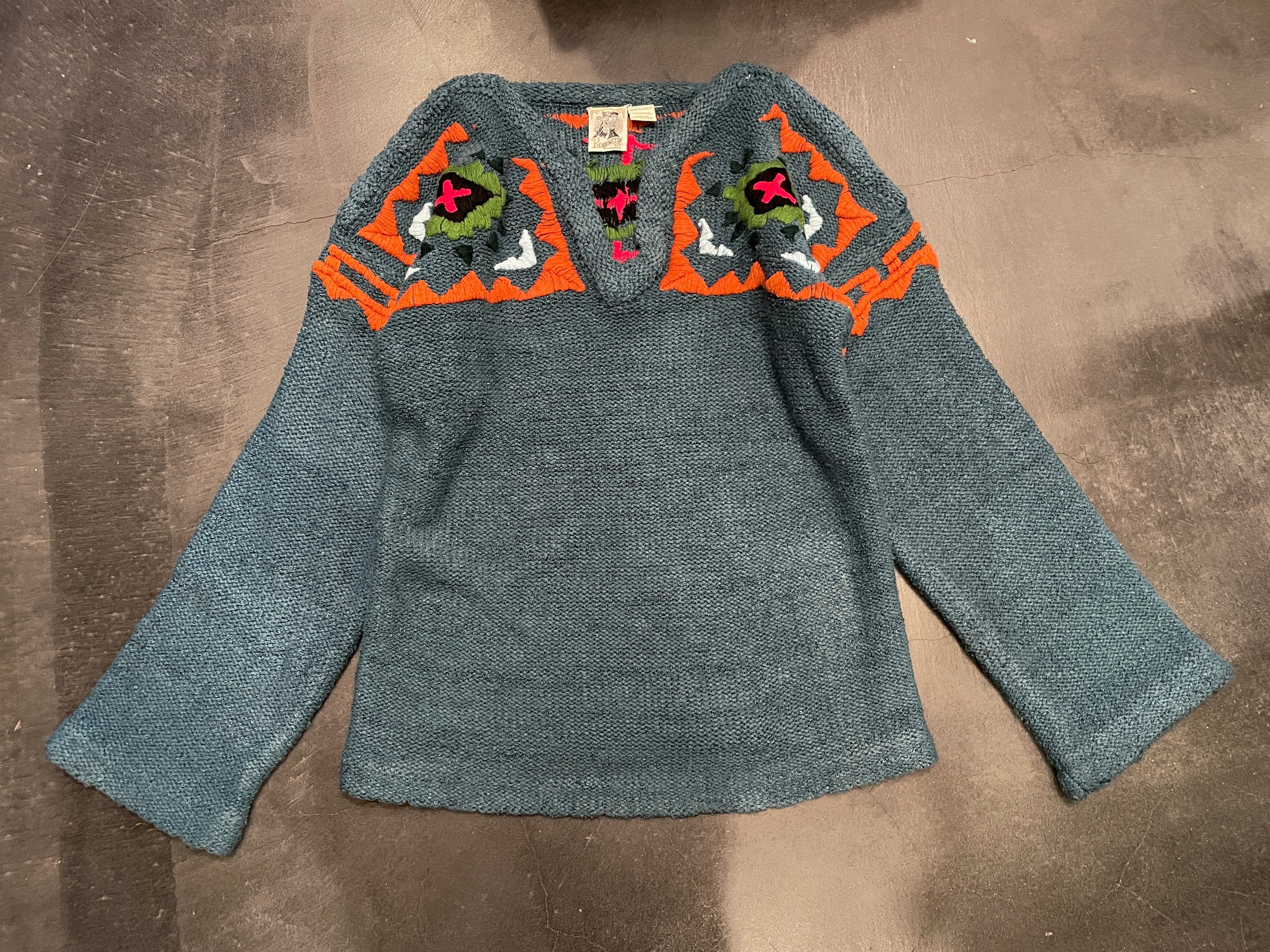 くすんだブルーボディにネイティブ調な刺繍が随所に施されたアイテム。