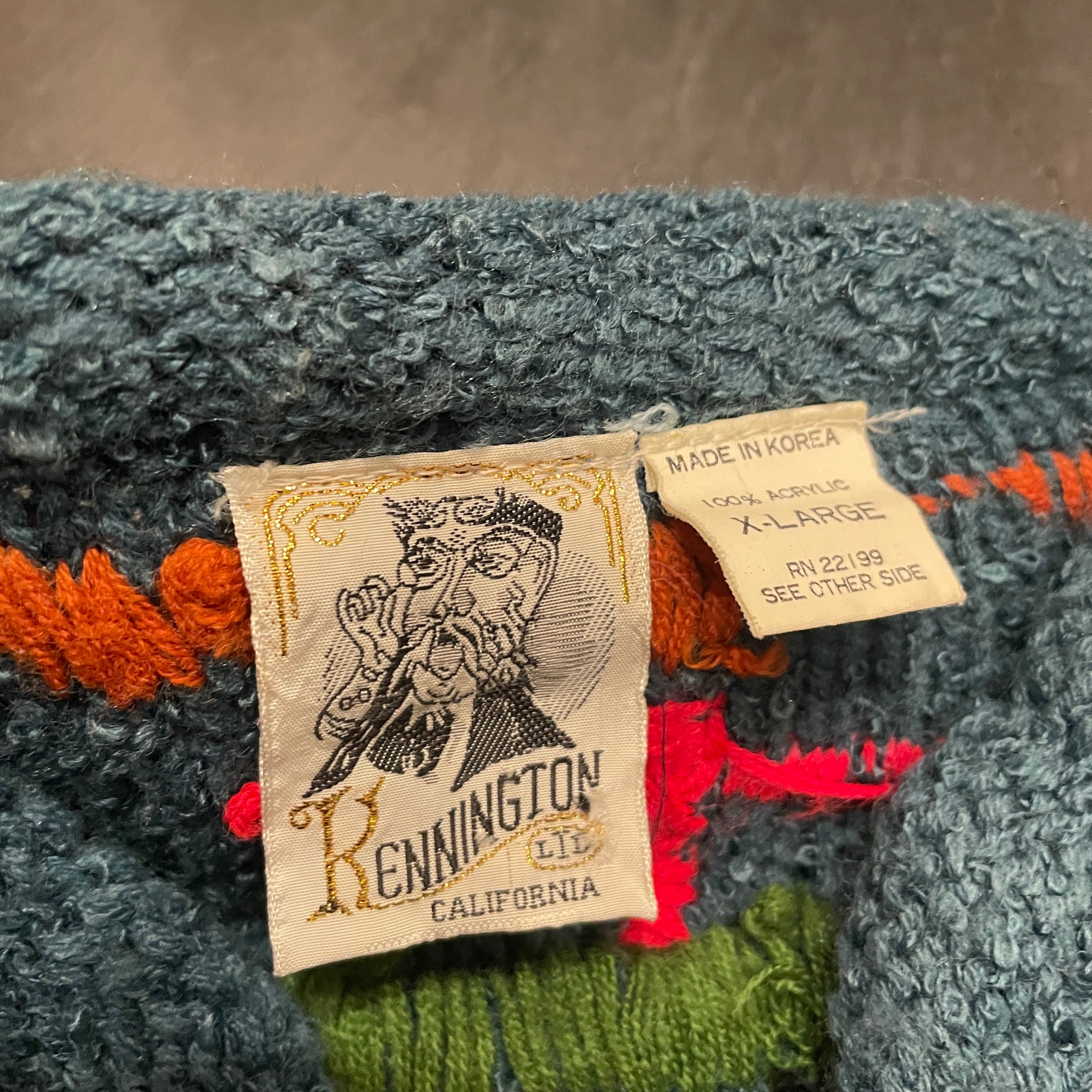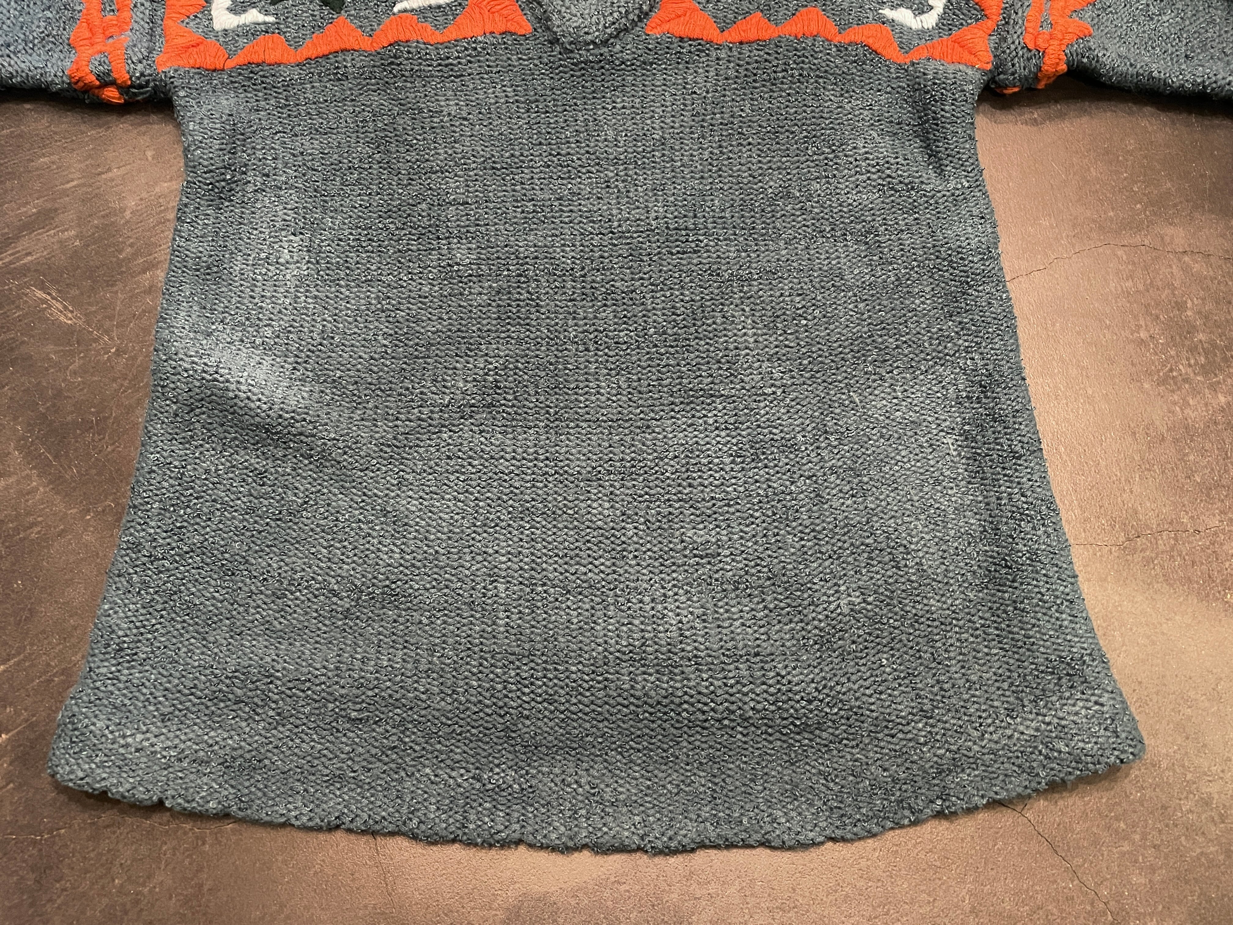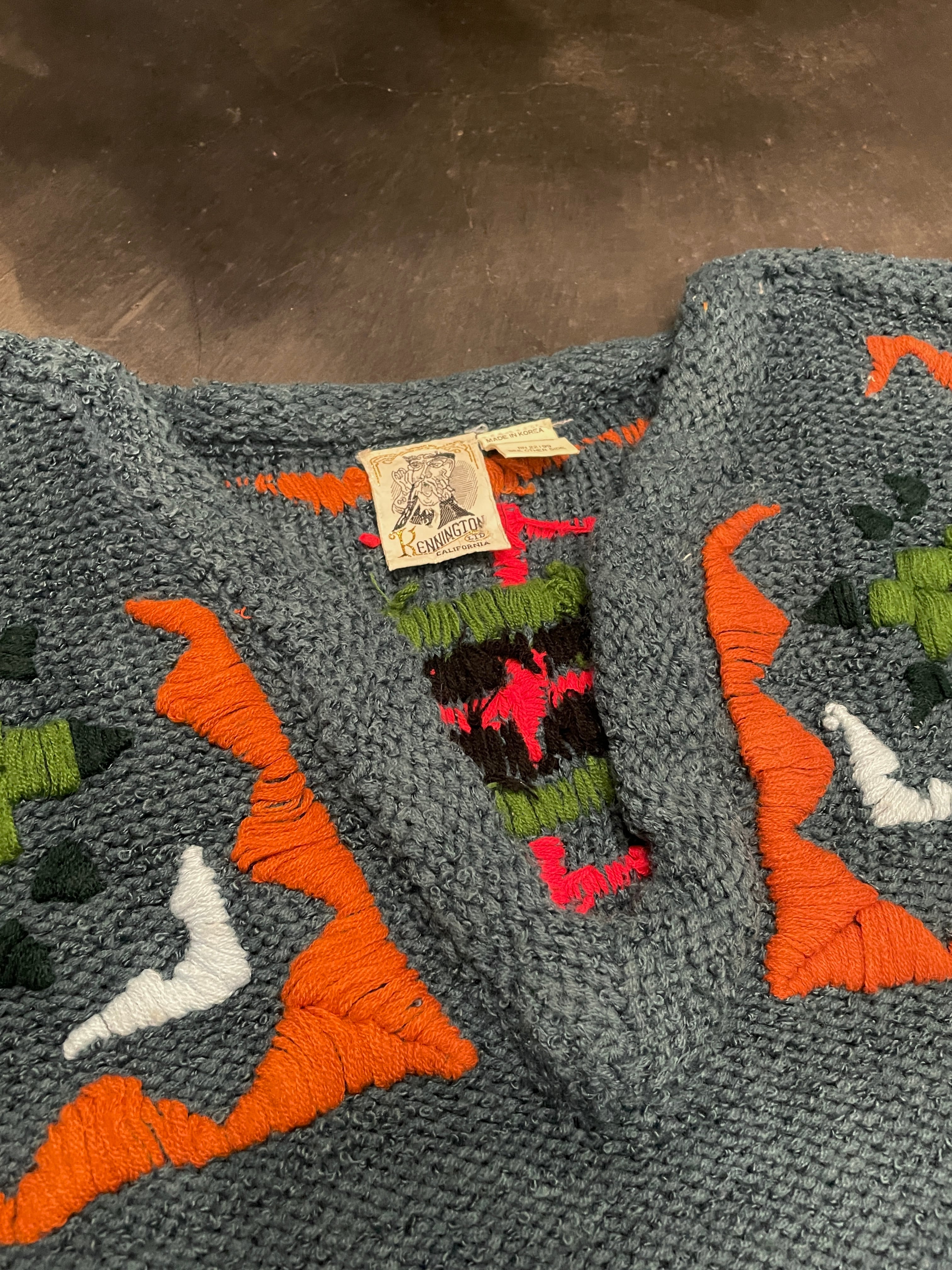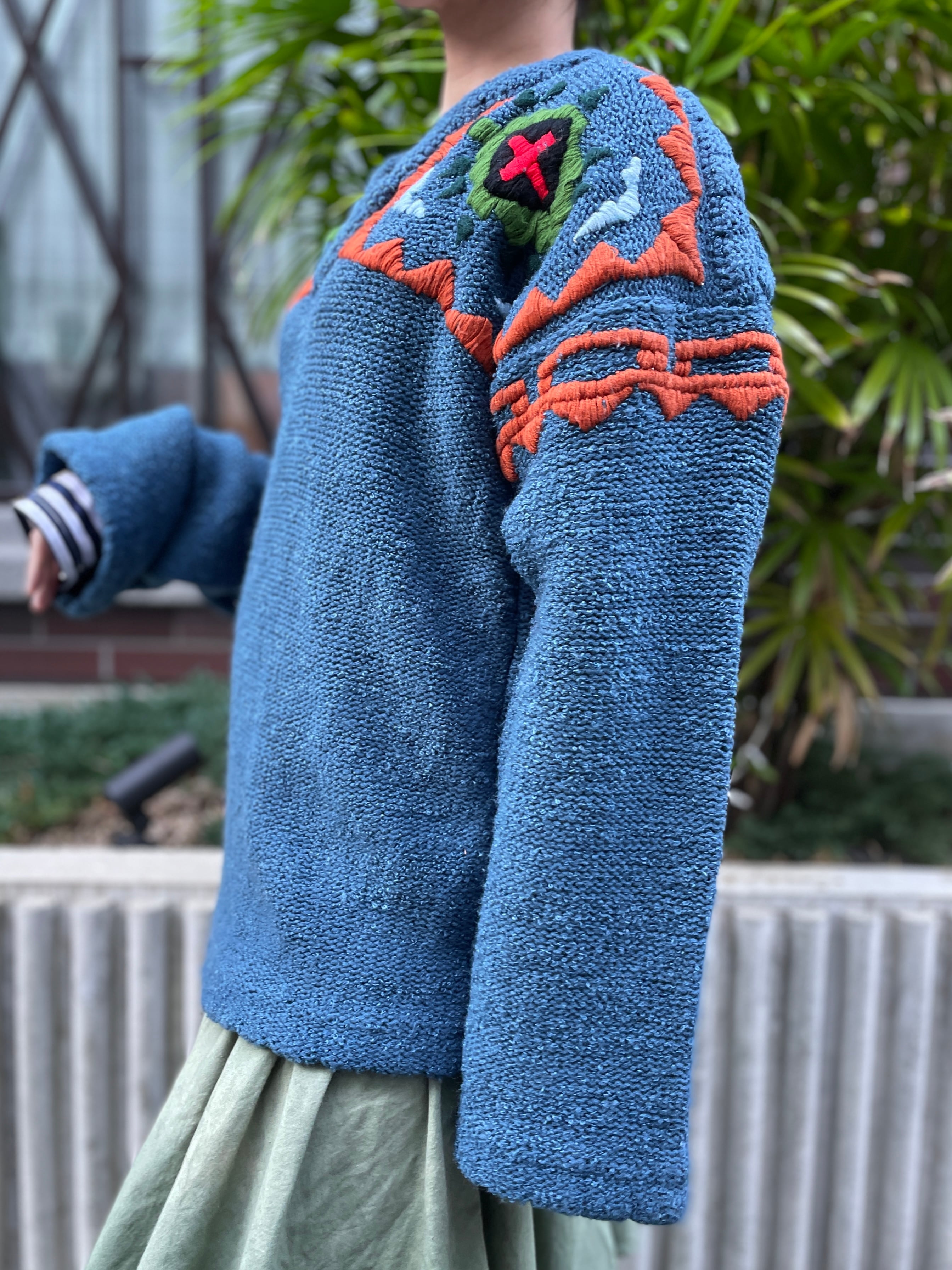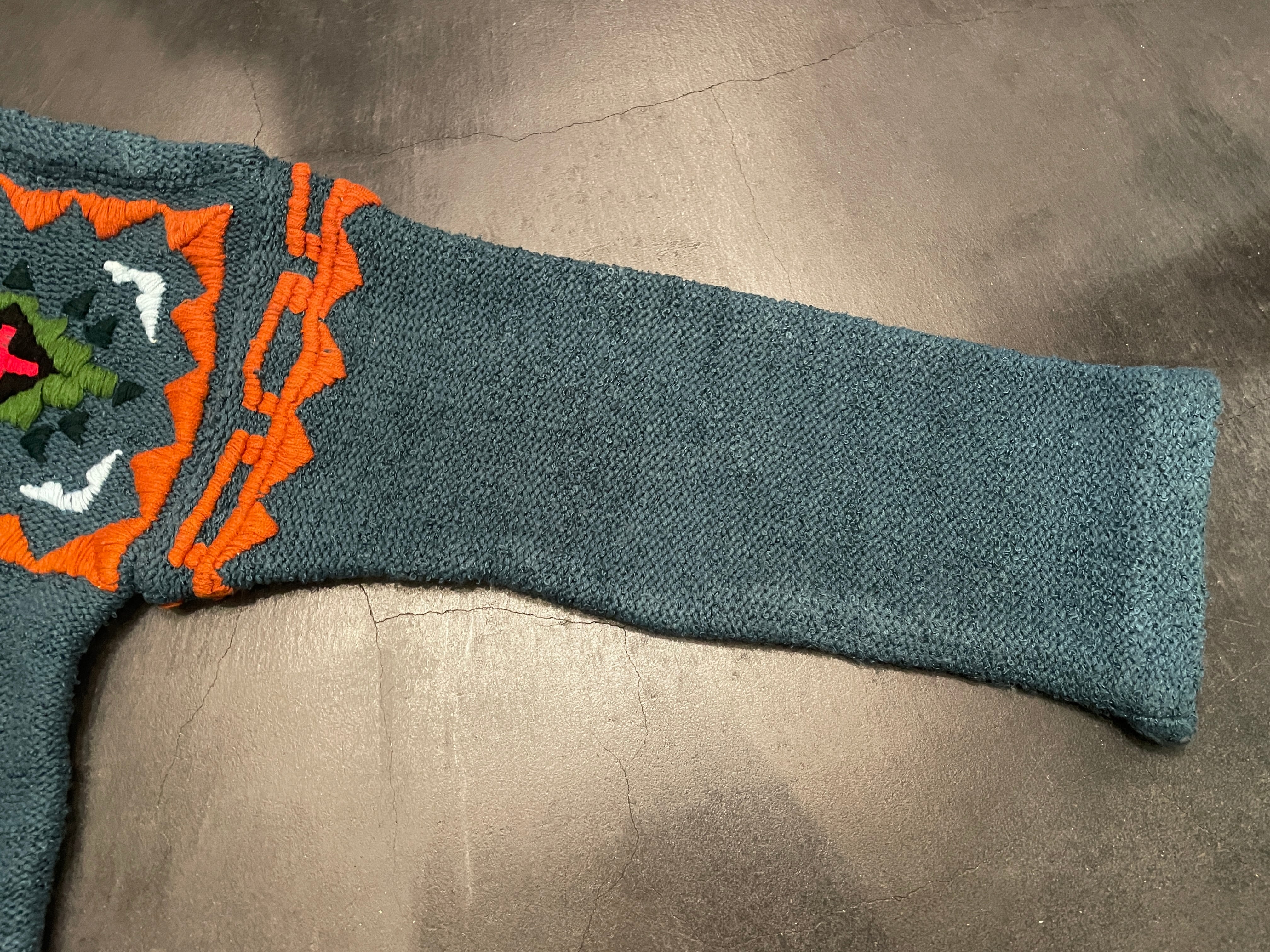 くすんだブルーボディにネイティブ調な刺繍が随所に施されたアイテム。