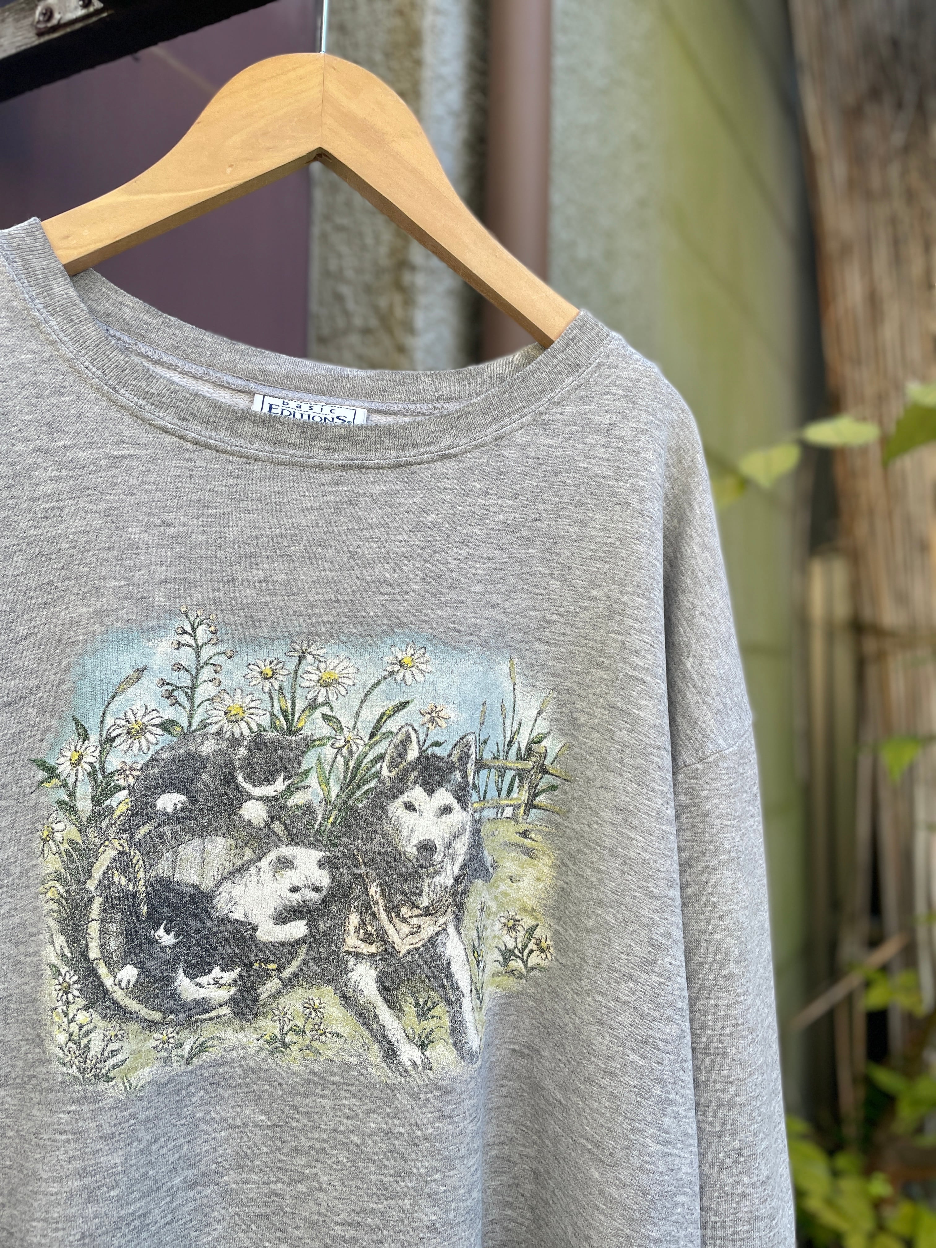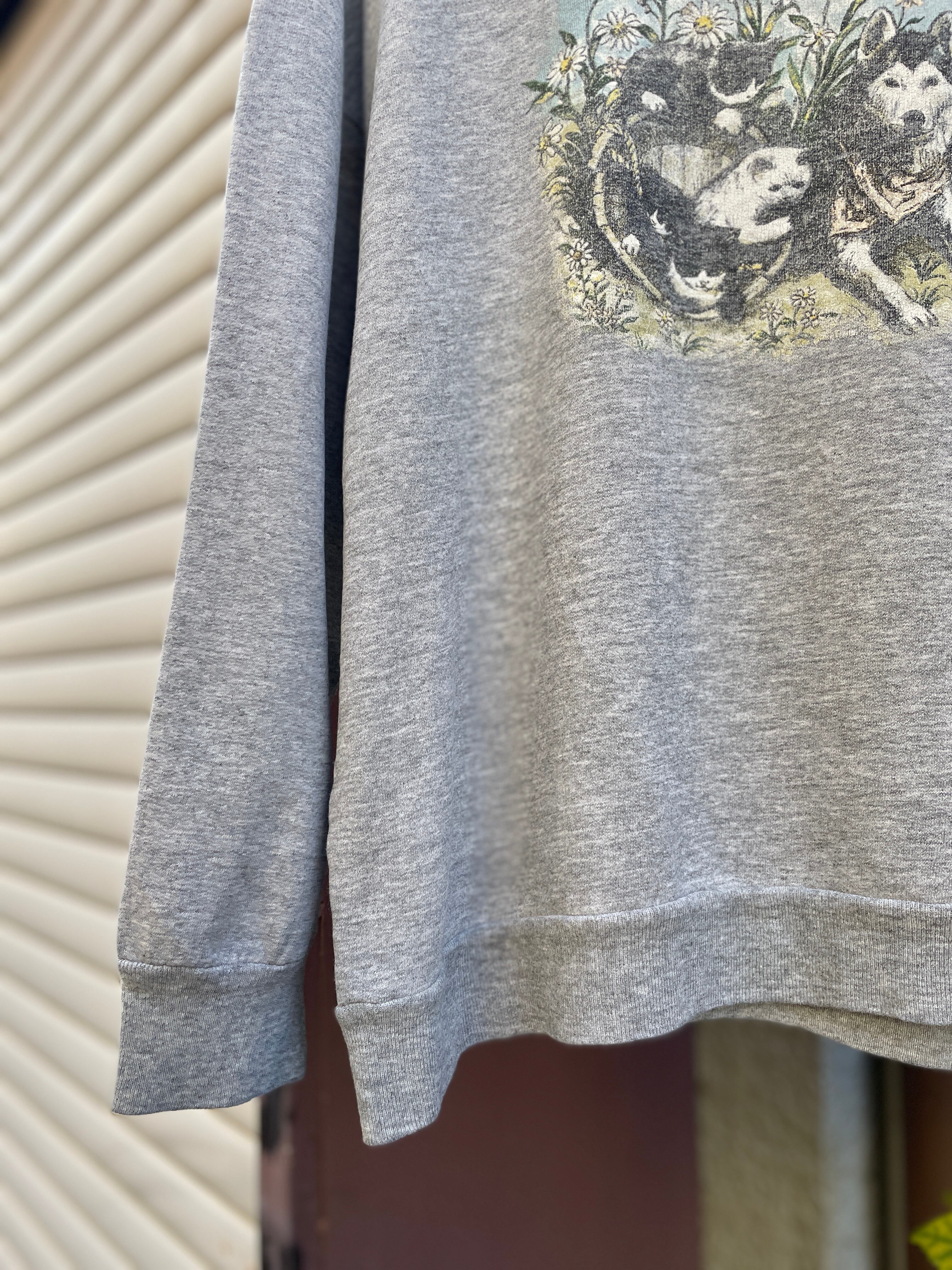 グレーボディにネコとイヌが仲良さそうにしているプリントが施された可愛らしいアイテム。