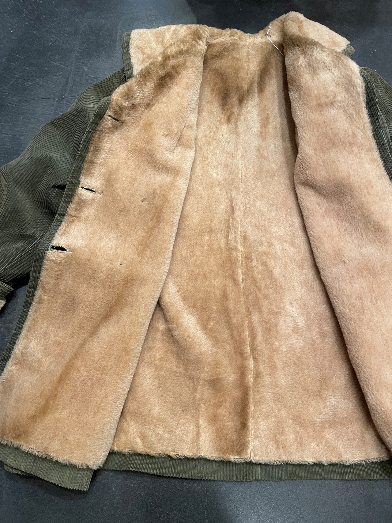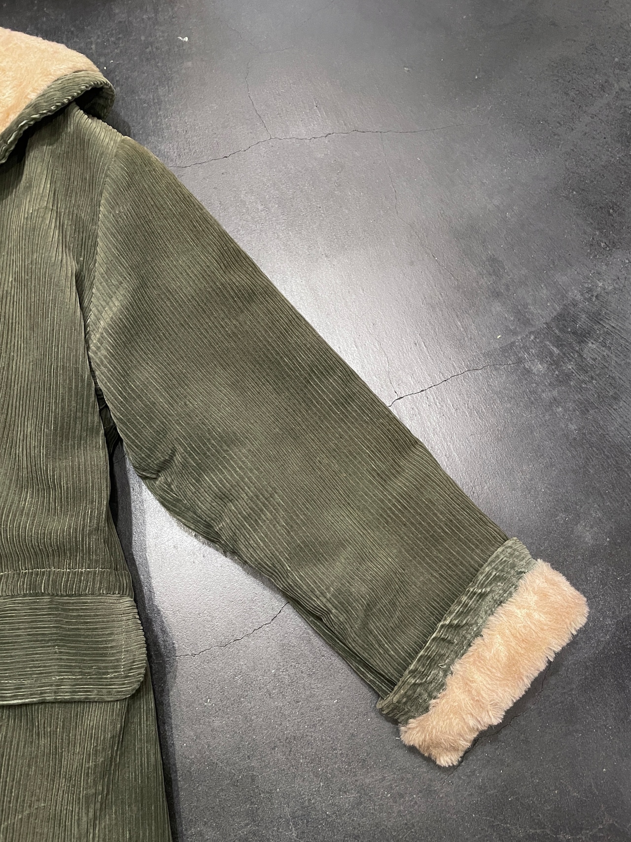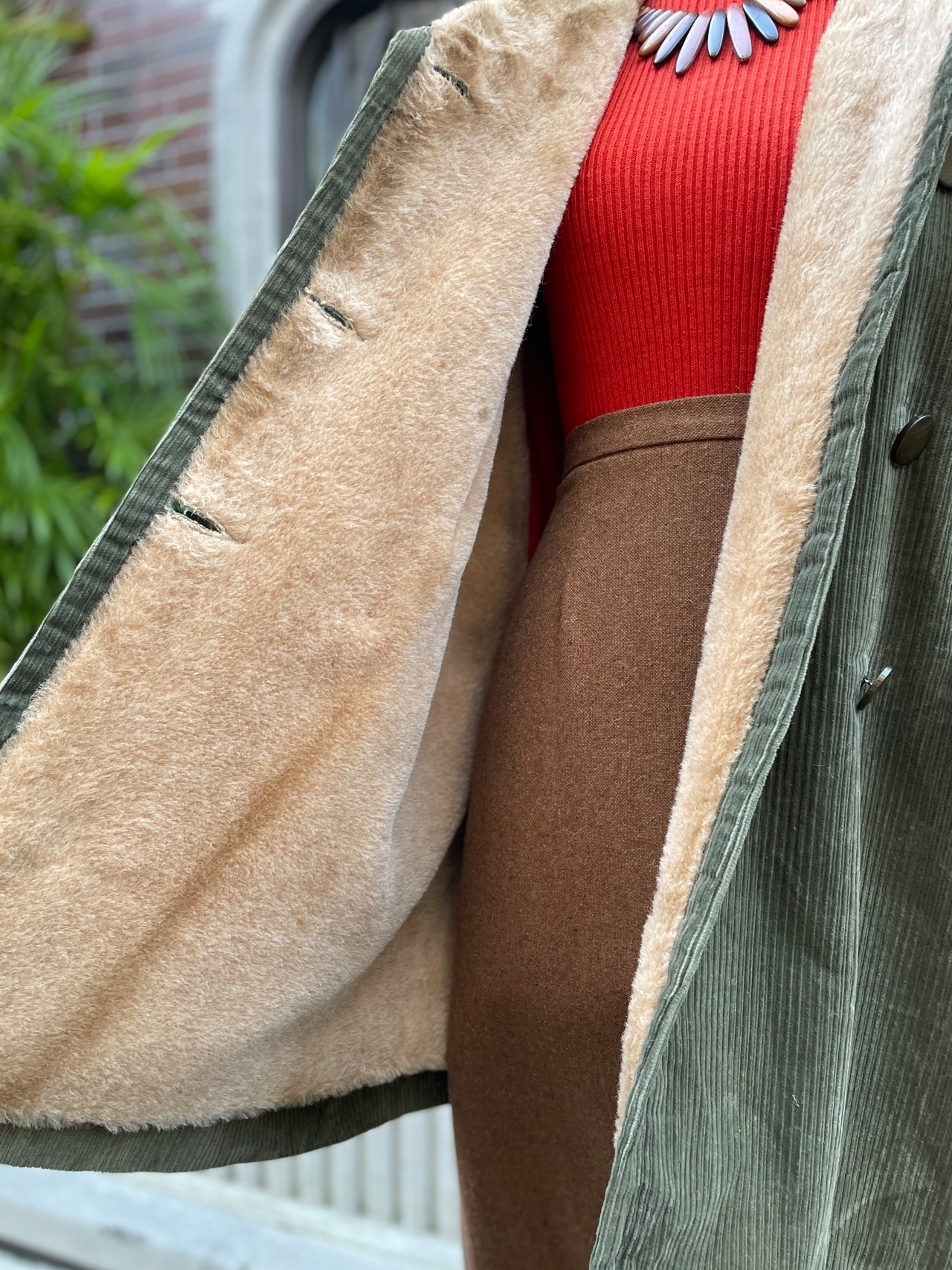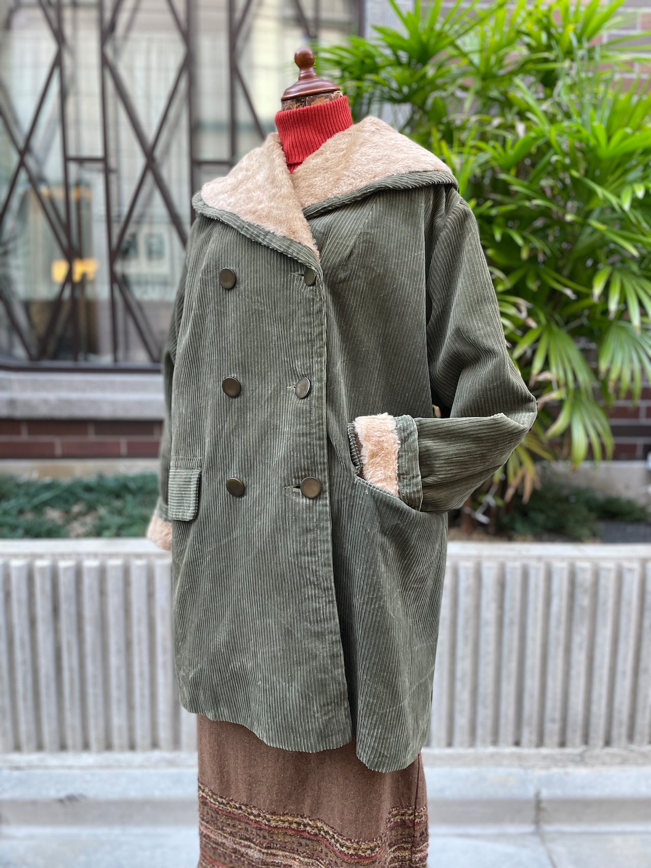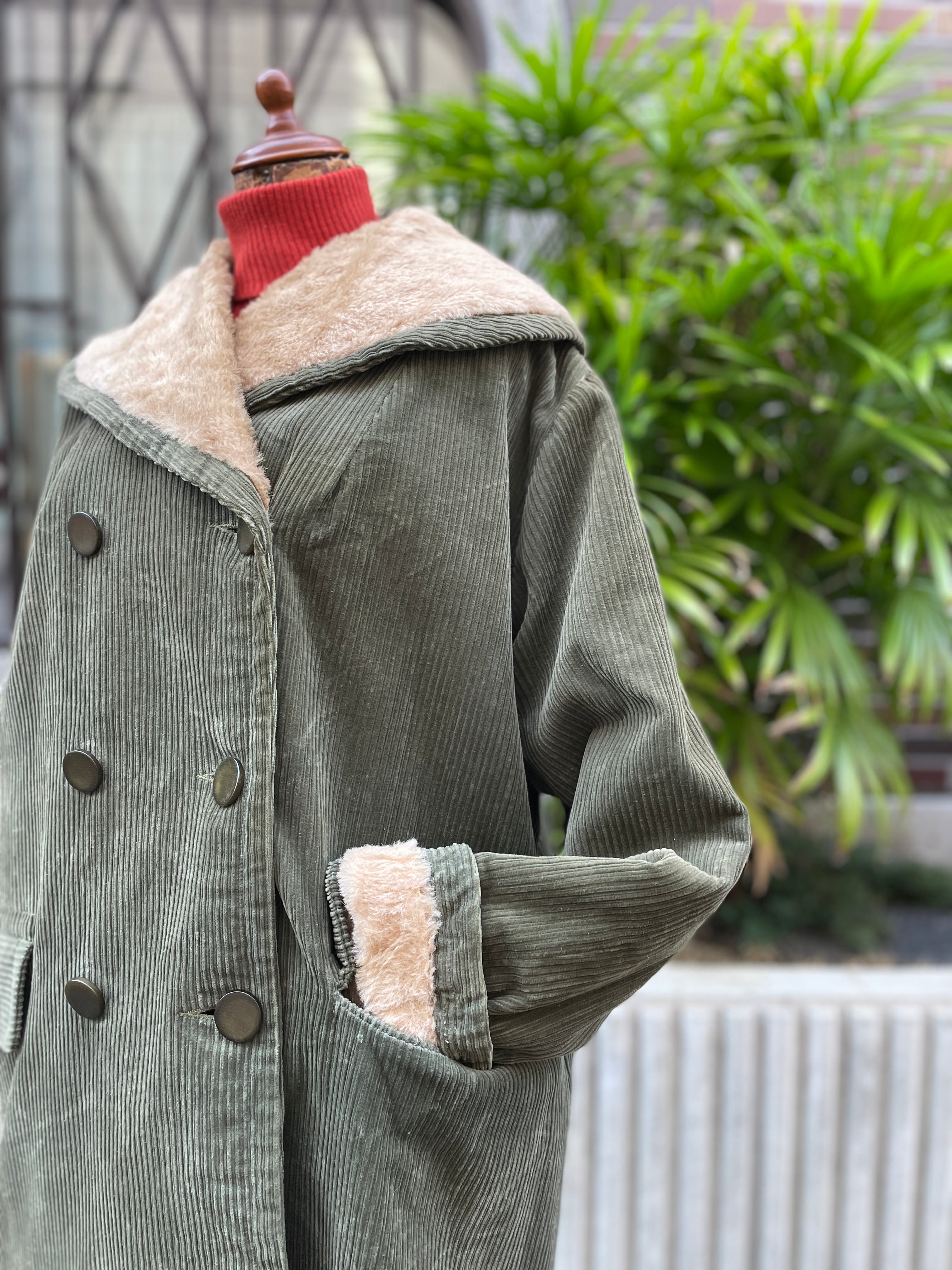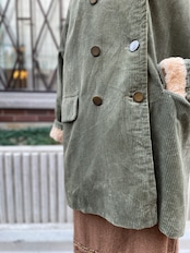 落ち着いたカーキのコーデュロイボディに、大ぶりな襟元やフロントのダブルボタンが素敵なアイテム。