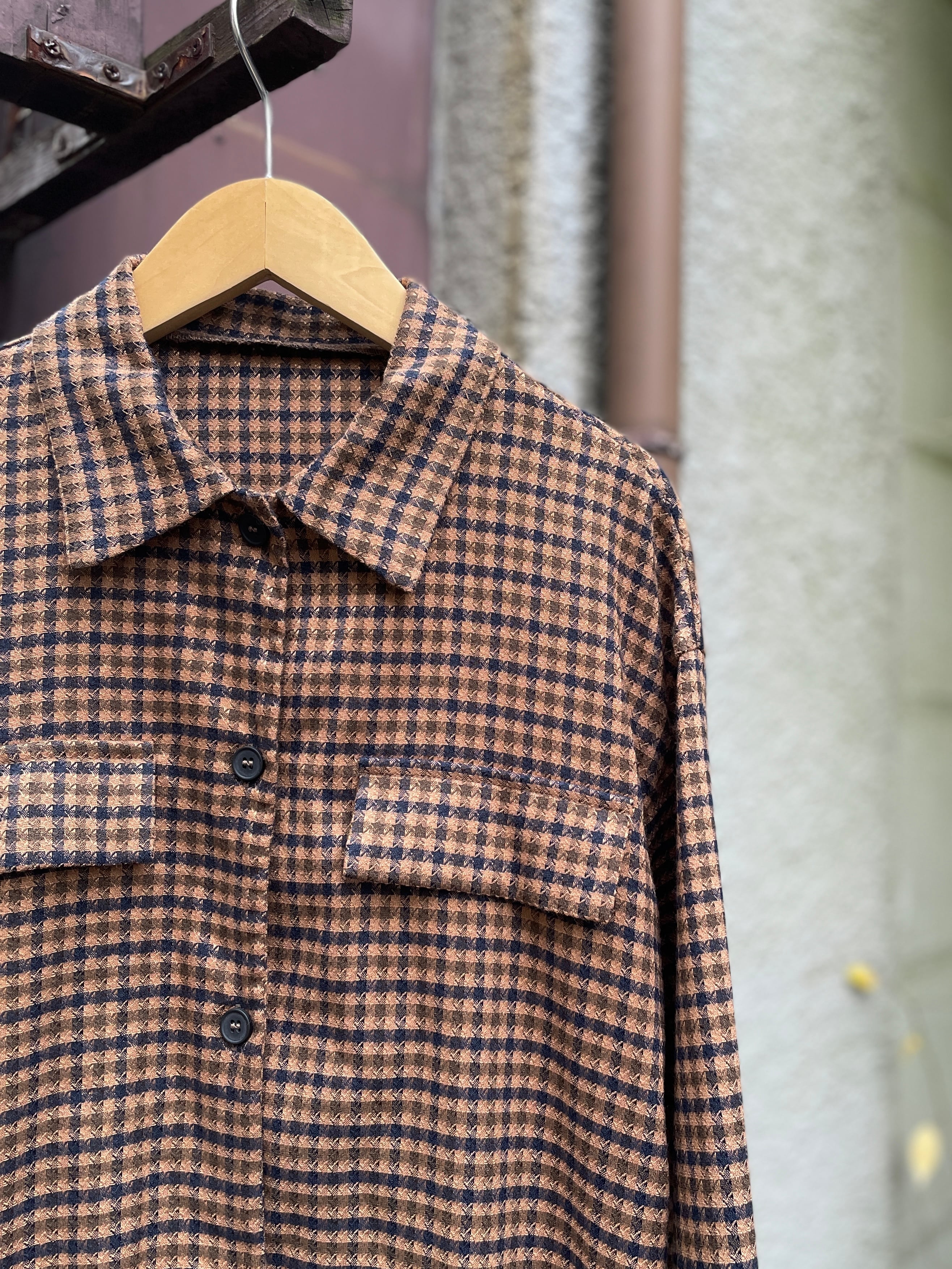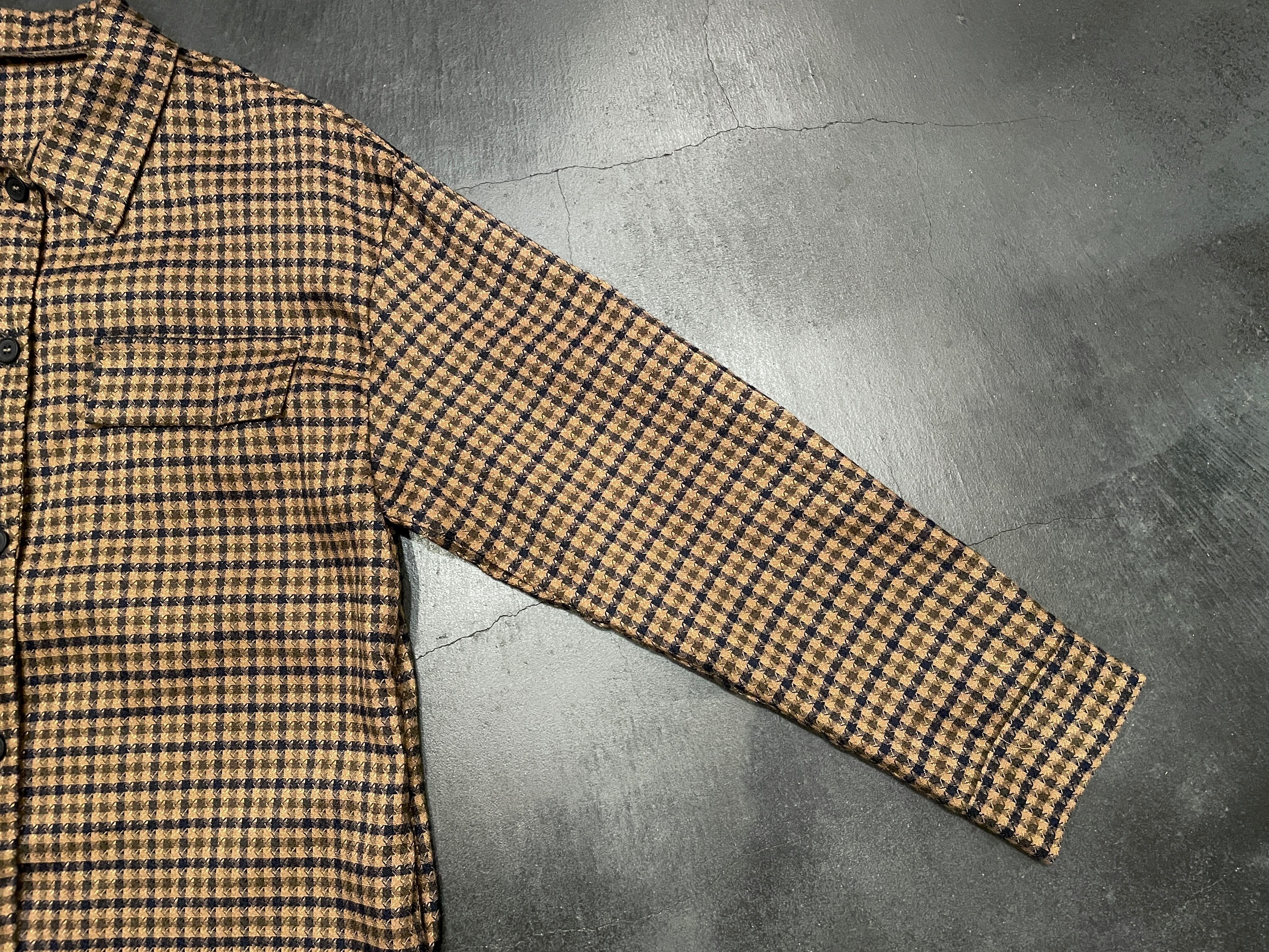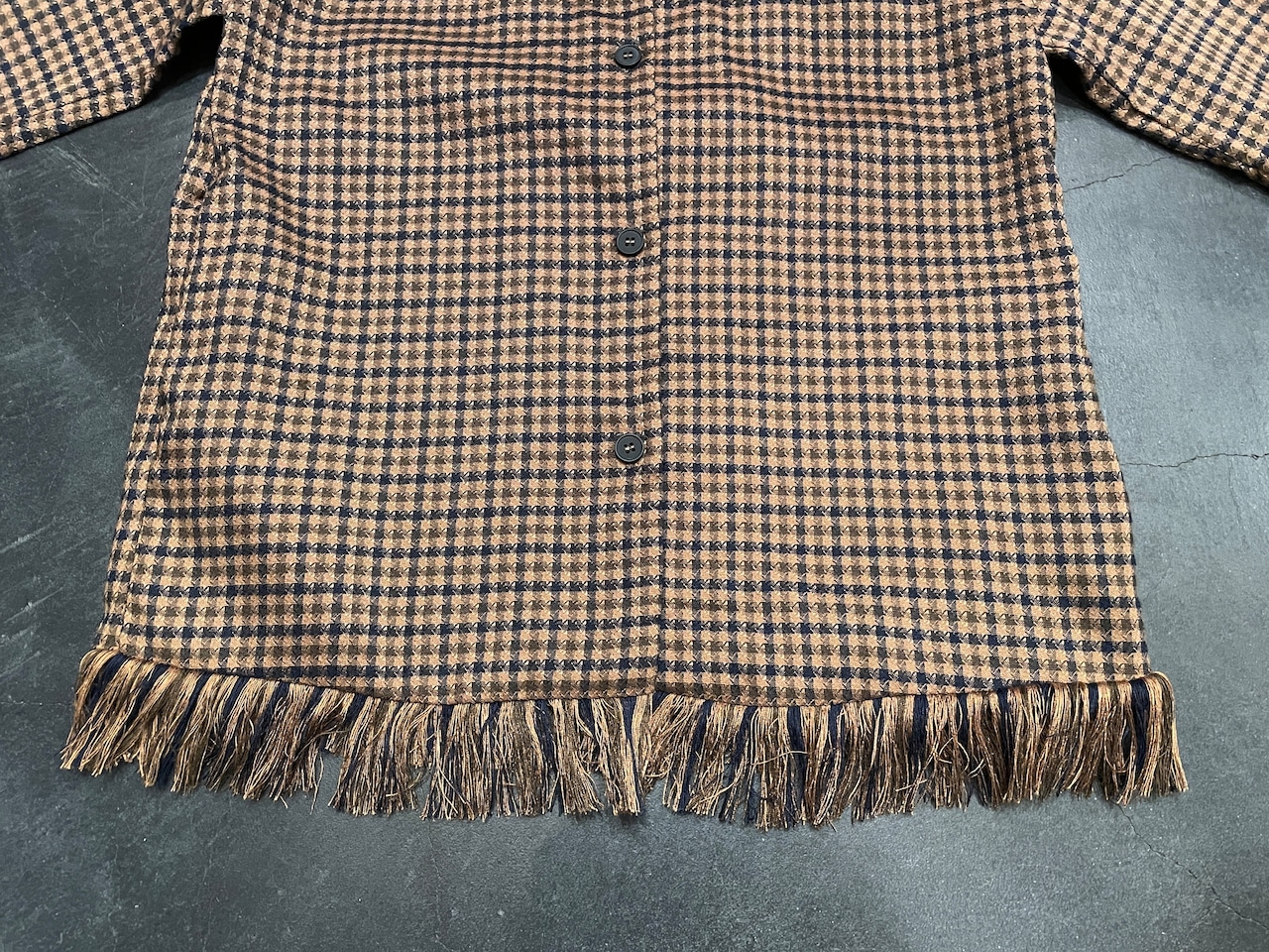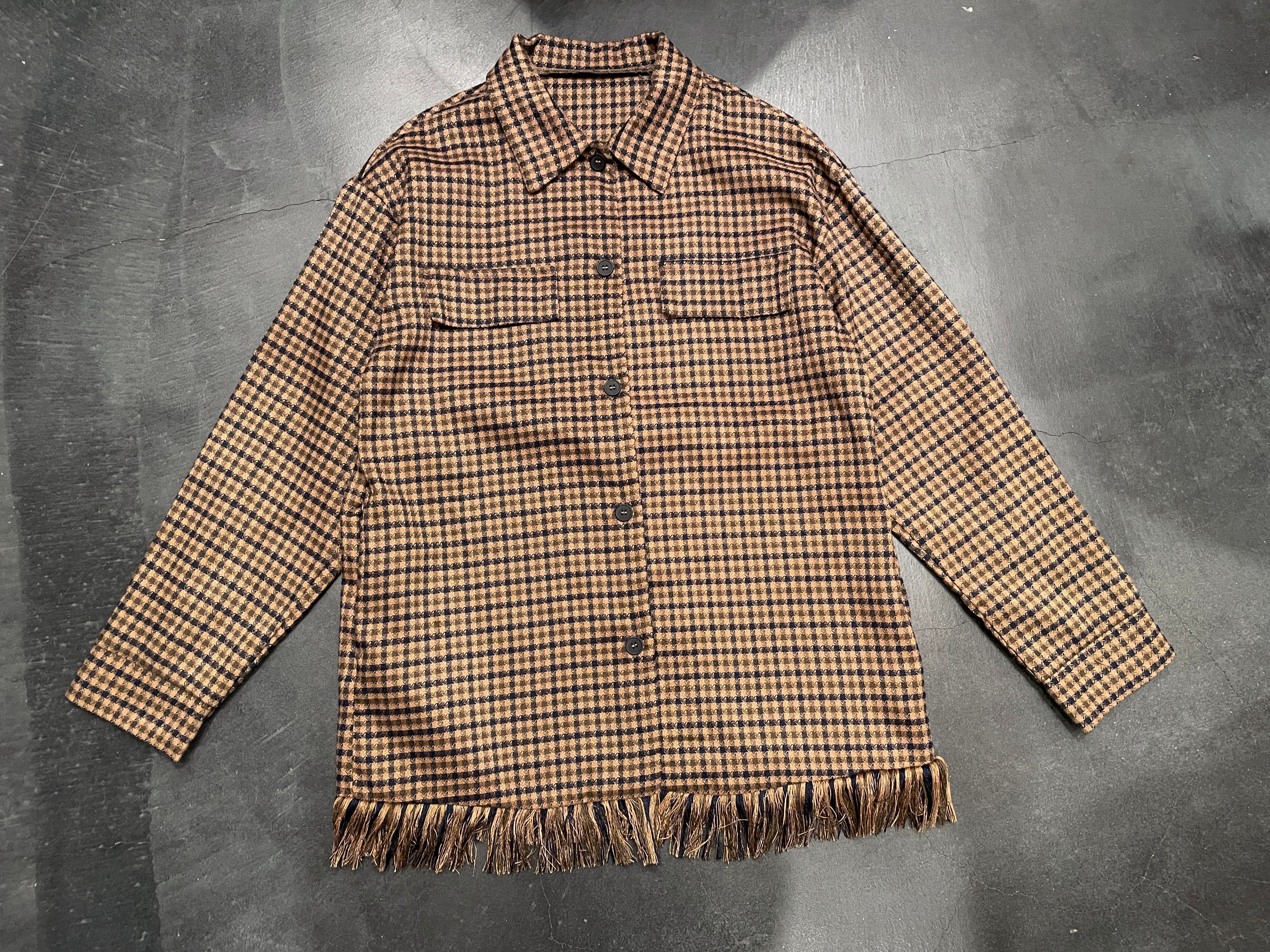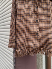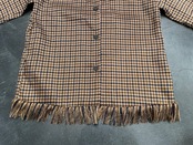 ブラウン×ネイビーの細かいチェックデザインに裾のフリンジが素敵なビンテージシャツ。