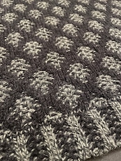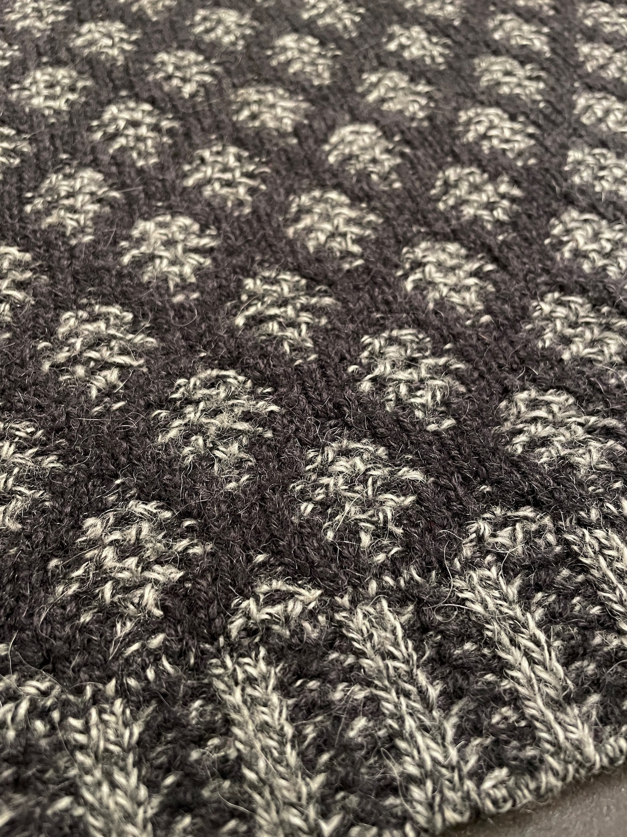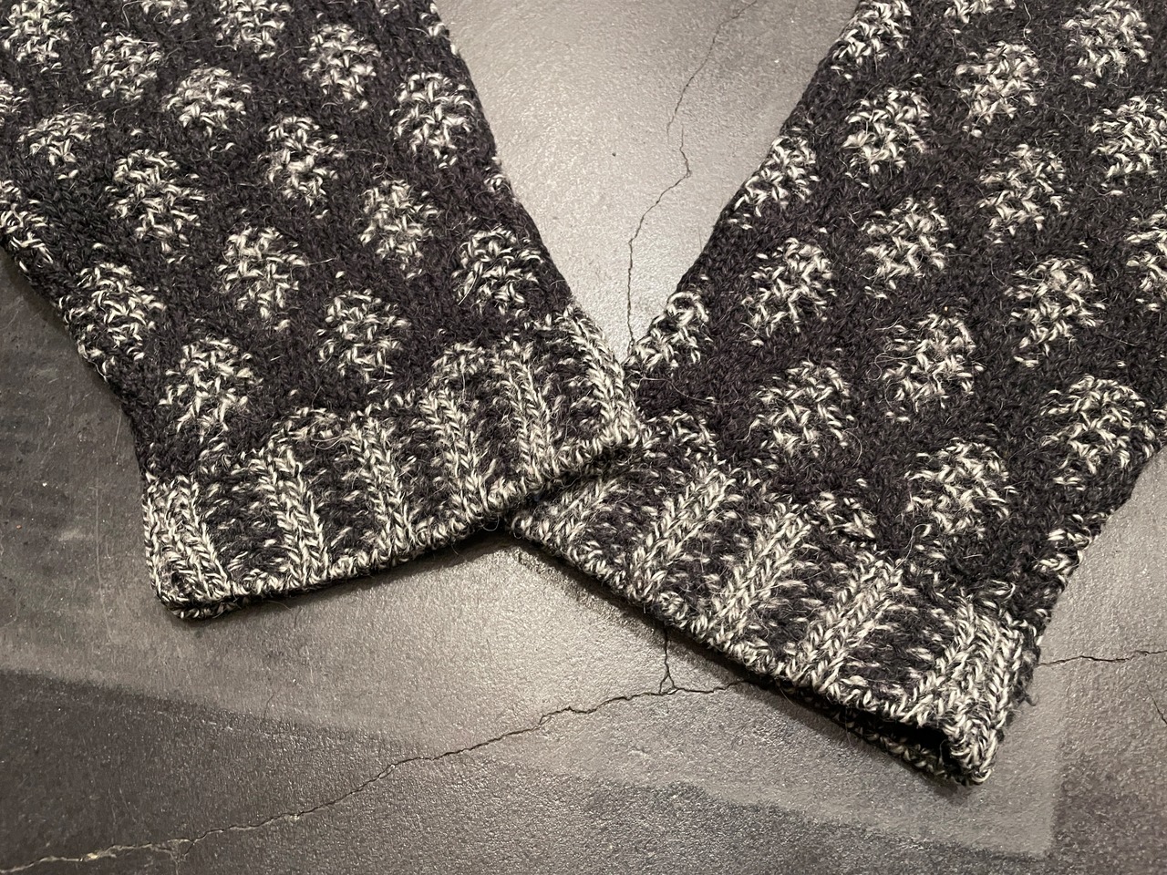 グレー×チャコールグレーのミックスに、編み柄で表現されたひし形シルエットデザインが素敵なアイテム。