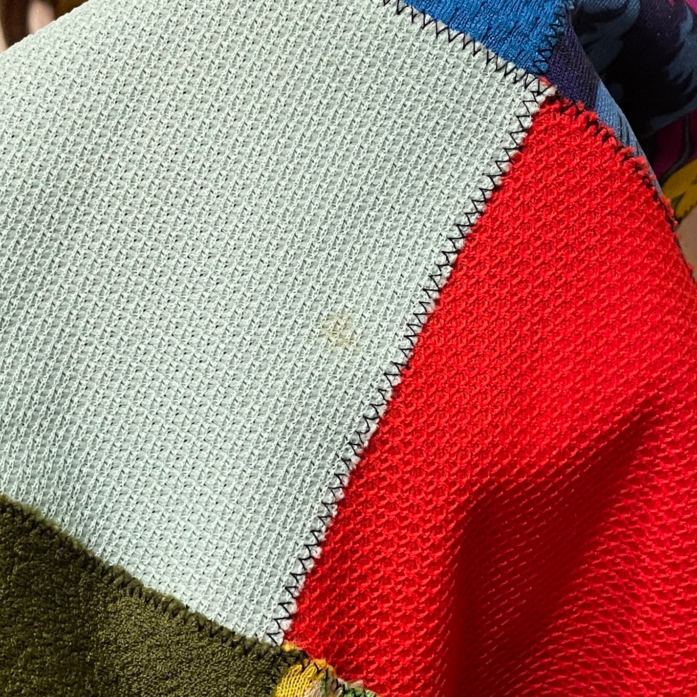 こちらはサイケデリックな目を惹く柄や、チェックや無地などそれぞれバランスよく配置されており、よくみると無地の部分も織りで模様が施されていたりとクオリティーが素晴らしいです◎◎◎