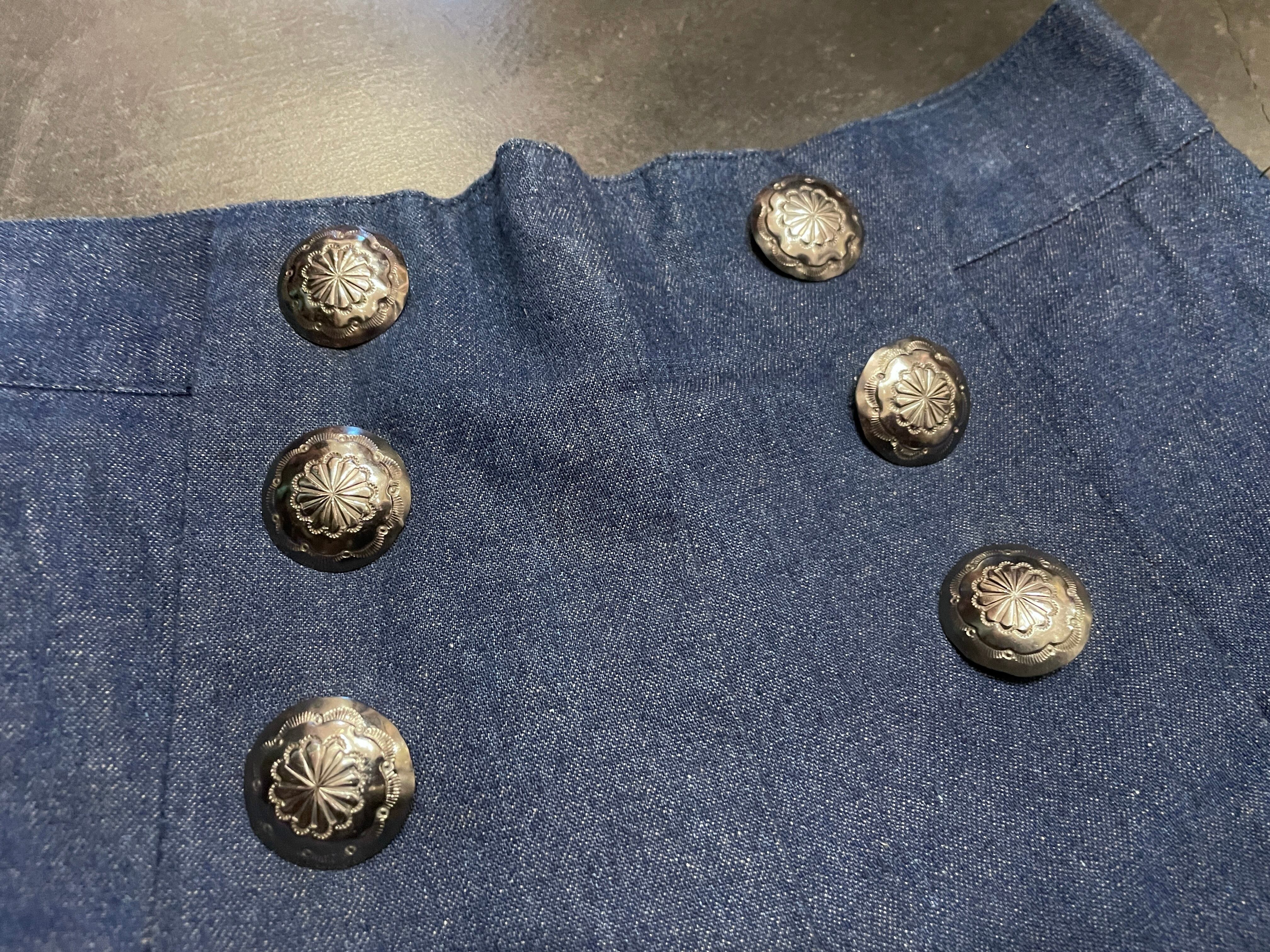 濃紺デニムにフロントにコンチョが施されたアイテム。