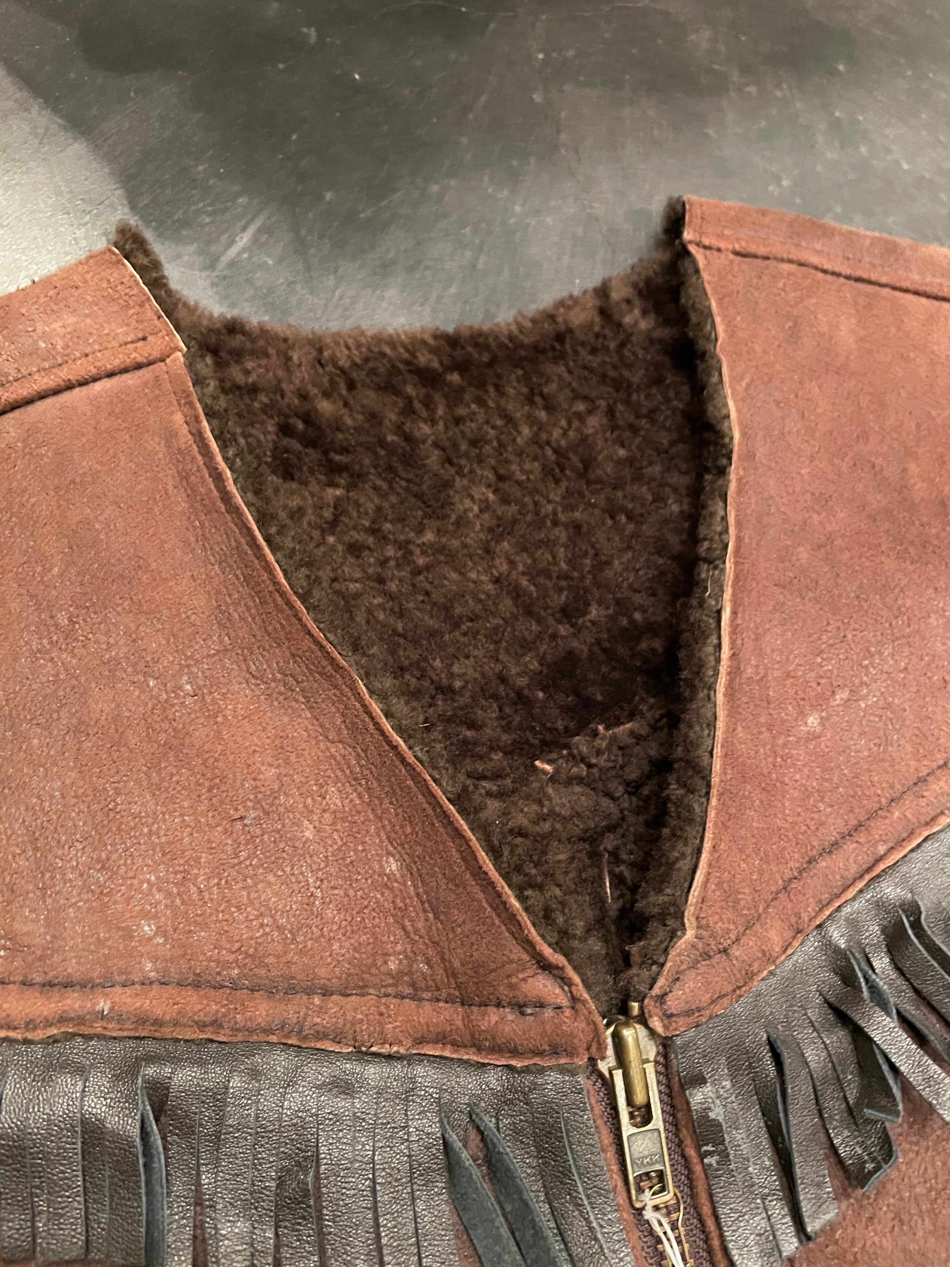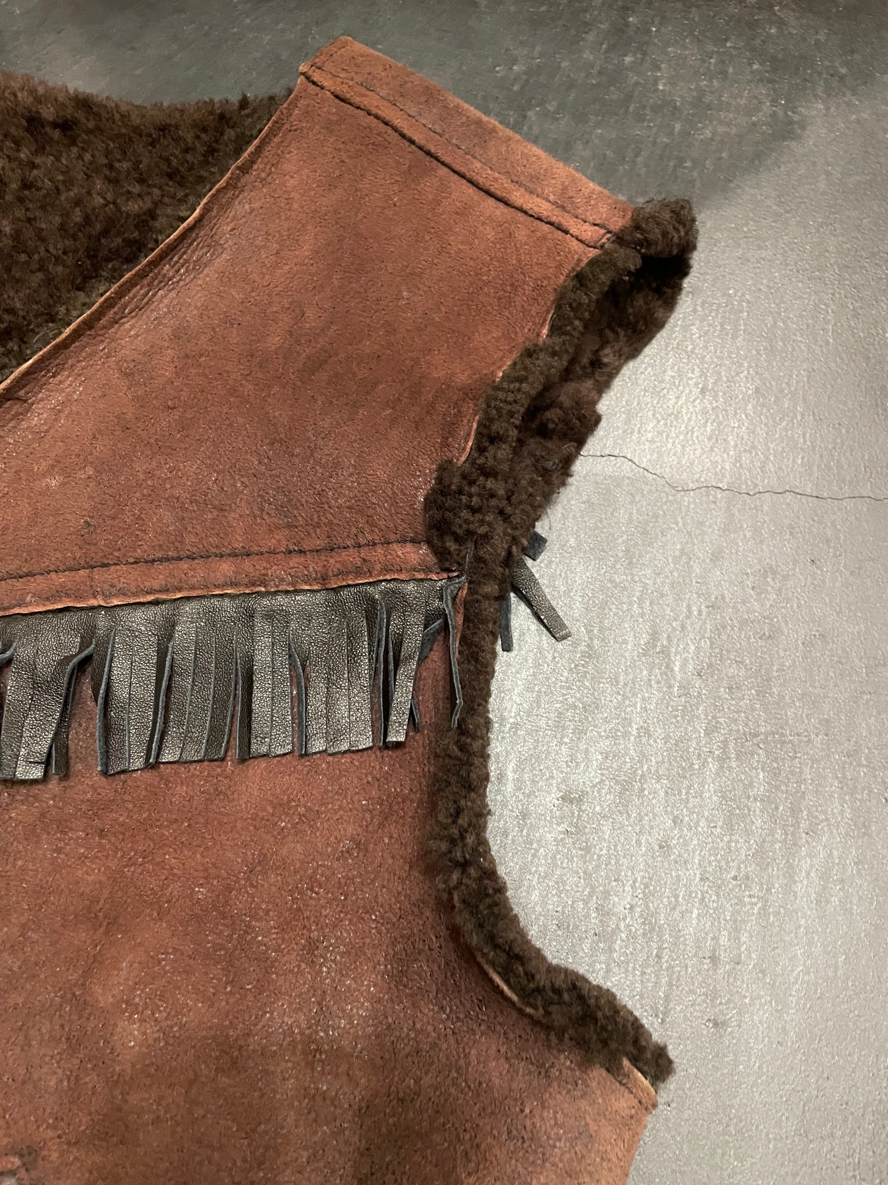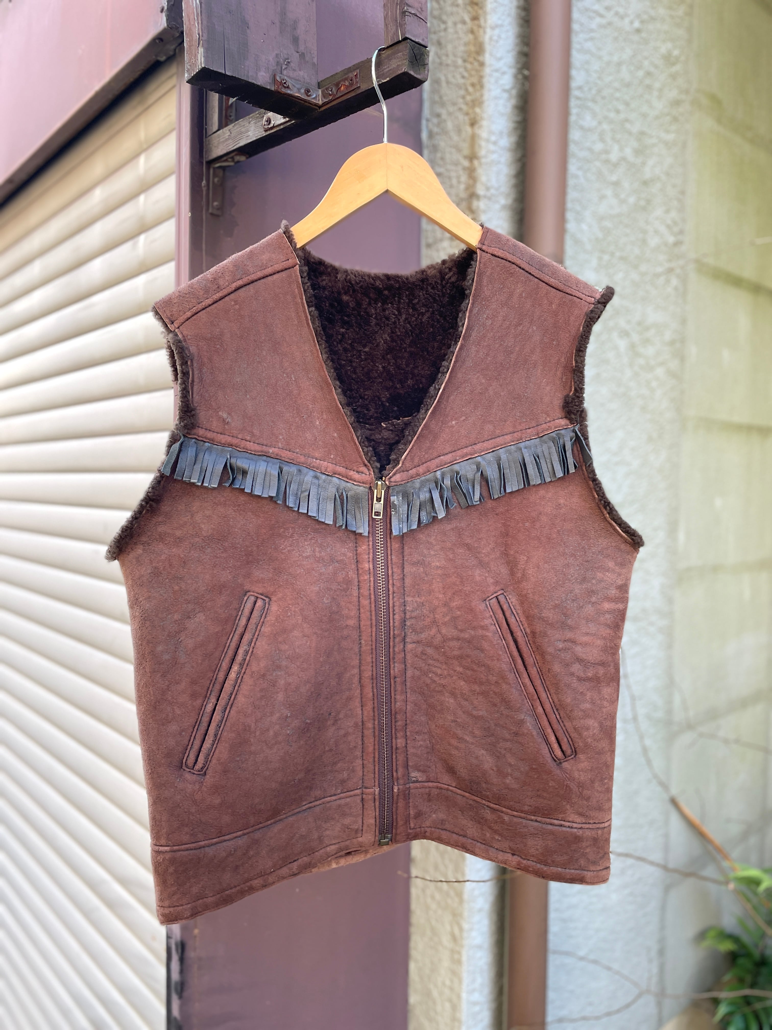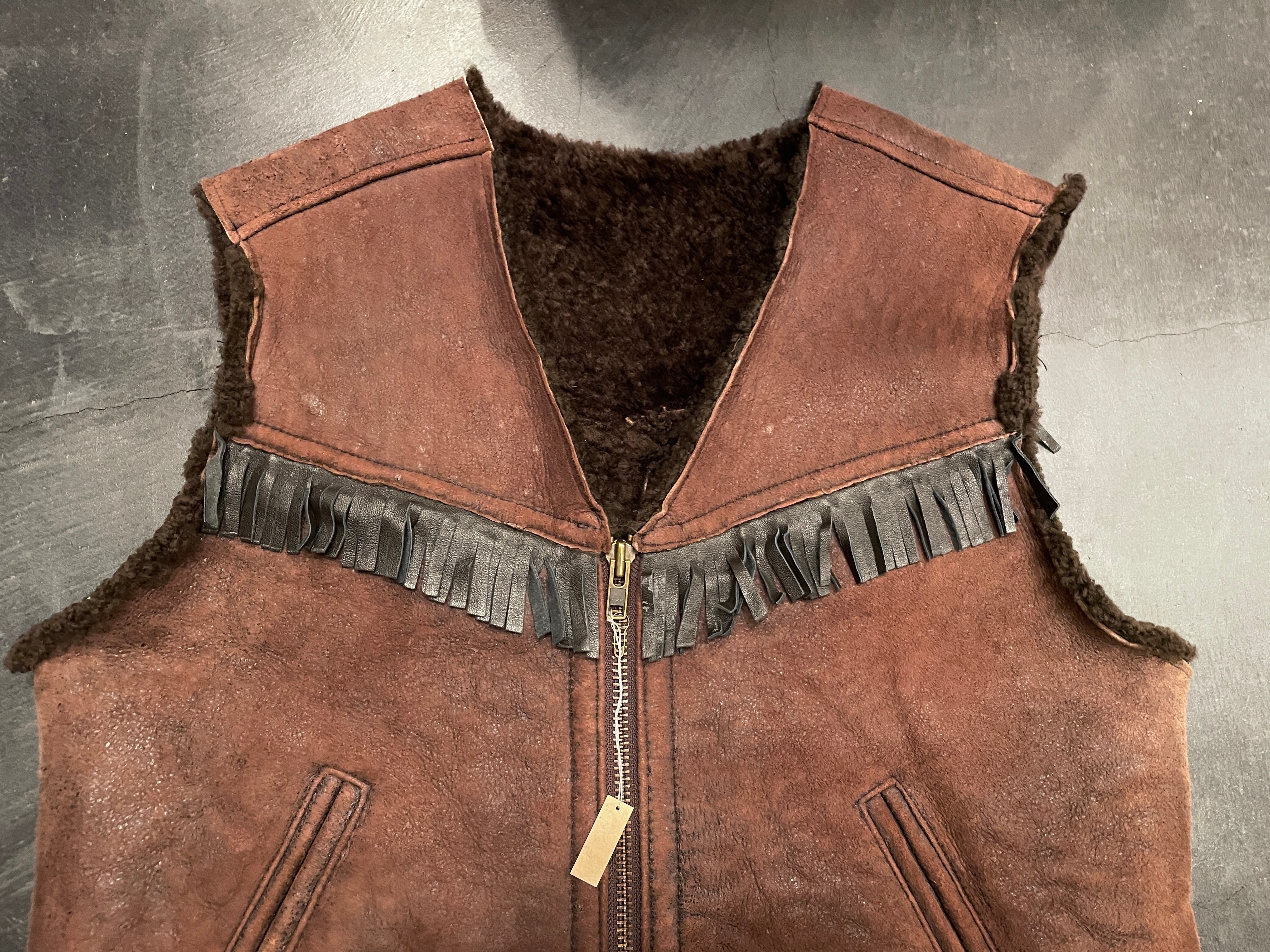 落ち着いたブラウンカラーのムートンに、短いフリンジ装飾が素敵なアイテム。