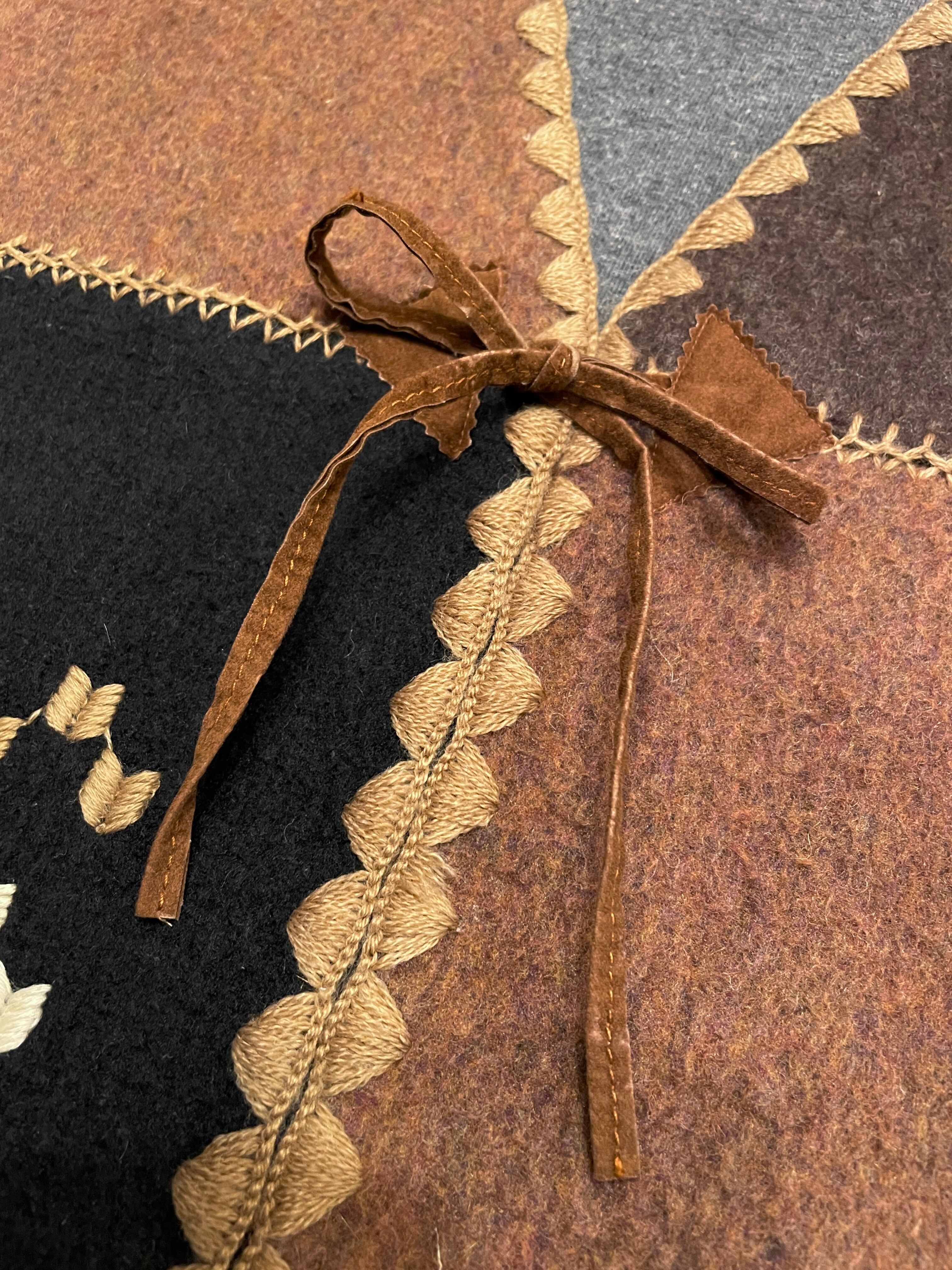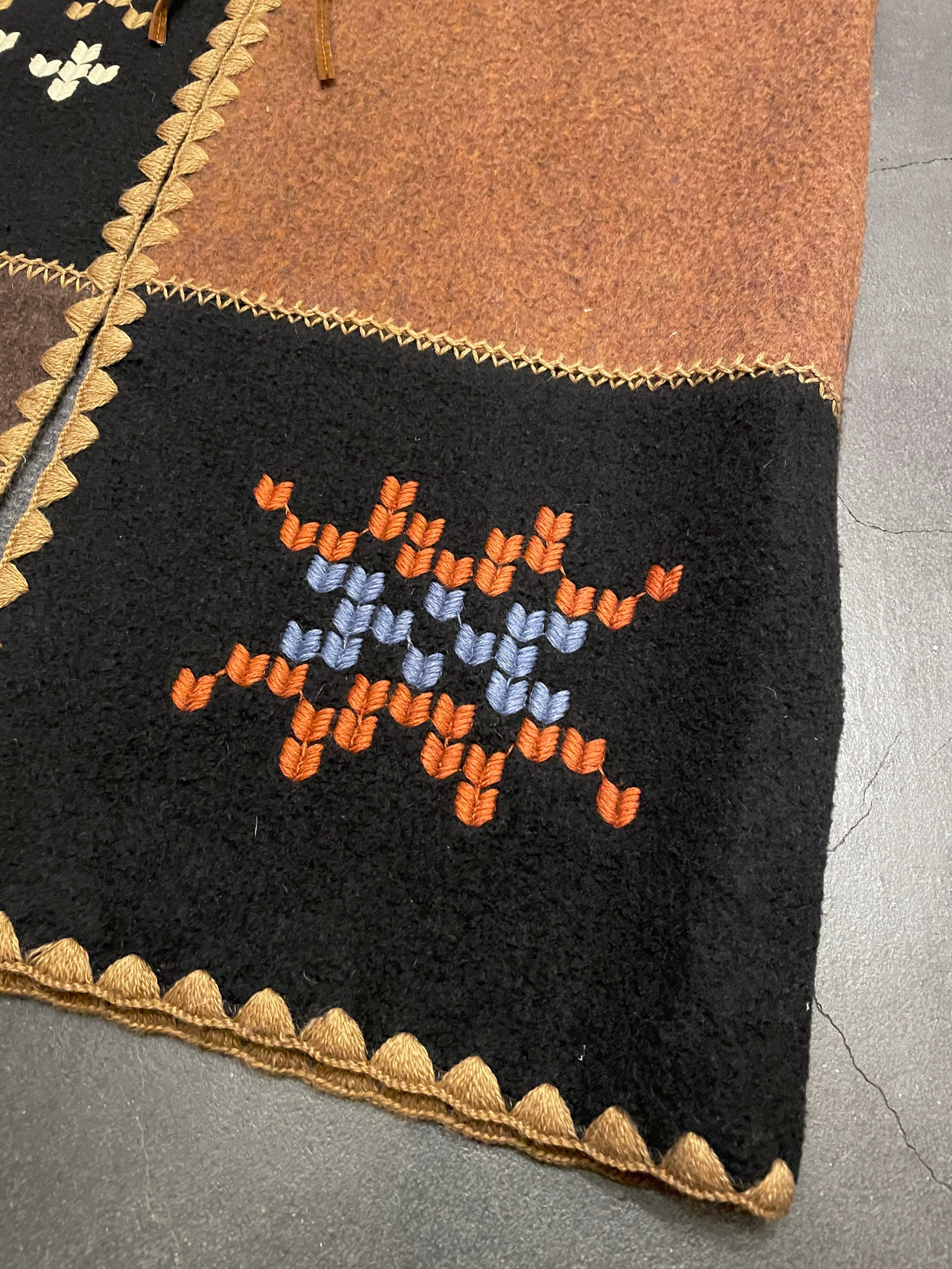 ブラック×ブラウンのパッチワーク切り替えボディにネイティブ調な刺繍が施されたアイテム◎