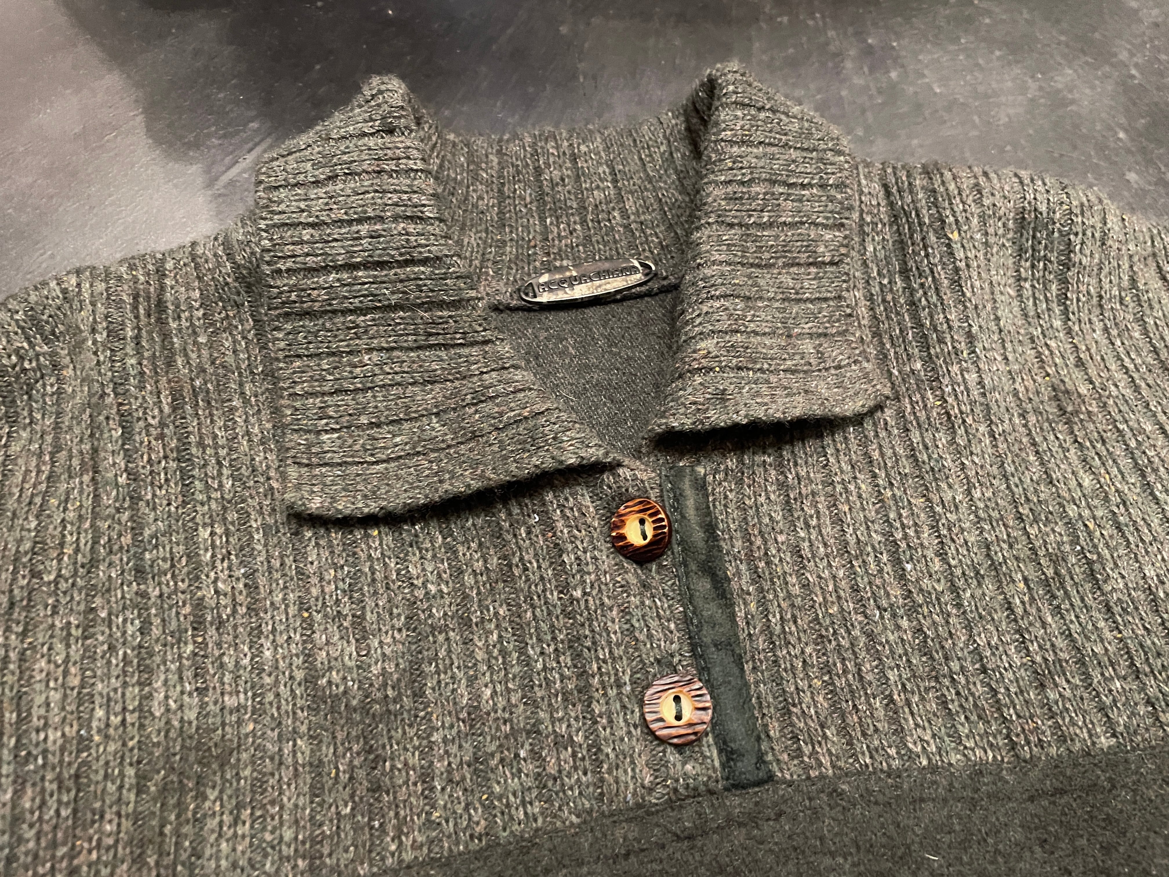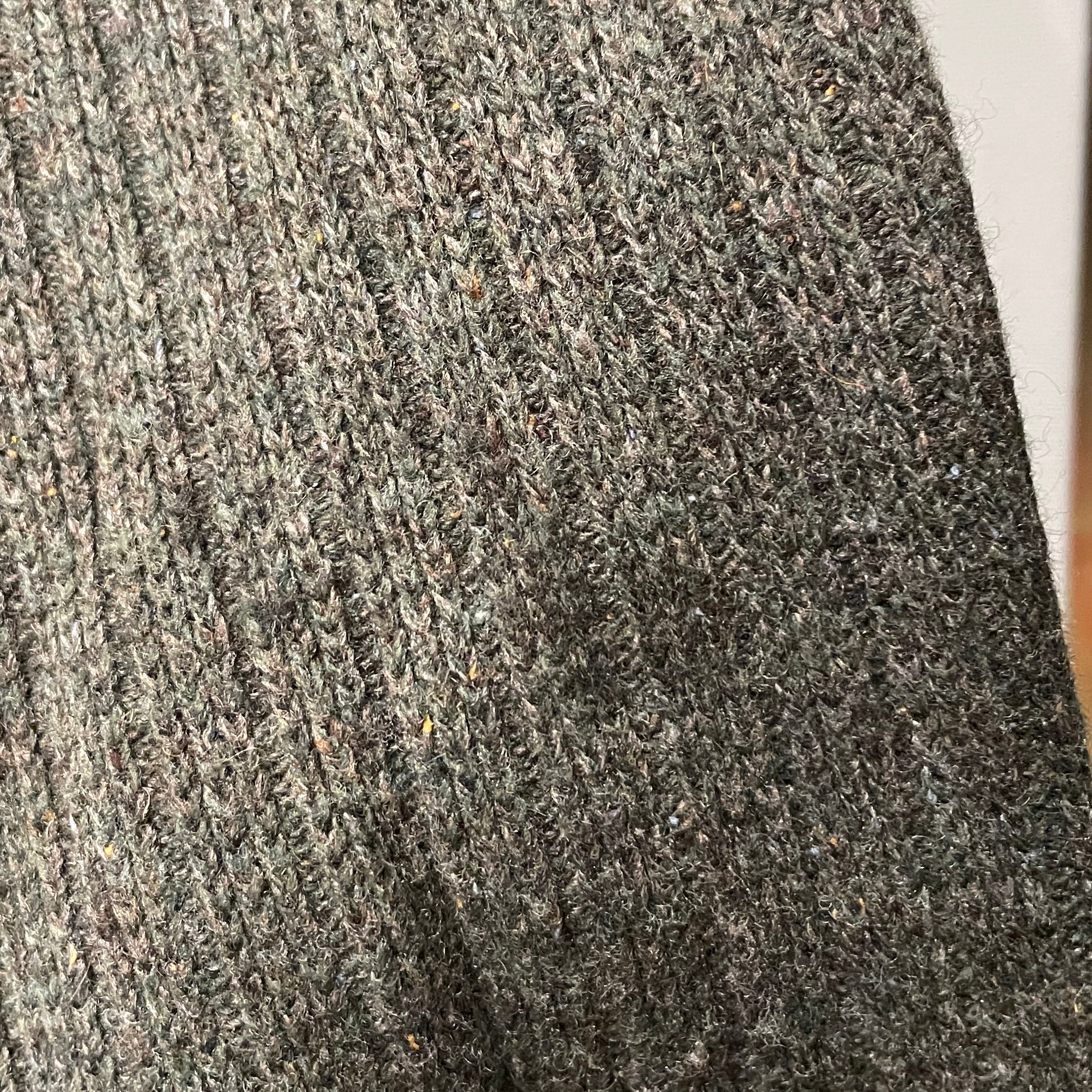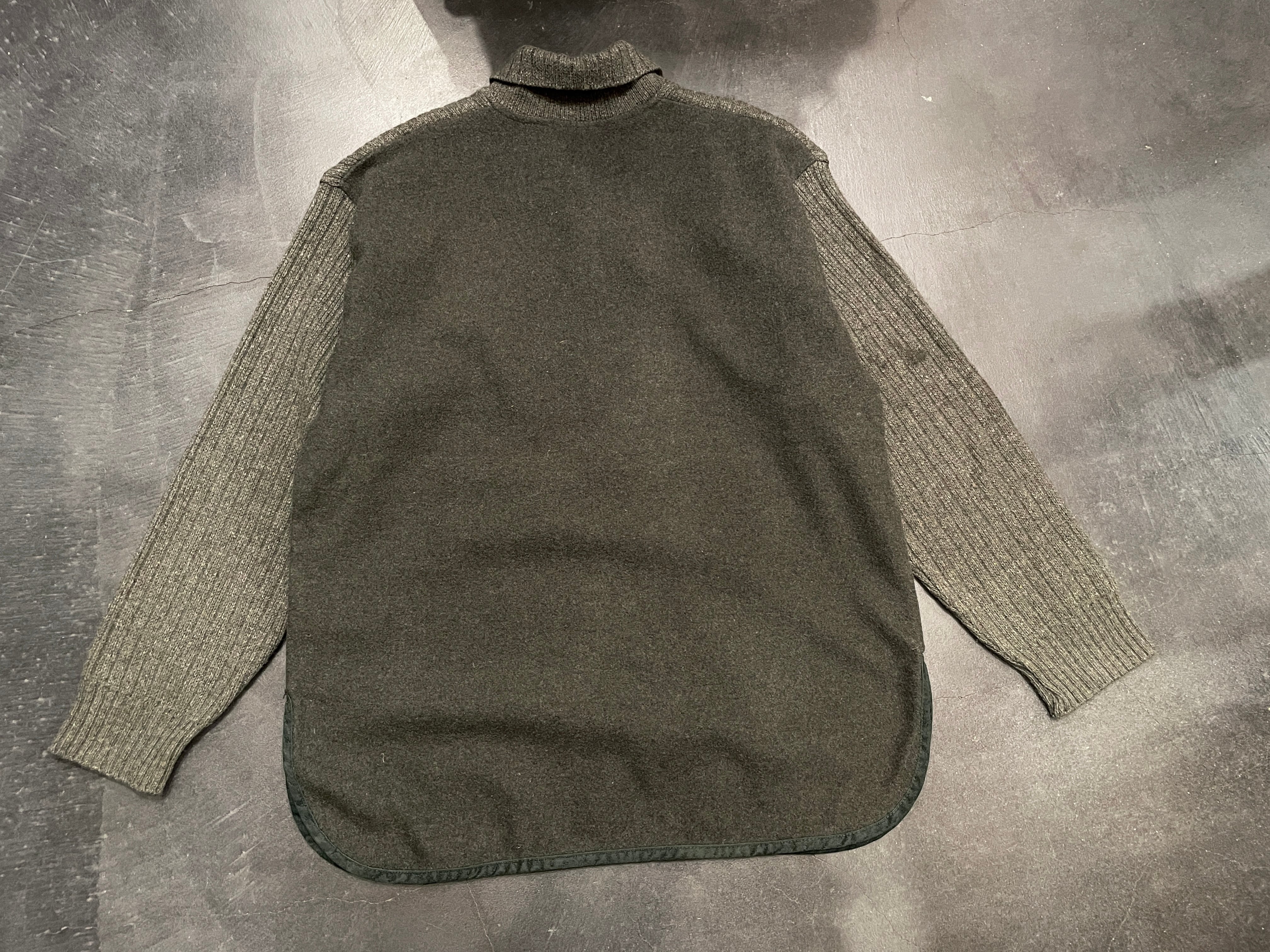 落ち着いたカーキベースのリブニットとチャコールグレーのウールがミックスされたデザインが素敵なアイテム。