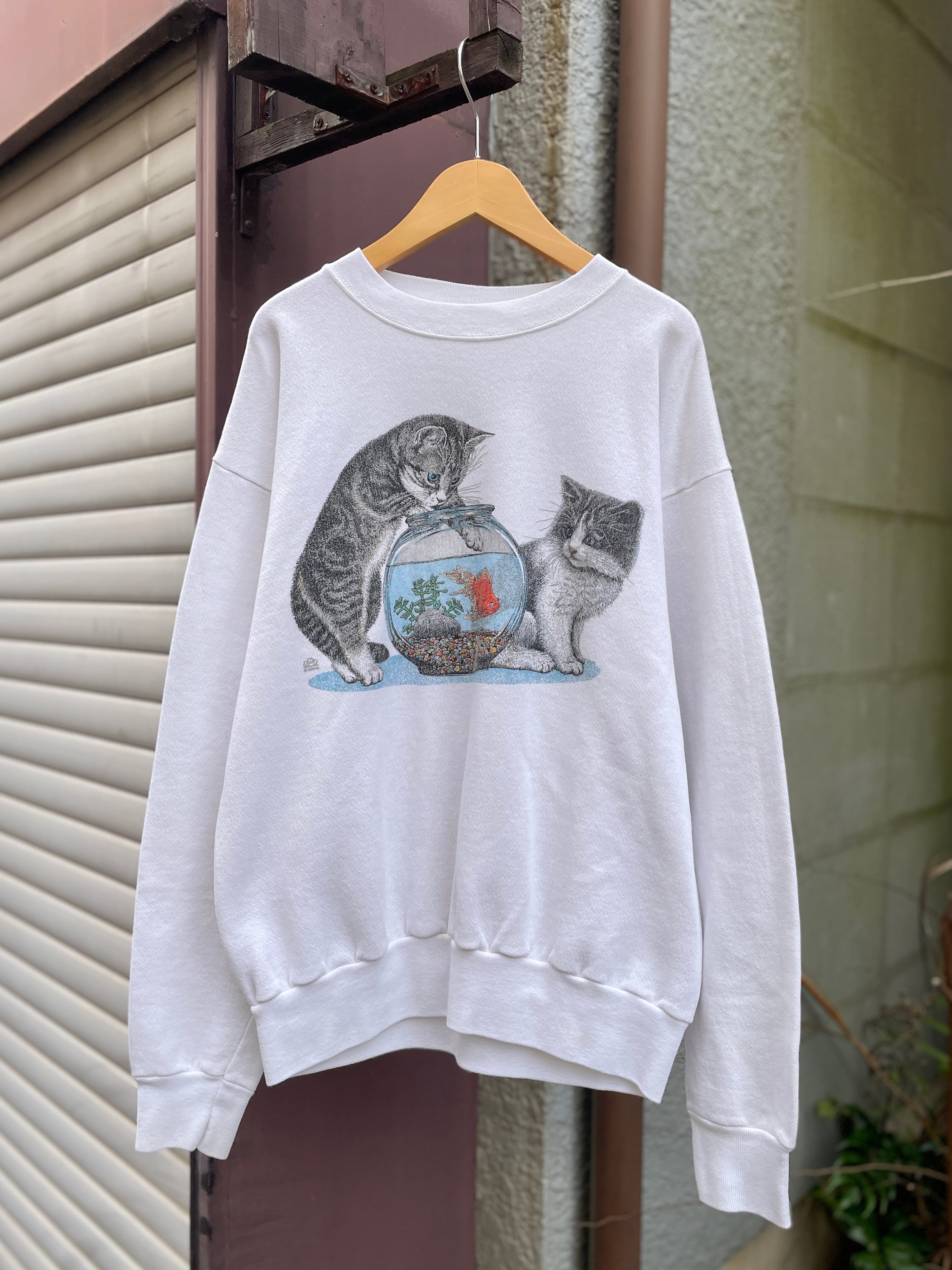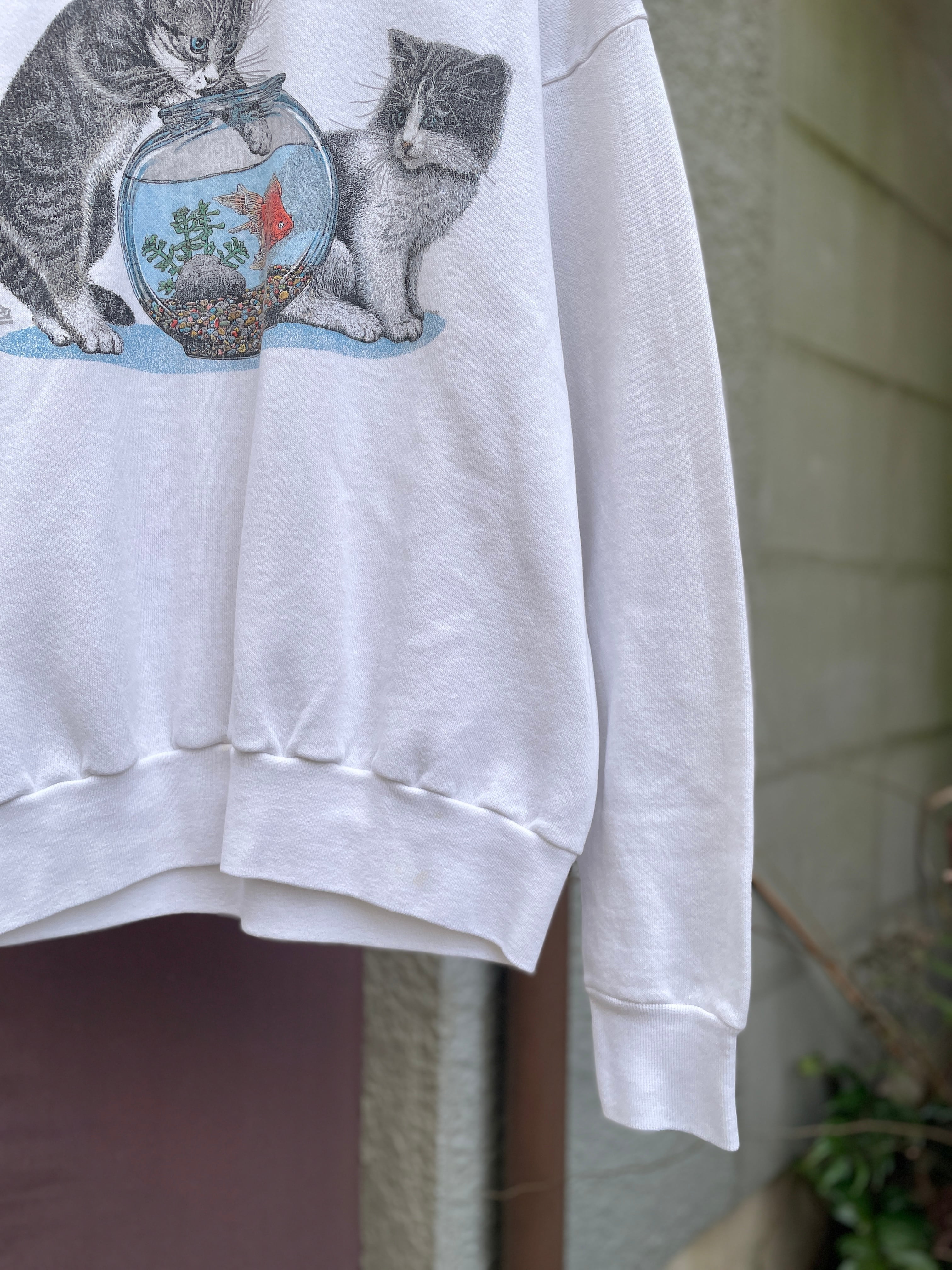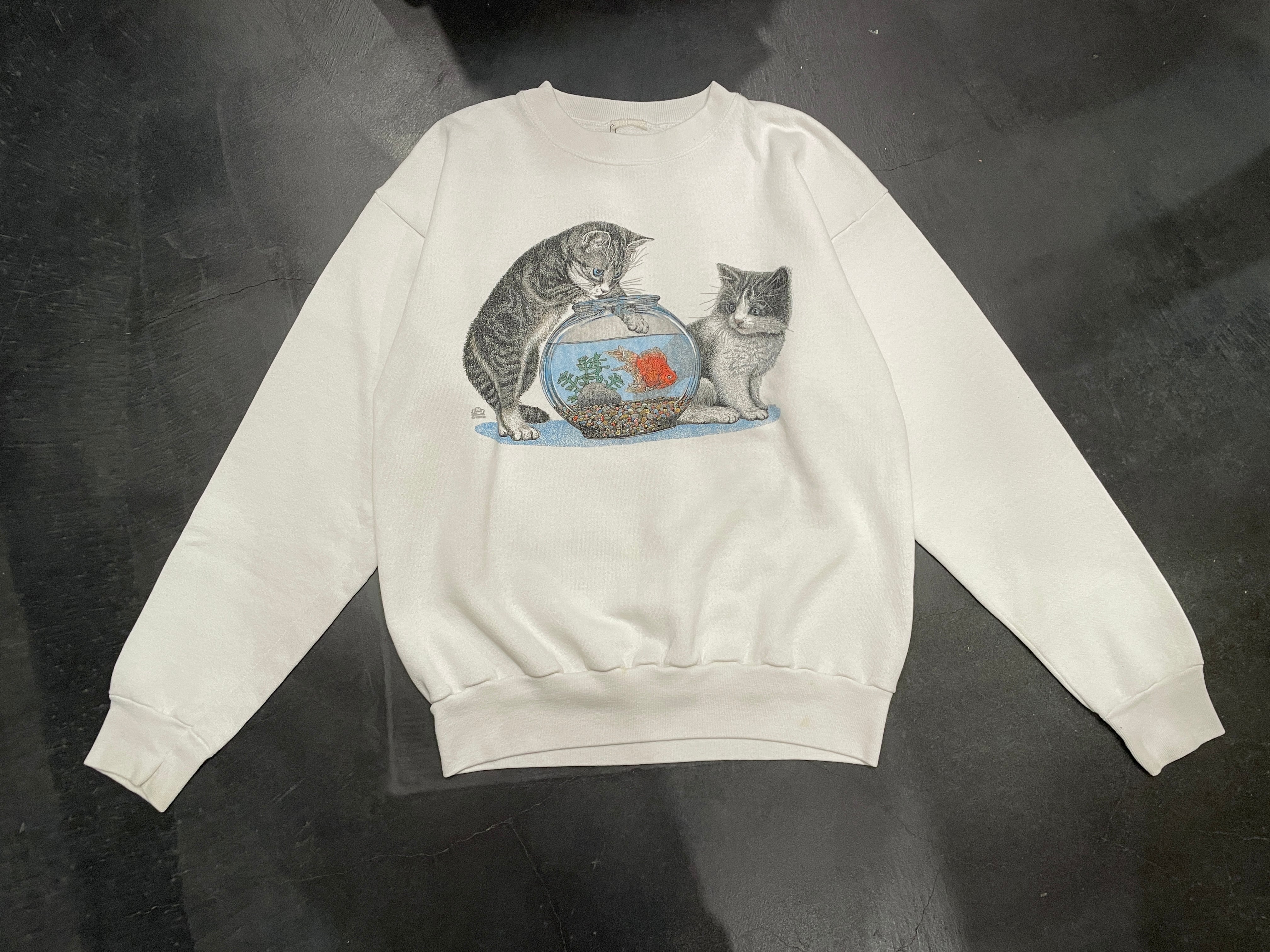 ホワイトボディに金魚鉢とネコちゃんのプリントが可愛らしいアイテム。
