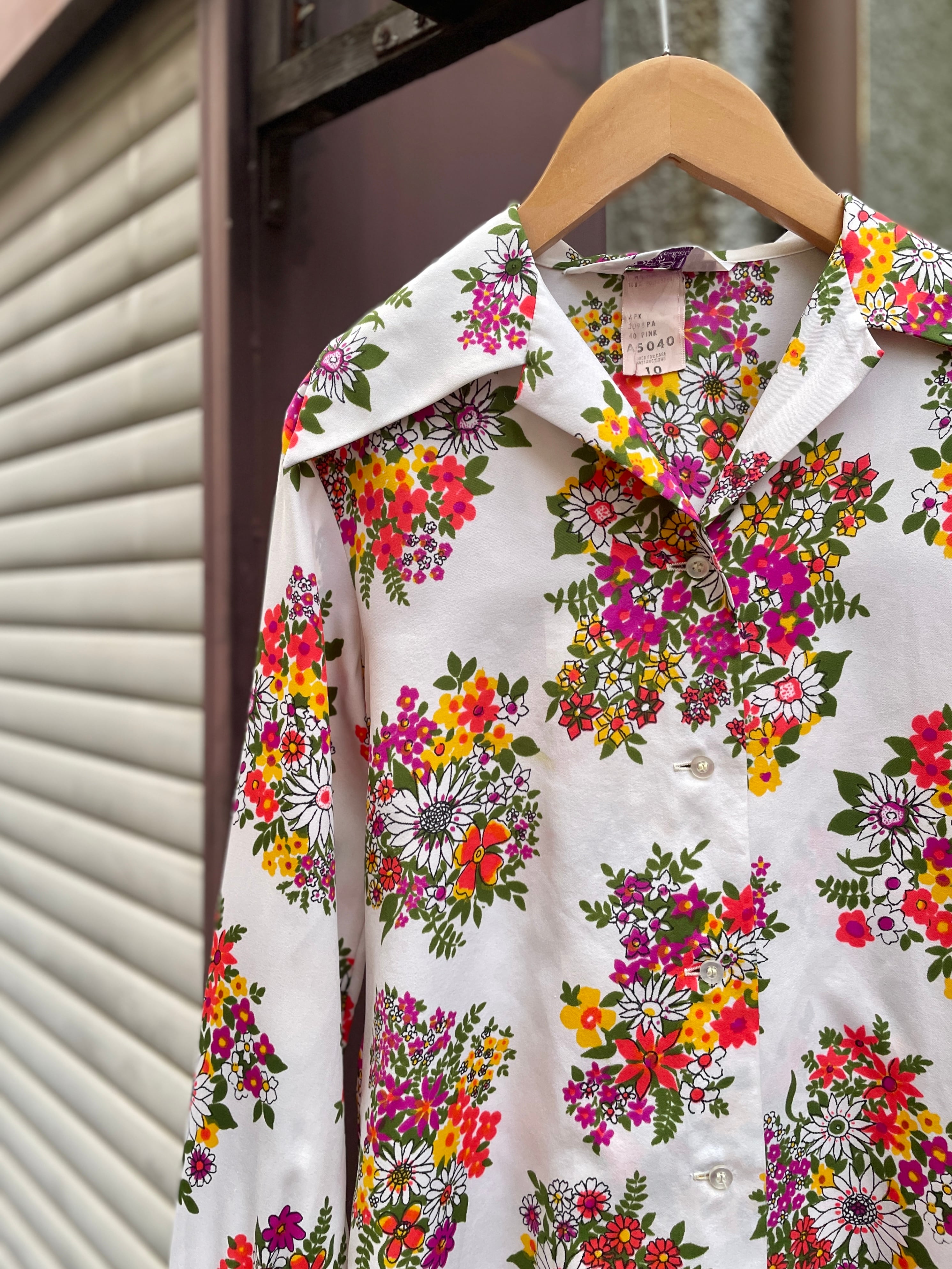 こちらはブーケのようなまとまった花柄プリント素敵で、この時代らしい大ぶりな開襟も特徴的。