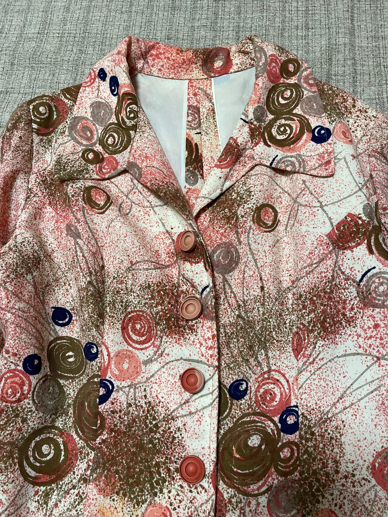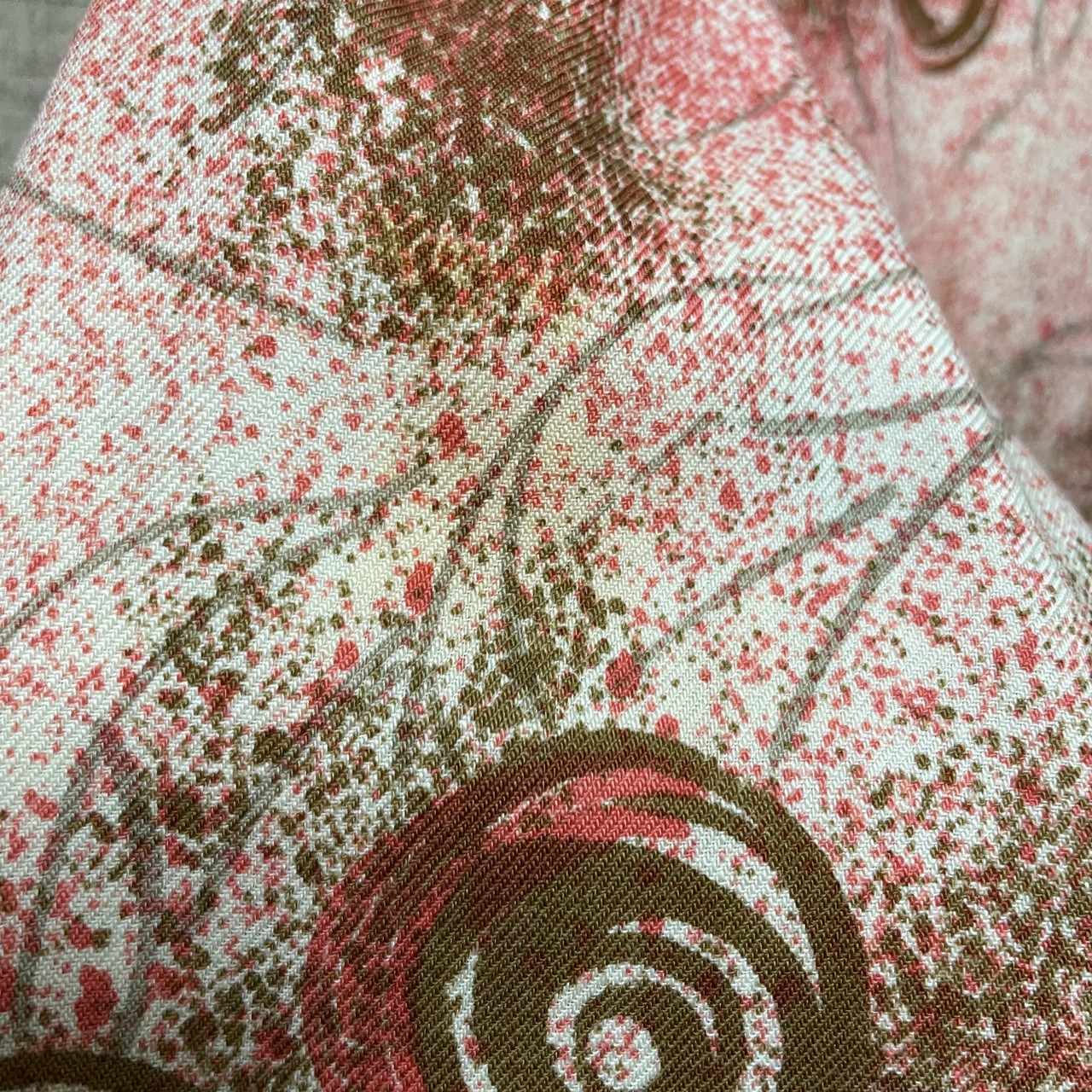 淡いピンクを基調に、いろんなグルグルと飛ばしたような斑点模様や曲線がとてもおしゃれ。