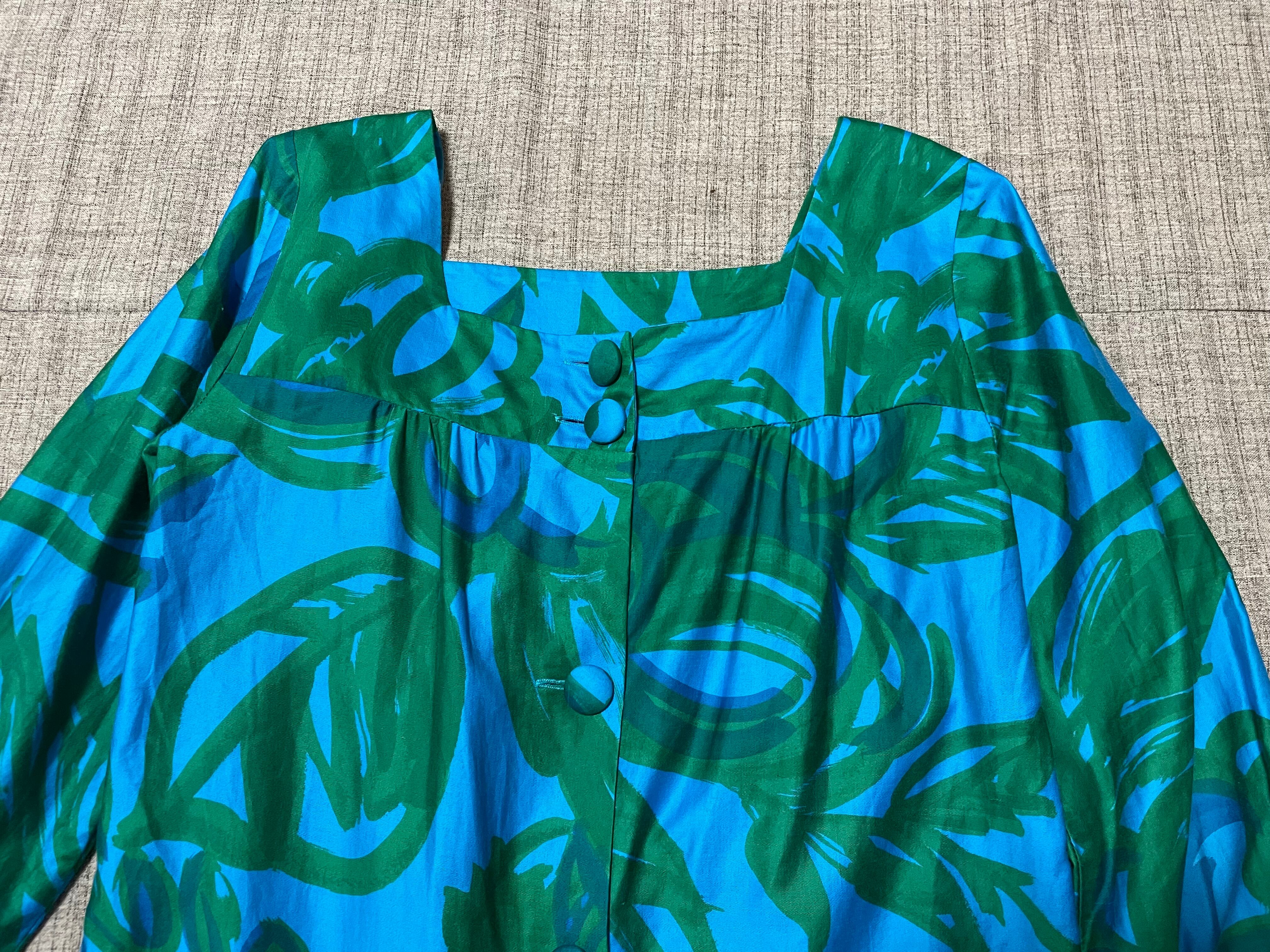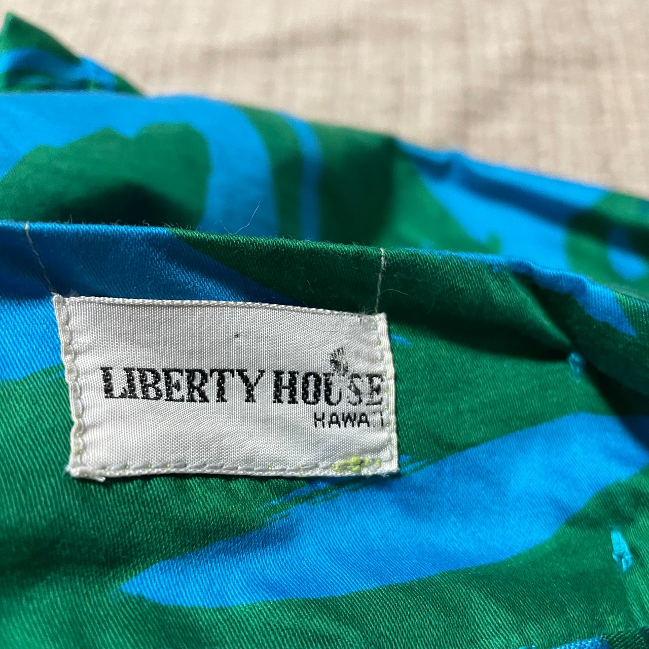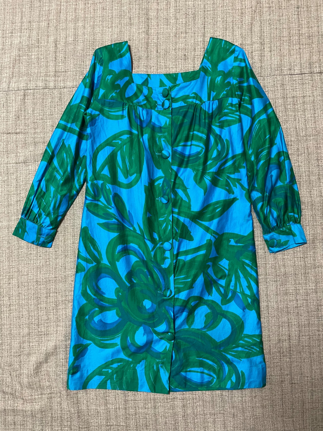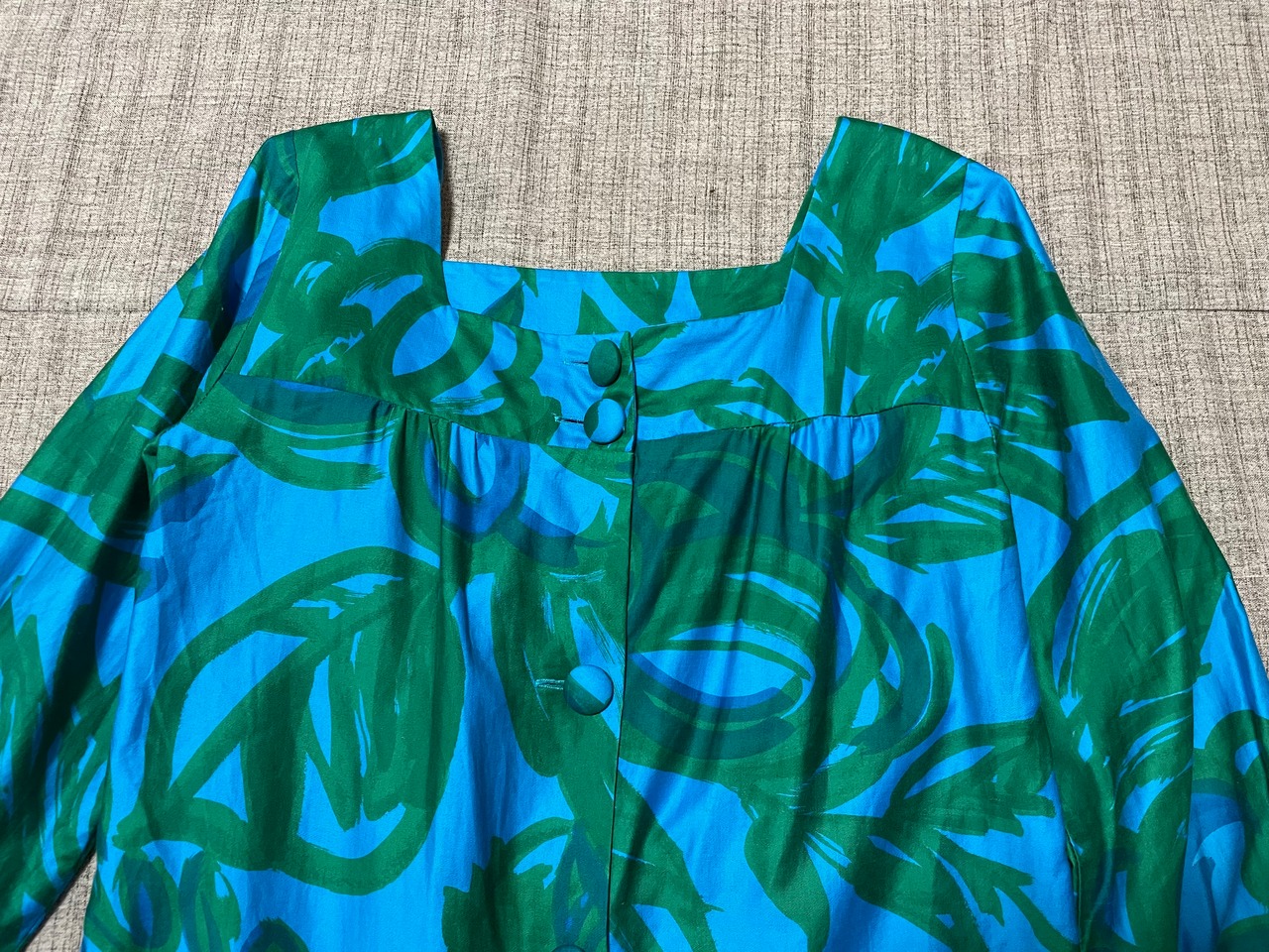 綺麗なブルーボディに、筆書きしたような大柄なリーフデザインが可愛い60sビンテージハワイアンドレス。
