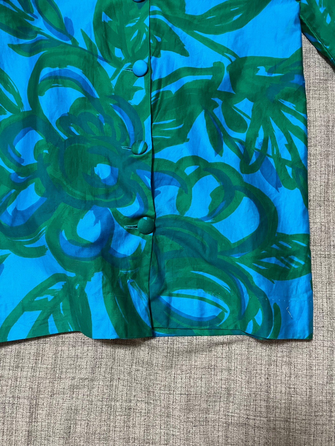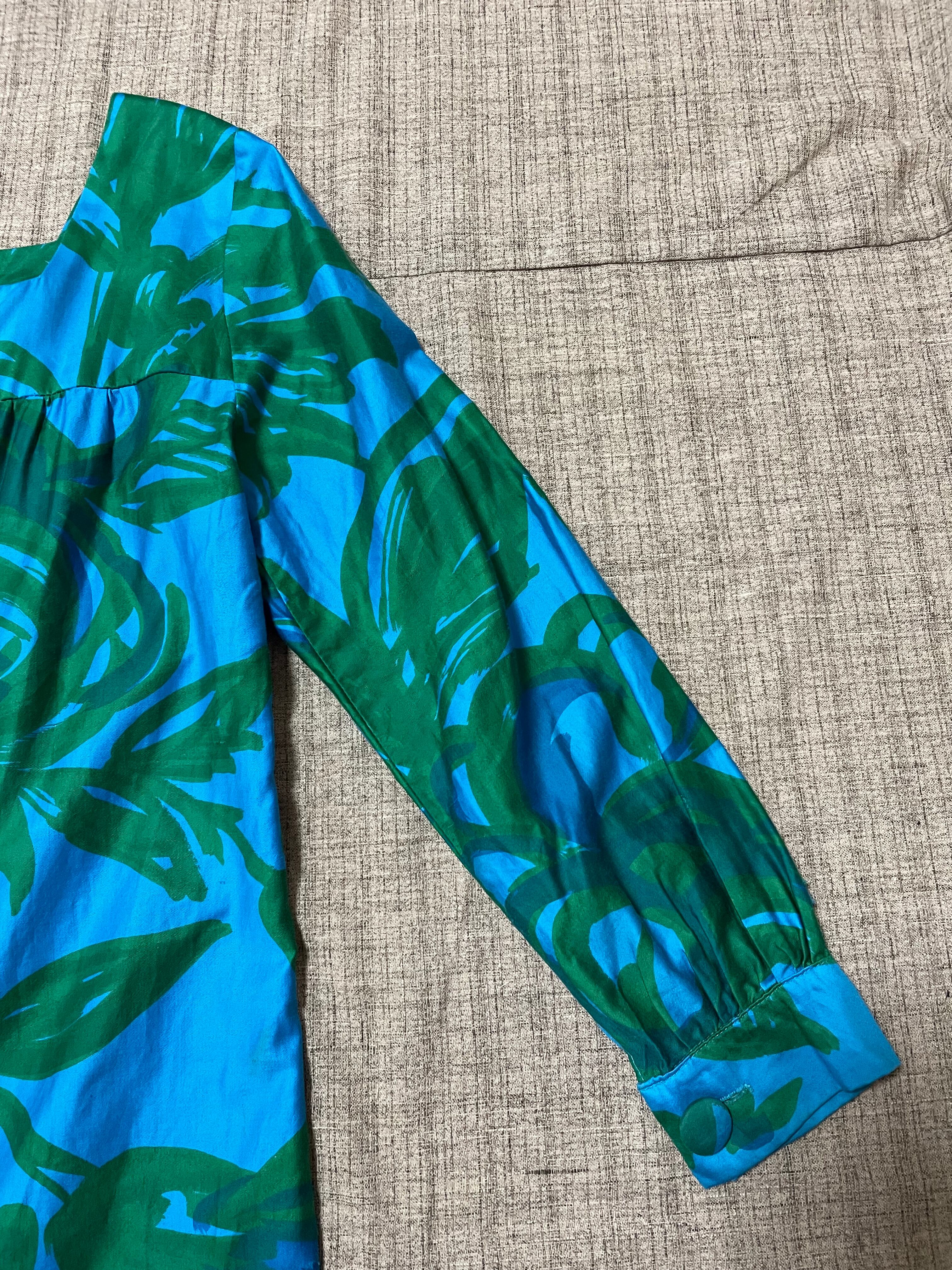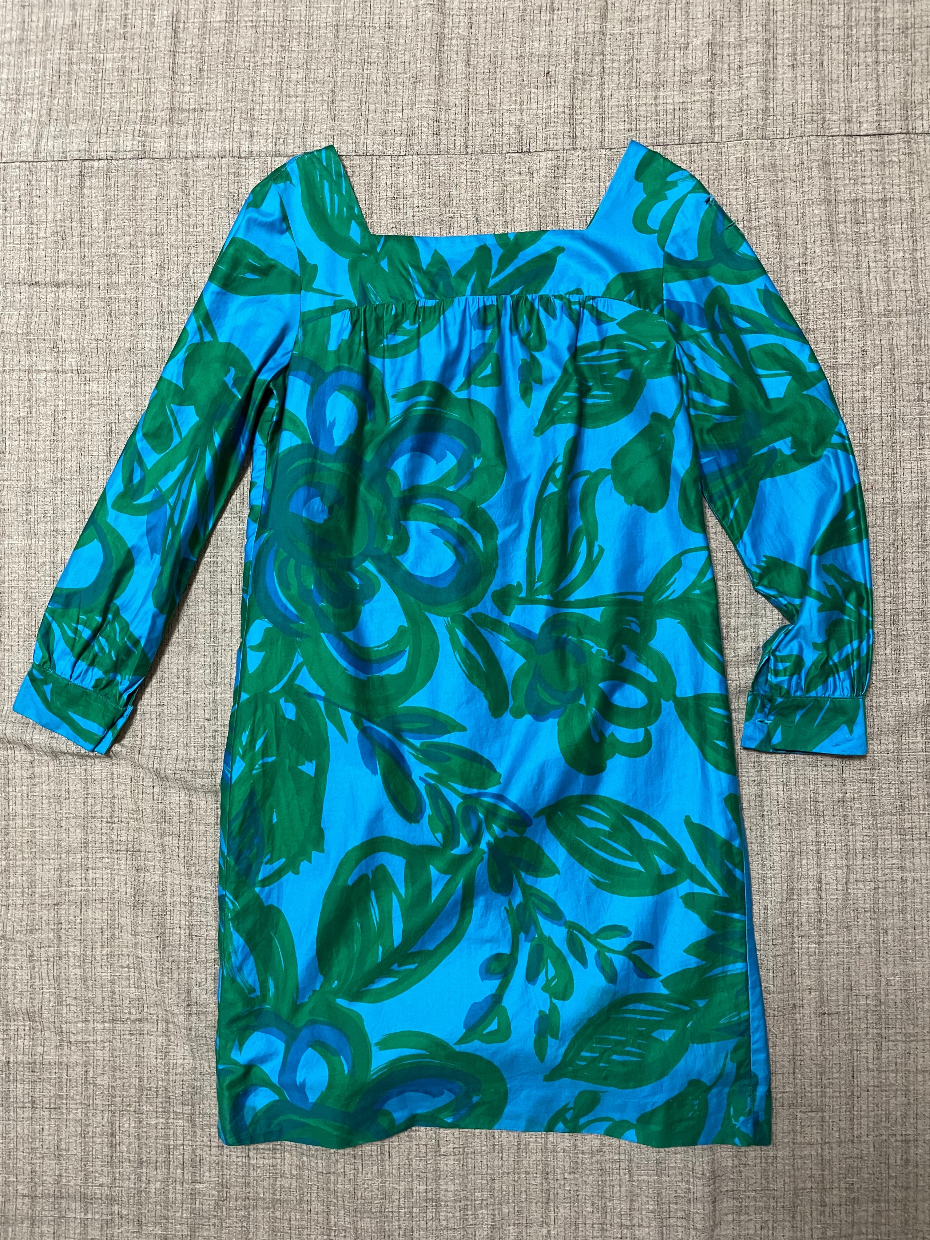 綺麗なブルーボディに、筆書きしたような大柄なリーフデザインが可愛い60sビンテージハワイアンドレス。