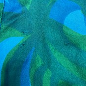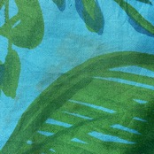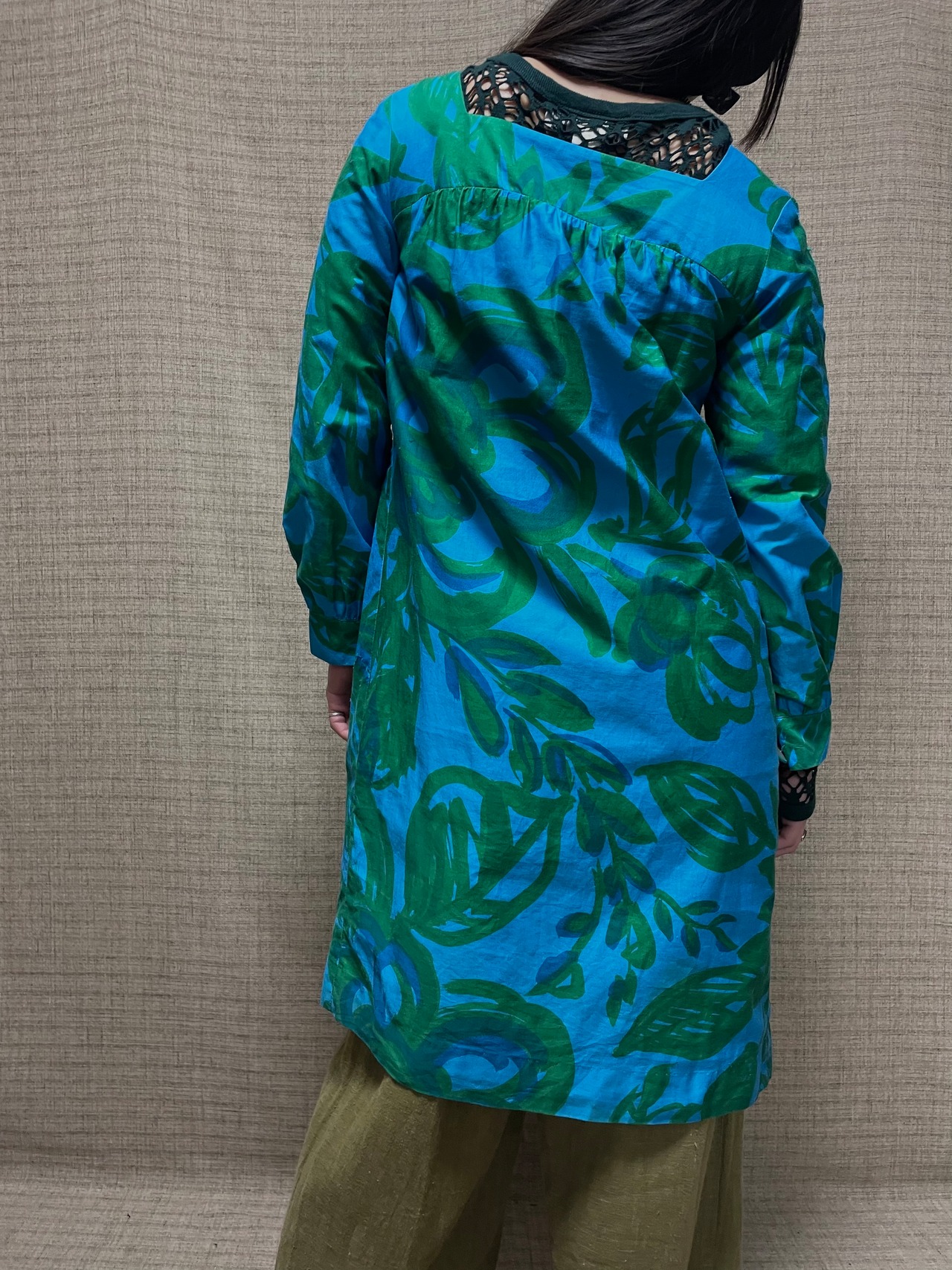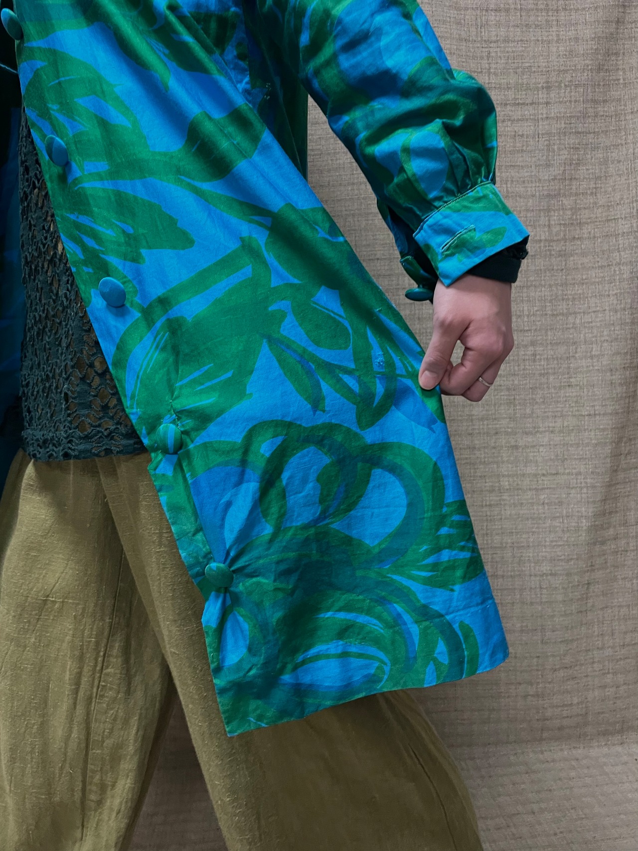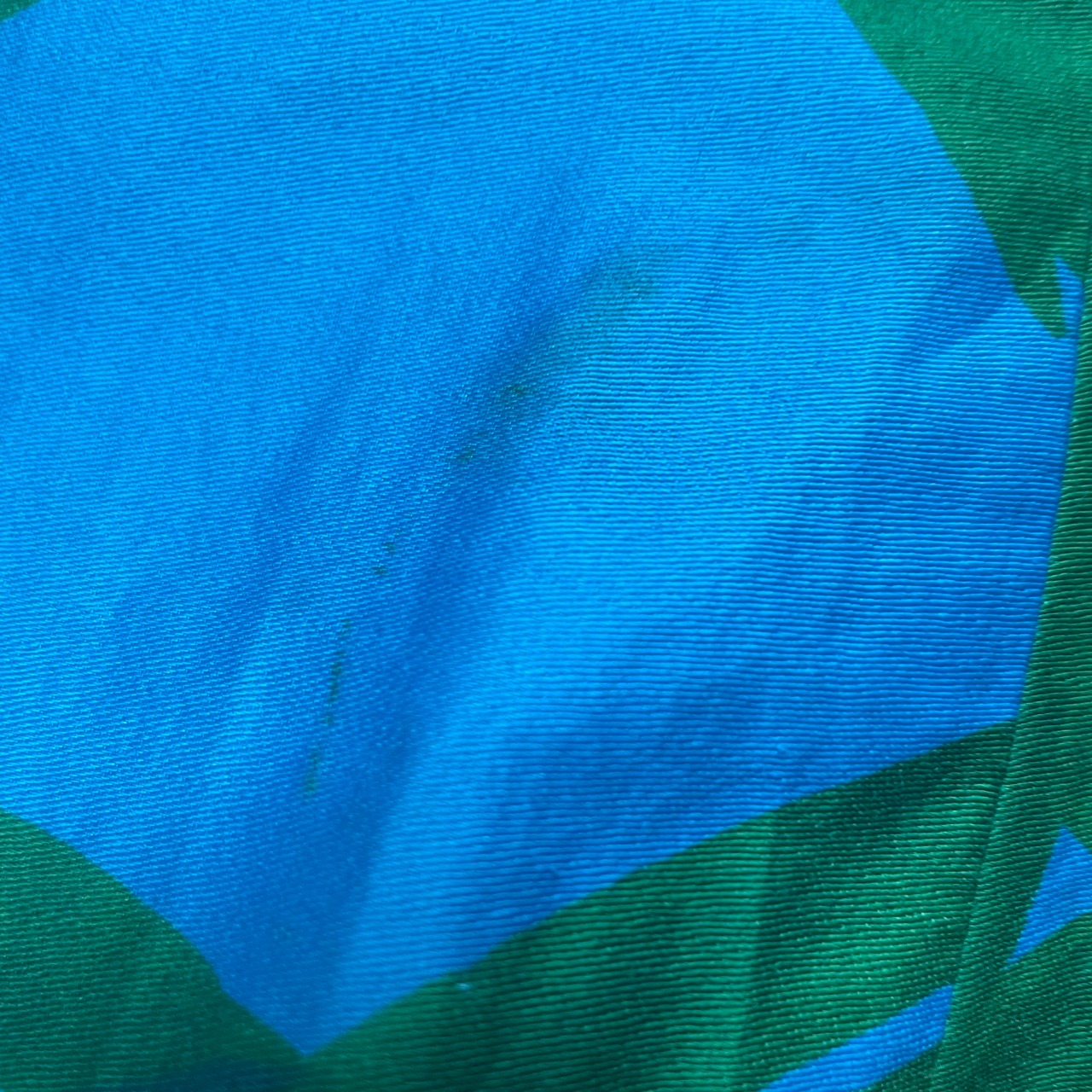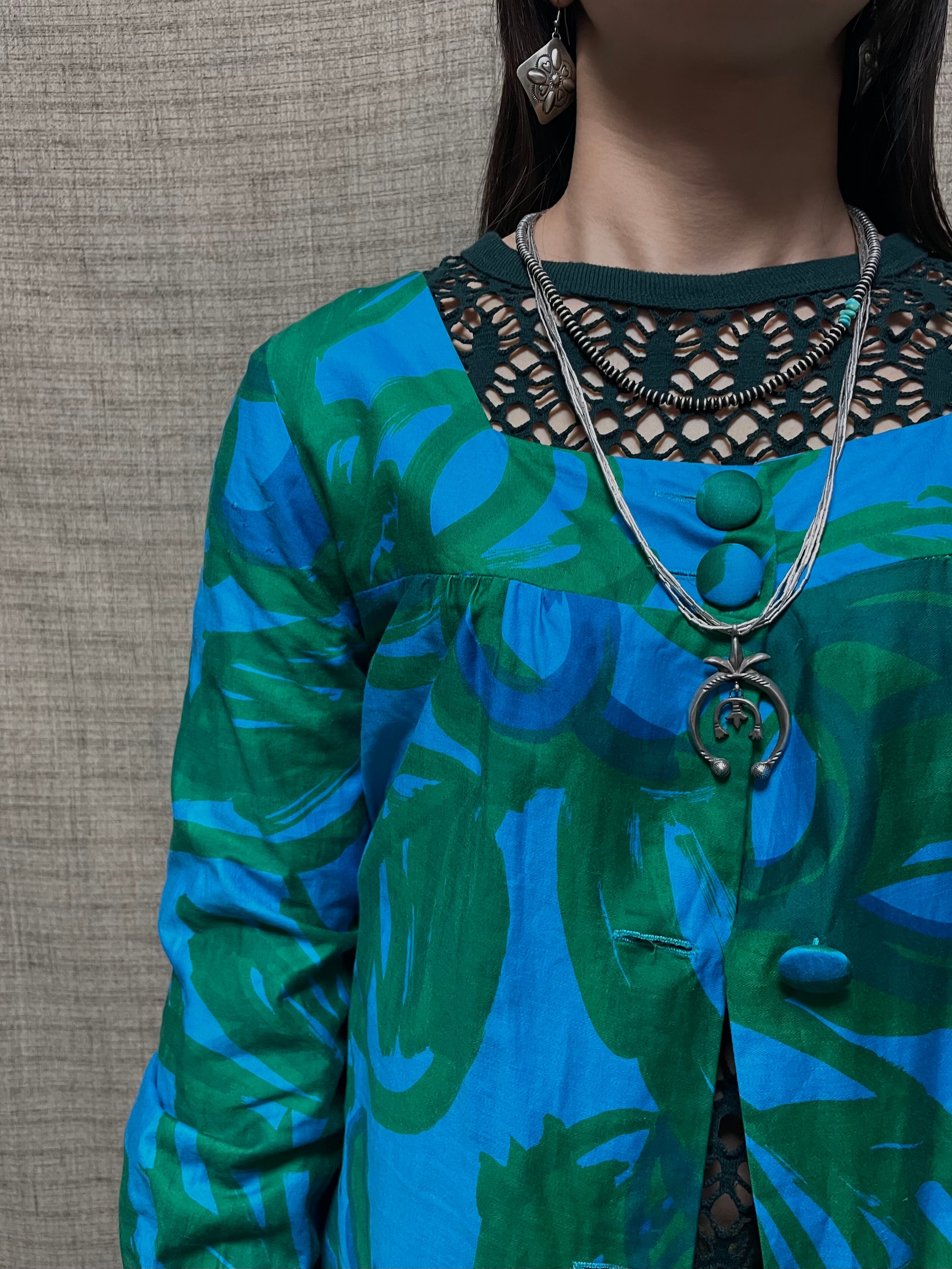綺麗なブルーボディに、筆書きしたような大柄なリーフデザインが可愛い60sビンテージハワイアンドレス。