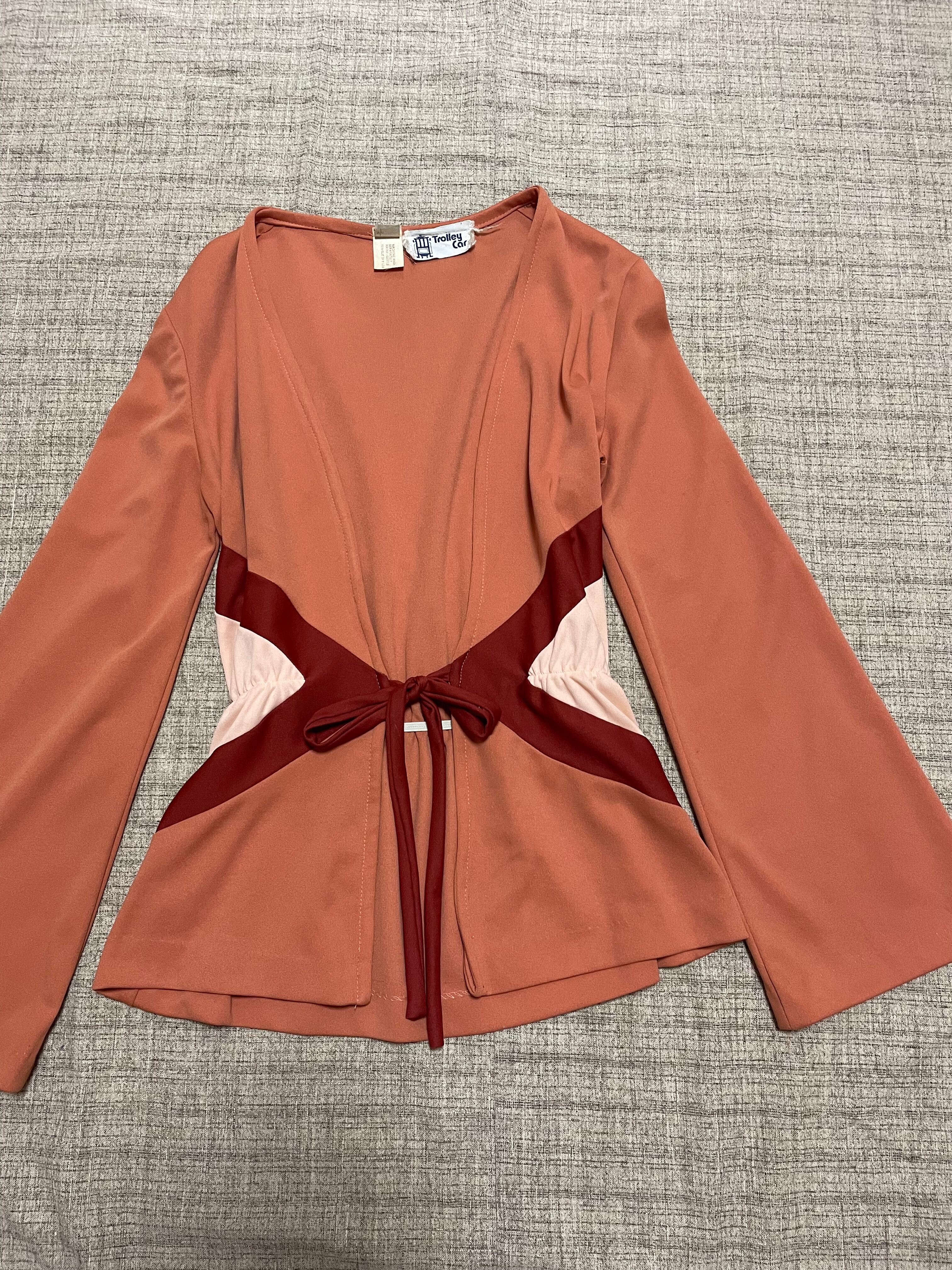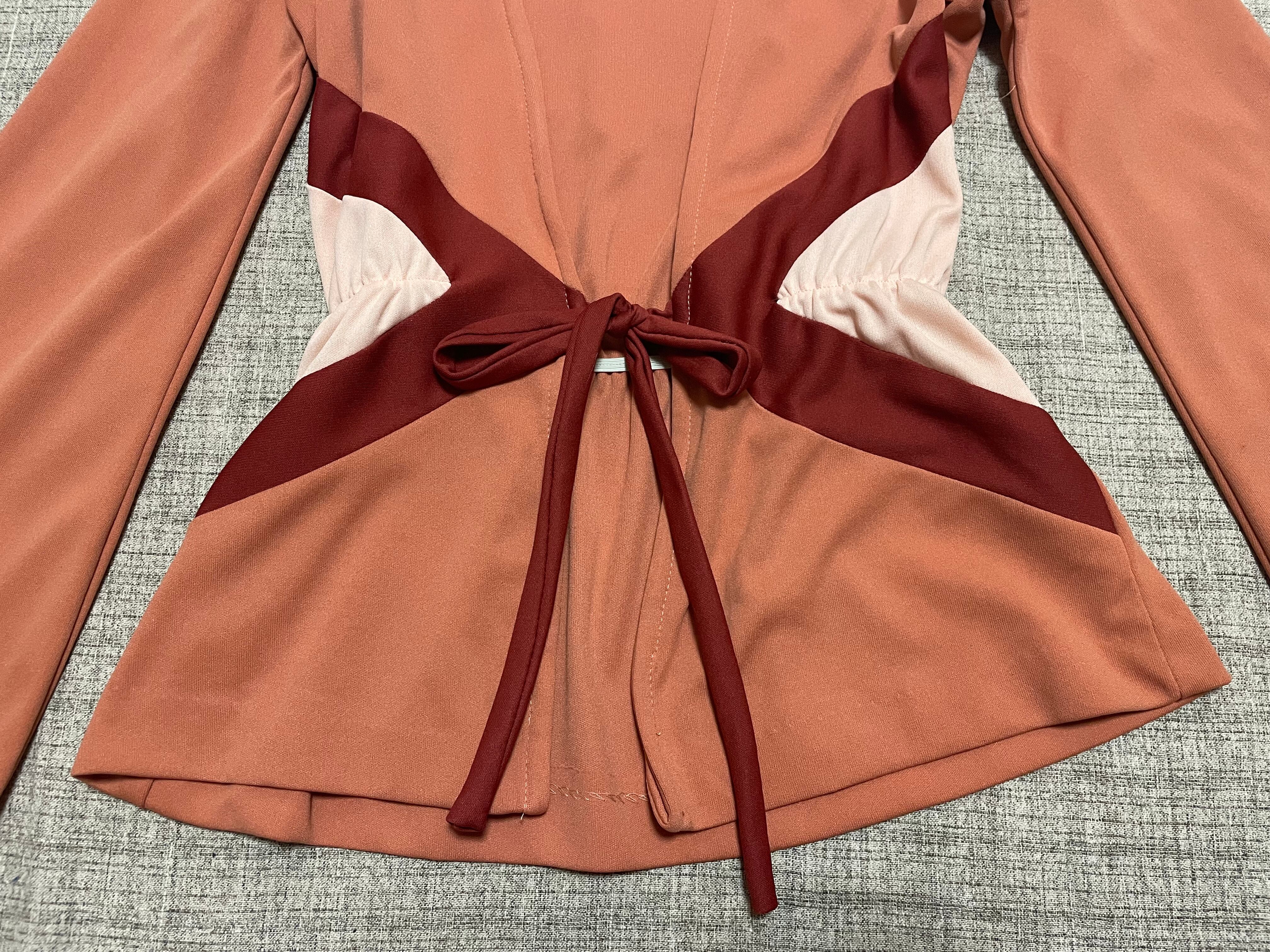 羽織りはフロントに切り替えが施され、ウエストにはゴムが入り、リボンを作れるペプラムのような可愛らしいシルエット。