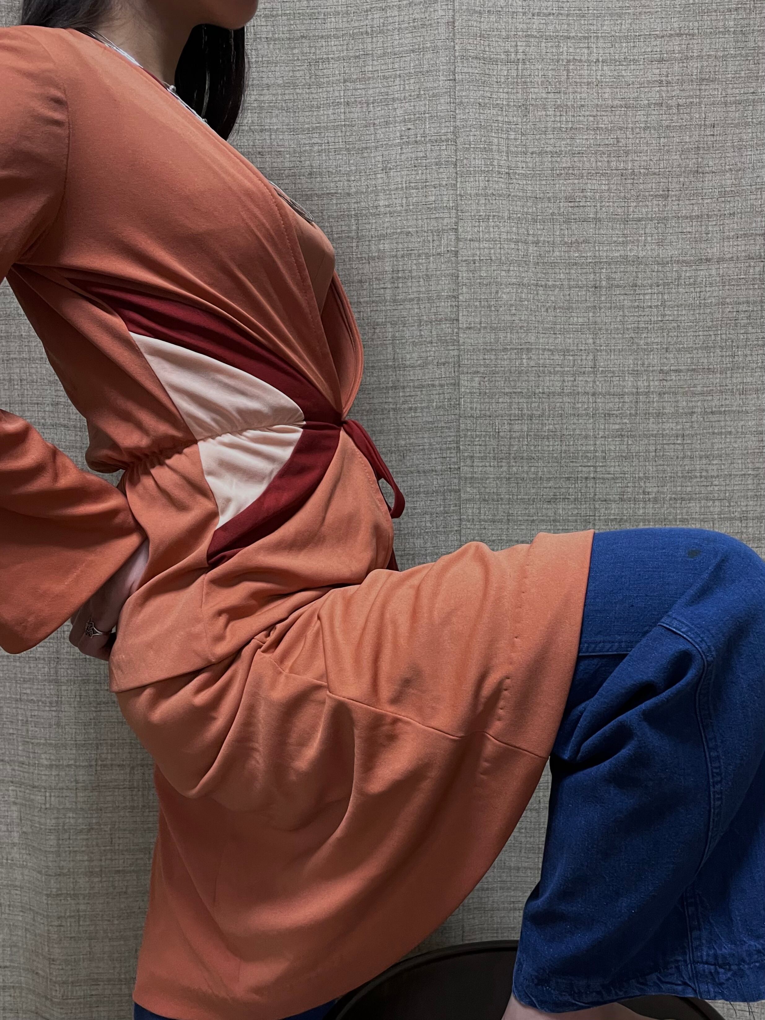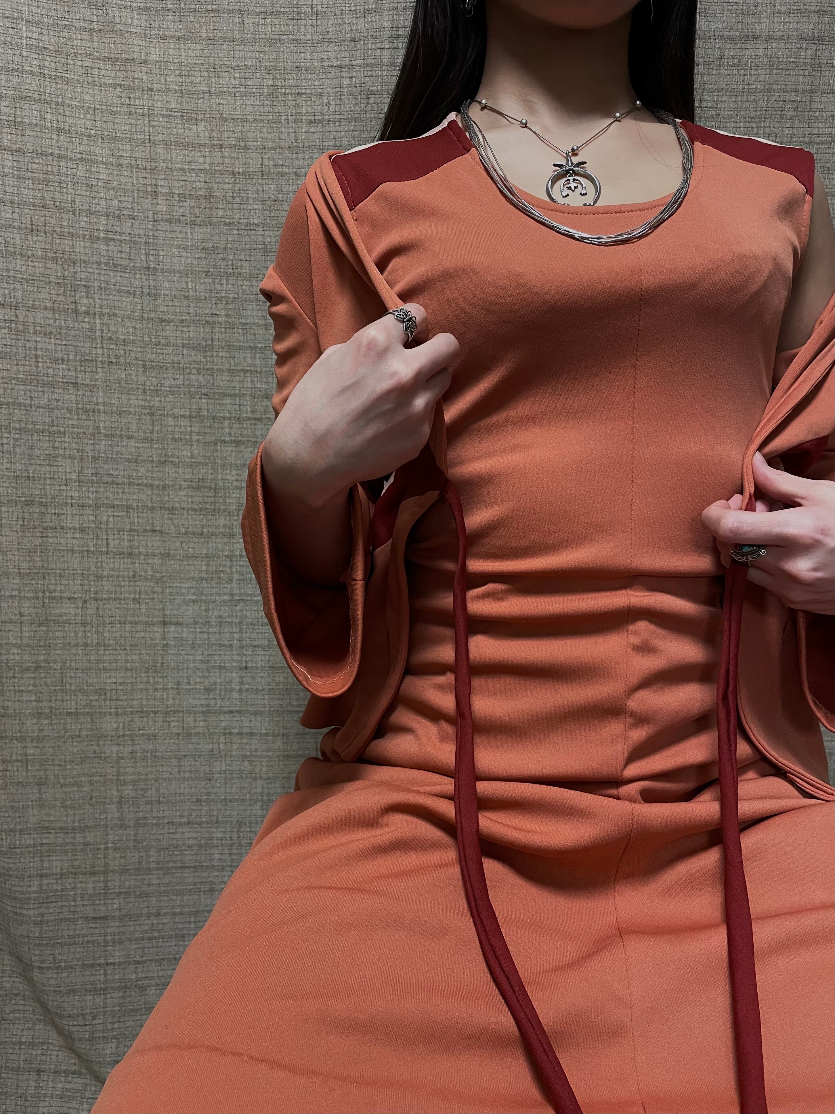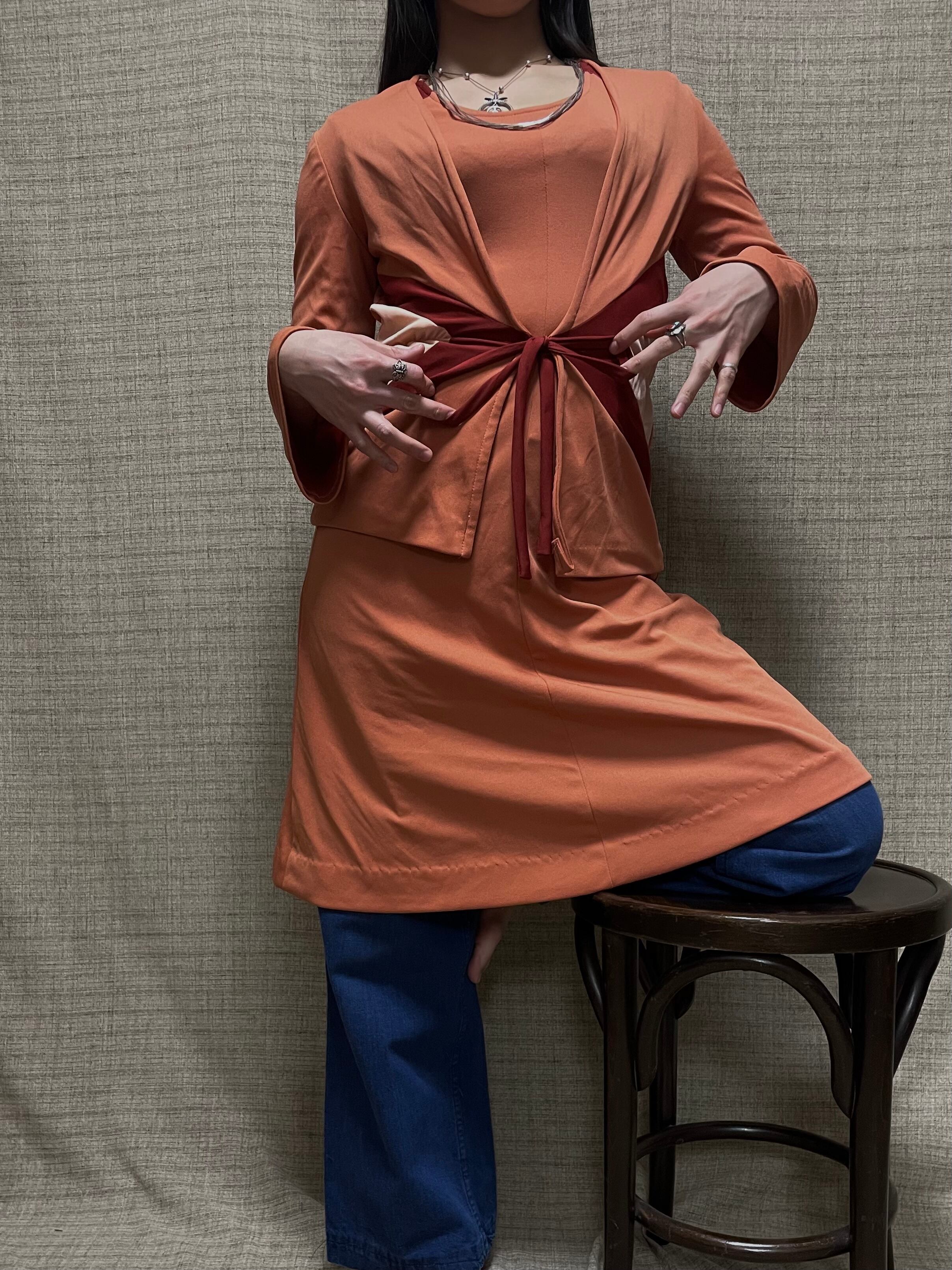 もちろんこのままセットでも充分可愛いのですが、膝丈なのでボトムスを重ねたレイヤードスタイルが私は落ち着きますね。