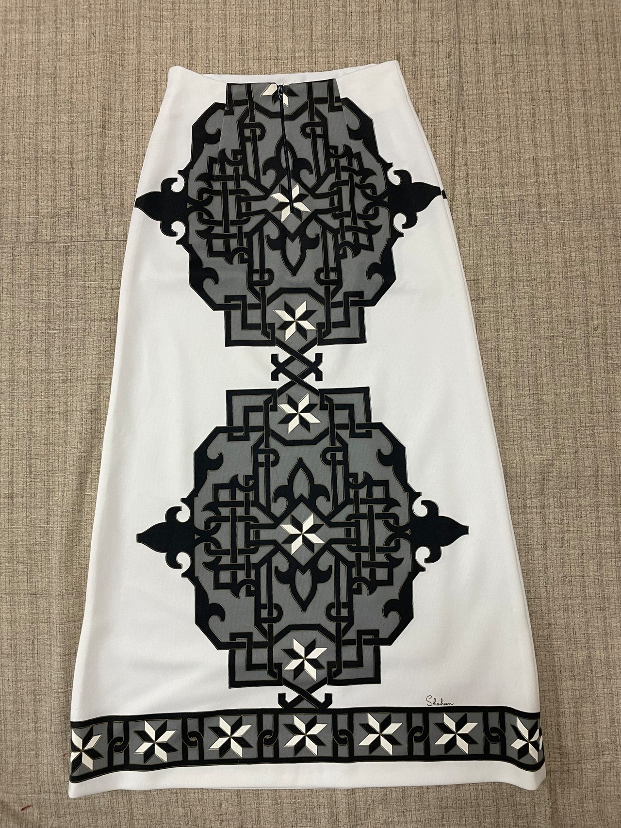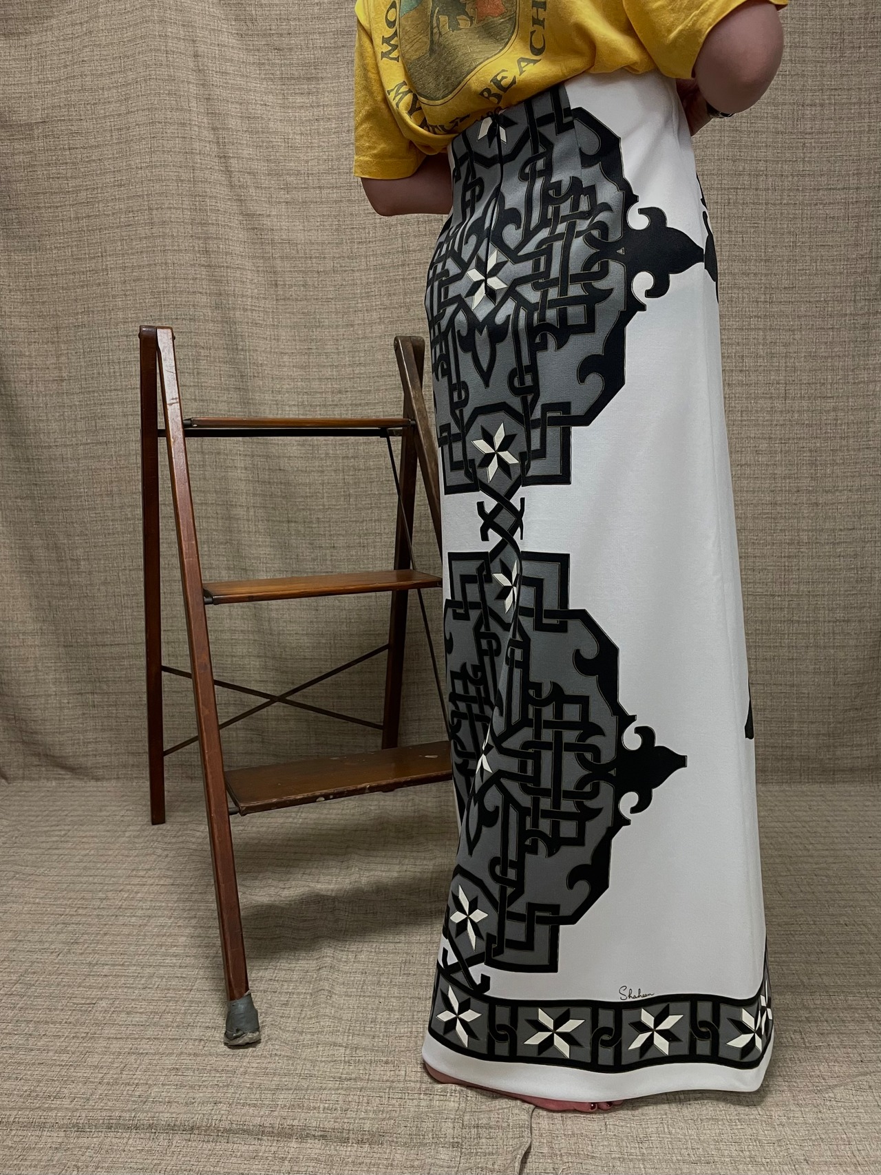 落ち着いたモノトーンの大胆なテキスタイルが魅力的なシャヒーンの70sビンテージスカート。