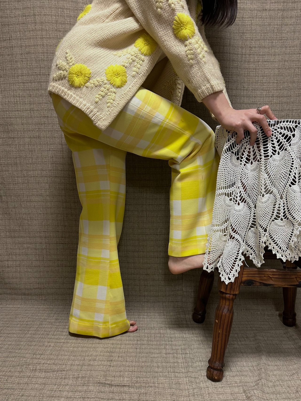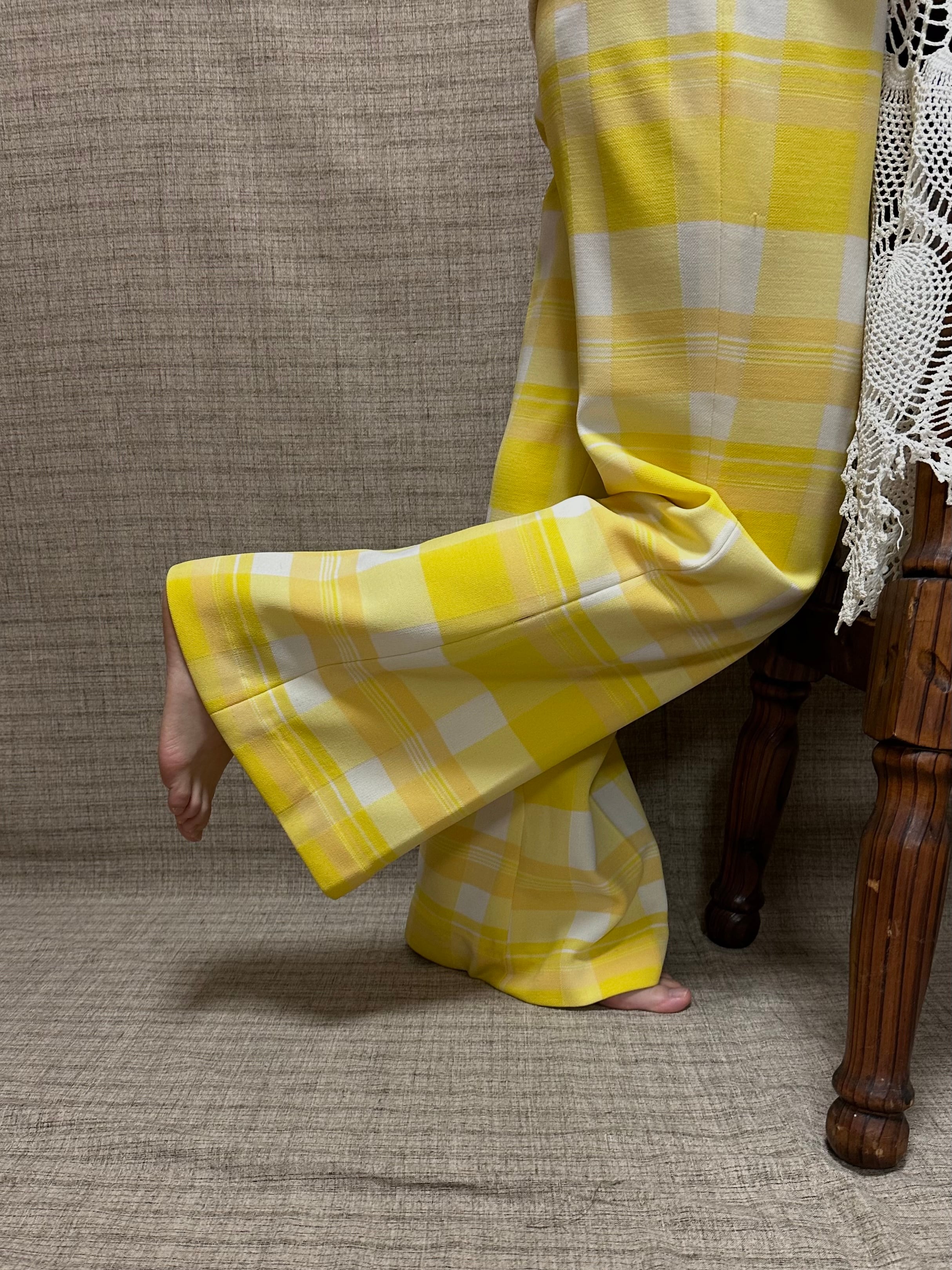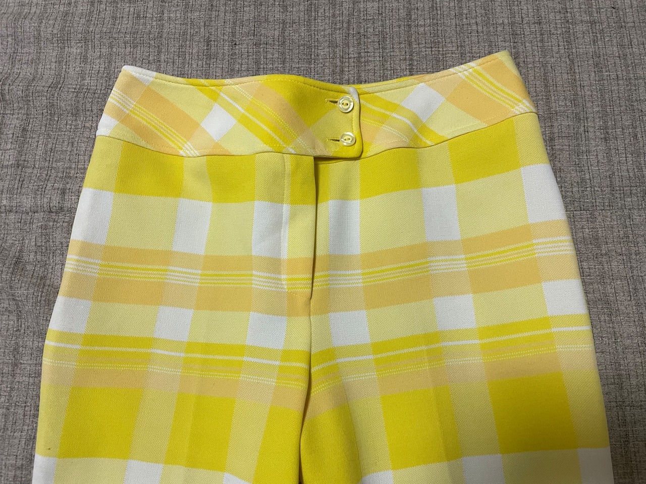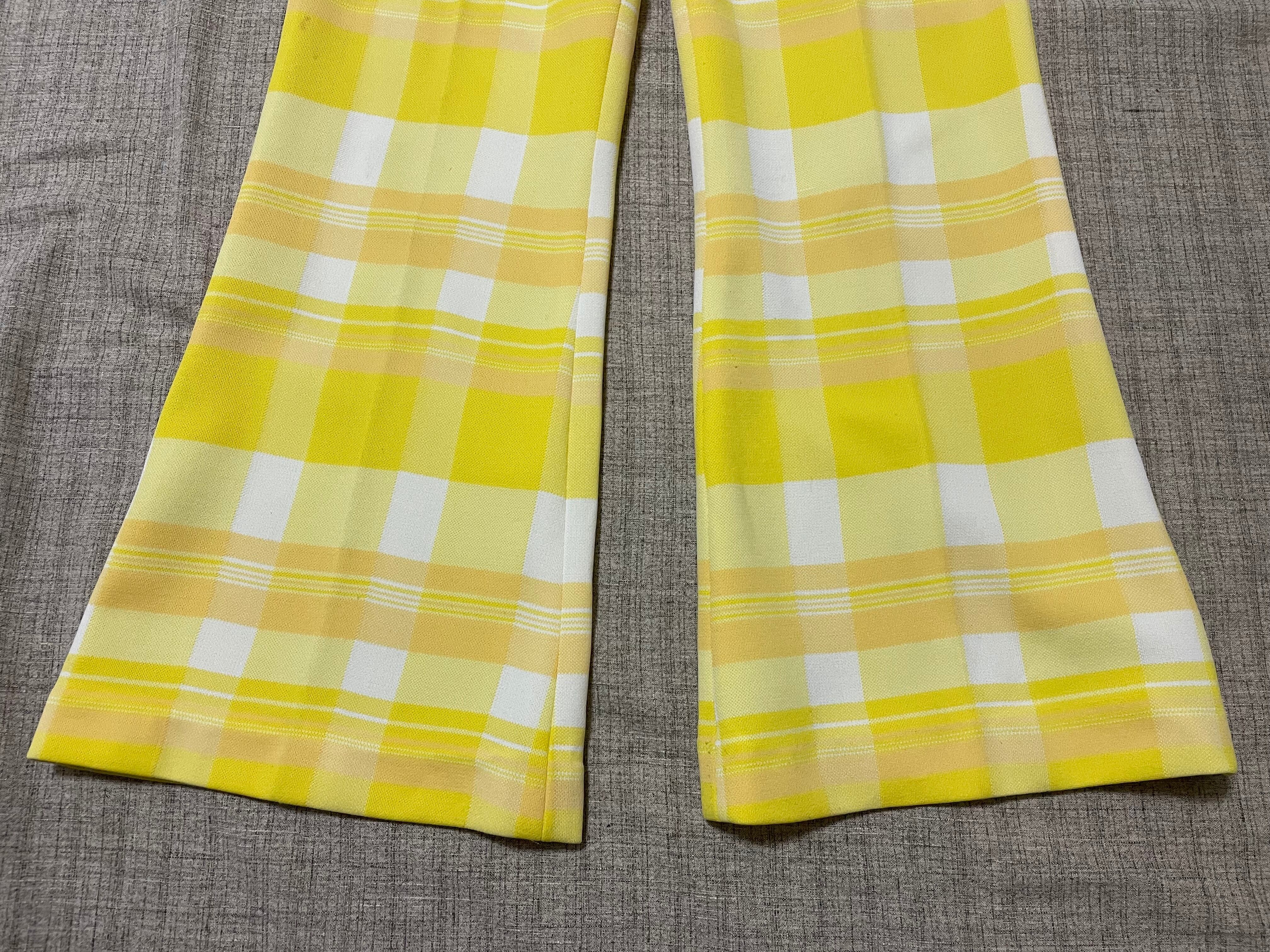 イエロー&ホワイトのチェックデザインが可愛い70sビンテージフレアパンツ。