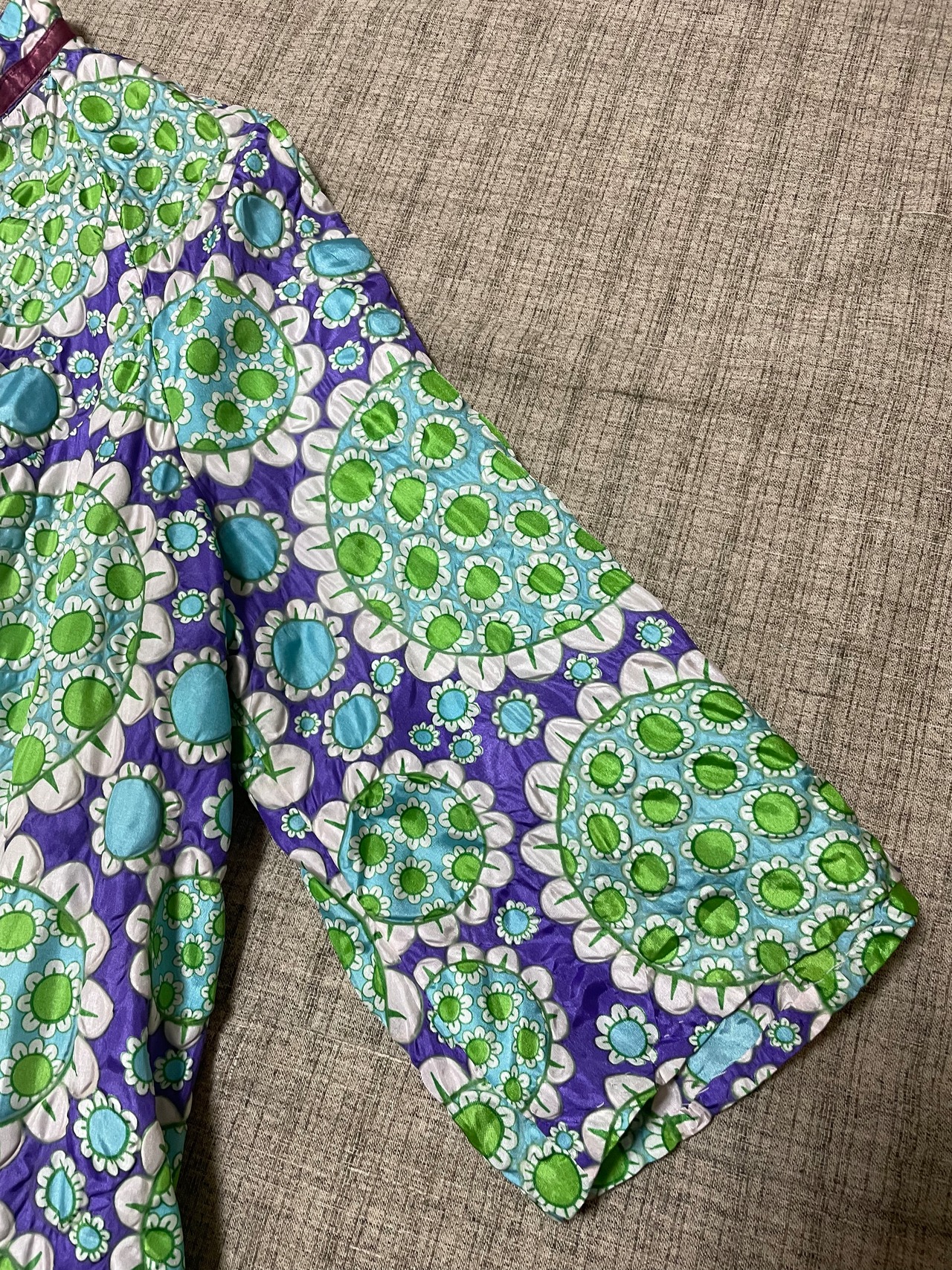 この時代らしい"flower power"を感じるアイテムで、お花のプリント部分はぽこぽこした立体感なデザインが珍しく可愛いです。